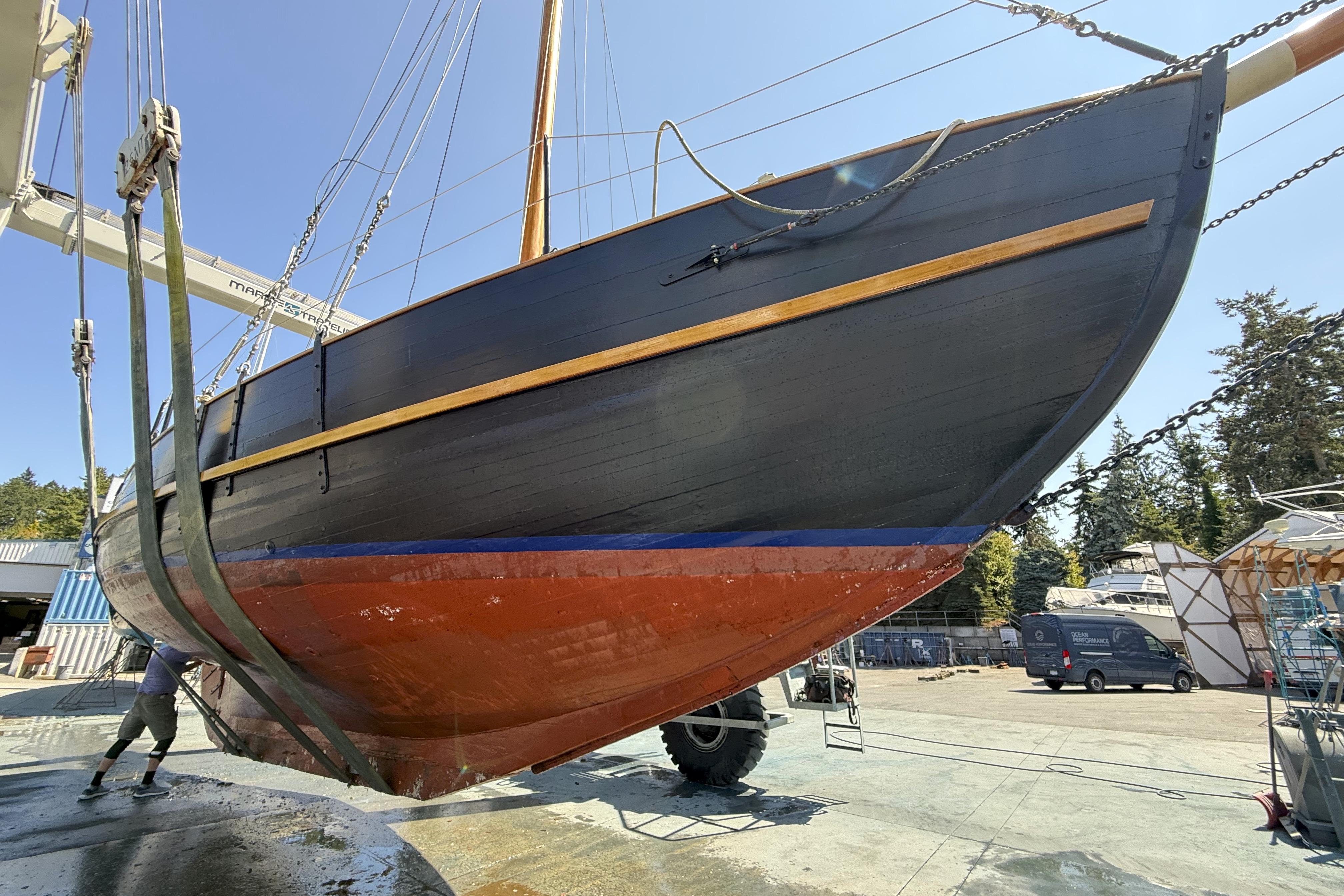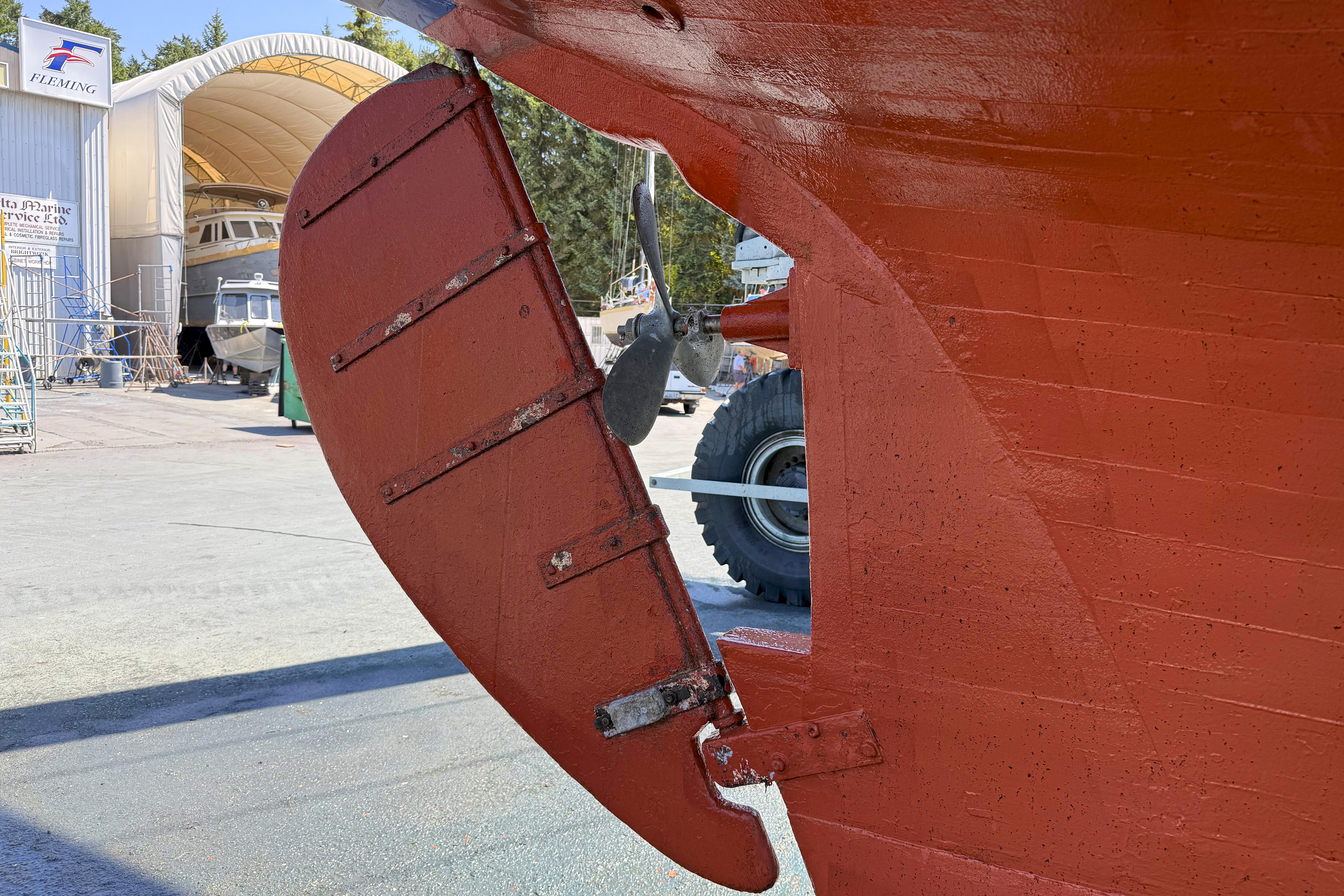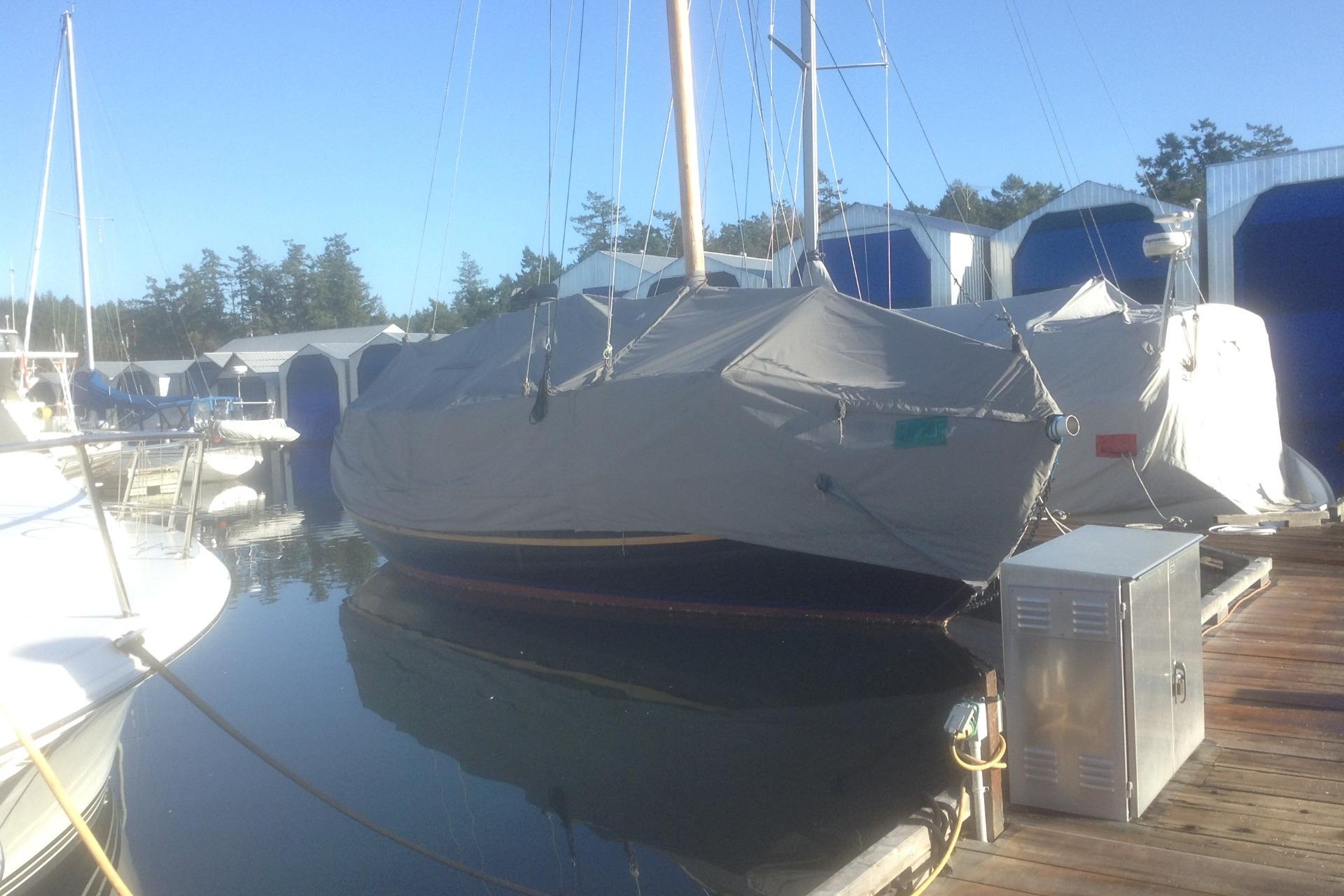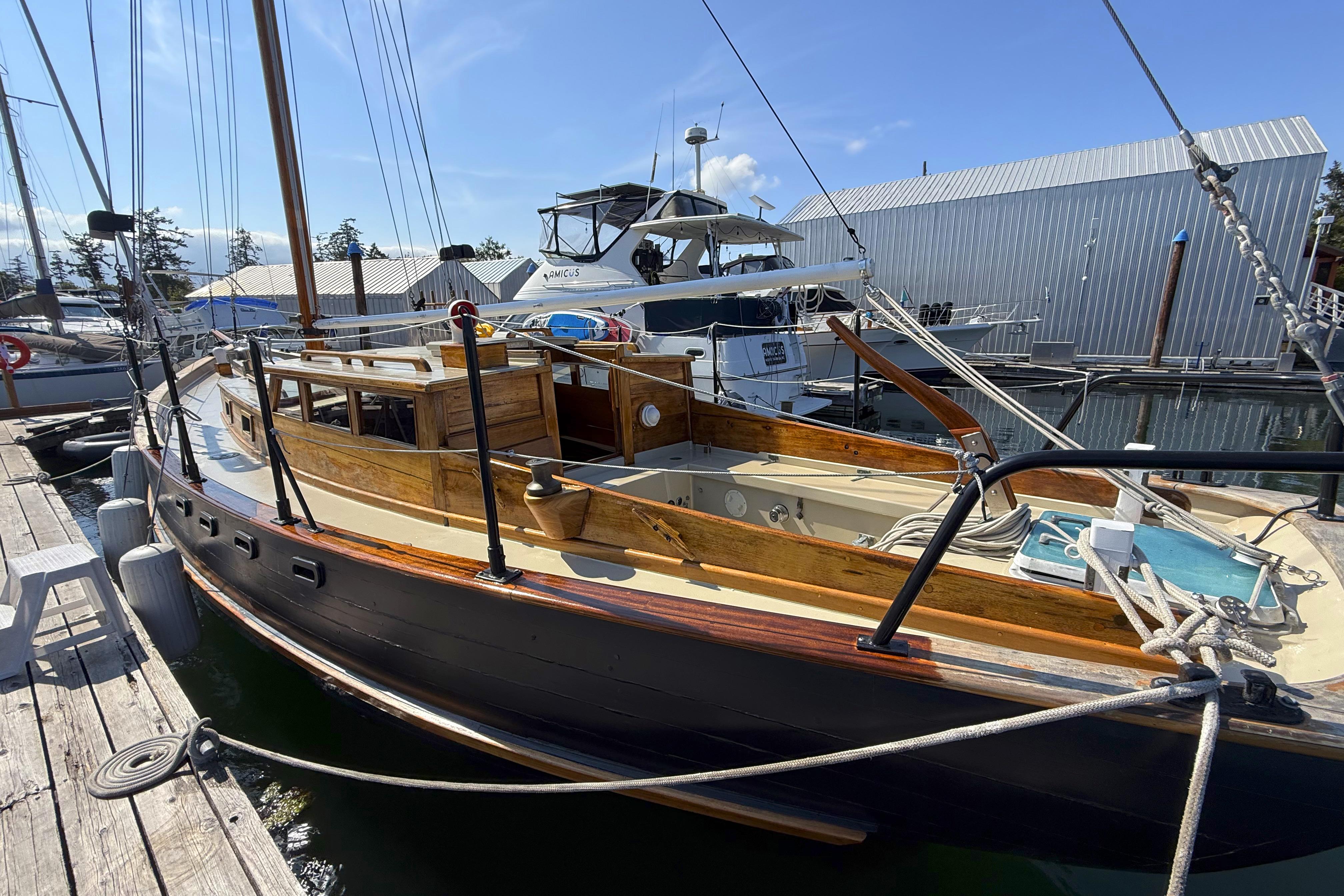 Constructed as a west coast troller and then converted to a yacht in 1987. Originally rigged as a gaff and now as a sloop Yellow ceder carvel-planked hull with round chine and a full keel.  Recent updating by Abernathy and Gaudin in 2024. Oak ribs with Yellow Cedar stringers The deck is fiberglass over marine plywood – high solid bulwarks with Salele caps.  Decks redone by Jesperson in 2014. Cabins are constructed from beautiful Honduras Mahogany
