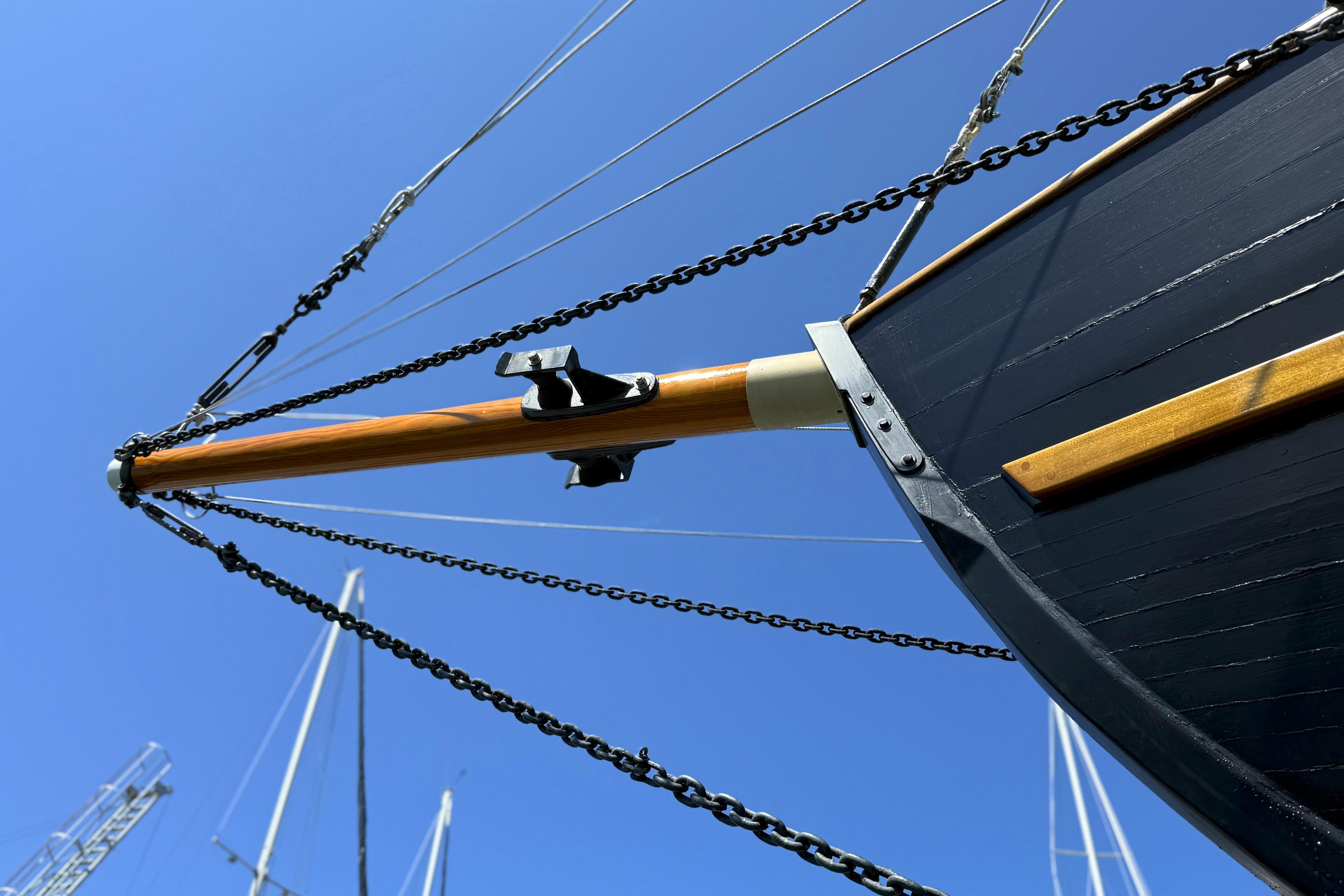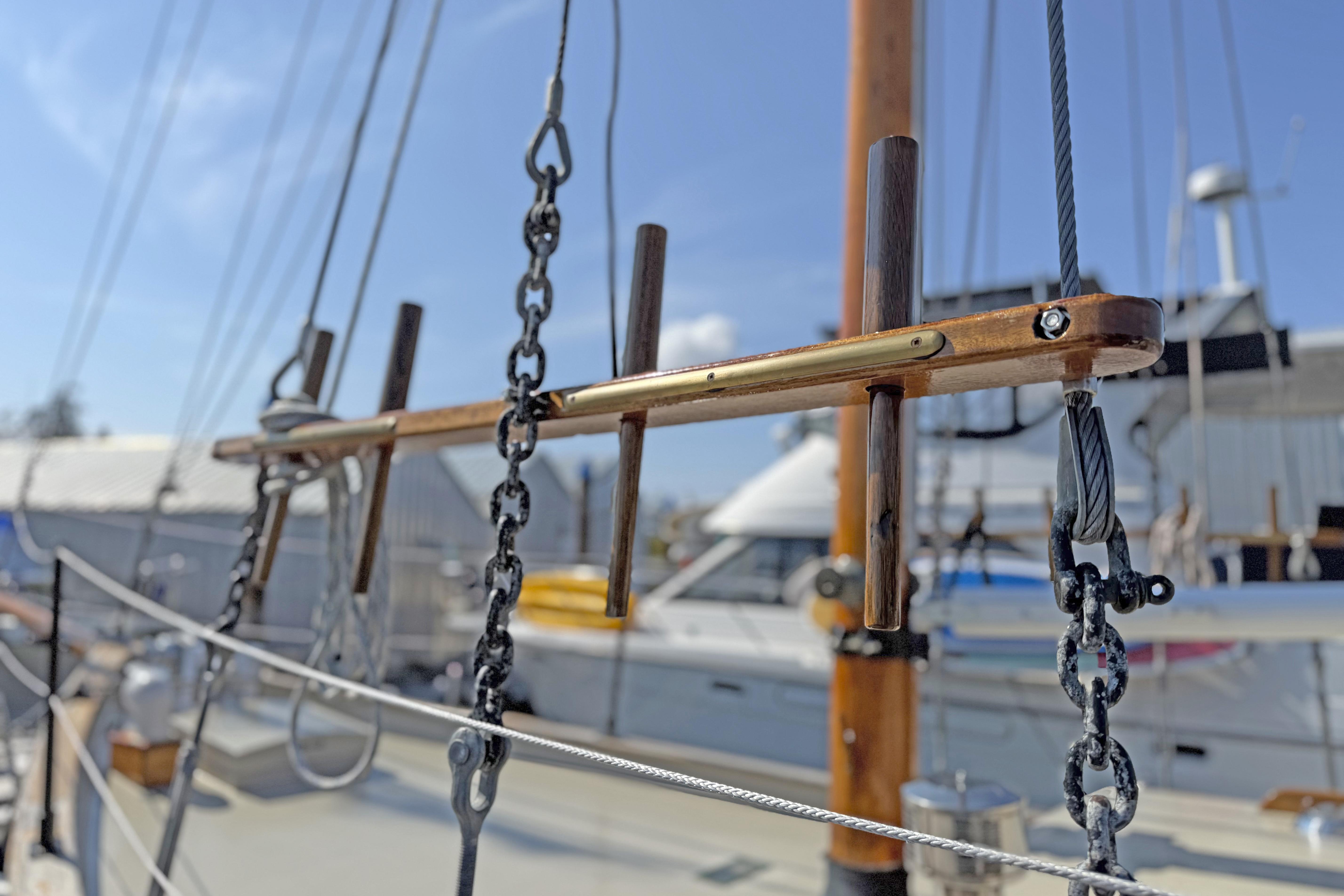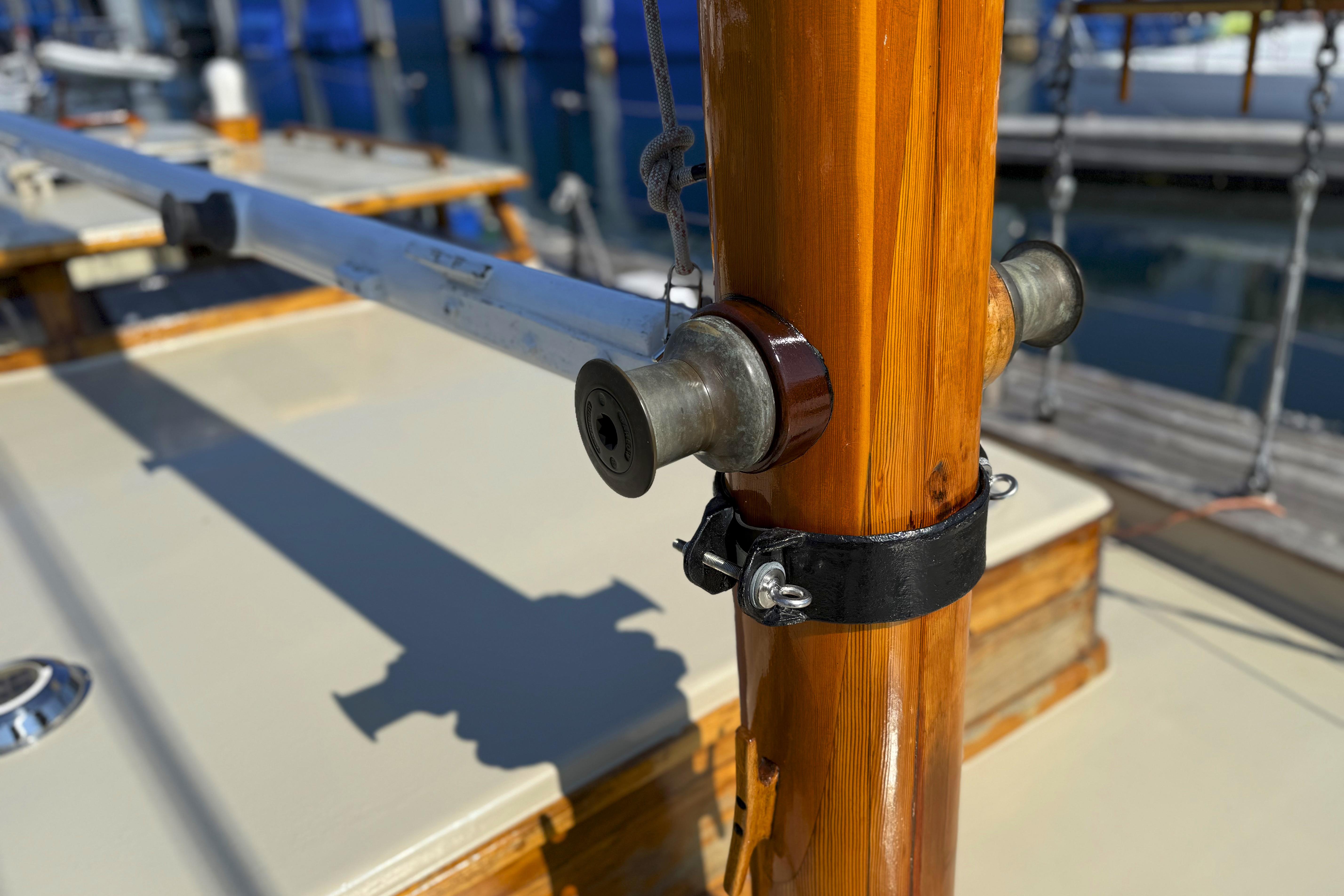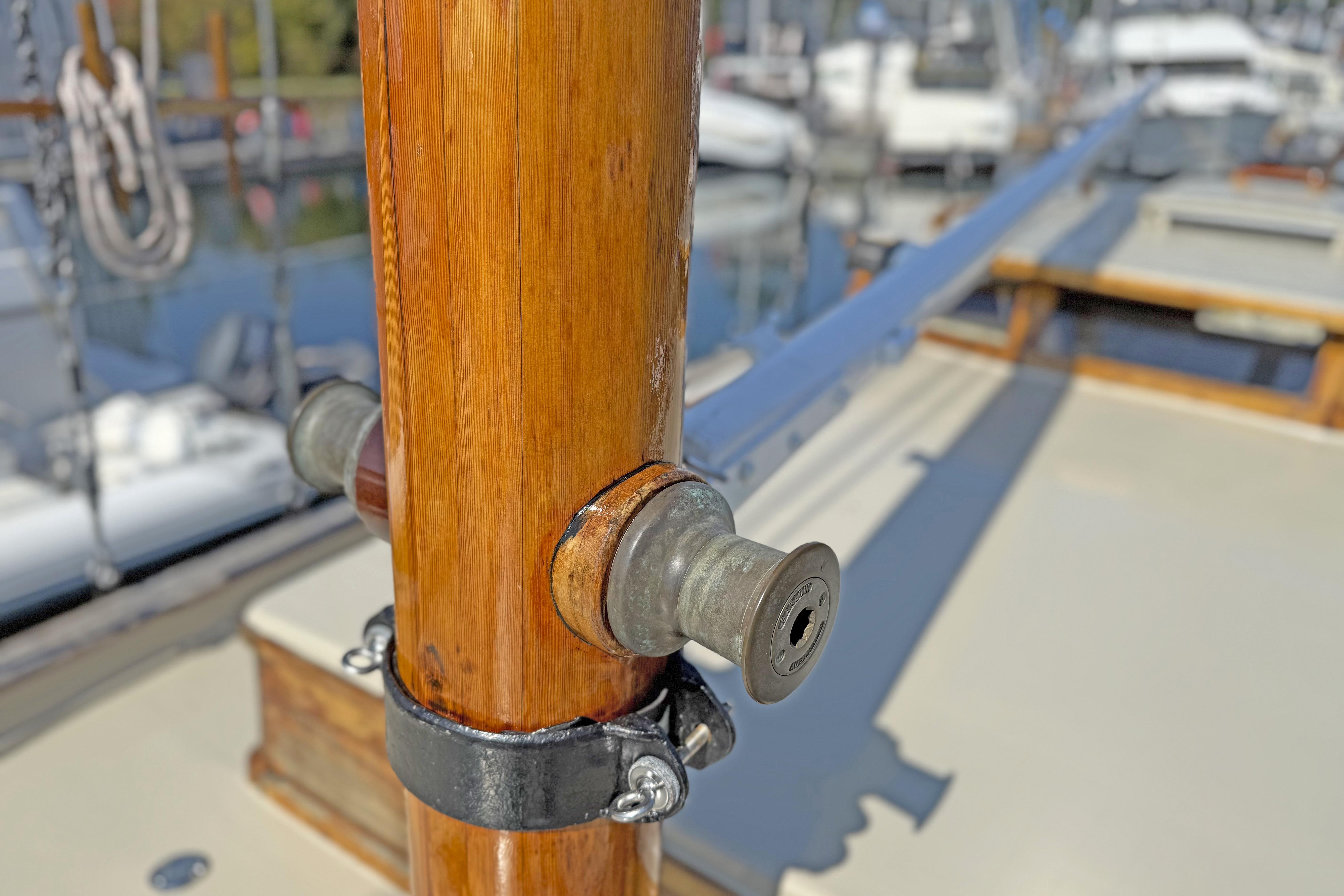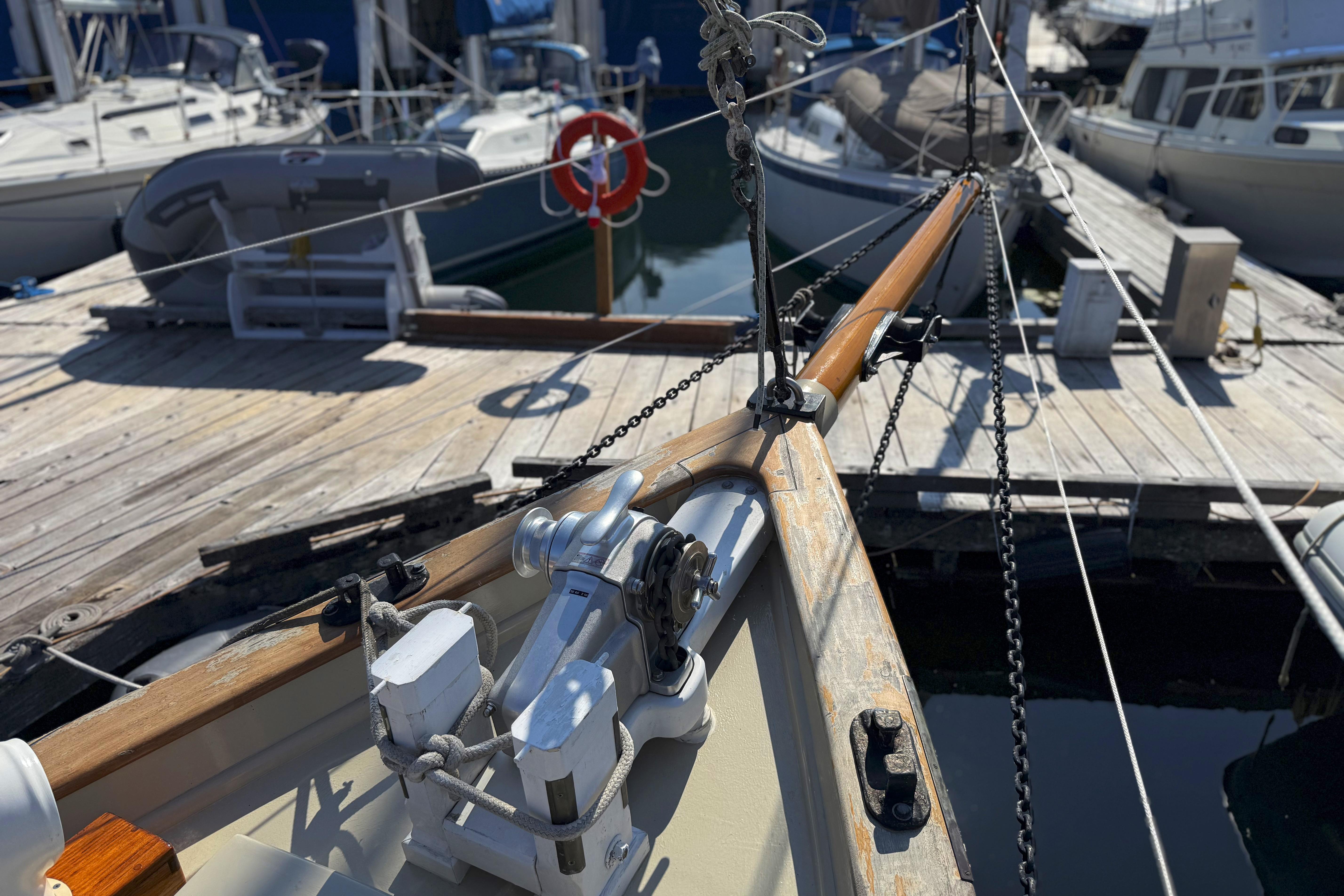 Mast: Varnished Douglas Fir.  Varnished 2025. Boom: Douglas Fir Barlow winches at the mast and cockpit comings. Standing rigging replaced 2021/2022 Anchor: 60 lb plow plus spare 40 lb Danforth Anchor Chain – 7/16” 250 ft plus 100’ 1” rode Windlass – Lofrans Tigres 12 Volt windlass with drum and gypsy. Updated Massive fir Sampson Post aft of the windlass Custom high stanchions for extra safety with dynmea lifelines.