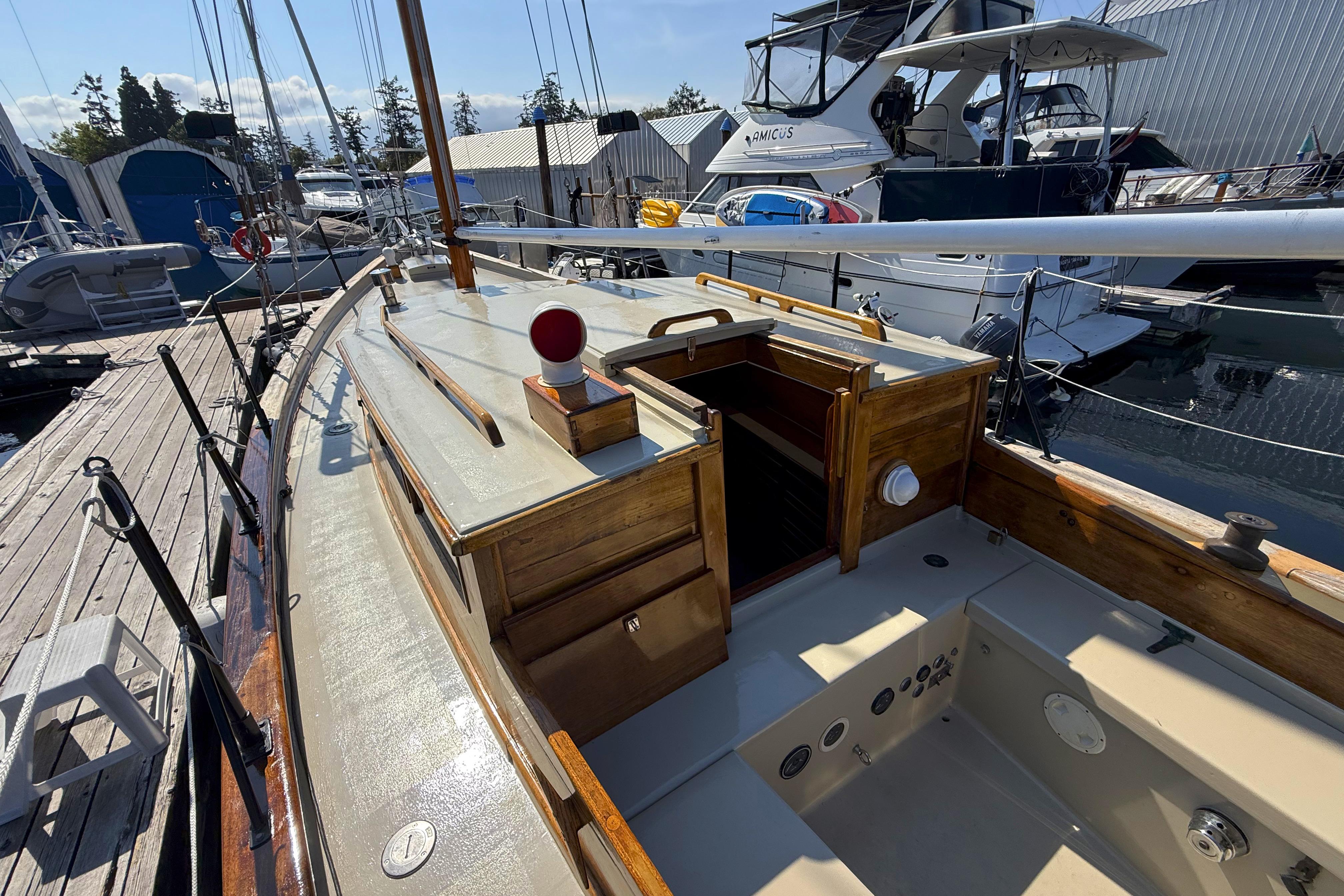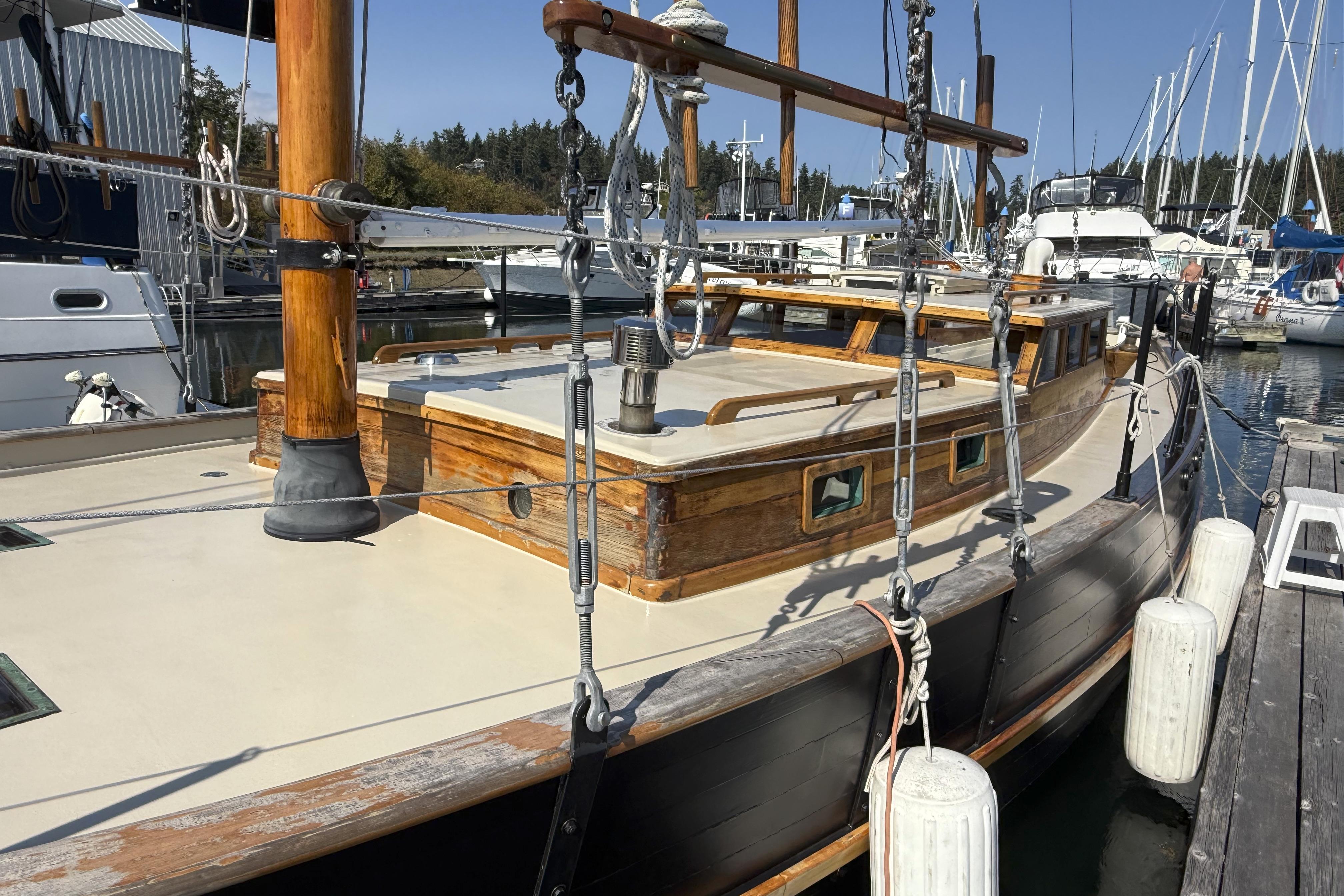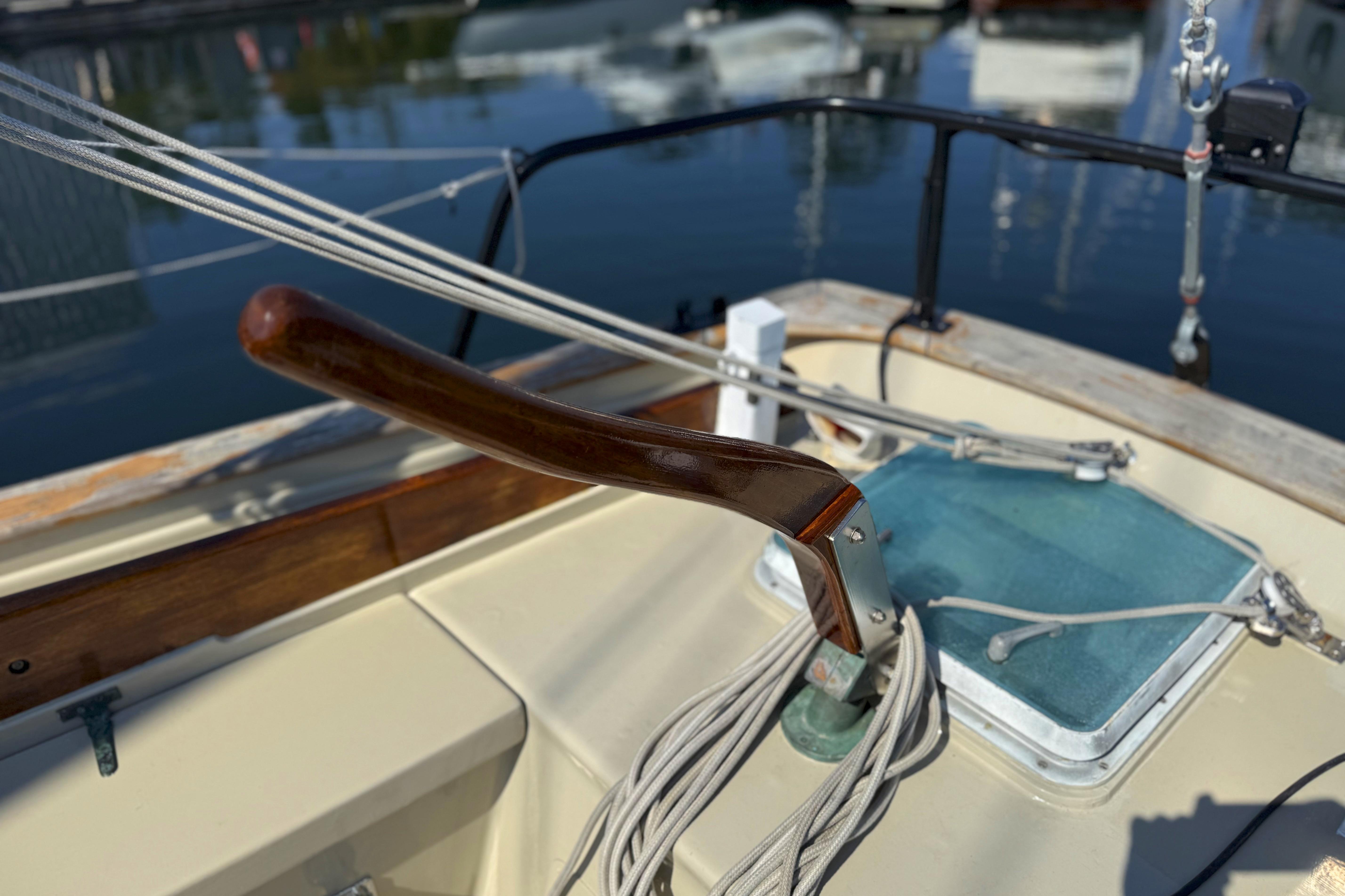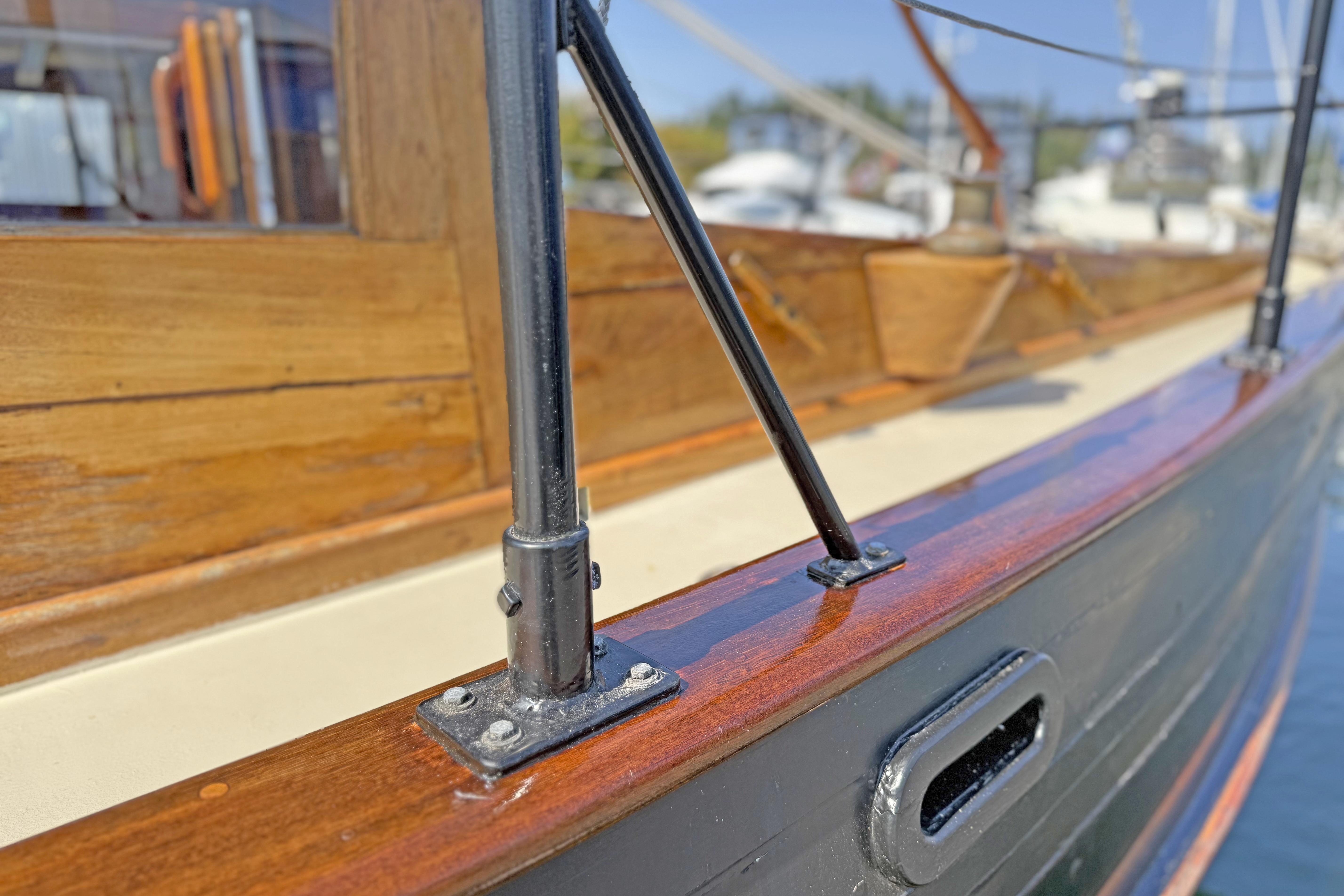 Mast: Varnished Douglas Fir.  Varnished 2025. Boom: Douglas Fir Barlow winches at the mast and cockpit comings. Standing rigging replaced 2021/2022 Anchor: 60 lb plow plus spare 40 lb Danforth Anchor Chain – 7/16” 250 ft plus 100’ 1” rode Windlass – Lofrans Tigres 12 Volt windlass with drum and gypsy. Updated Massive fir Sampson Post aft of the windlass Custom high stanchions for extra safety with dynmea lifelines.