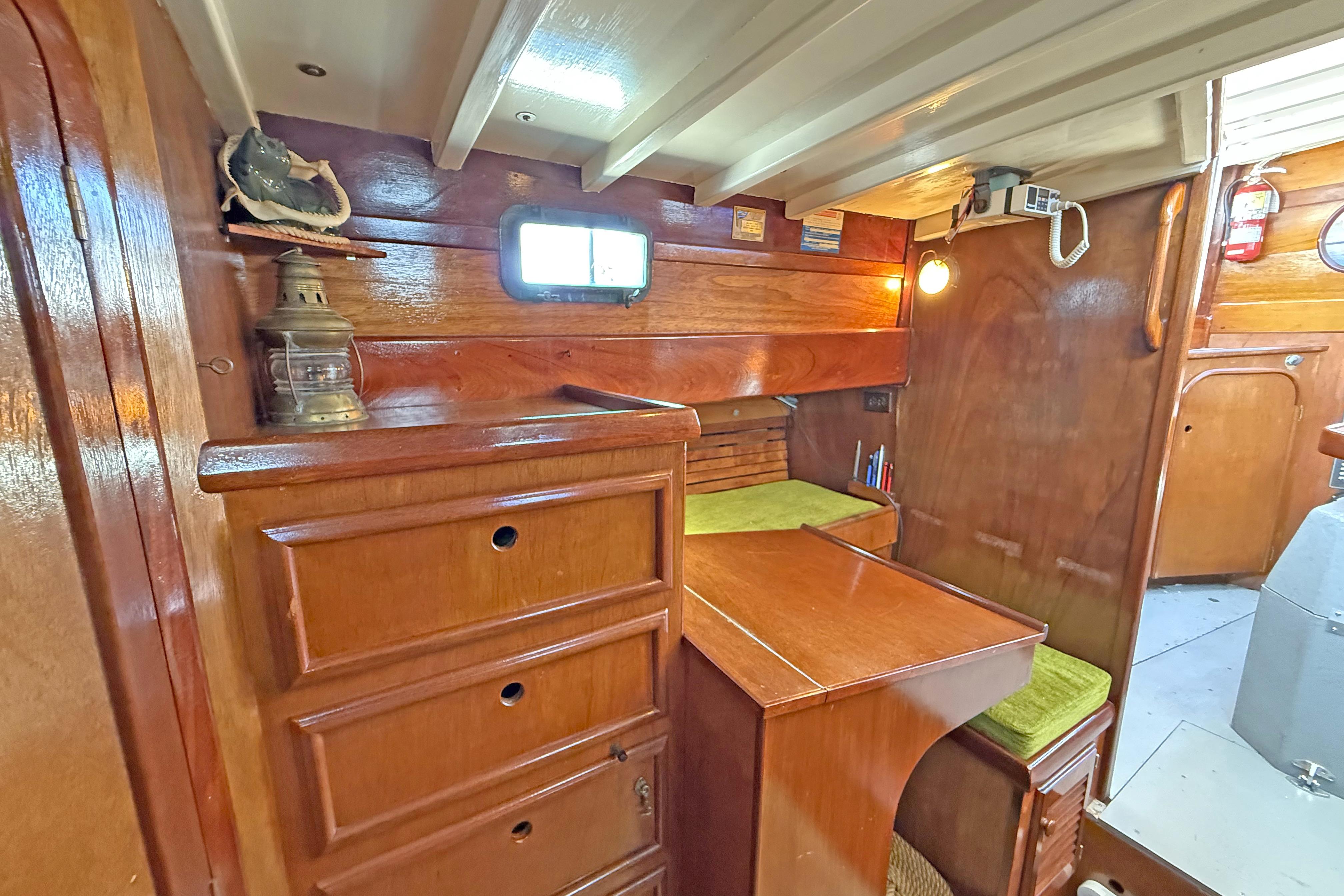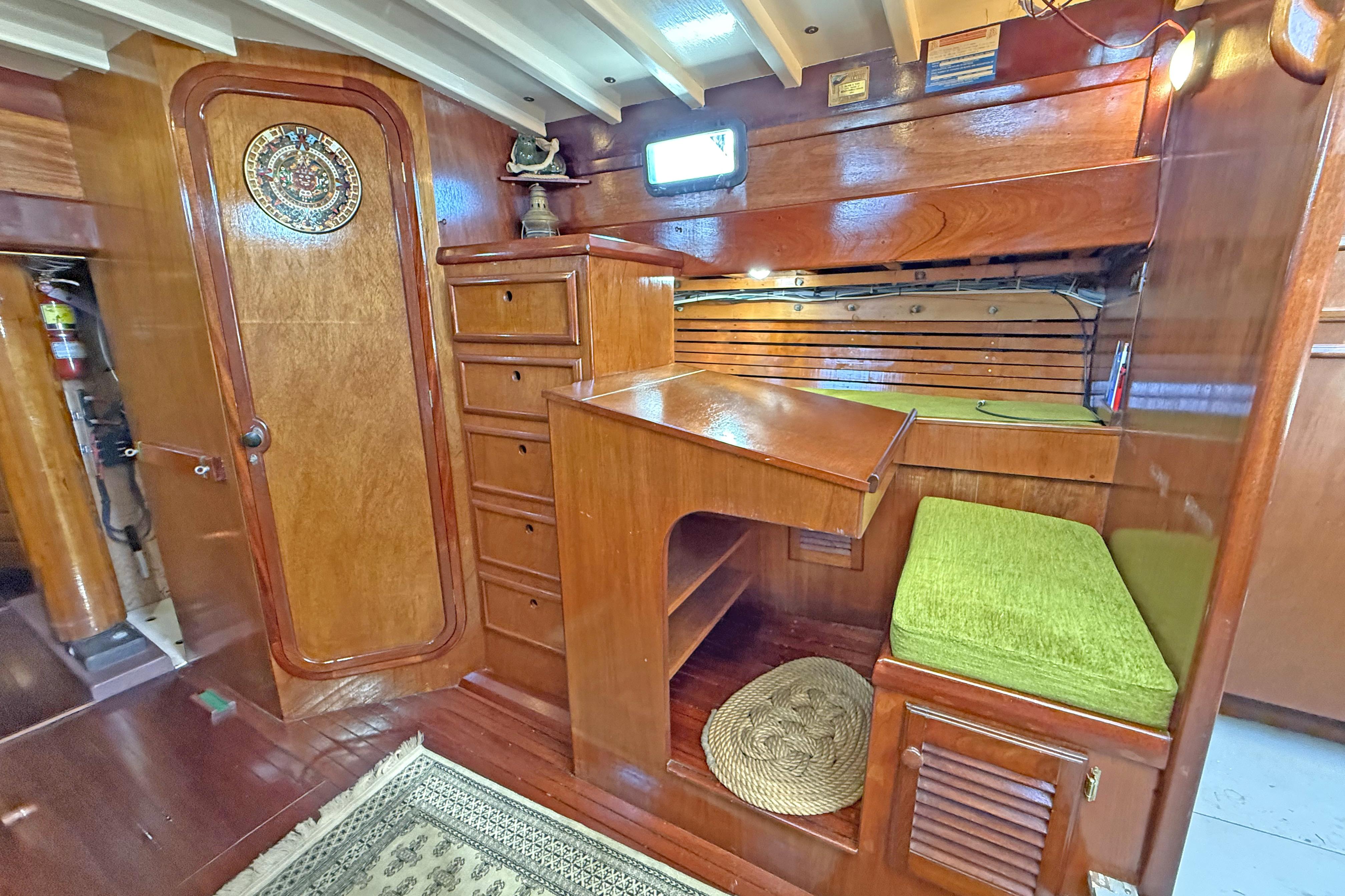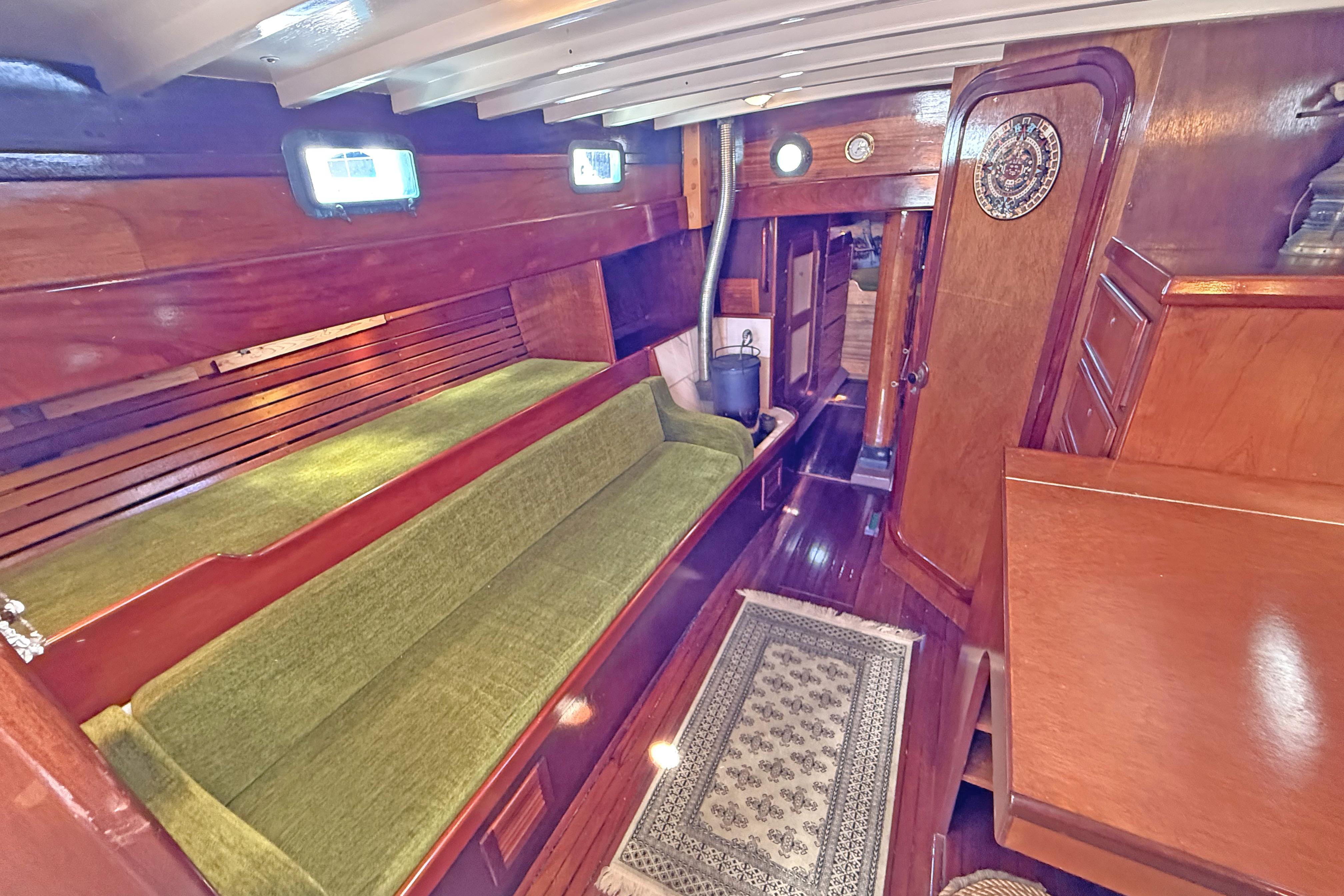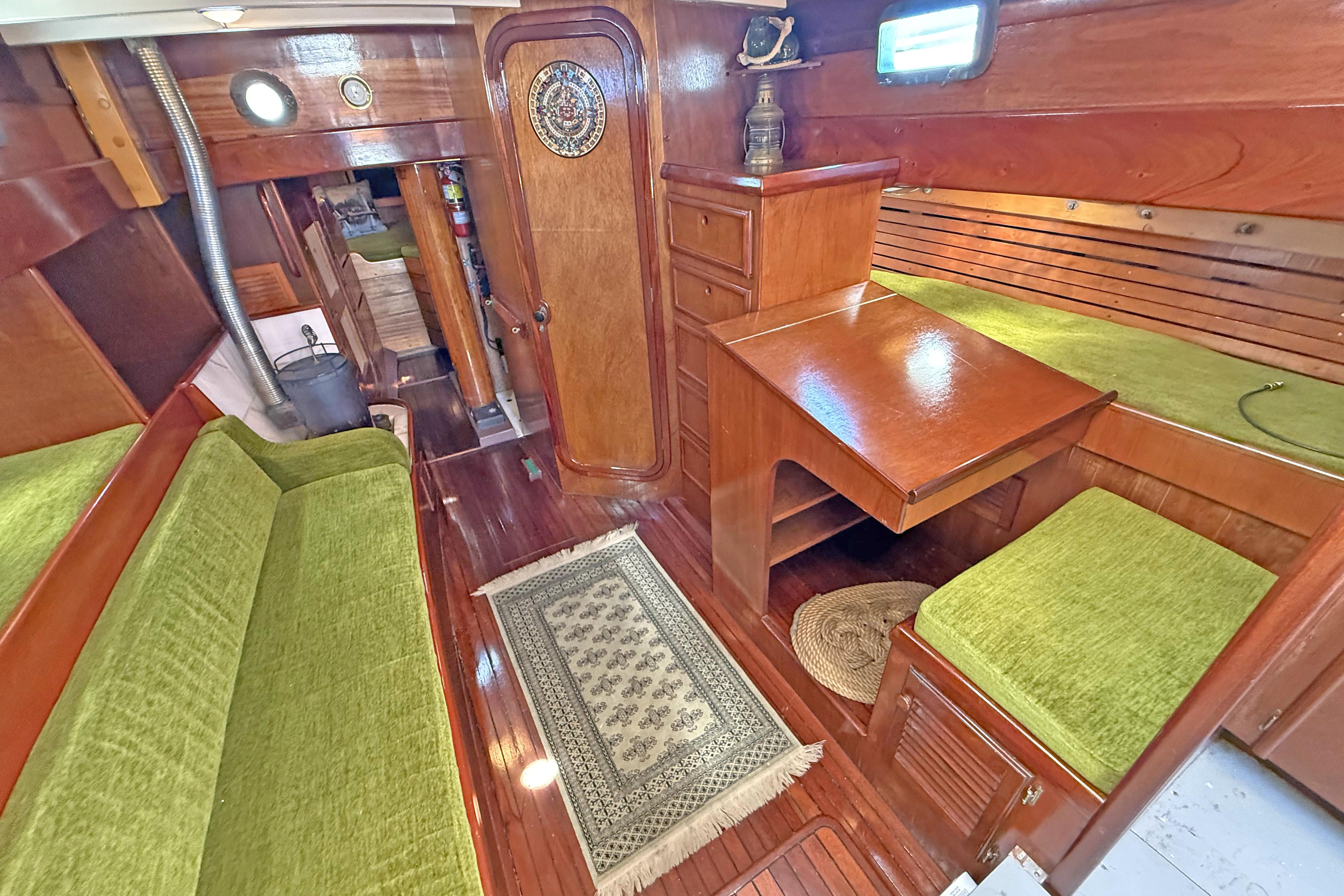 The interior, finished in 1987, is finished with varnished mahogany cabinetry and cabin soles, Arborite countertops and painted deckheads. After passing through the companionway one enters the galley area with a large table and plenty of preparation space.  The galley is excellent for offshore food preparation and entertaining at anchor.  Great sightlines to the outside from the galley. A step down and forward is the salon with a large settee and a pilot berth to port.  There is a private head with shower. The expansive navigation table is to starboard and conveniently close to another pilot berth. Four deck prisms for lots of light. Phoenix drip diesel cabin heater