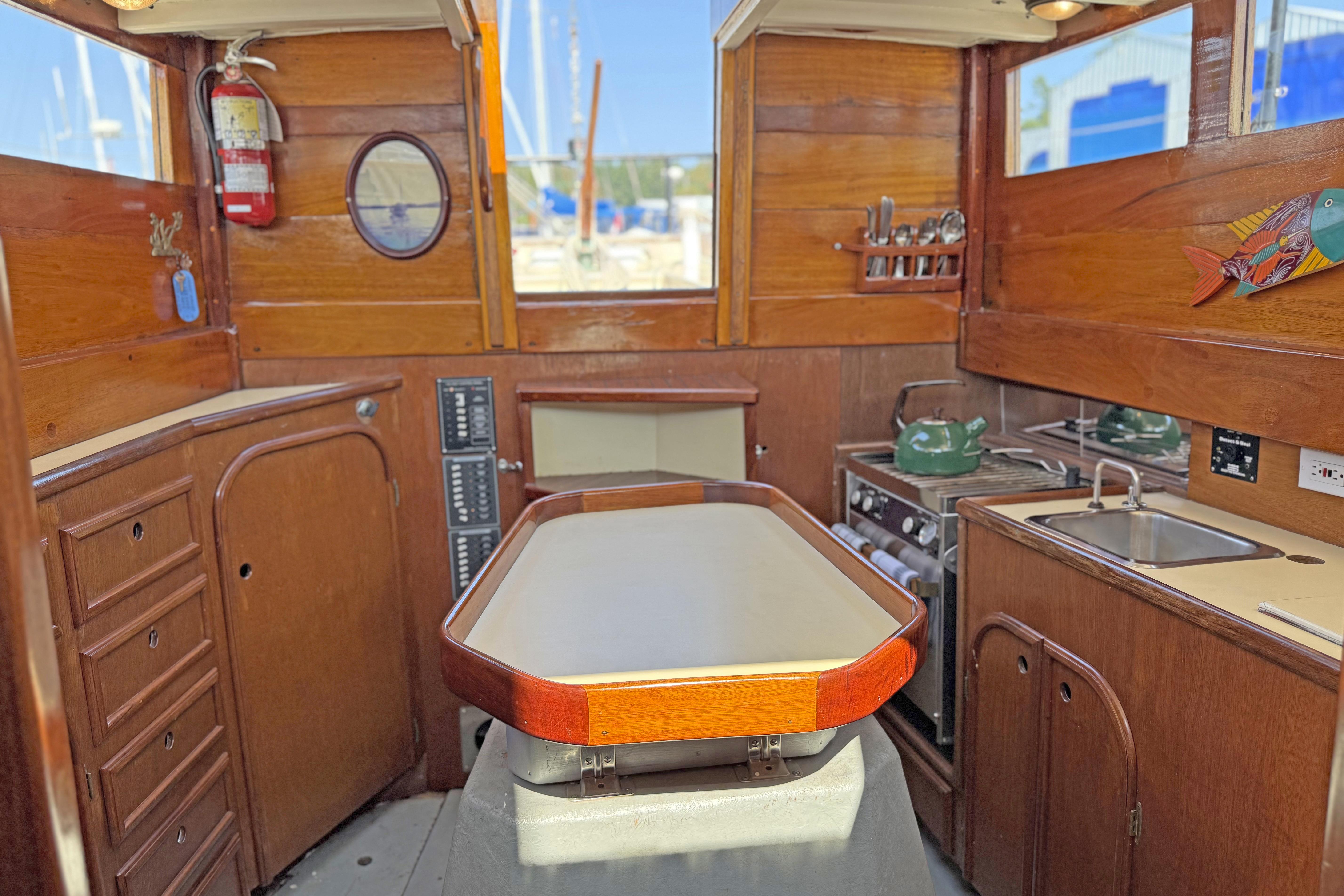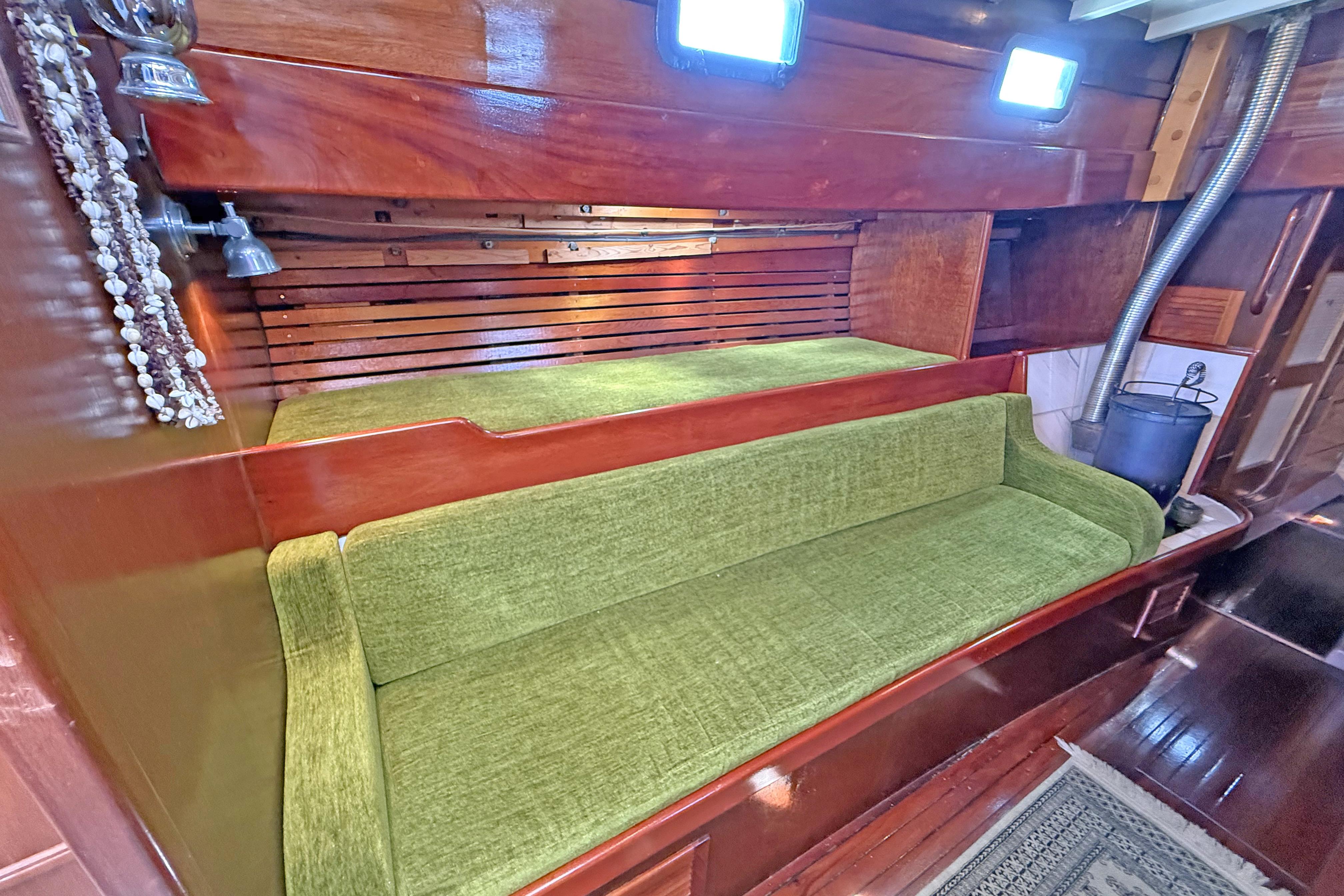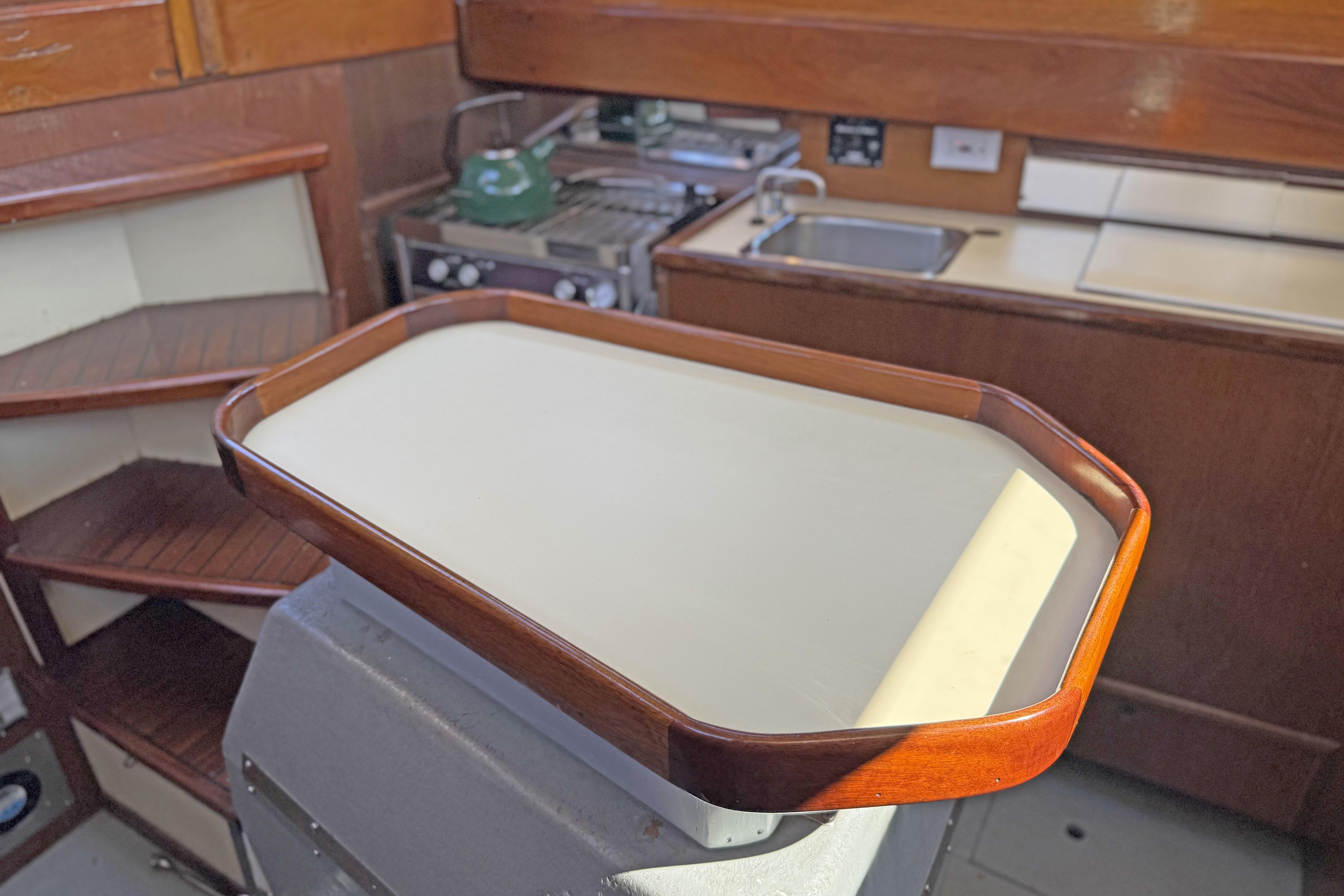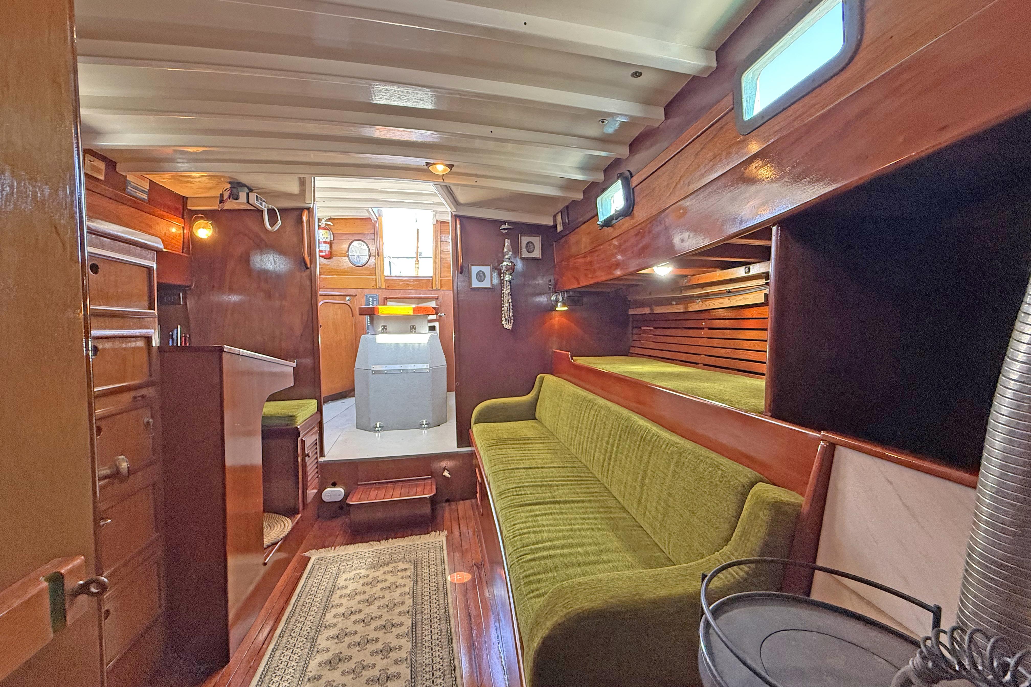The interior, finished in 1987, is finished with varnished mahogany cabinetry and cabin soles, Arborite countertops and painted deckheads. After passing through the companionway one enters the galley area with a large table and plenty of preparation space.  The galley is excellent for offshore food preparation and entertaining at anchor.  Great sightlines to the outside from the galley. A step down and forward is the salon with a large settee and a pilot berth to port.  There is a private head with shower. The expansive navigation table is to starboard and conveniently close to another pilot berth. Four deck prisms for lots of light. Phoenix drip diesel cabin heater