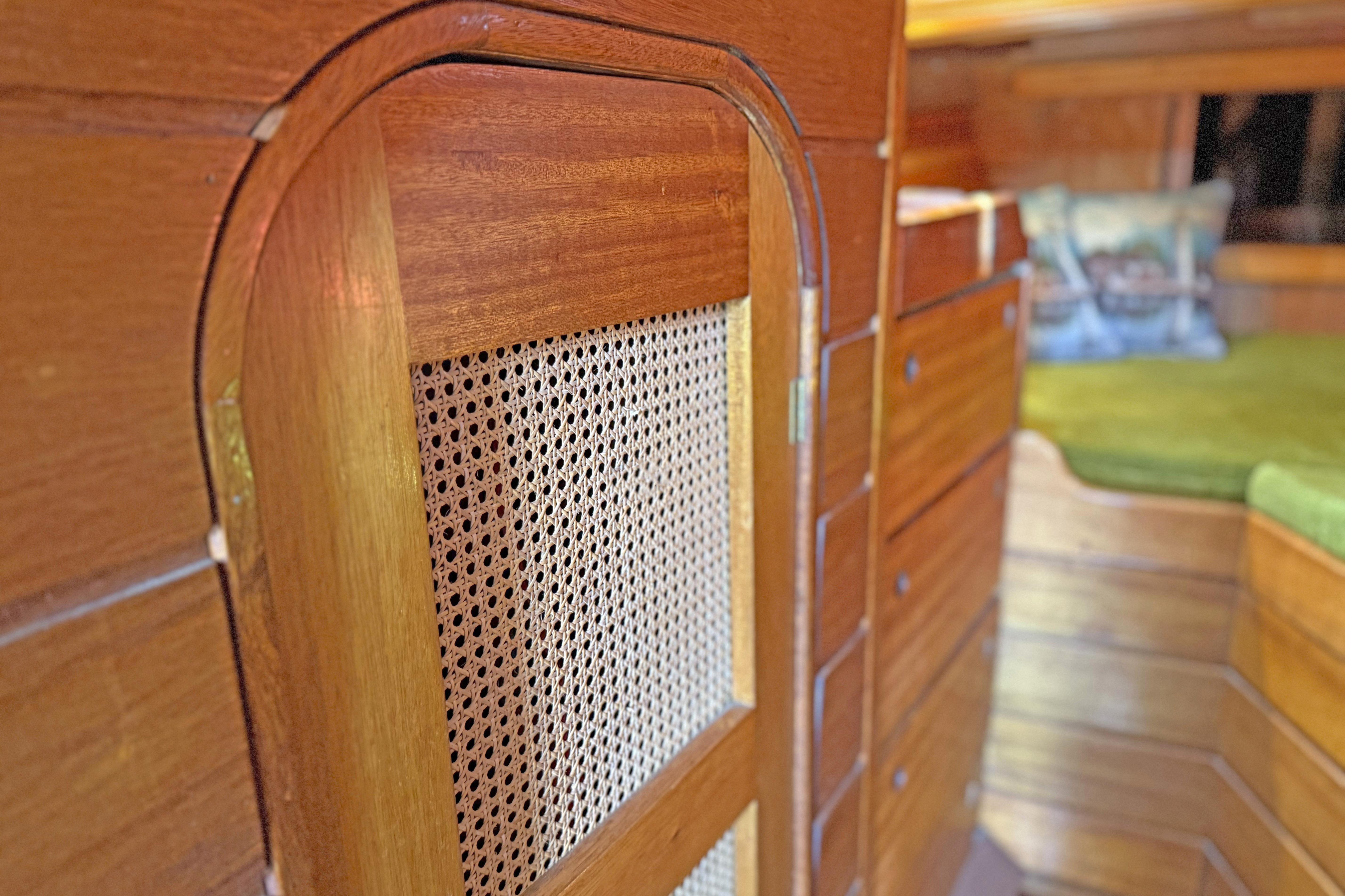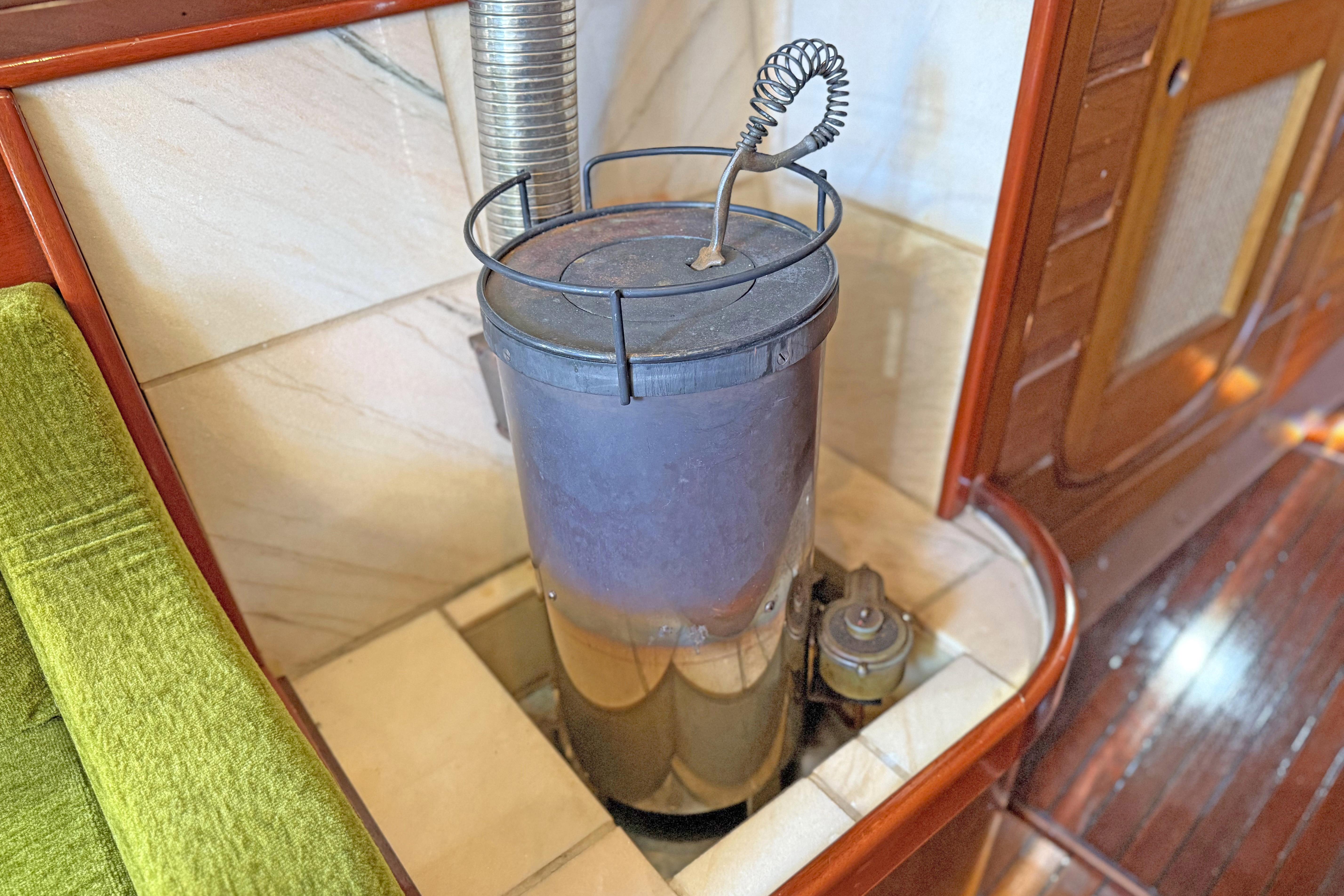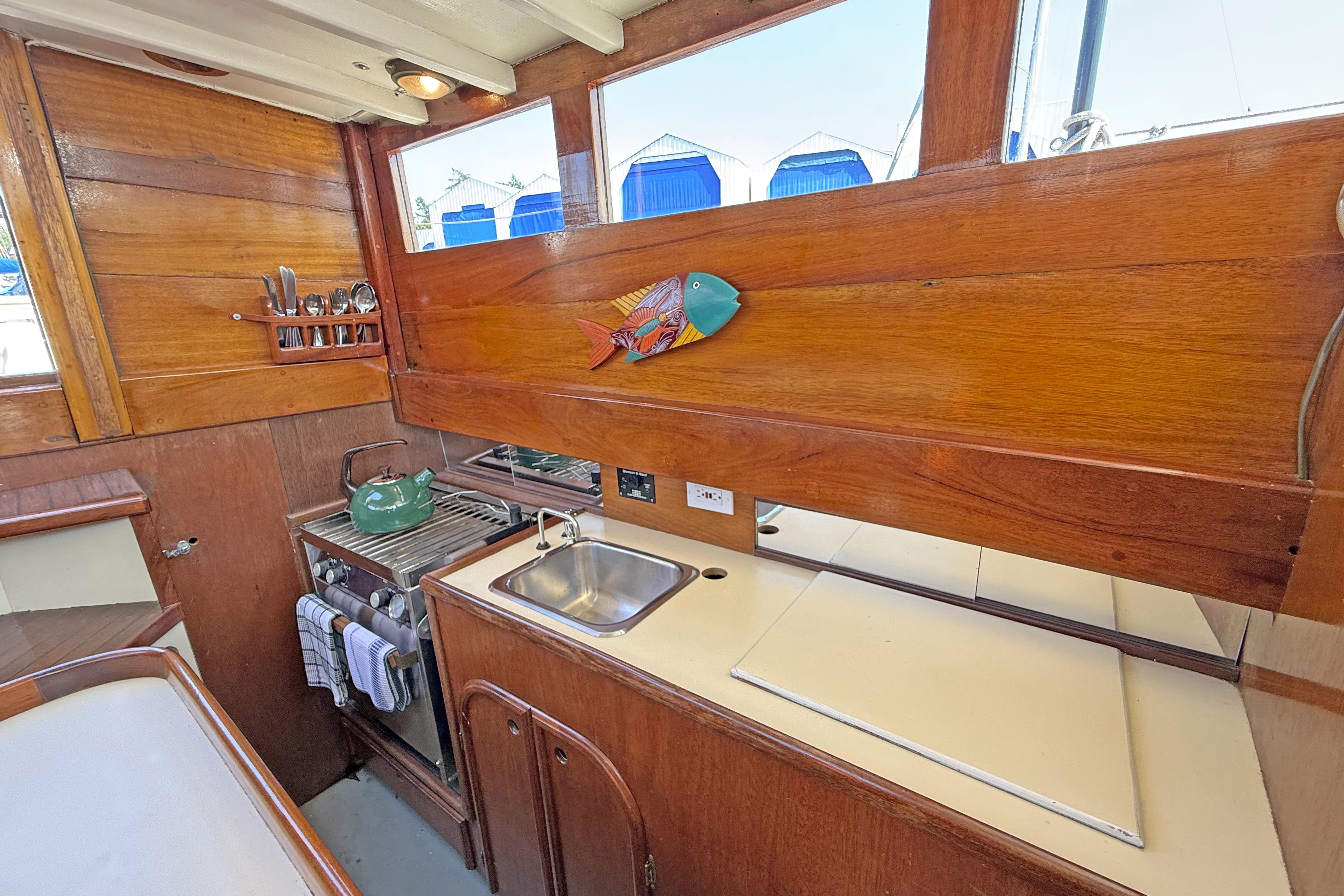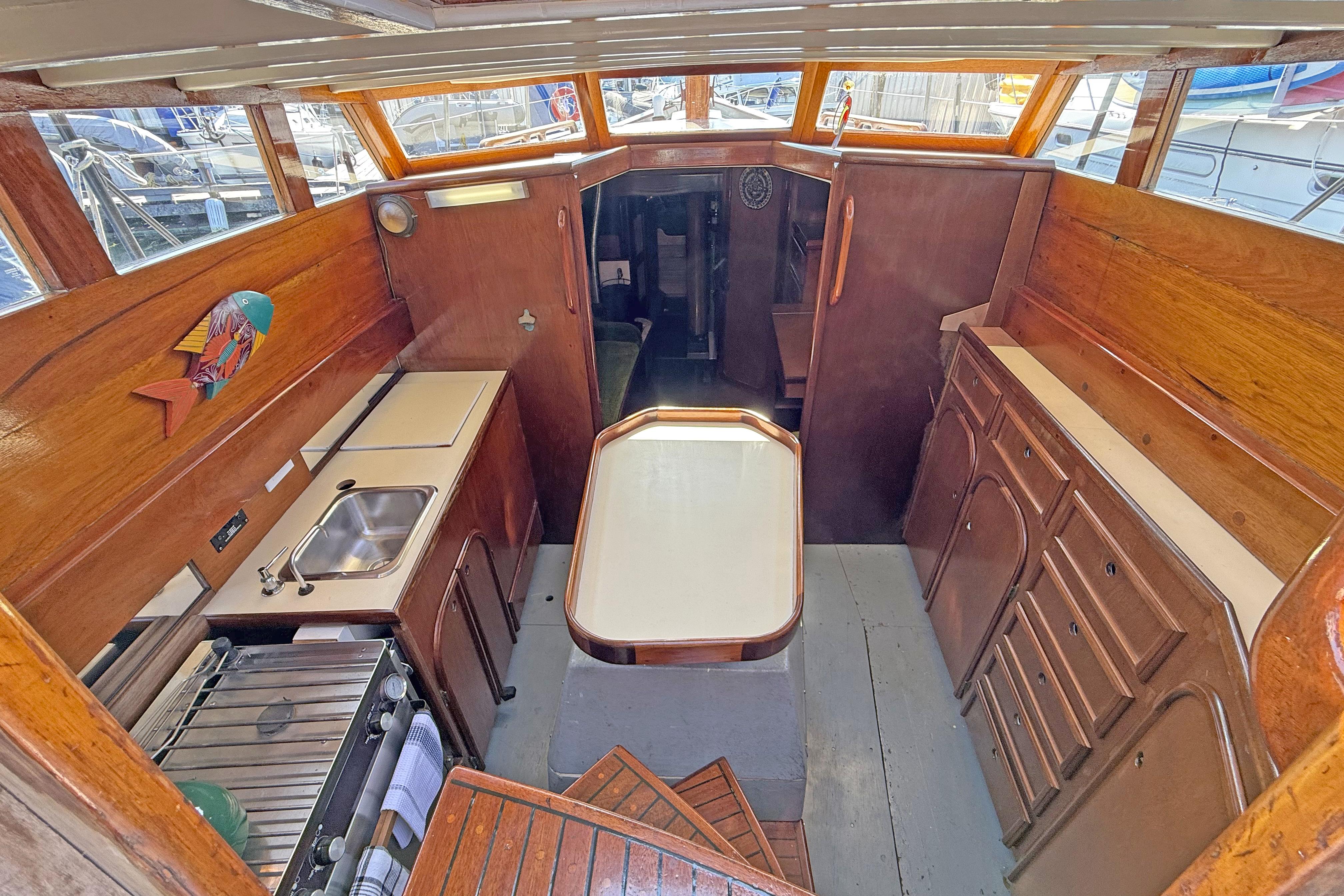 The interior, finished in 1987, is finished with varnished mahogany cabinetry and cabin soles, Arborite countertops and painted deckheads. After passing through the companionway one enters the galley area with a large table and plenty of preparation space.  The galley is excellent for offshore food preparation and entertaining at anchor.  Great sightlines to the outside from the galley. A step down and forward is the salon with a large settee and a pilot berth to port.  There is a private head with shower. The expansive navigation table is to starboard and conveniently close to another pilot berth. Four deck prisms for lots of light. Phoenix drip diesel cabin heater