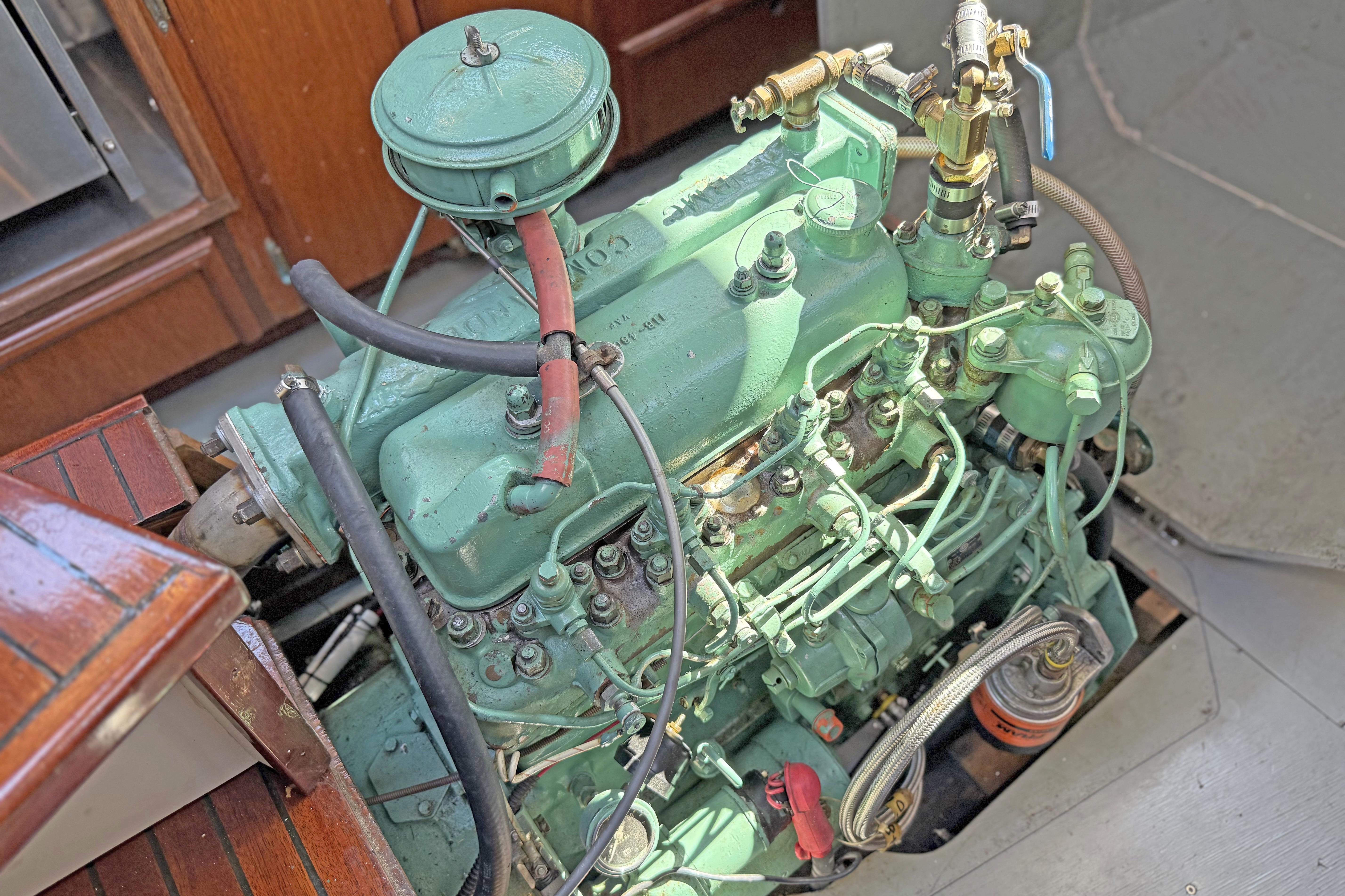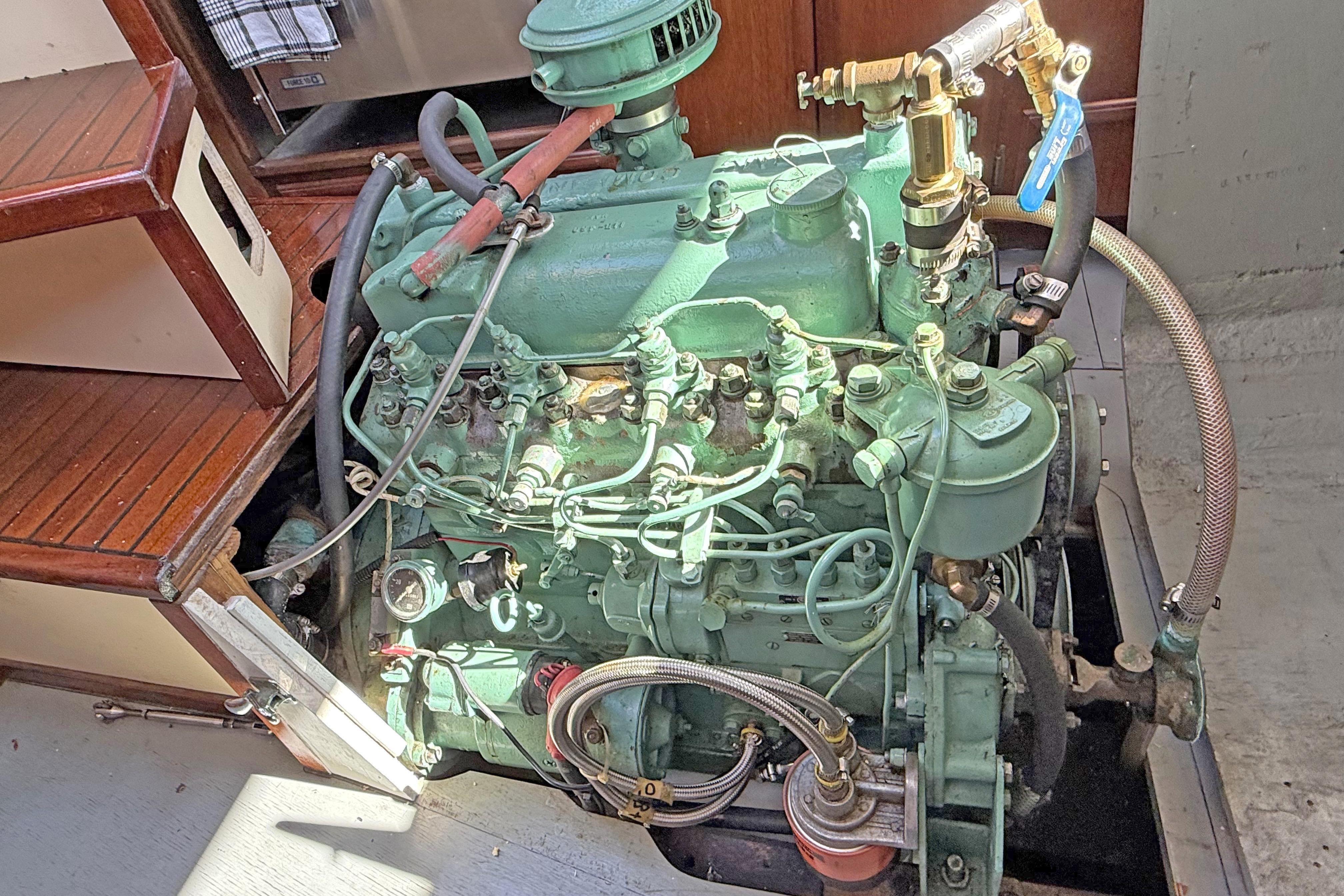 BMC British Leyland 58 hp.  Rebuilt 2005 with 25 hours since then Excellent engine access Extensive spares 23” fixed propeller Steering is currently tiller but it can be converted to hydraulic.  The lines and pump is available but a ram would be required. Dripless shaft seal