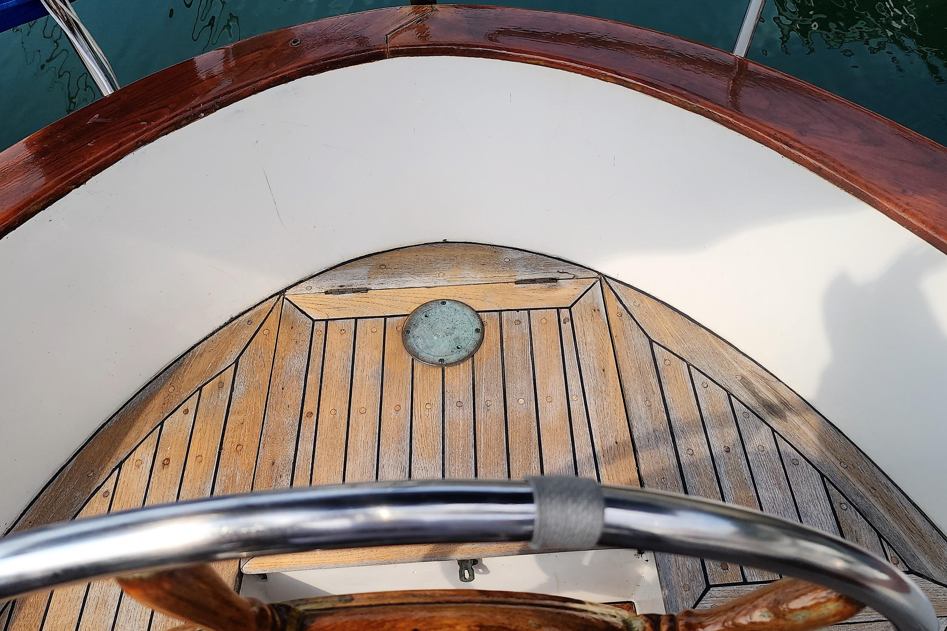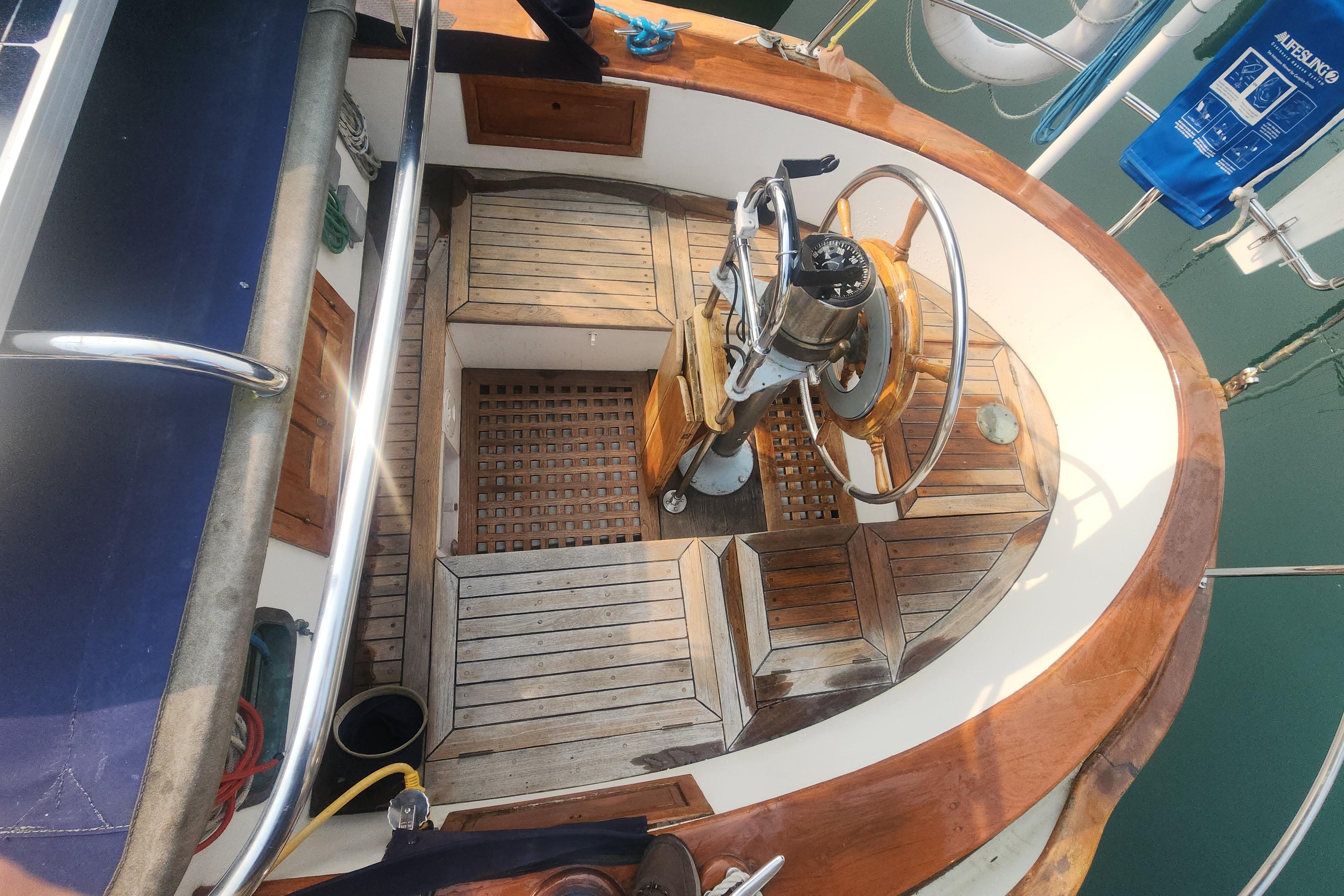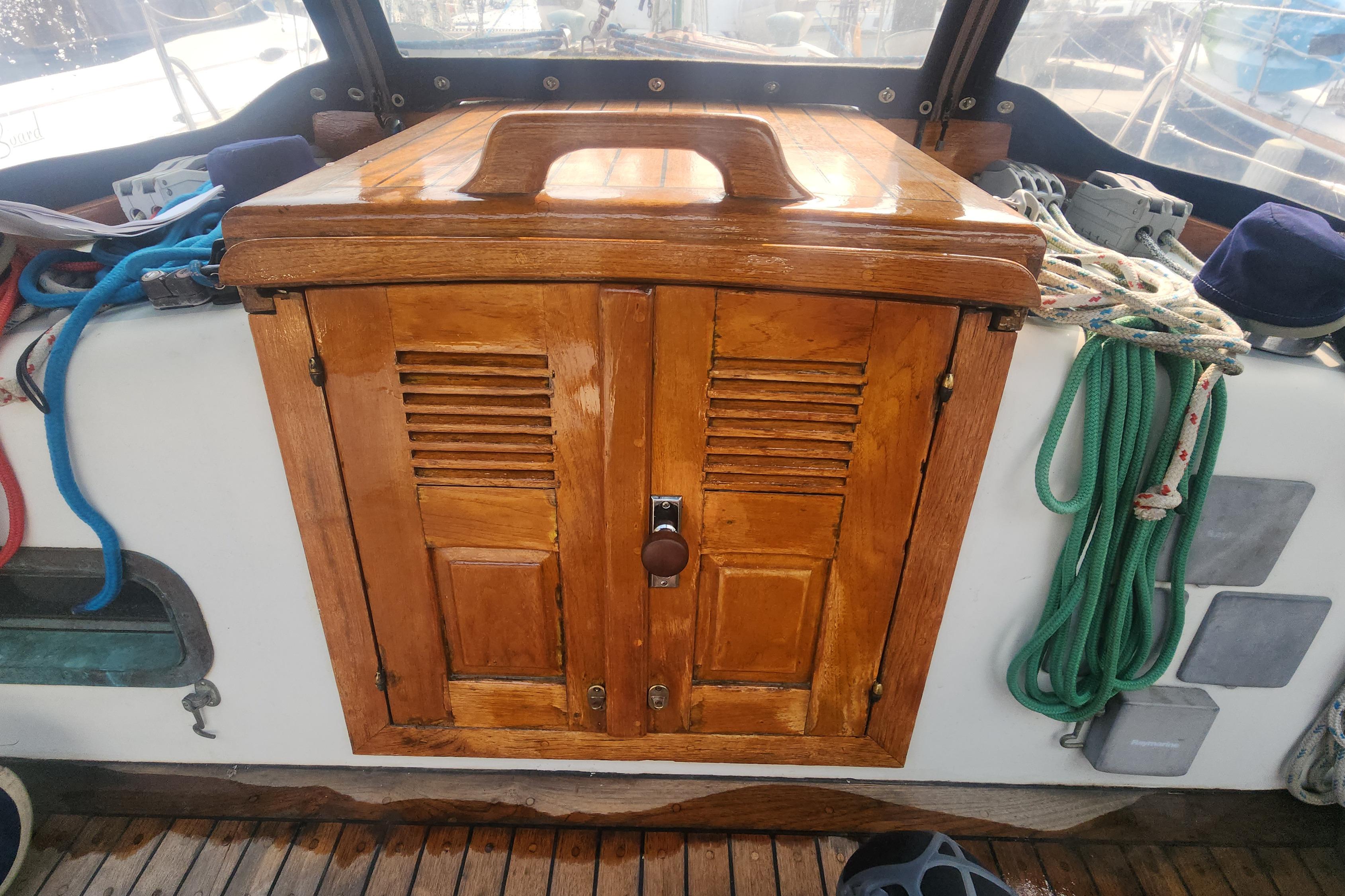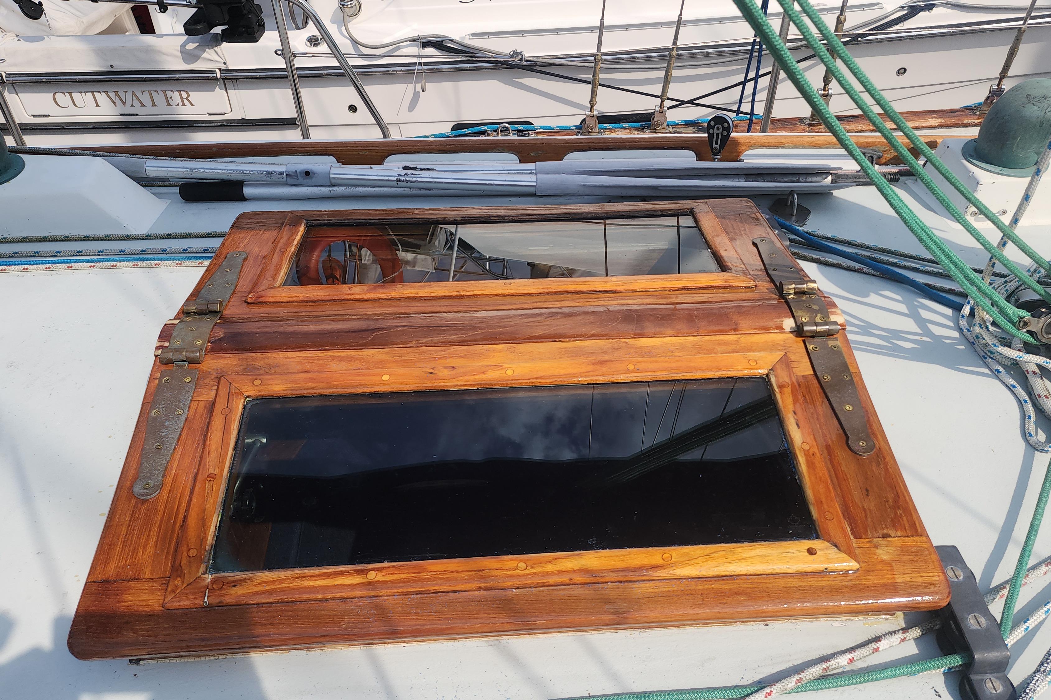 Excellent Teak decking with caulking 9 opening Bronze opening ports Large butterfly hatch over salon Opening hatch over V berth forward Stainless steel framed bow sprit with twin anchor rollers U shaped cockpit with 2 opening lockers Boom Gallows with handholds Teak cockpit table base with double teak drop Long cockpit with teak decking on seats and floor Stainless steel pulpit, pushpit and stanchions Newer Stainless steel double lifelines (non-jacketed) Life line gates port and starboard Double teak doors at companionway 2 Dorades over salon with stainless steel guards Anchor locker Double bow rollers