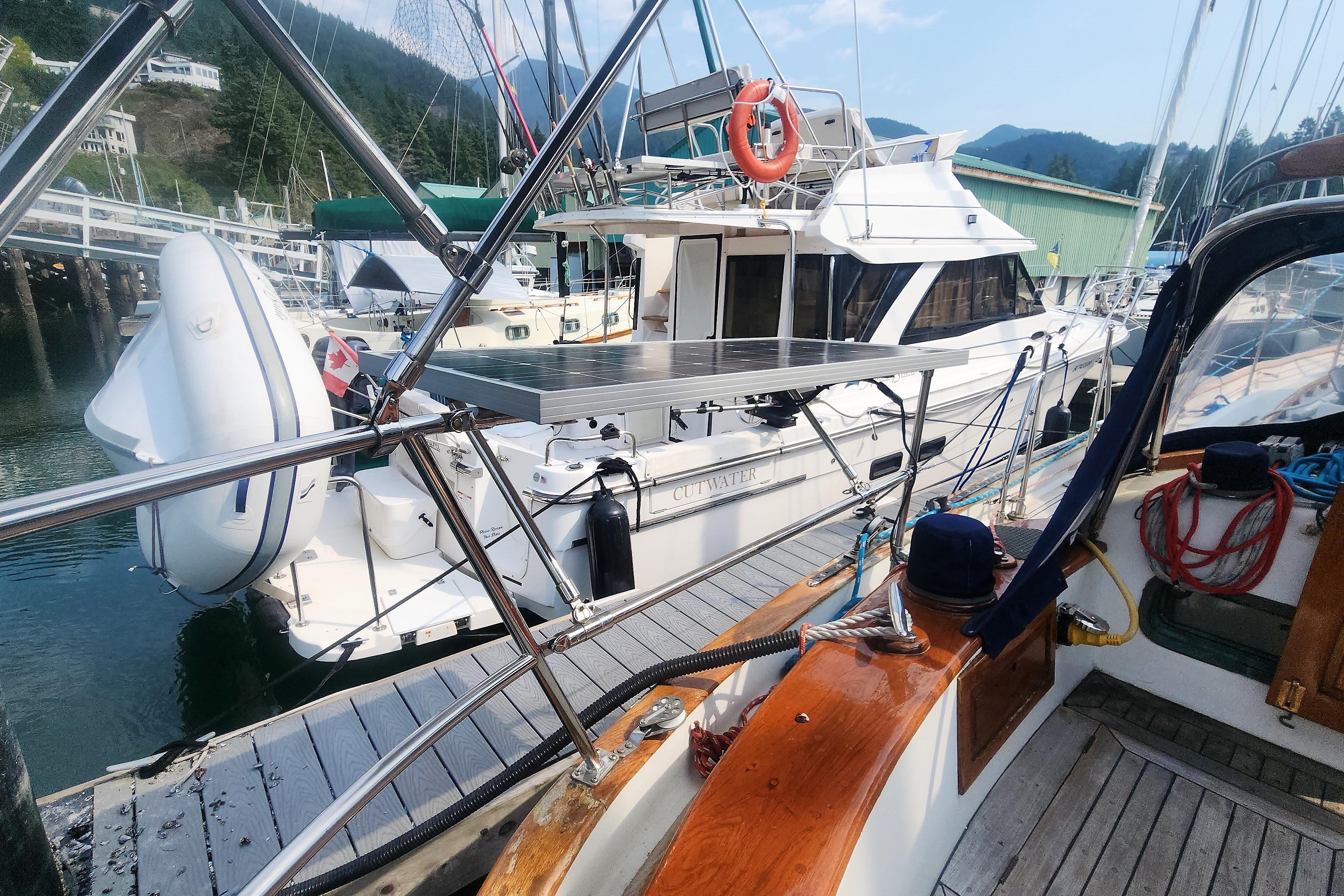 House bank is 6 6V Trojan T105 “golf cart” providing 750AmpHr Engine start battery is 12v Series 31 All batteries are in boxes 3 x 100 Sungold SGM-100W-18 Solar panels Epever Trace MTTP controller Epever MT50 remote Magnum ME2012 Charger with sine wave 1500w Inverter with remote monitor at nav station 110V system 30 amp power cord with smart plug end Smart plug receptacle for shore power cord GFI 110V plugs located throughout boat LED lightingPlumbing