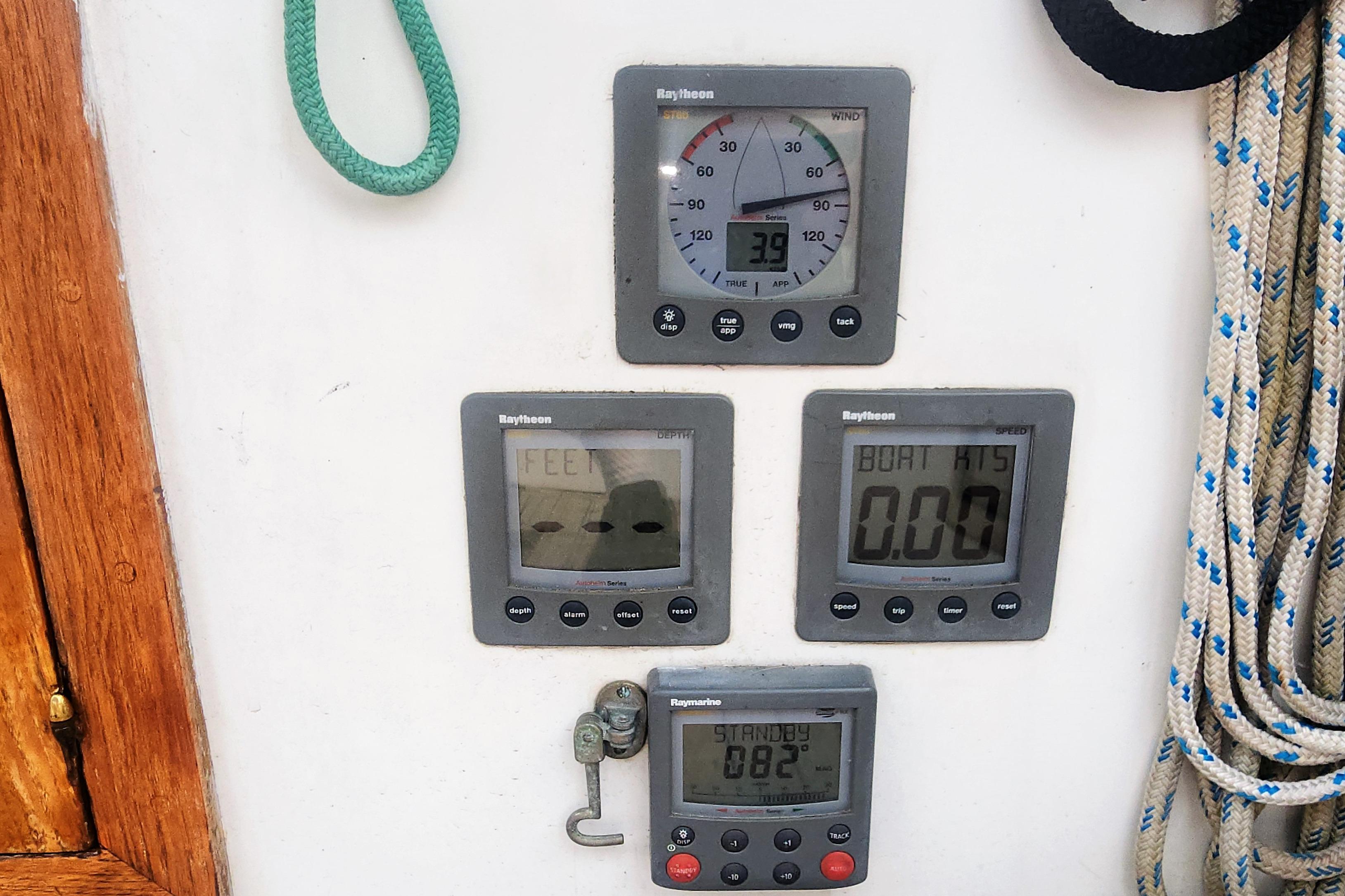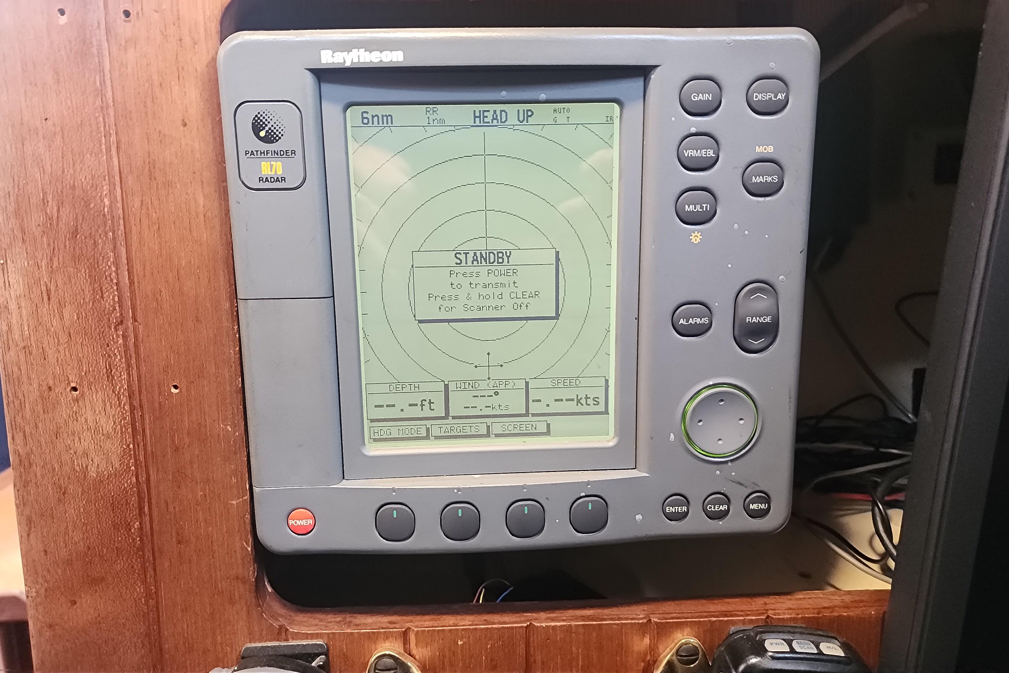 Raymarine S1 Smart Pilot auto pilot with Raymarine ST6002+ controller Airmar Transducer Raymarine ST60 depth RaymarineST60 knot Raymarine ST60 wind Simrad CX33 colour Map/ GPS screen at helm Raymarine Radome on back stay ICOM IC M602 AIS with antenna splitter VHF Ritchie 6” magnetic compass VHF Antenna Clarion M109 stereo with salon and cockpit speakers Masthead light, deck light and running and steaming lights
