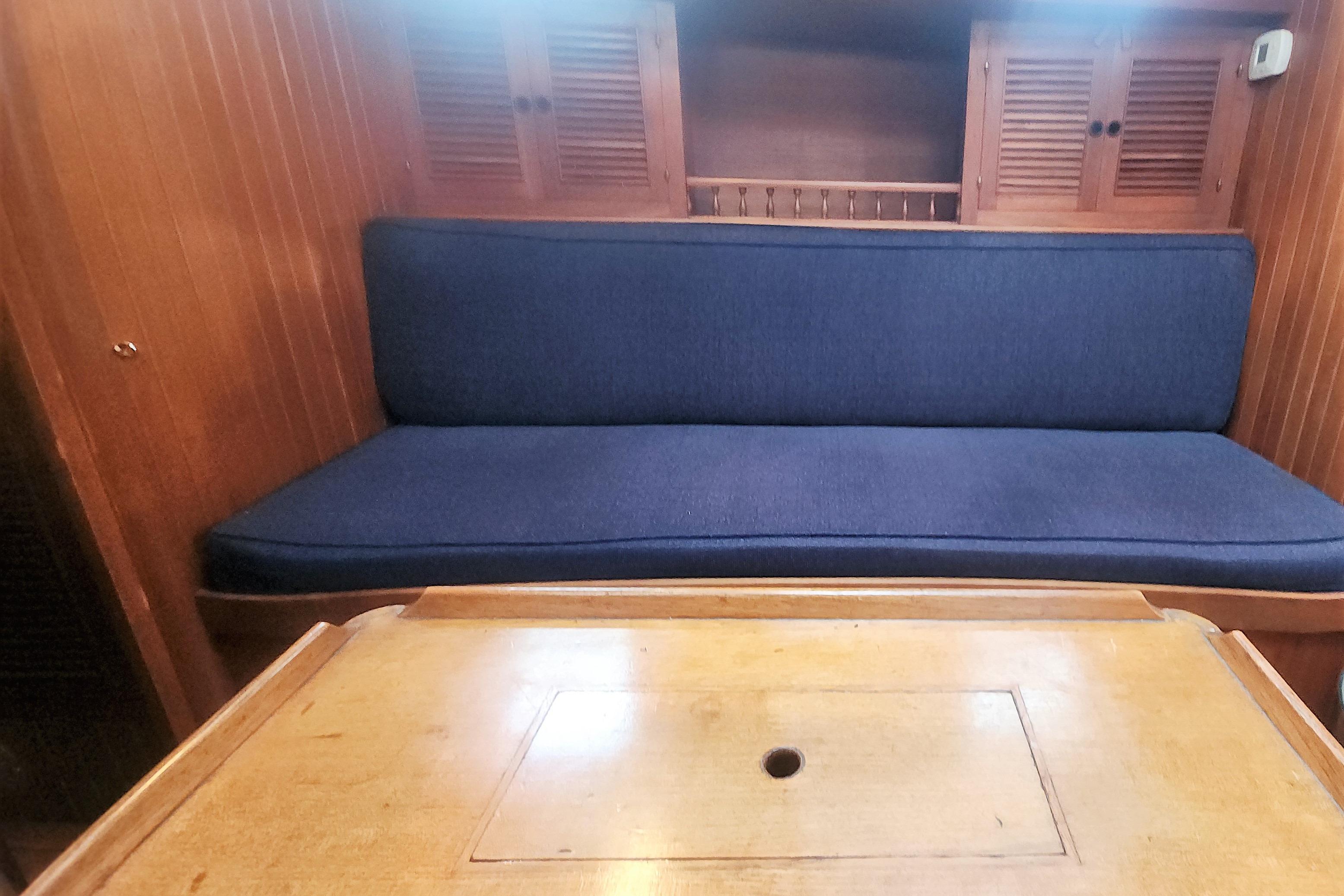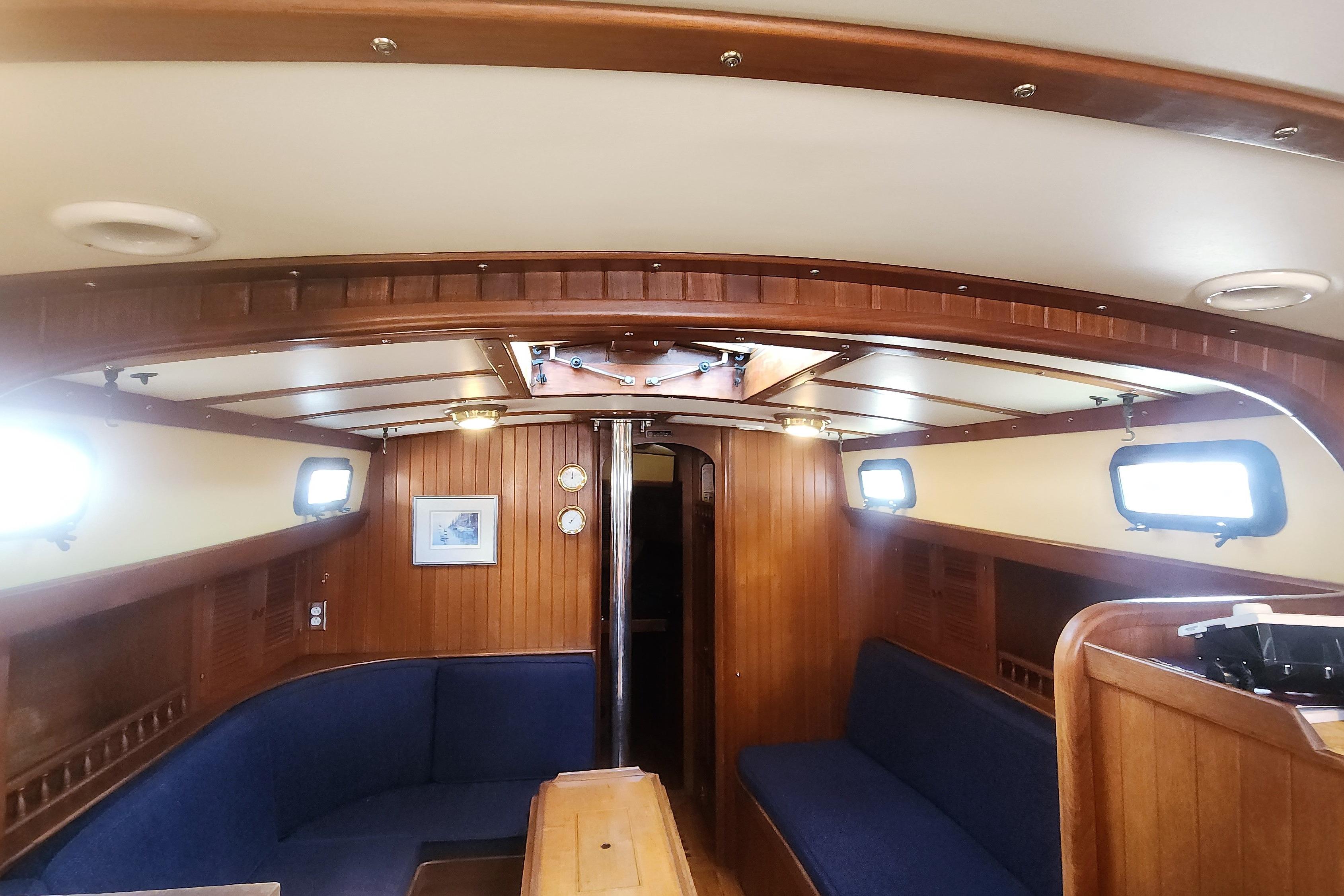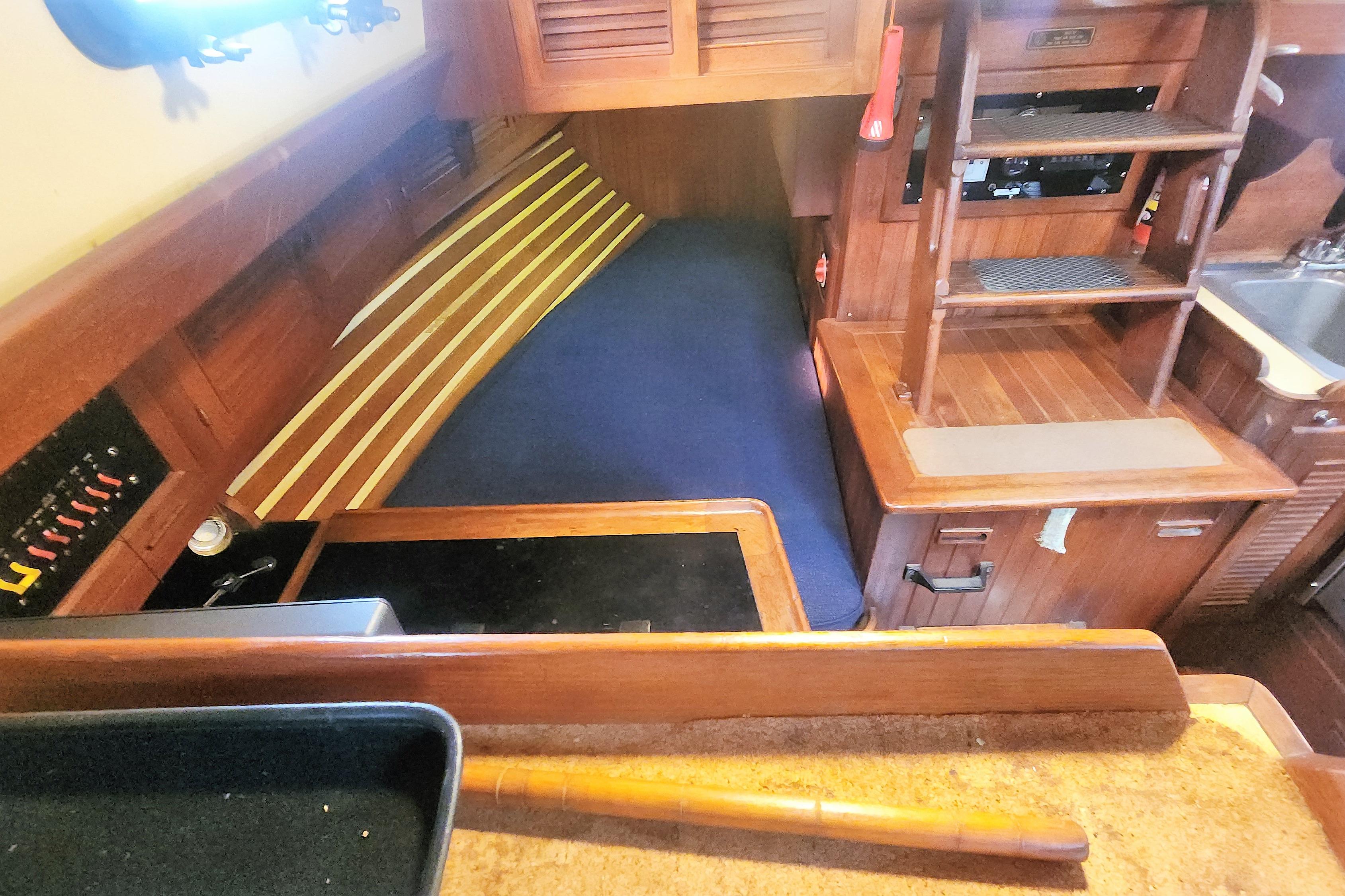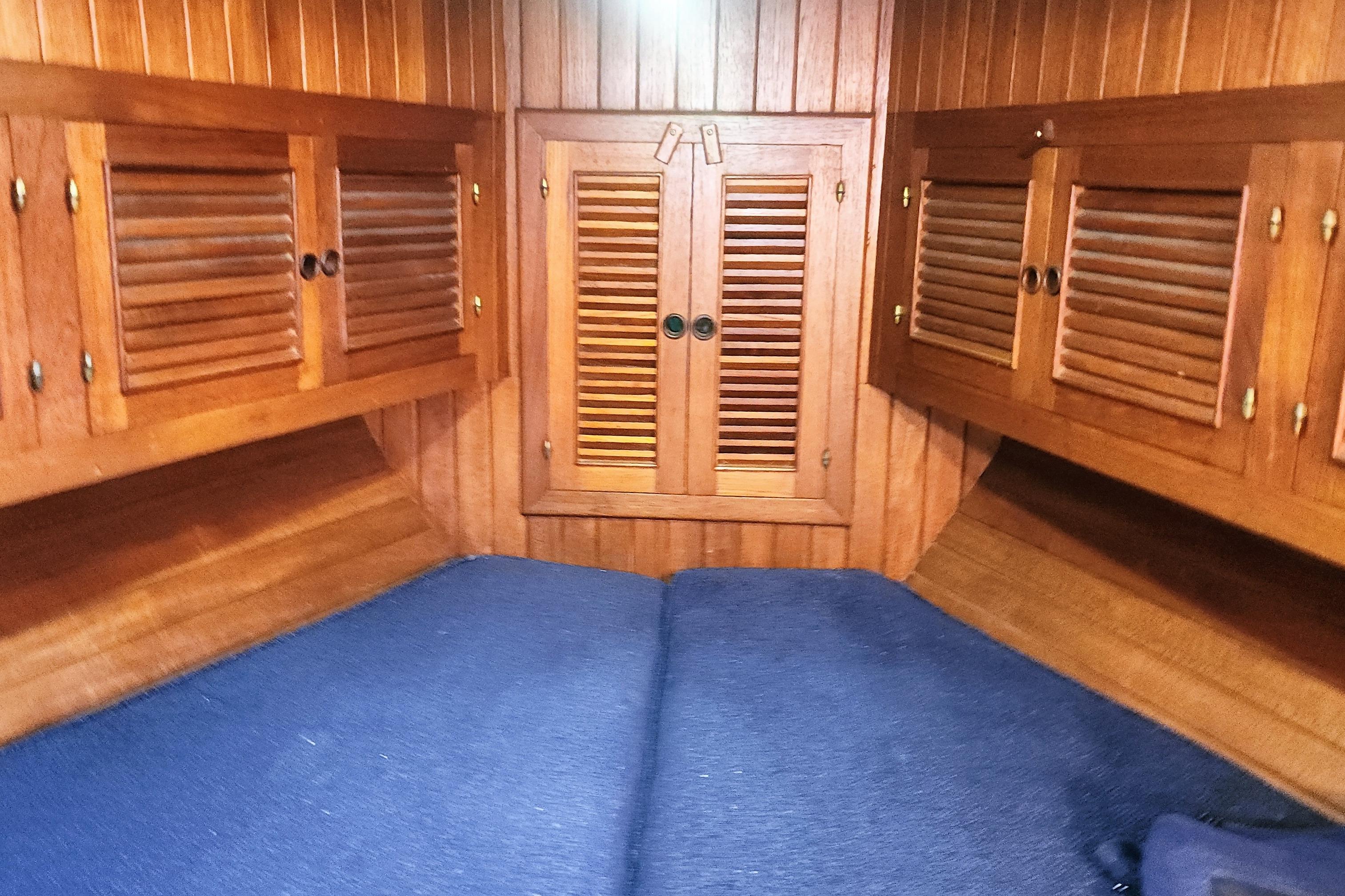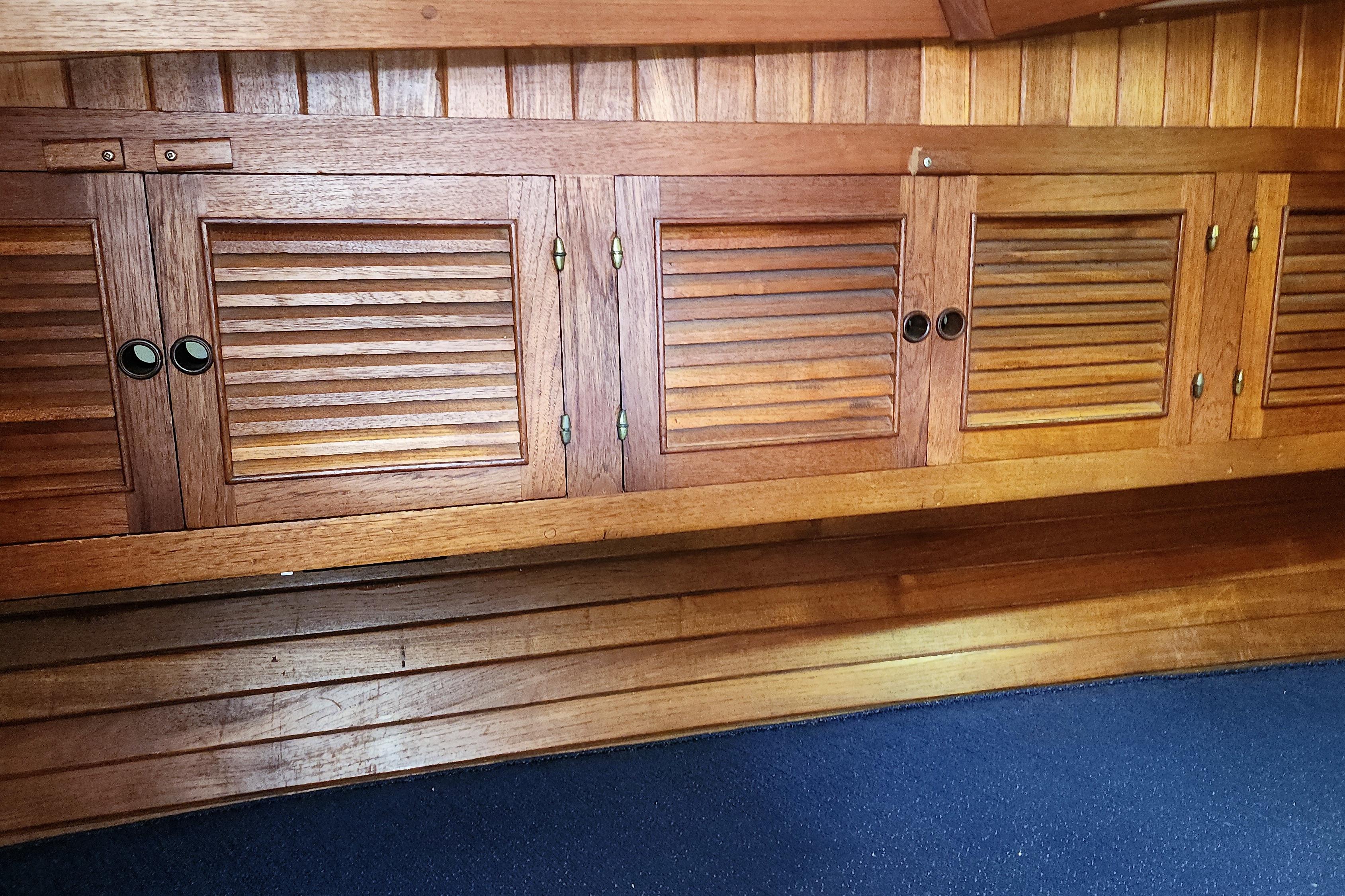 The interior of the Young Sun Westwind is done in rich teak All the lockers have vented doors The flooring is solid teak and Holly V berth forward with overhead hatch Excellent access to anchor chain Lots of opening cupboards Enclosed head that has 2 doors to make large shower area Head has opening port along with vanity and sink Shower is from faucet Large hanging locker to starboard of head Salon has C settee to port with large table Table has 2 leafs to make full table Starboard side has settee. Chart table is aft of the starboard settee and is facing forward ahead of large quarter berth Galley is to port across from nav station Double sinks Lots of storage 2 Opening ports Force 10 2 burner stove and oven with gimball feature Outboard of galley counter are cupboards Ample drawers Isotherm Cold Plate in ice box