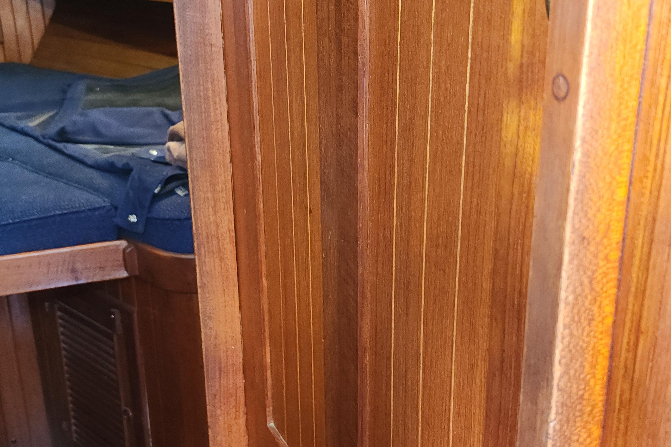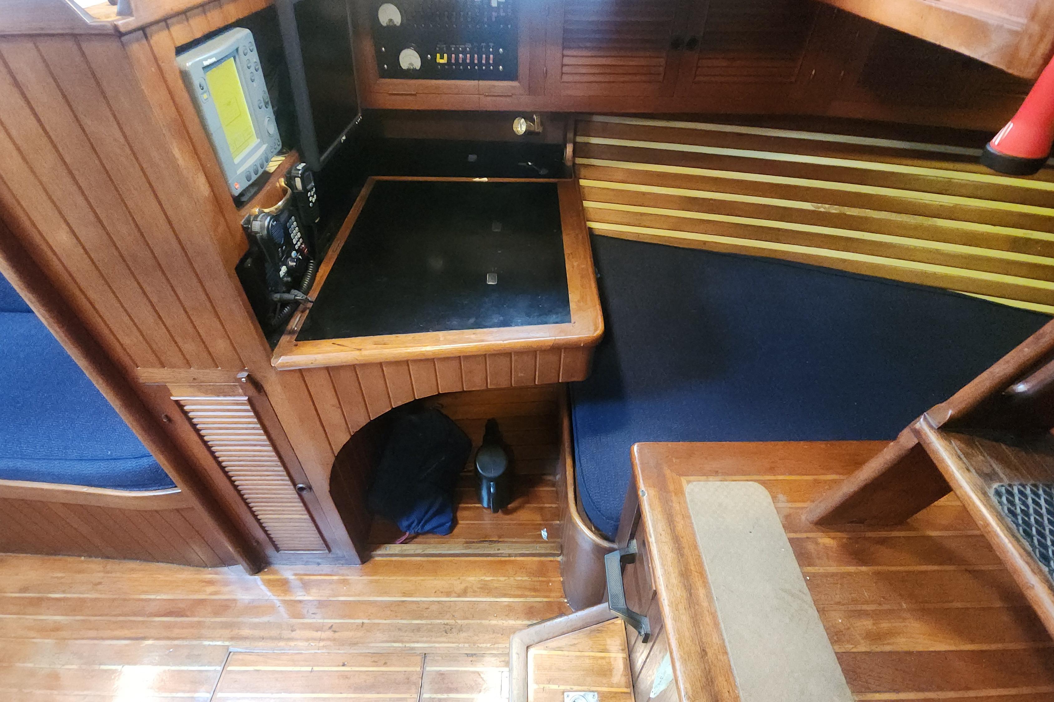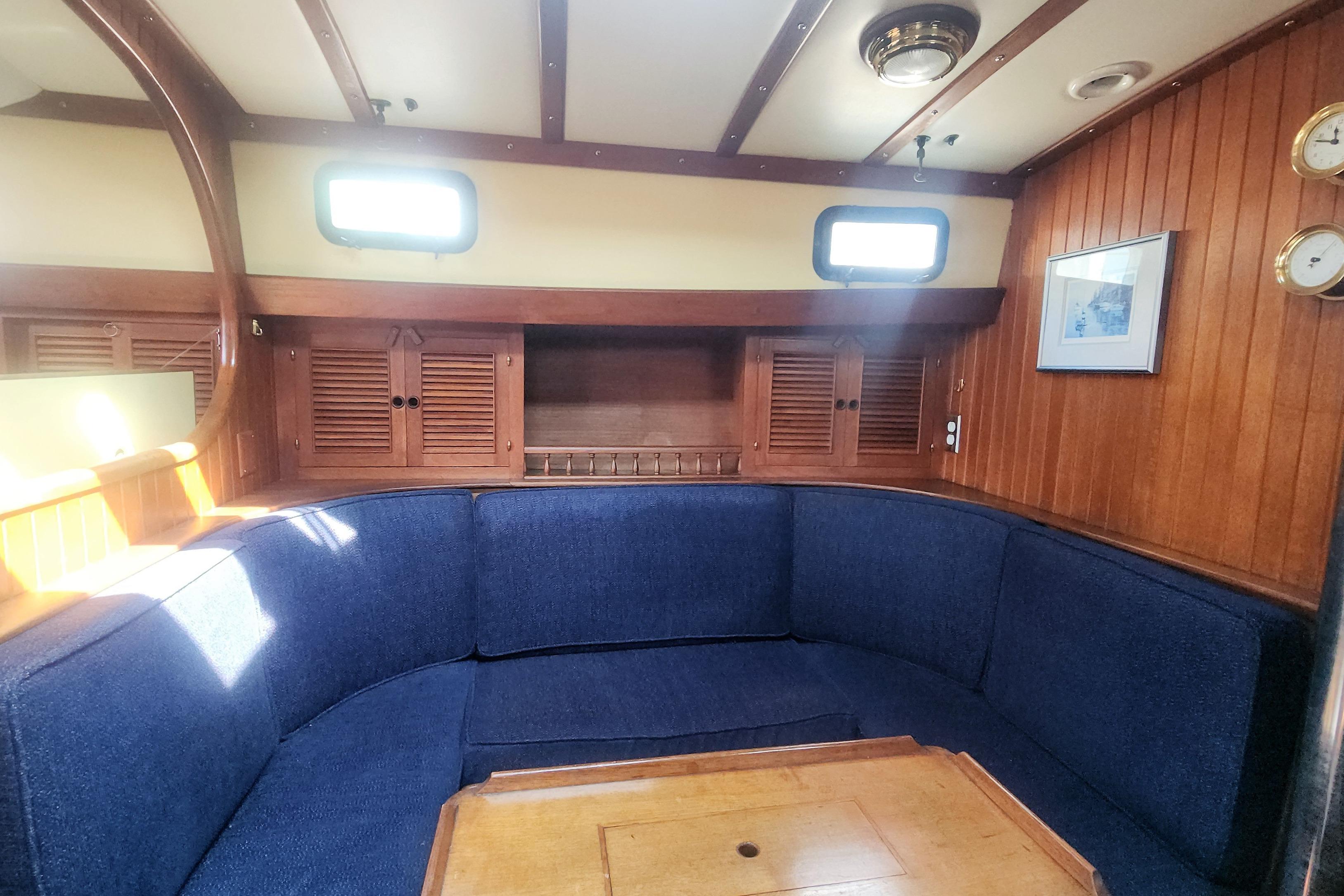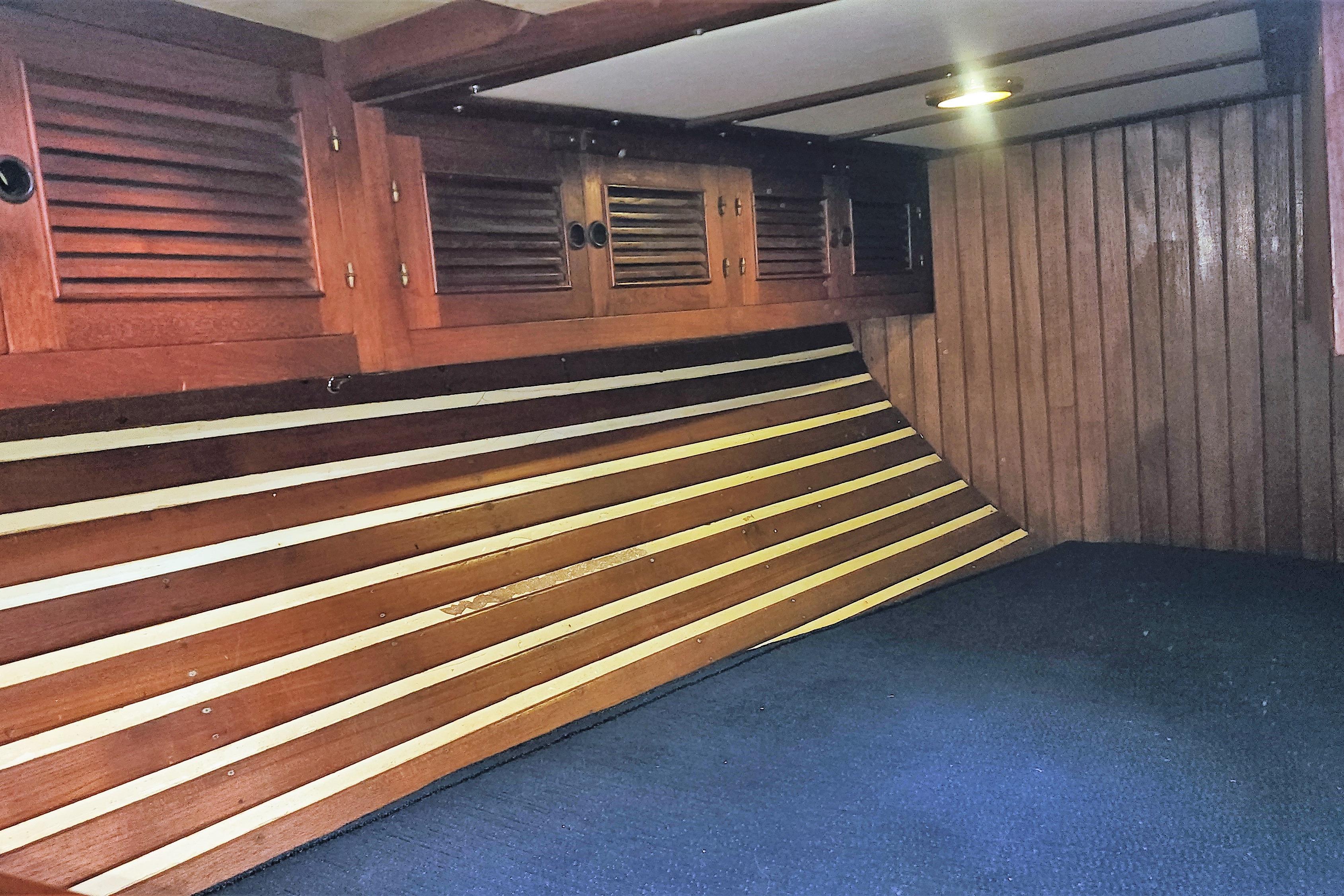 The interior of the Young Sun Westwind is done in rich teak All the lockers have vented doors The flooring is solid teak and Holly V berth forward with overhead hatch Excellent access to anchor chain Lots of opening cupboards Enclosed head that has 2 doors to make large shower area Head has opening port along with vanity and sink Shower is from faucet Large hanging locker to starboard of head Salon has C settee to port with large table Table has 2 leafs to make full table Starboard side has settee. Chart table is aft of the starboard settee and is facing forward ahead of large quarter berth Galley is to port across from nav station Double sinks Lots of storage 2 Opening ports Force 10 2 burner stove and oven with gimball feature Outboard of galley counter are cupboards Ample drawers Isotherm Cold Plate in ice box
