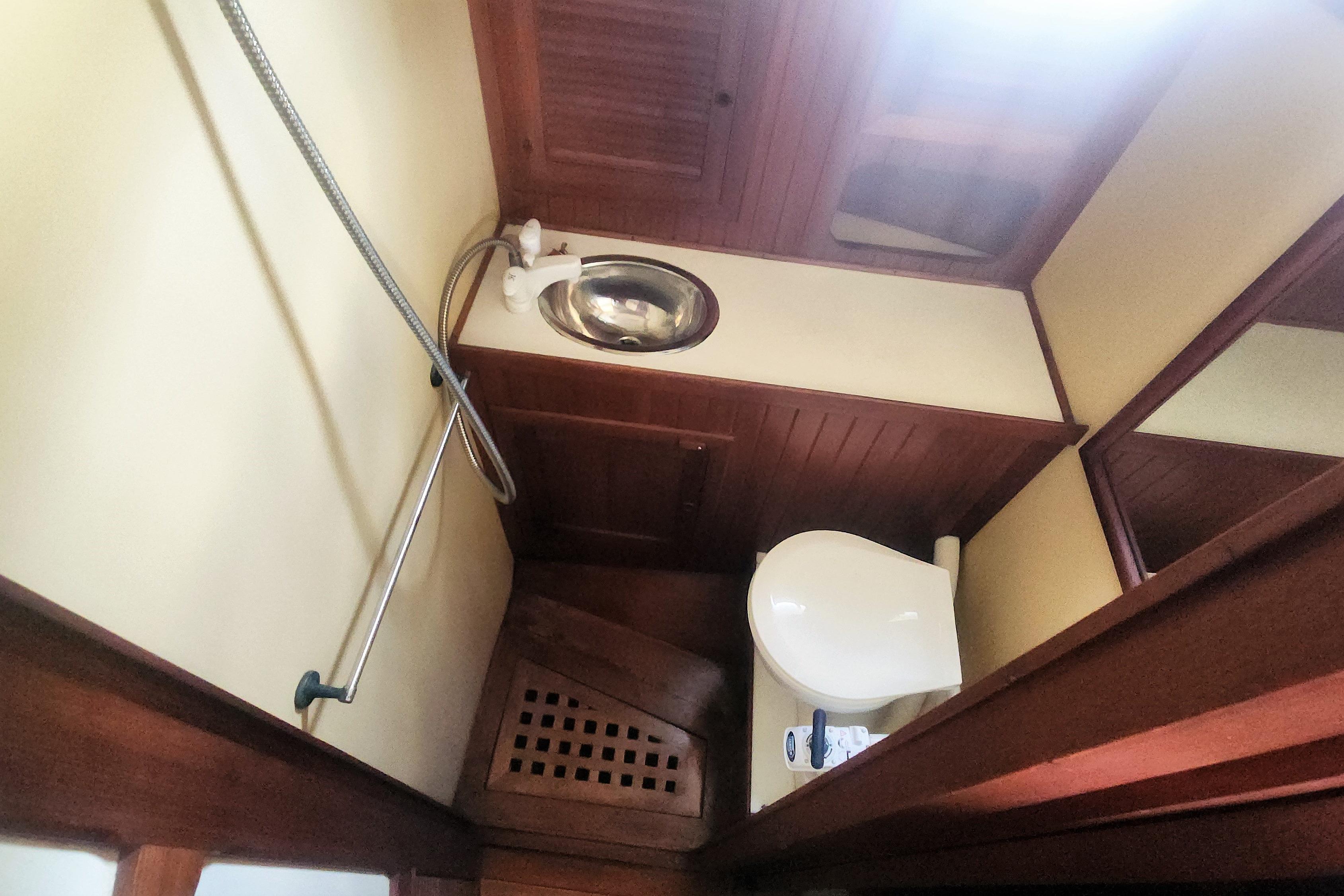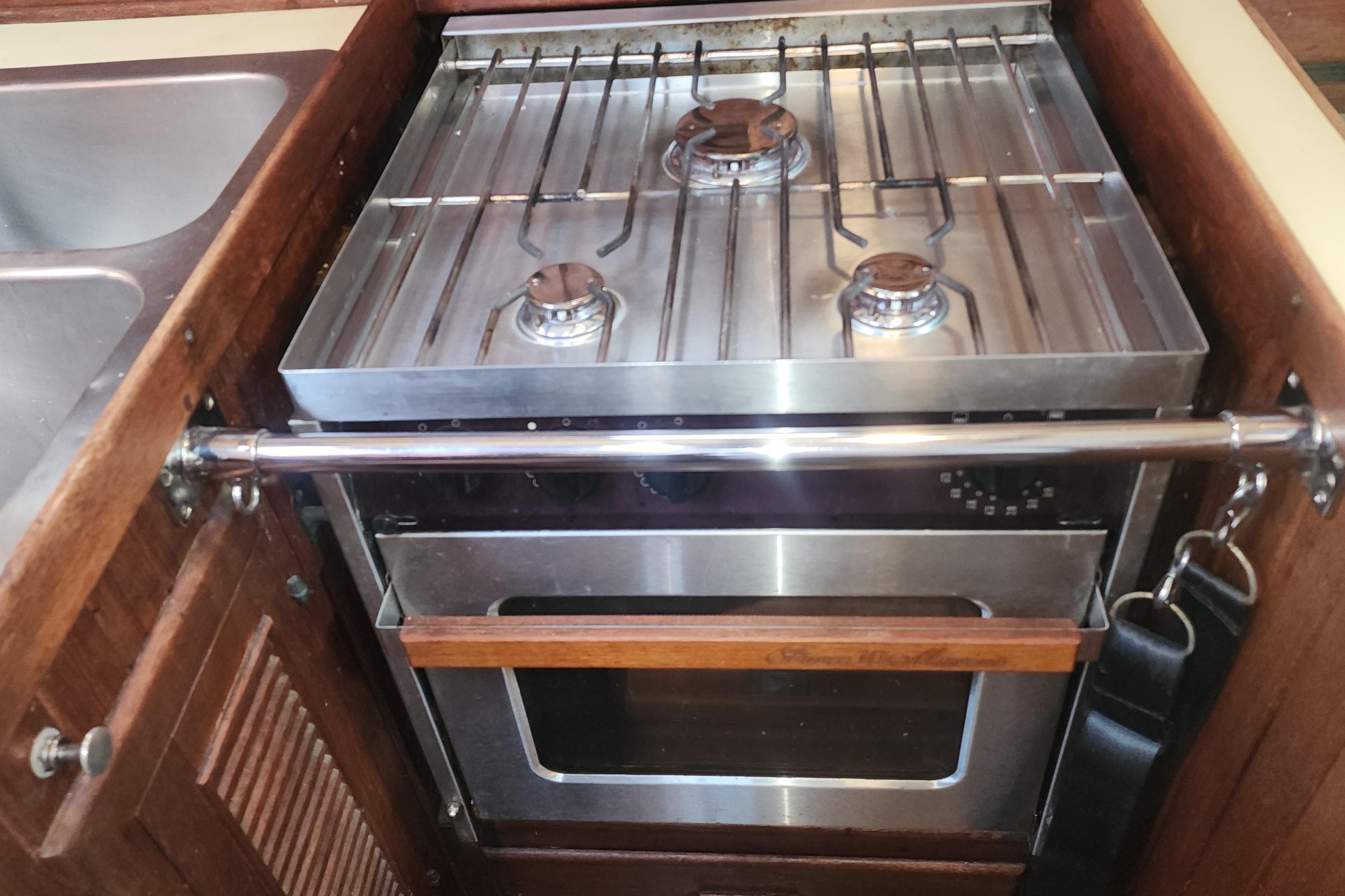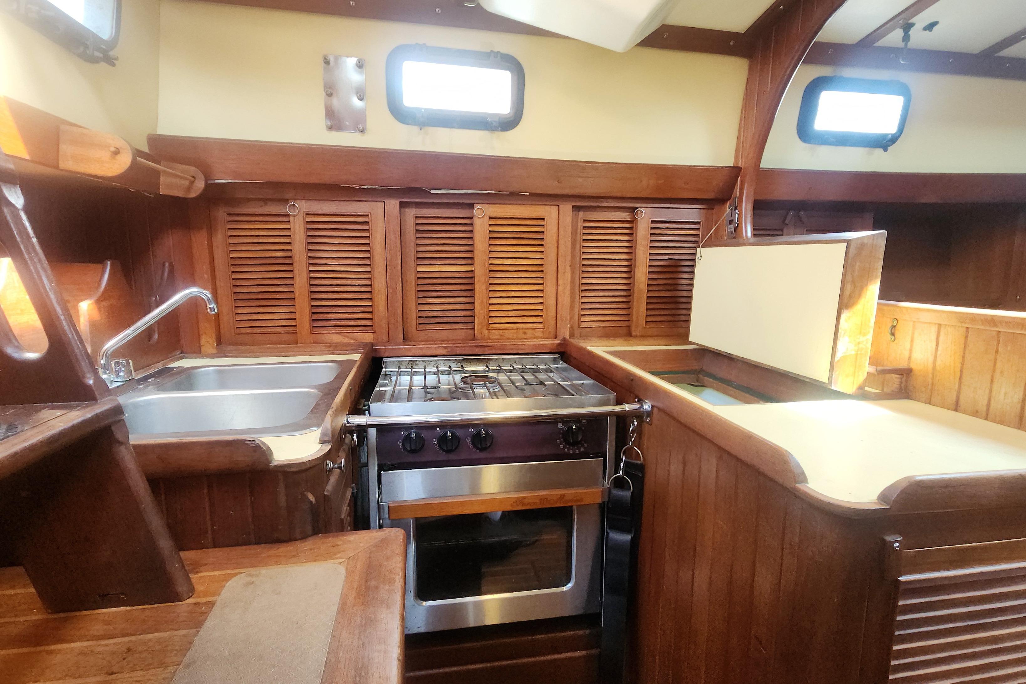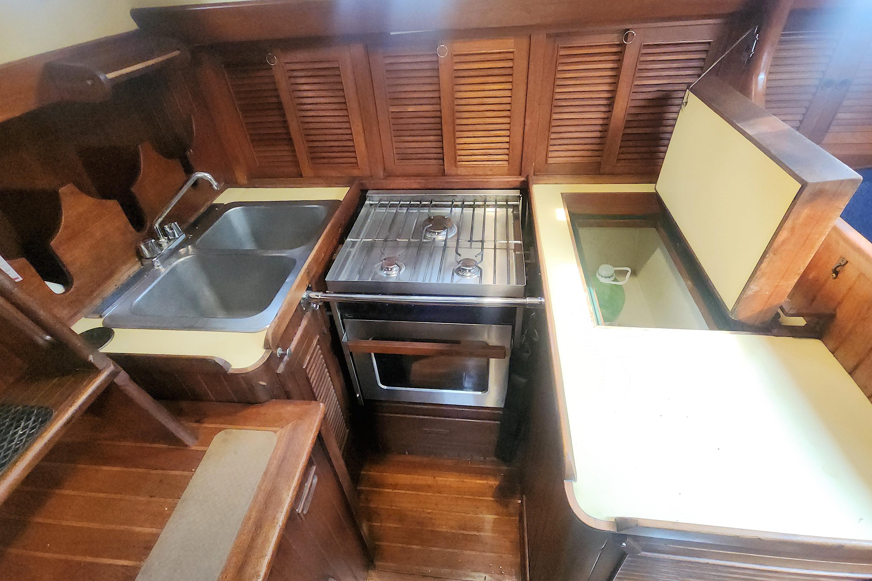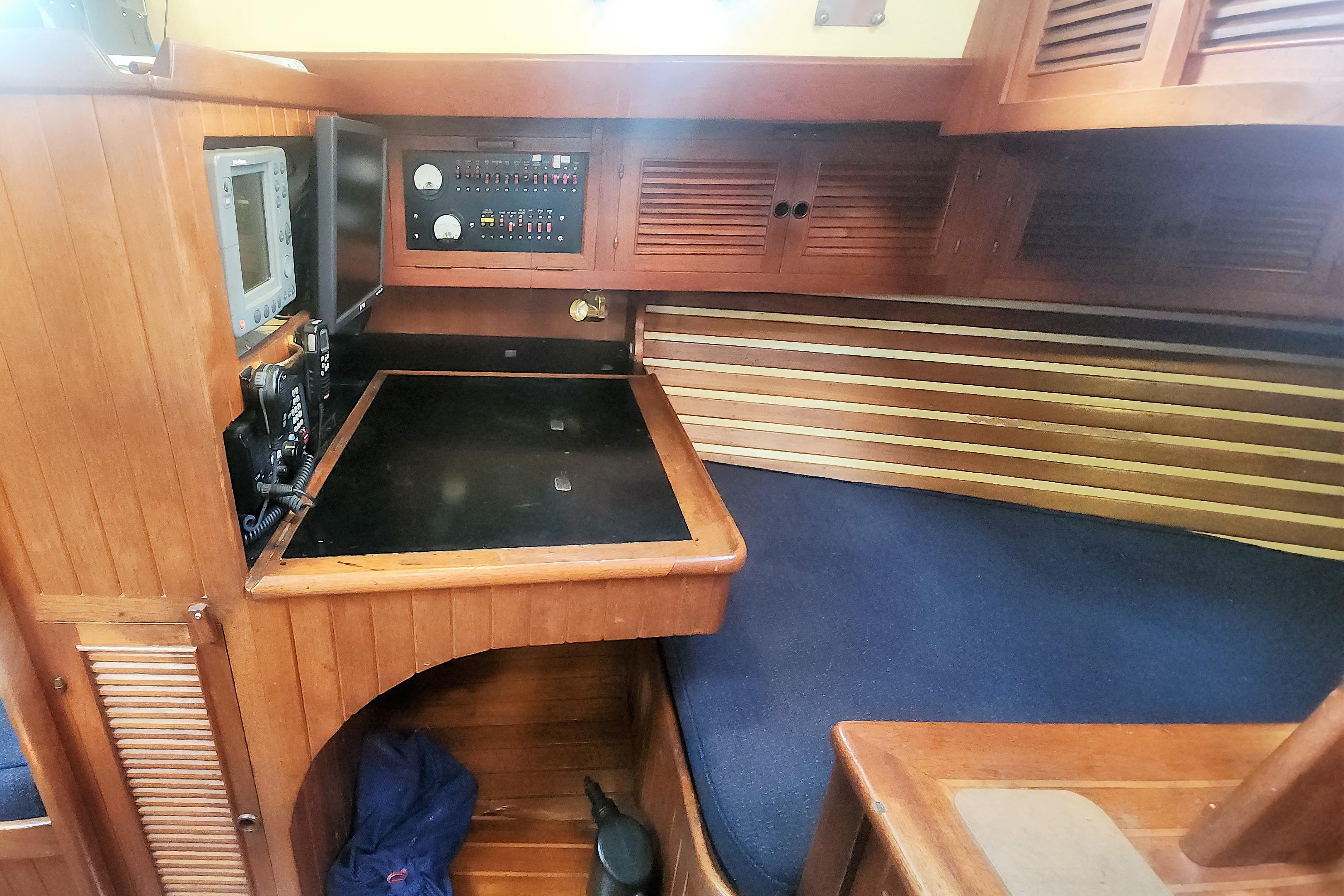 The interior of the Young Sun Westwind is done in rich teak All the lockers have vented doors The flooring is solid teak and Holly V berth forward with overhead hatch Excellent access to anchor chain Lots of opening cupboards Enclosed head that has 2 doors to make large shower area Head has opening port along with vanity and sink Shower is from faucet Large hanging locker to starboard of head Salon has C settee to port with large table Table has 2 leafs to make full table Starboard side has settee. Chart table is aft of the starboard settee and is facing forward ahead of large quarter berth Galley is to port across from nav station Double sinks Lots of storage 2 Opening ports Force 10 2 burner stove and oven with gimball feature Outboard of galley counter are cupboards Ample drawers Isotherm Cold Plate in ice box