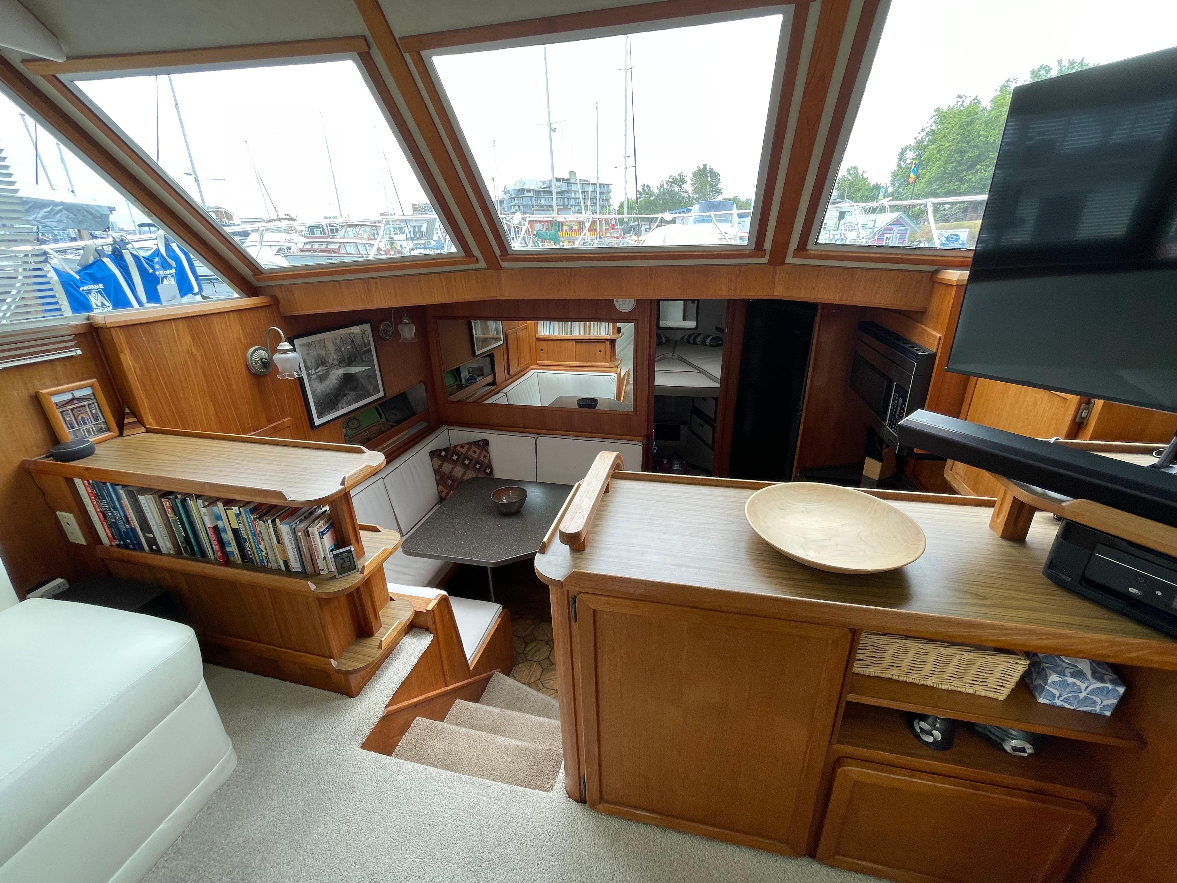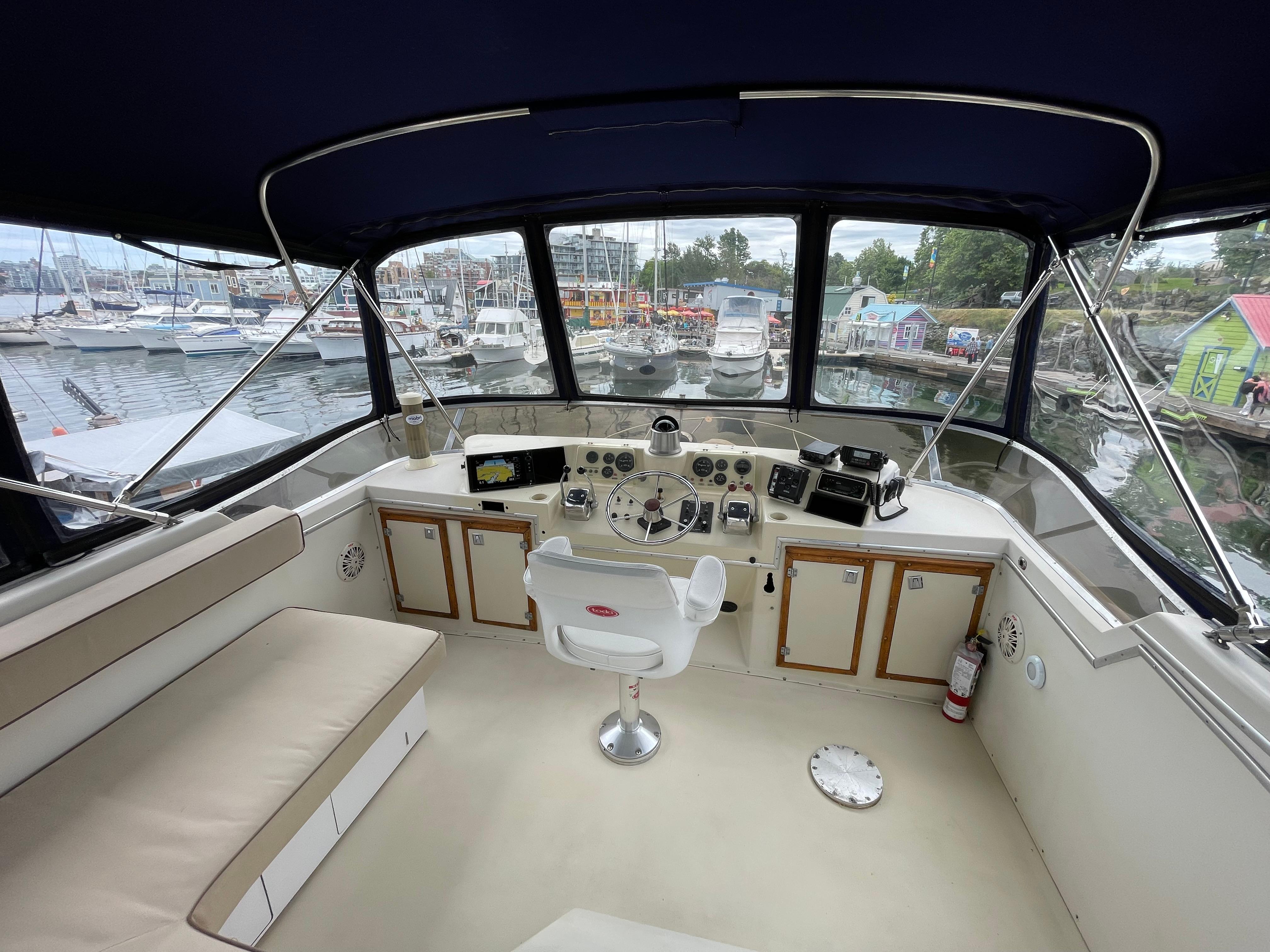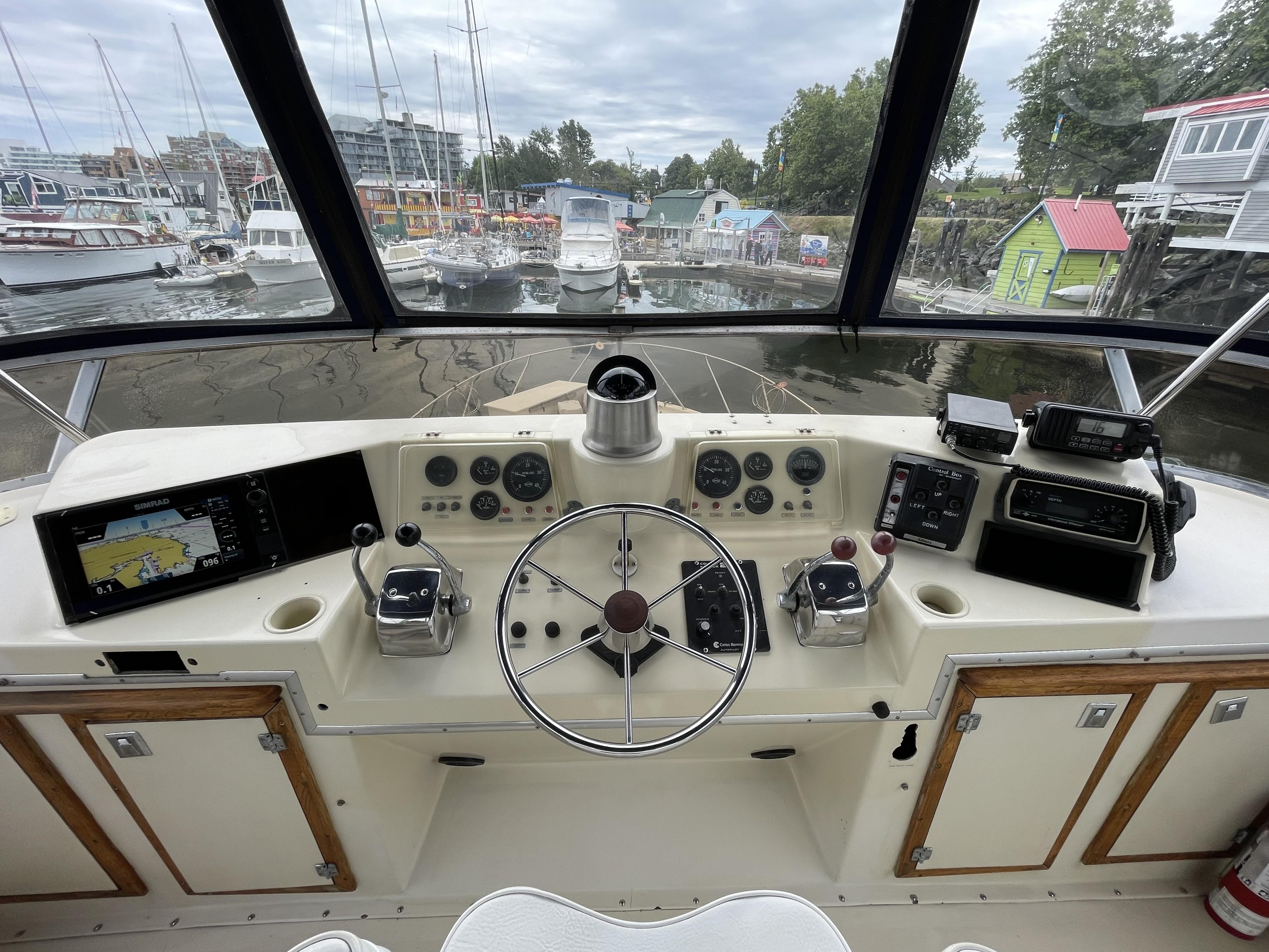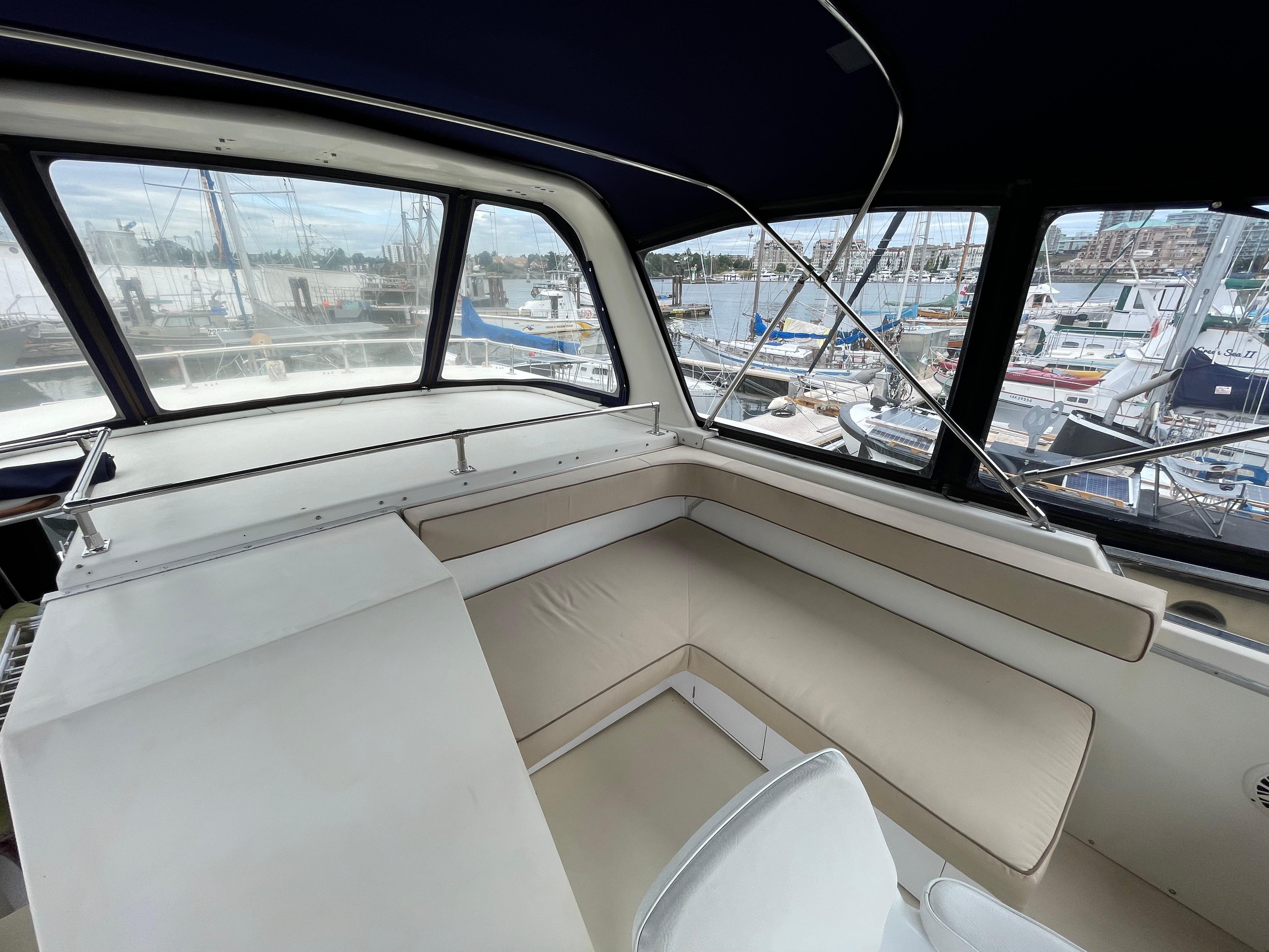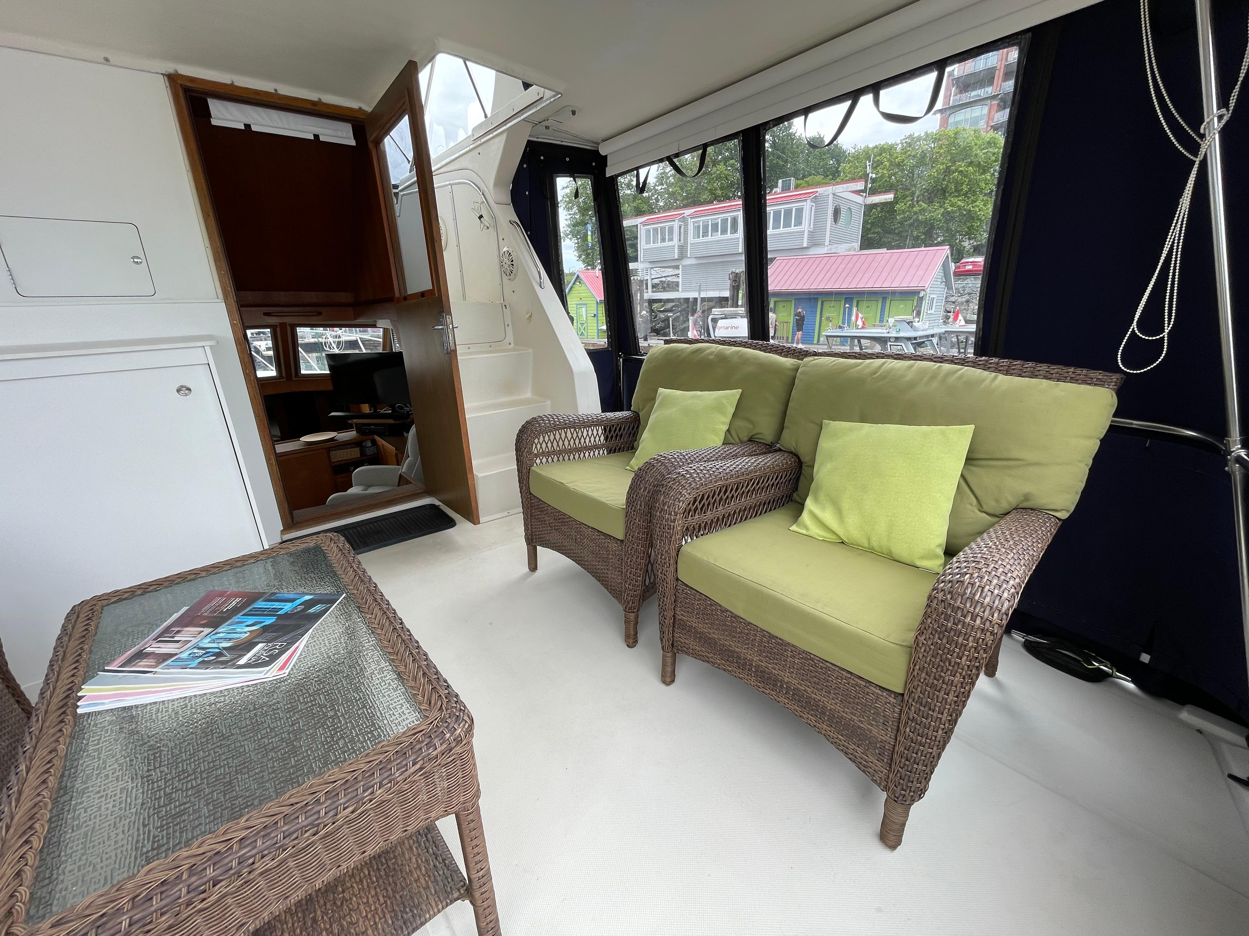 As soon as you walk up the ladder from the swim platform onto the aft deck you will feel at home under a hard top with new windows in the canvas enclosure and a lovely seating arrangement. The enclosed flybridge features a single helm seat with an L-shaped settee for guests. The helm boasts a new Simrad chartplotter with Radar overlay, autopilot, VHF, NMEA 2000 backbone (not installed), GoFree WiFi