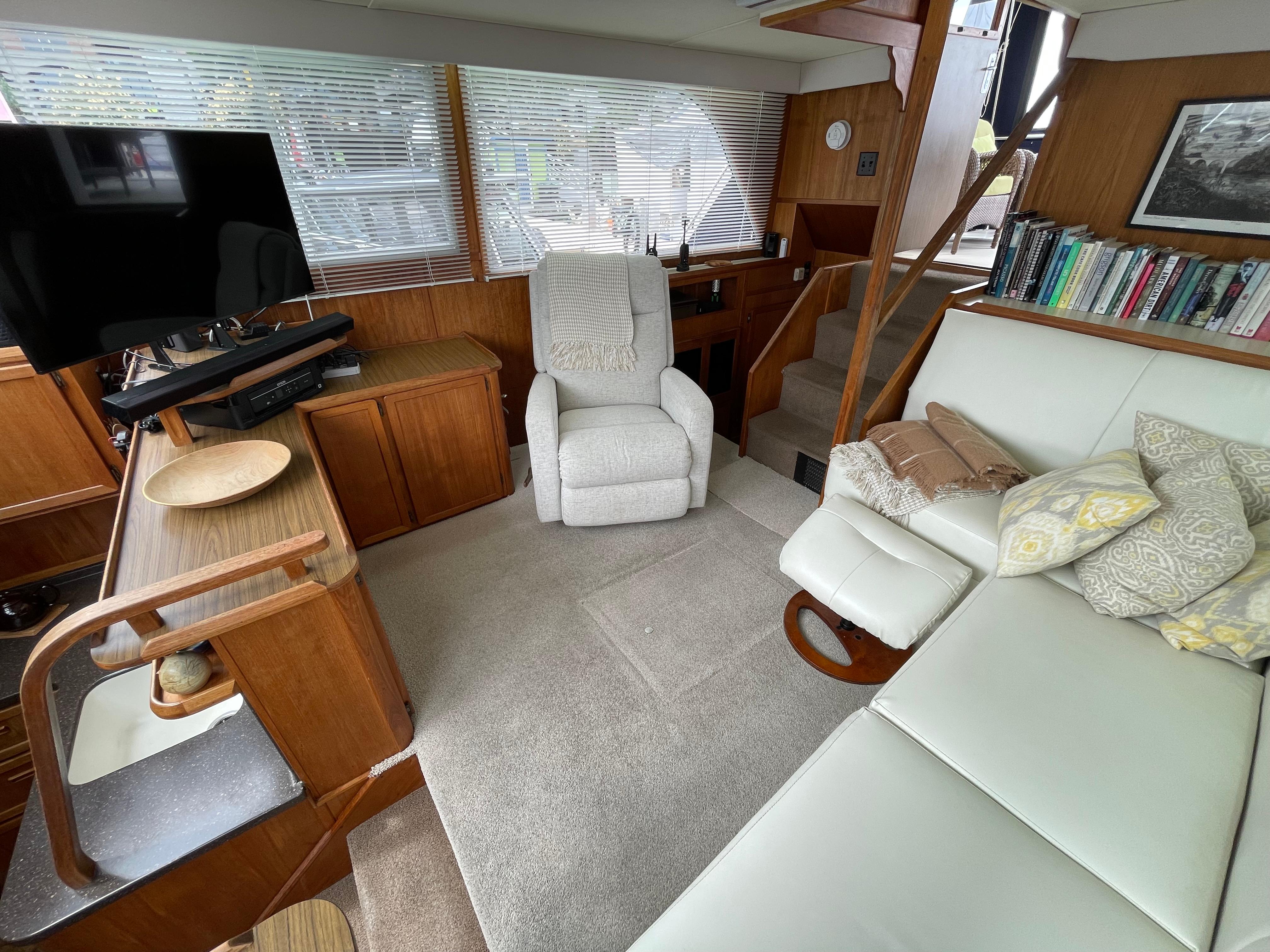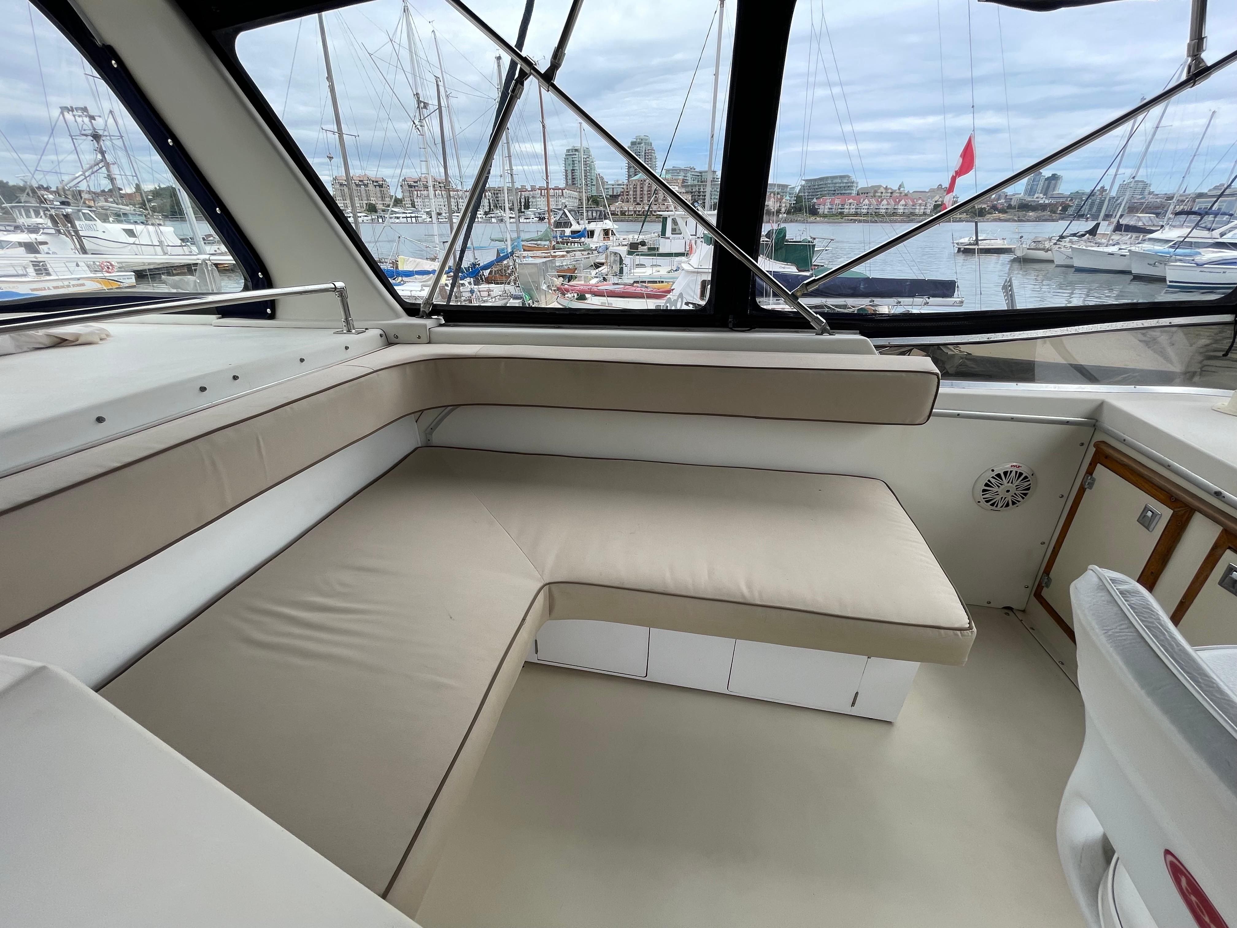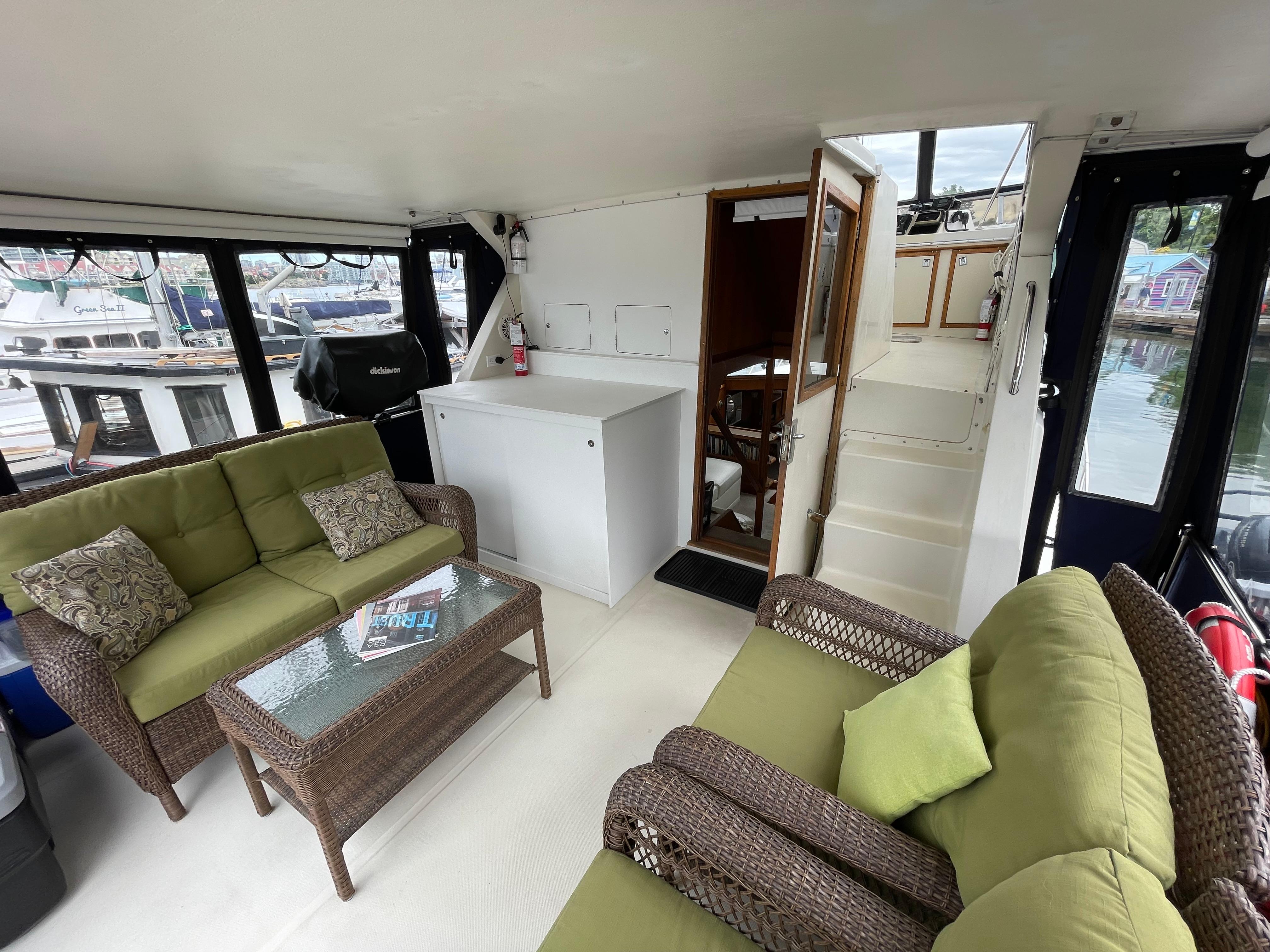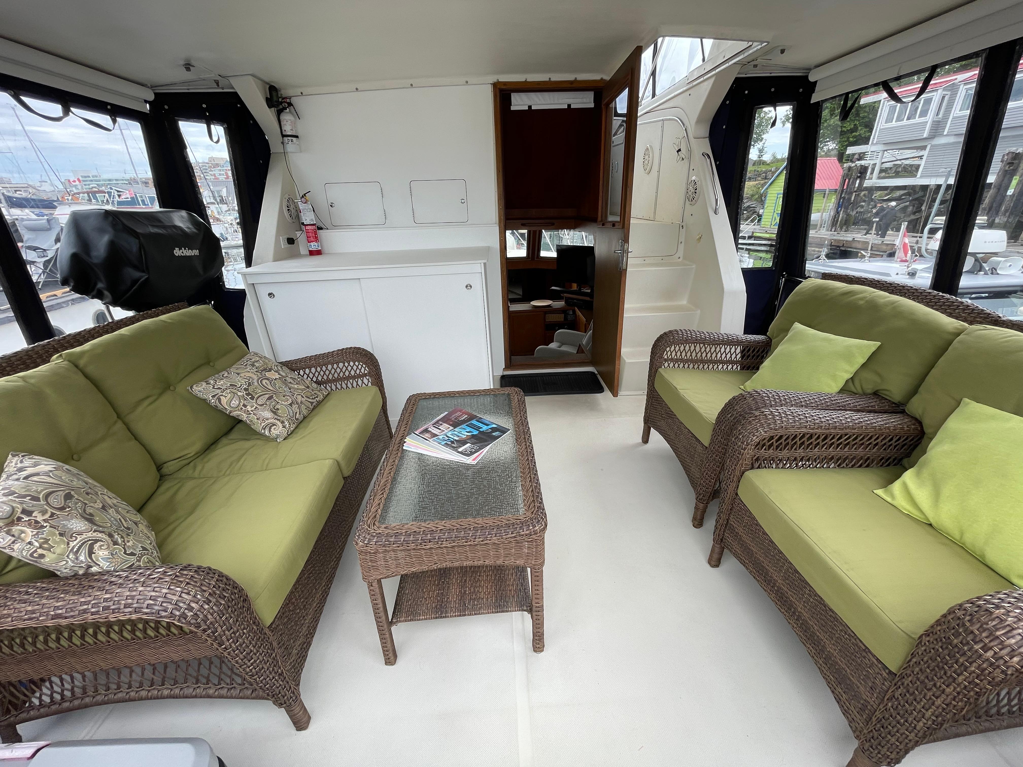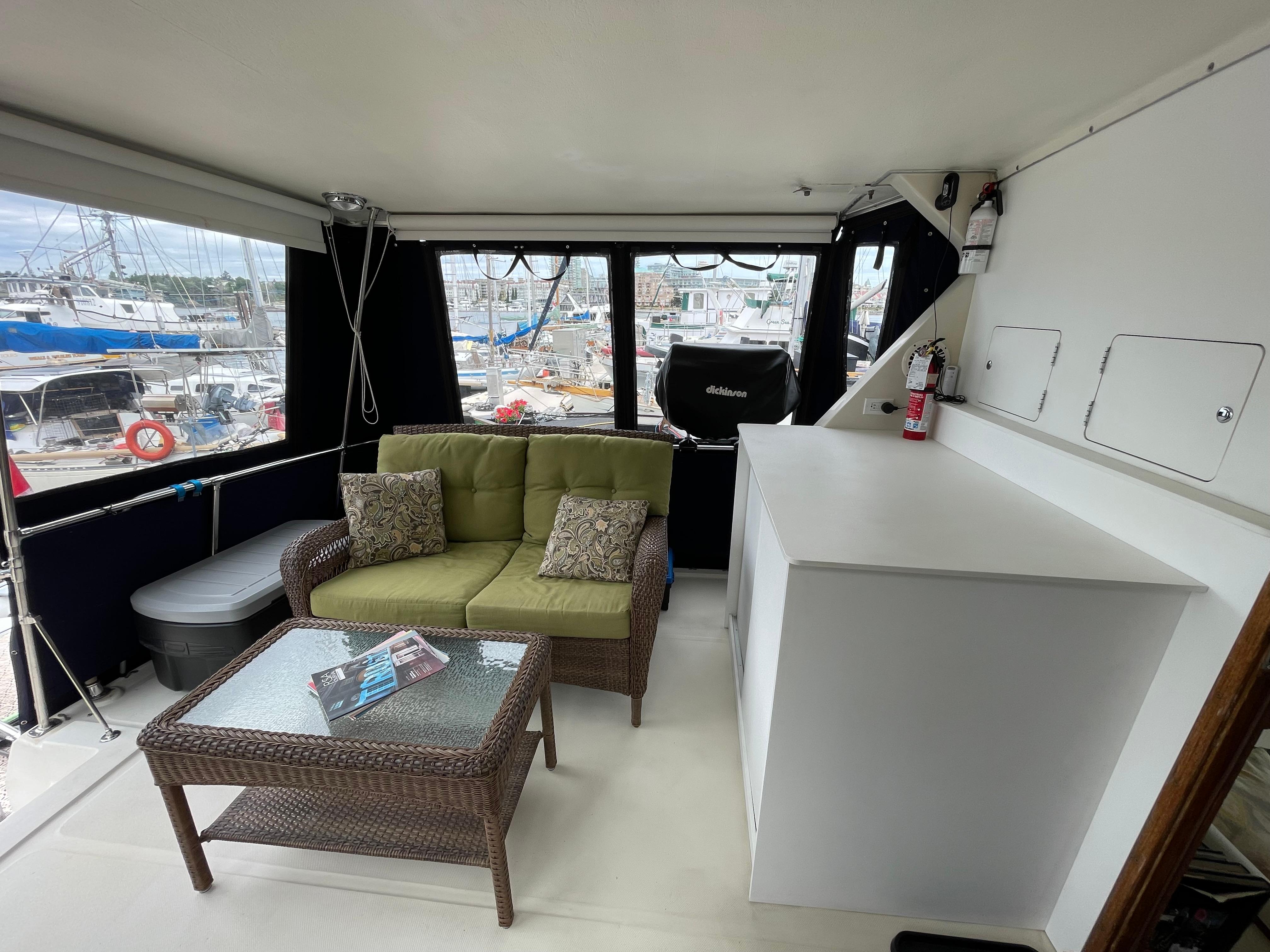 As soon as you walk up the ladder from the swim platform onto the aft deck you will feel at home under a hard top with new windows in the canvas enclosure and a lovely seating arrangement. The enclosed flybridge features a single helm seat with an L-shaped settee for guests. The helm boasts a new Simrad chartplotter with Radar overlay, autopilot, VHF, NMEA 2000 backbone (not installed), GoFree WiFi