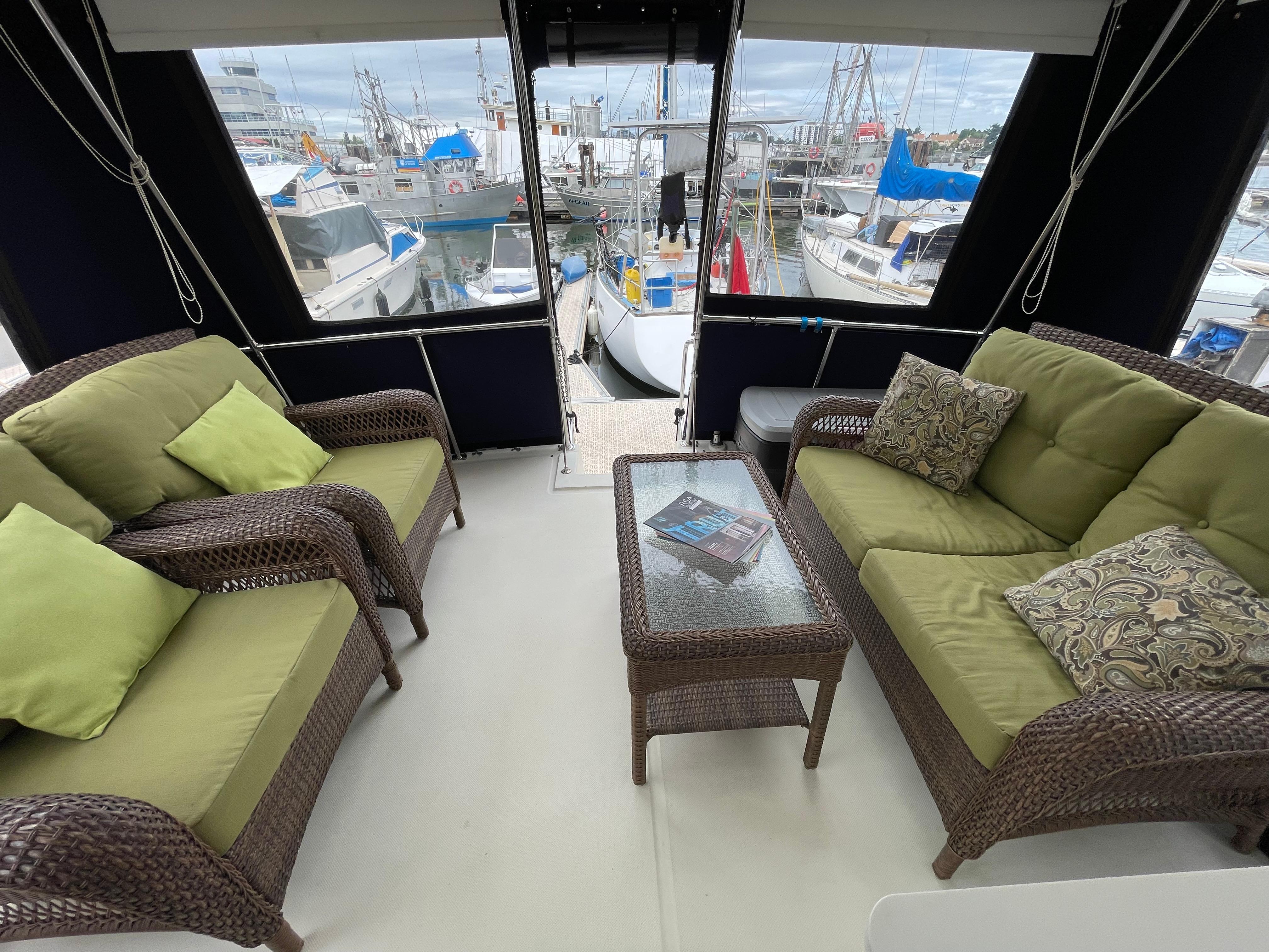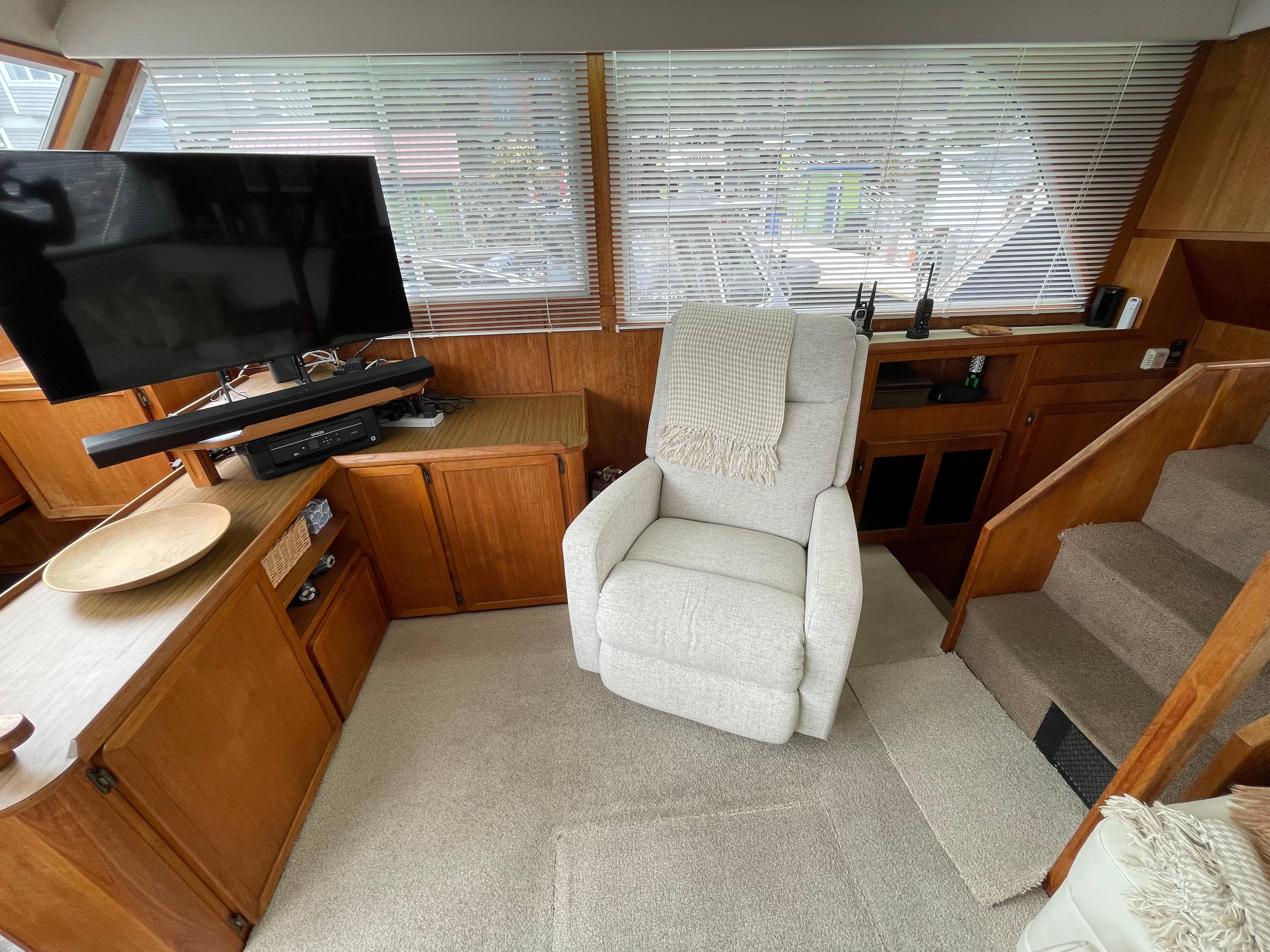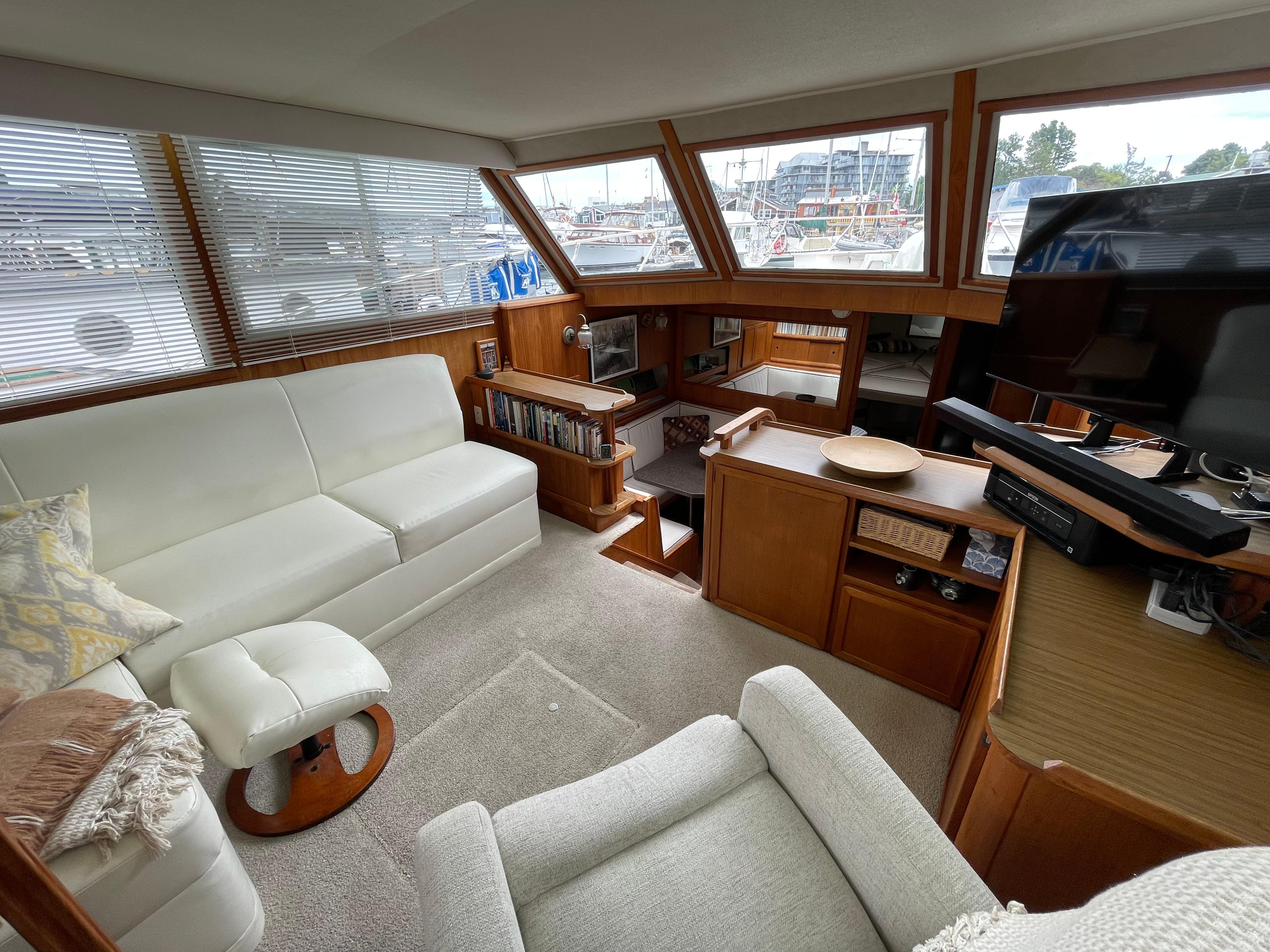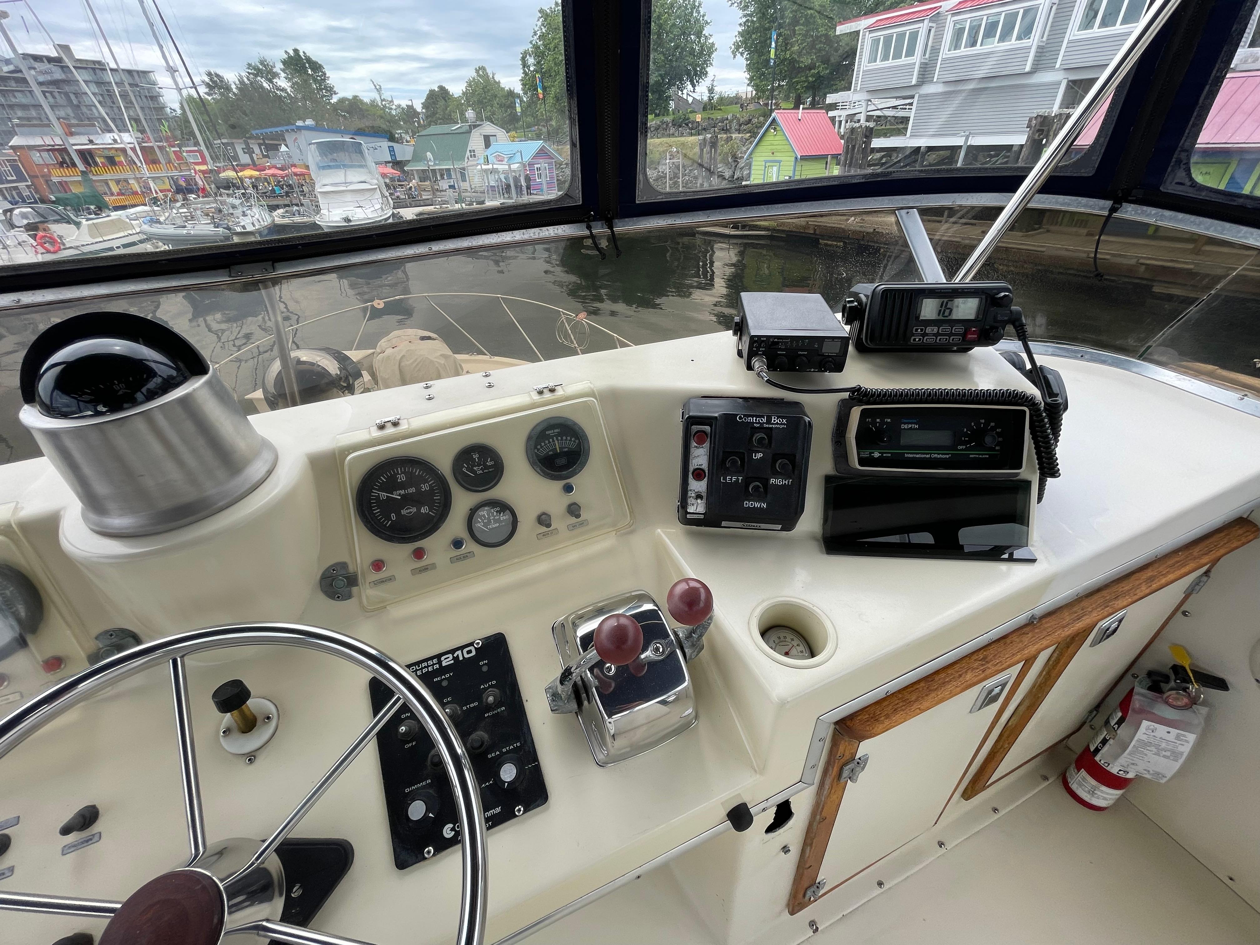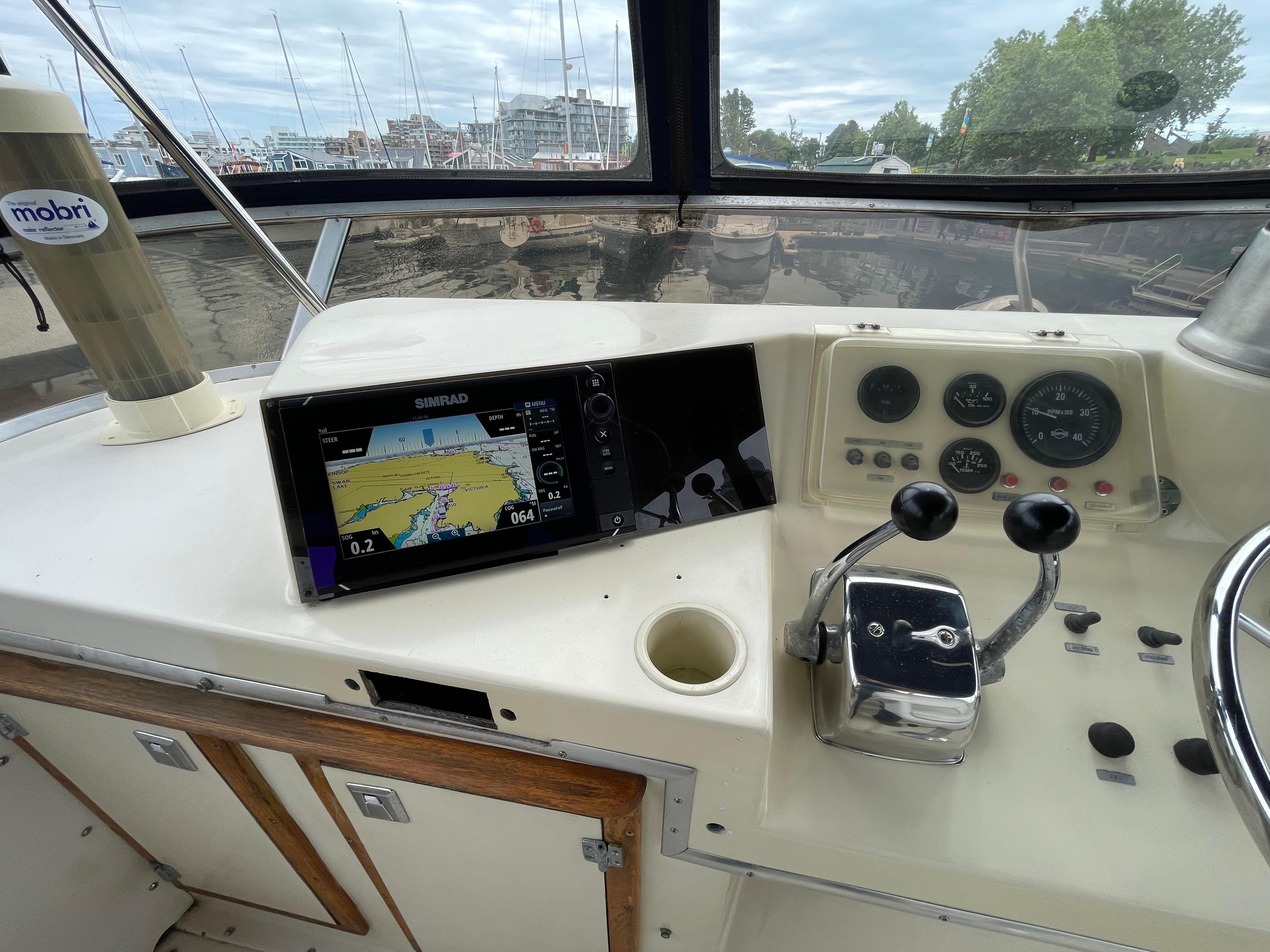 As soon as you walk up the ladder from the swim platform onto the aft deck you will feel at home under a hard top with new windows in the canvas enclosure and a lovely seating arrangement. The enclosed flybridge features a single helm seat with an L-shaped settee for guests. The helm boasts a new Simrad chartplotter with Radar overlay, autopilot, VHF, NMEA 2000 backbone (not installed), GoFree WiFi