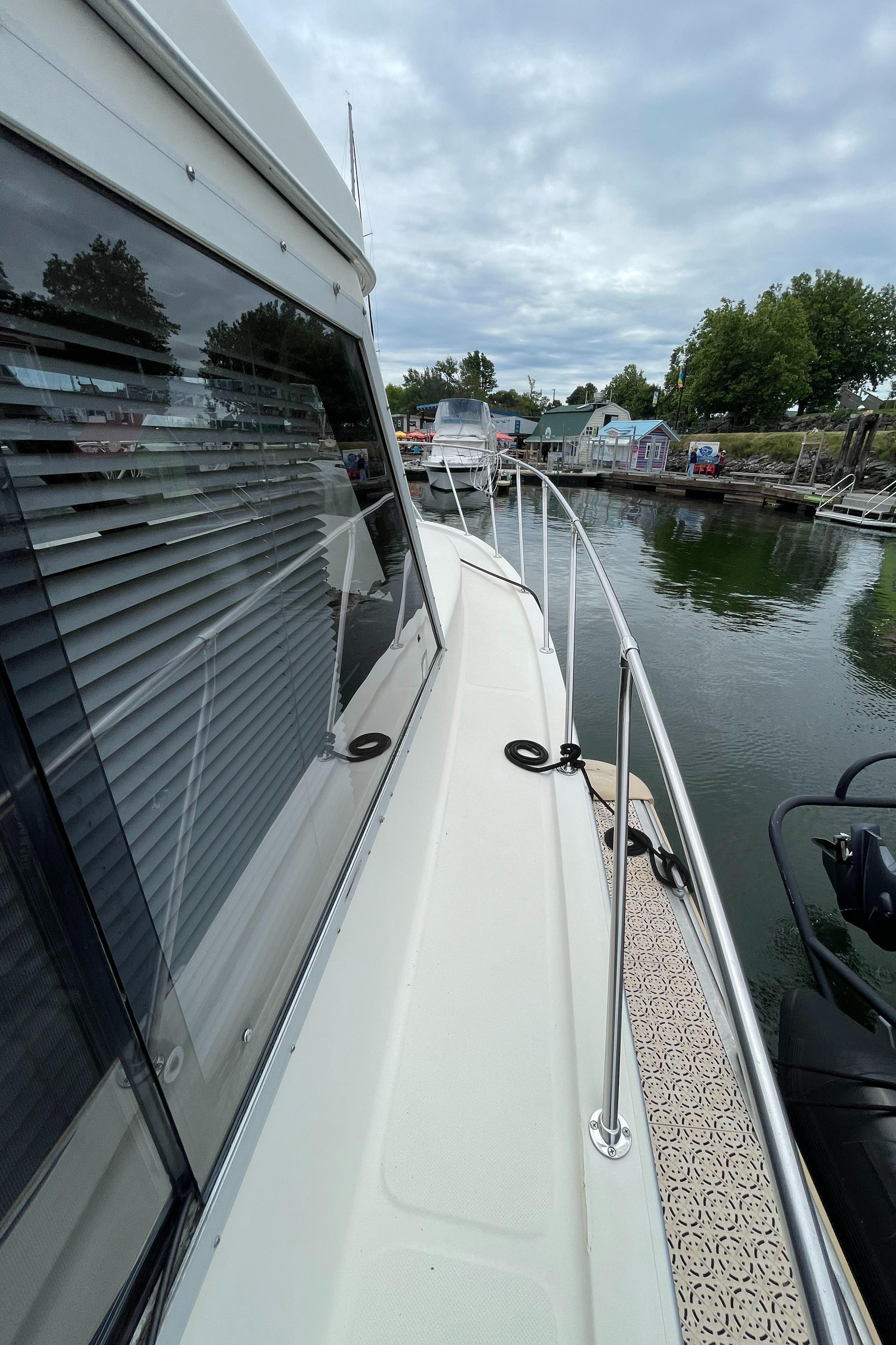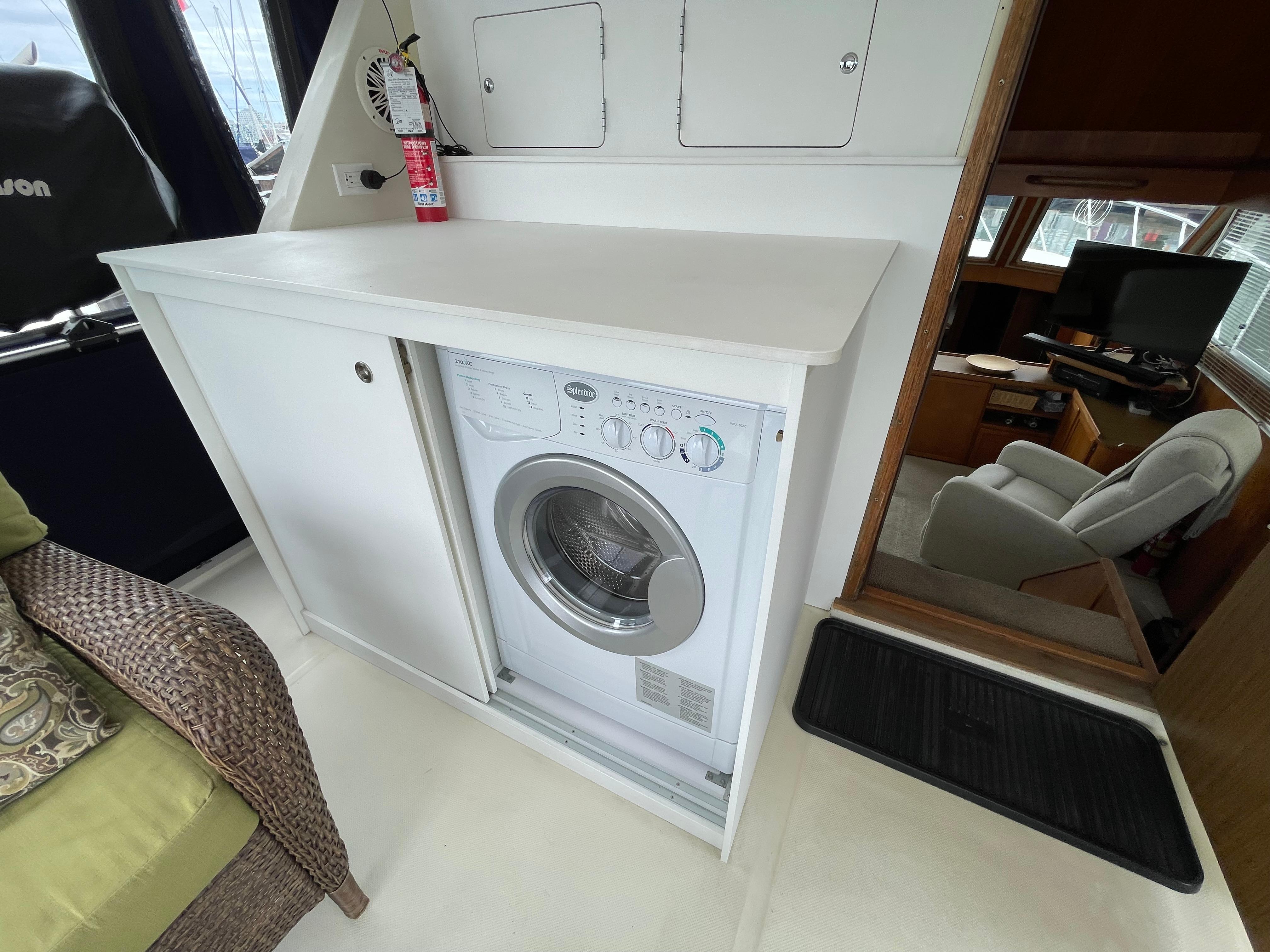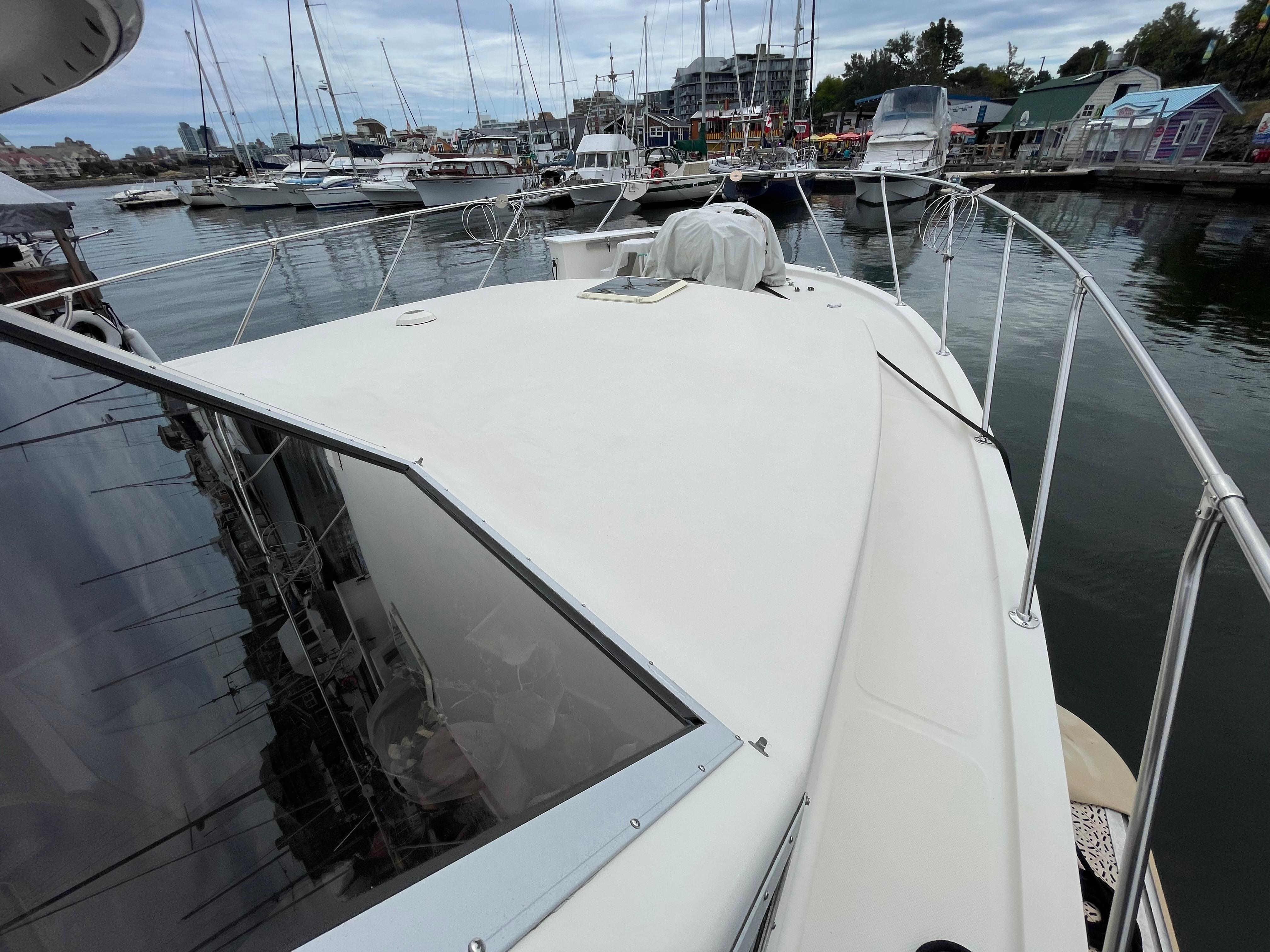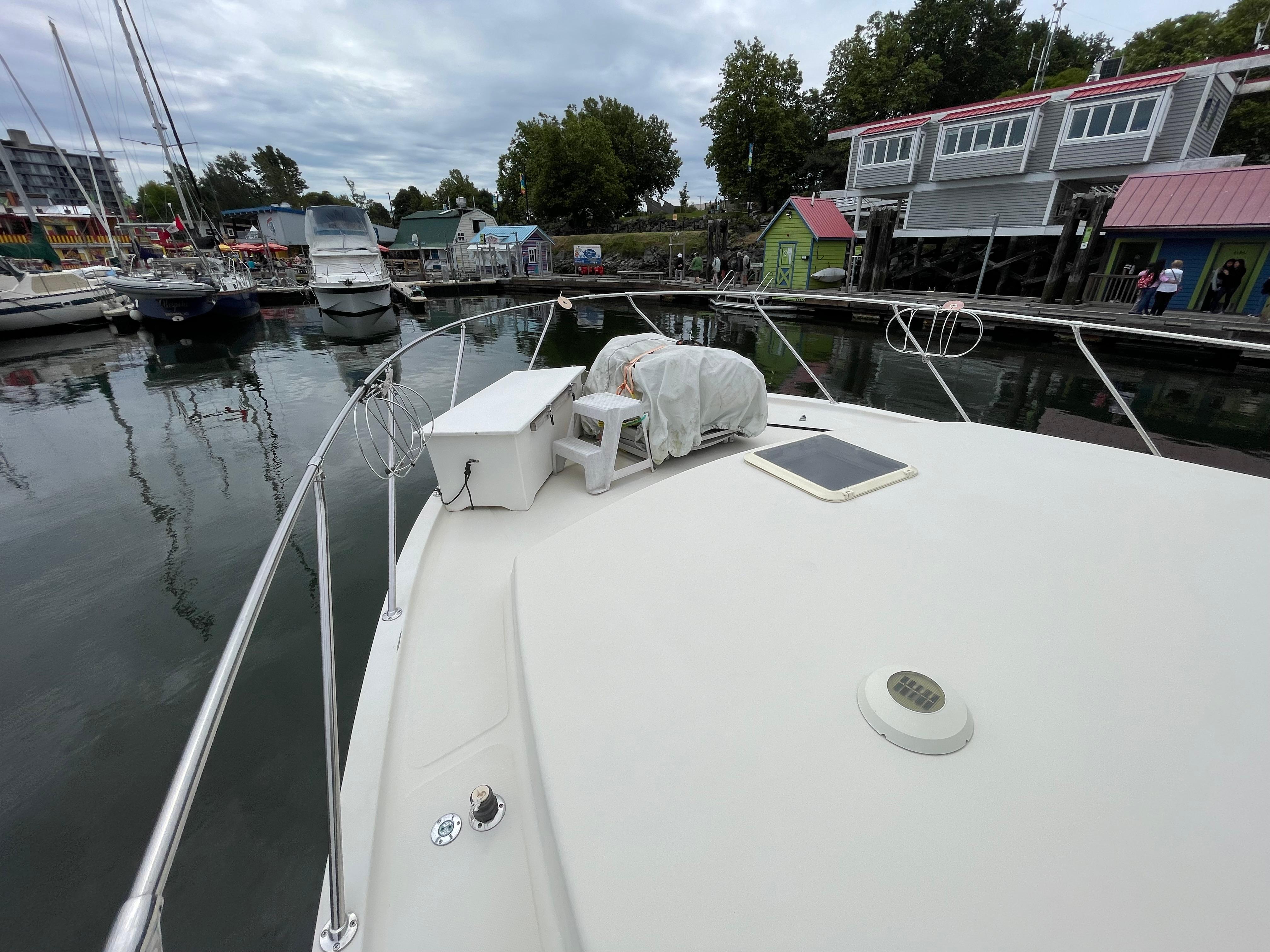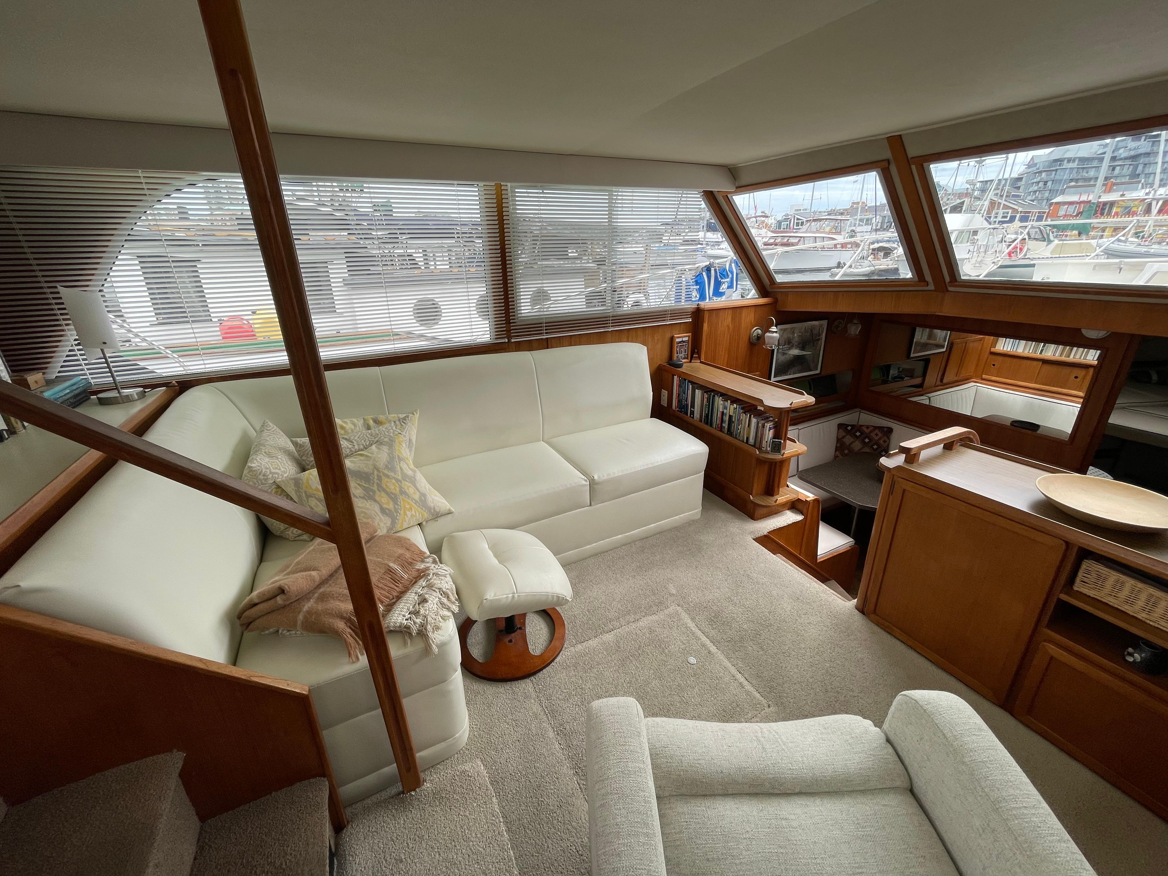 As soon as you walk up the ladder from the swim platform onto the aft deck you will feel at home under a hard top with new windows in the canvas enclosure and a lovely seating arrangement. The enclosed flybridge features a single helm seat with an L-shaped settee for guests. The helm boasts a new Simrad chartplotter with Radar overlay, autopilot, VHF, NMEA 2000 backbone (not installed), GoFree WiFi