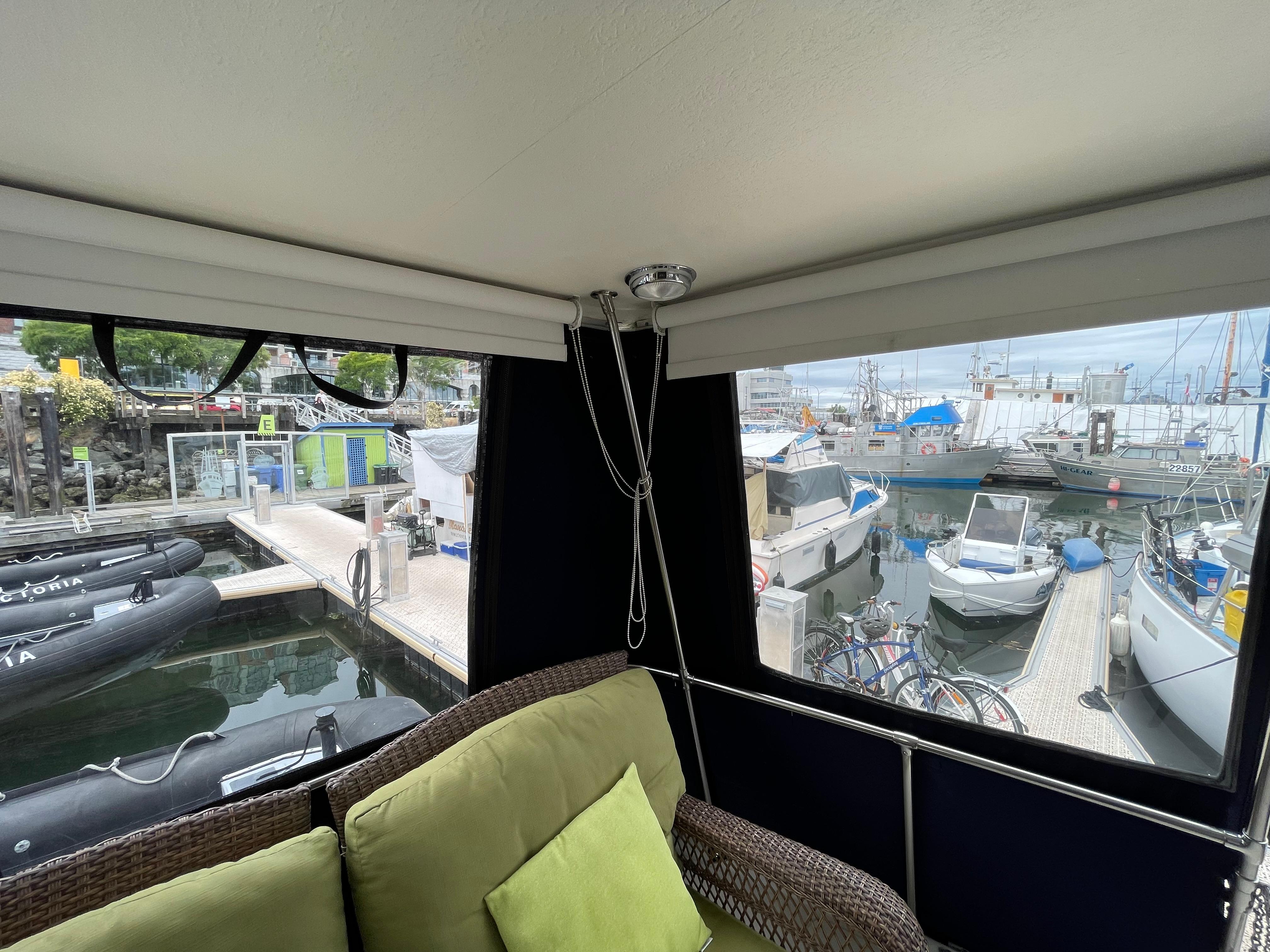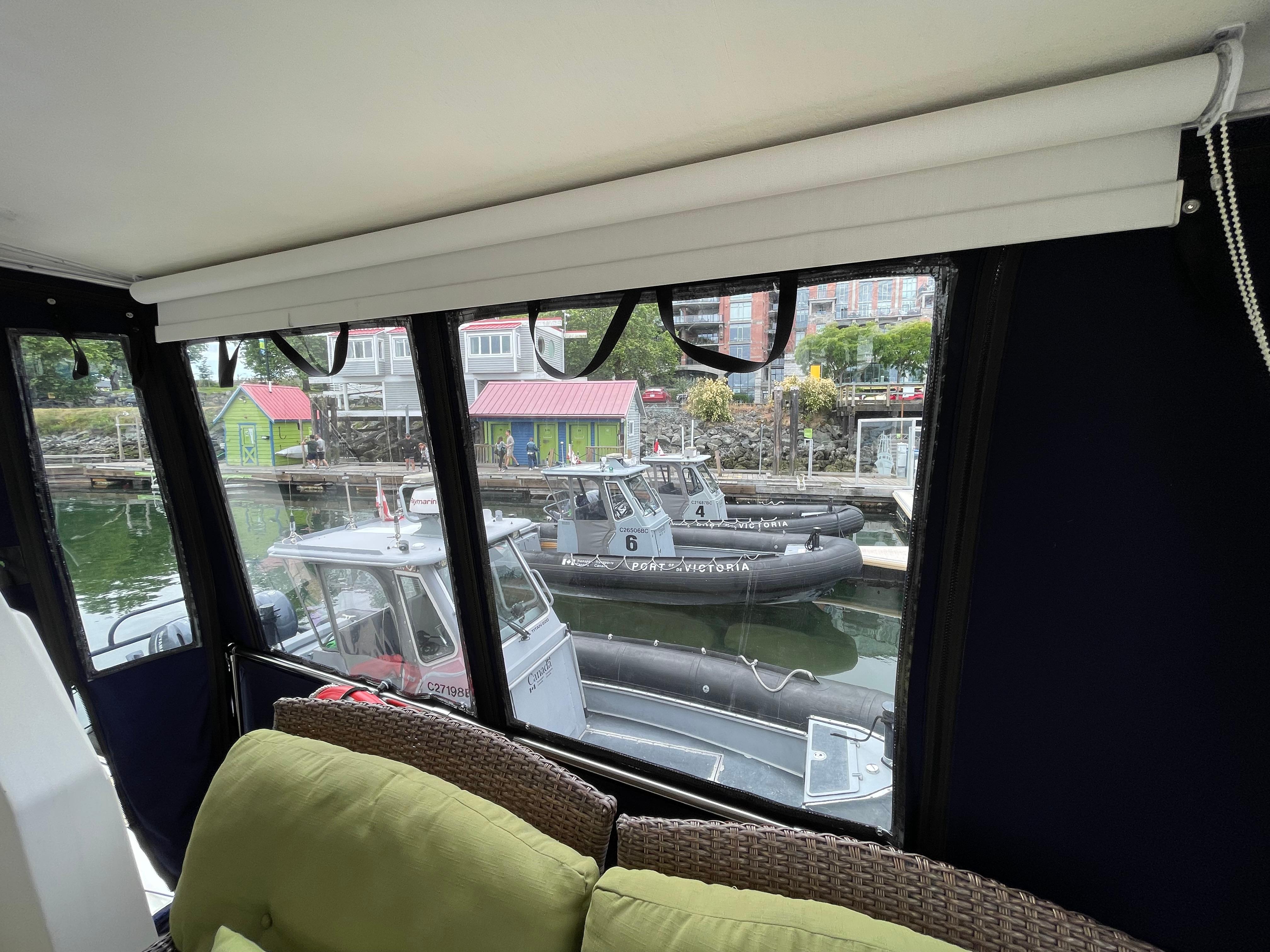 - Dickenson BBQ mounted on the rail with a custom system to slide it outboard of the curtain when rolled up