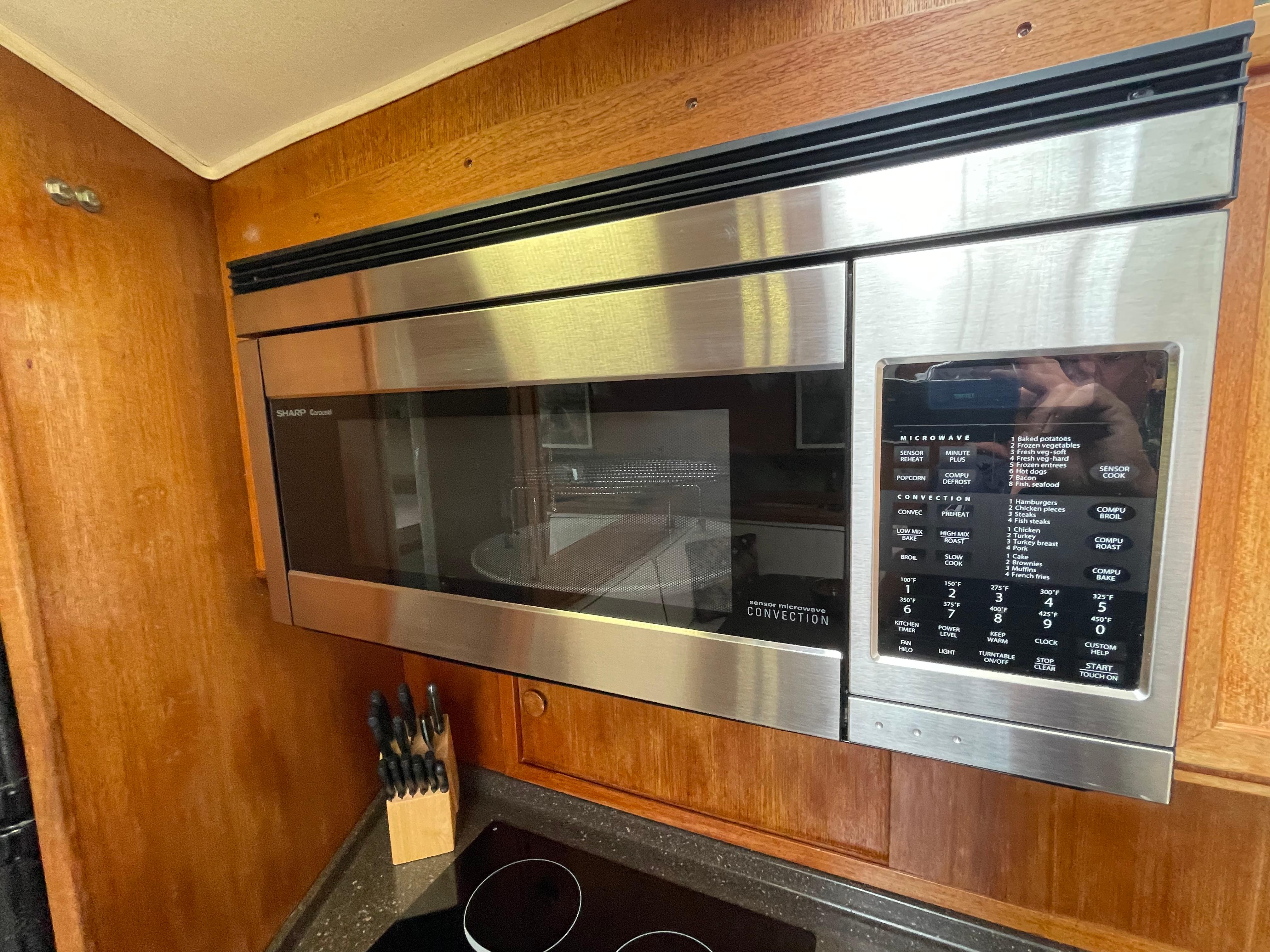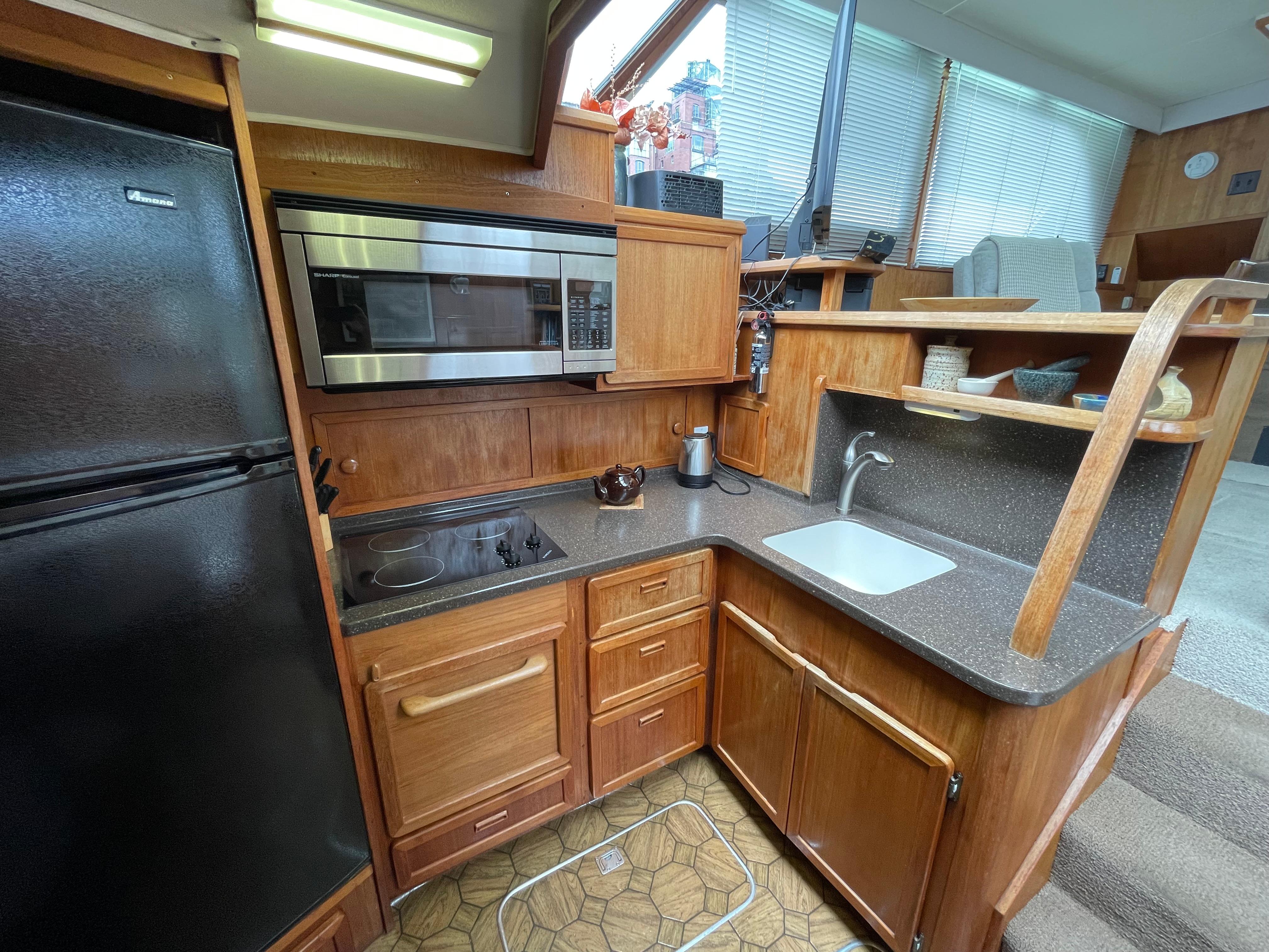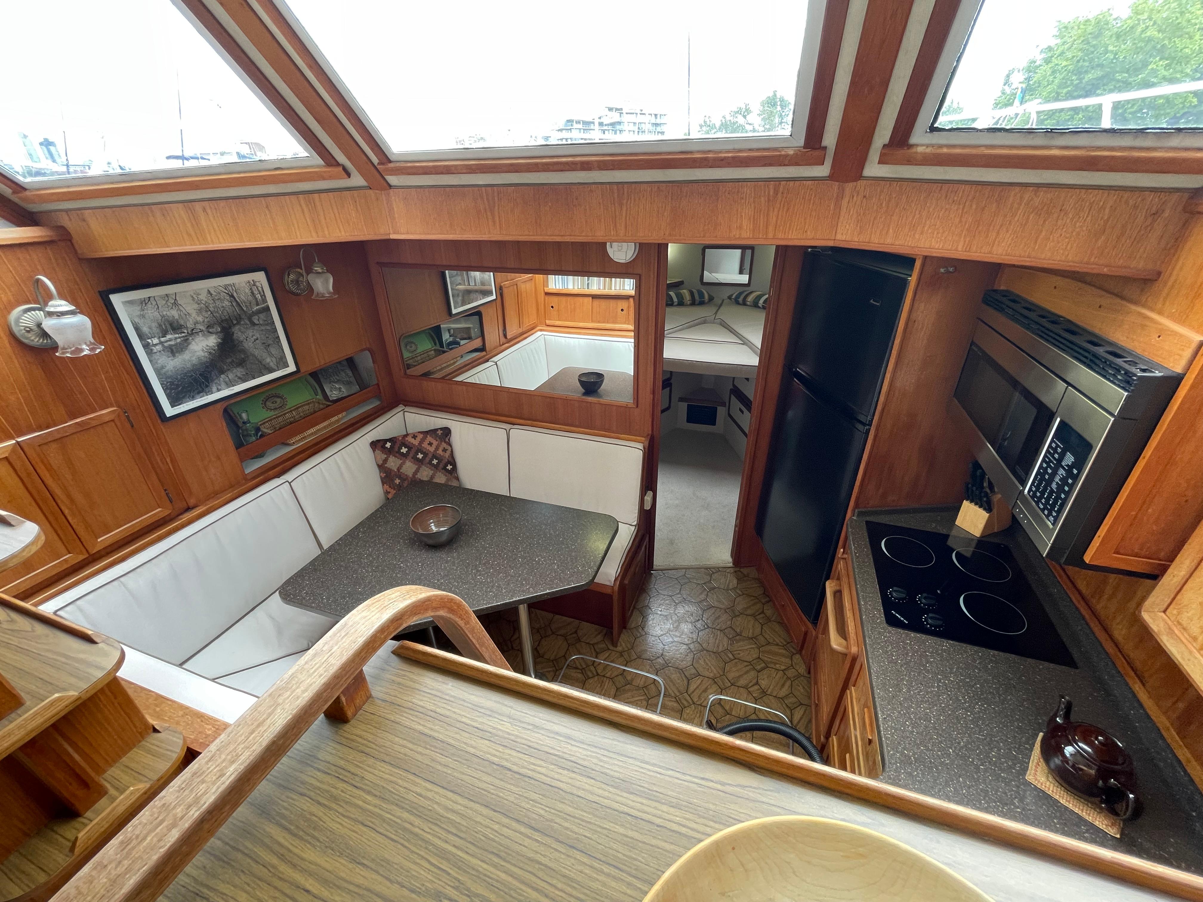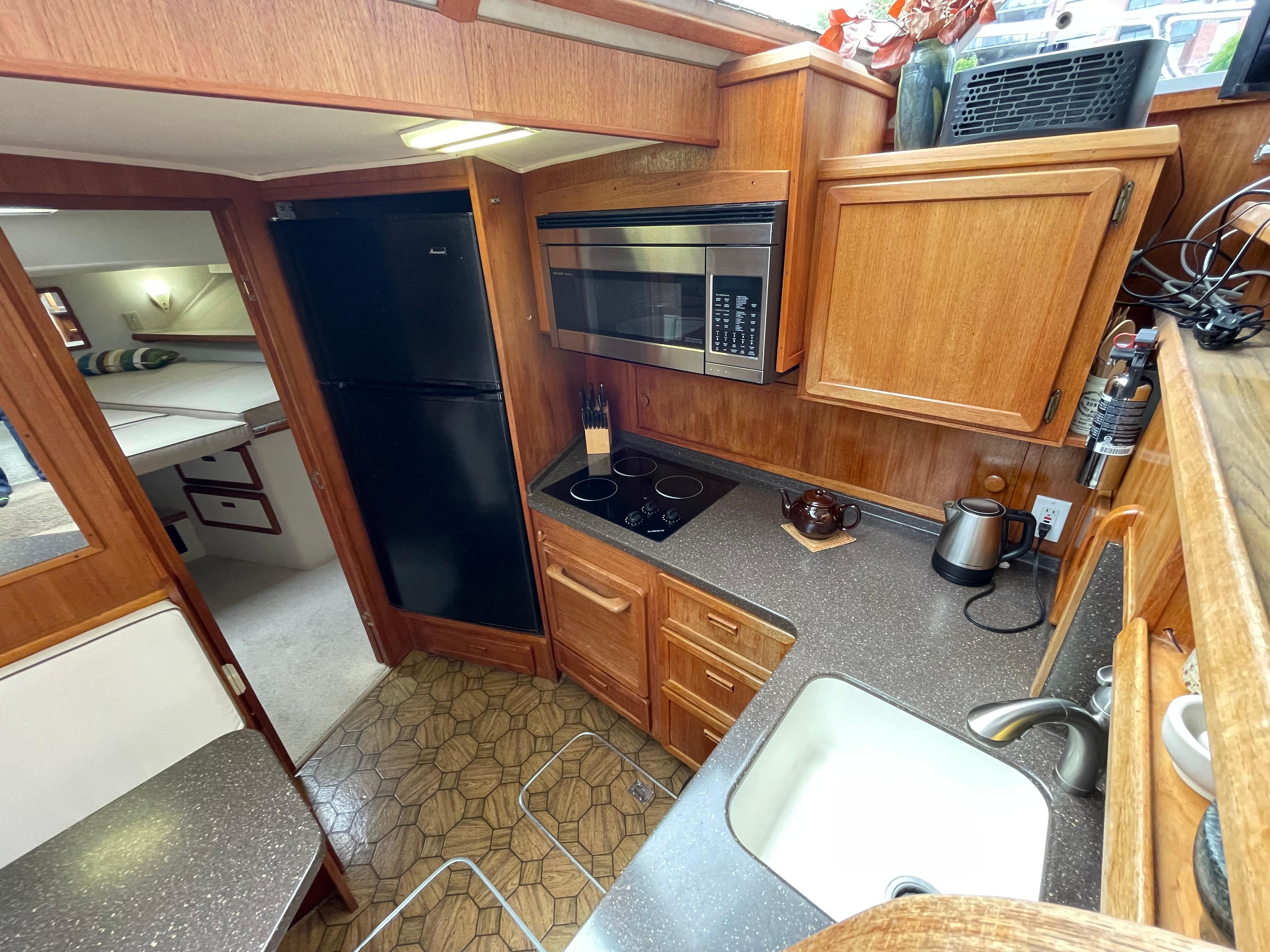 The interior is exceptionally clean, bright and inviting, finished in beautiful teak joinery with many bookshelves, entertainment center, large flat screen TV, cupboards and storage. There is a wonderful L-shape leather settee to port and a single chair creating a very comfortable environment. Down a few steps from the salon is the well appointed galley to starboard featuring Corian counter tops, a full size fridge/freezer with ice maker, a 3 burner 110V stove with induction oven. The dinette to port is seats six around a lovely Corian table top.