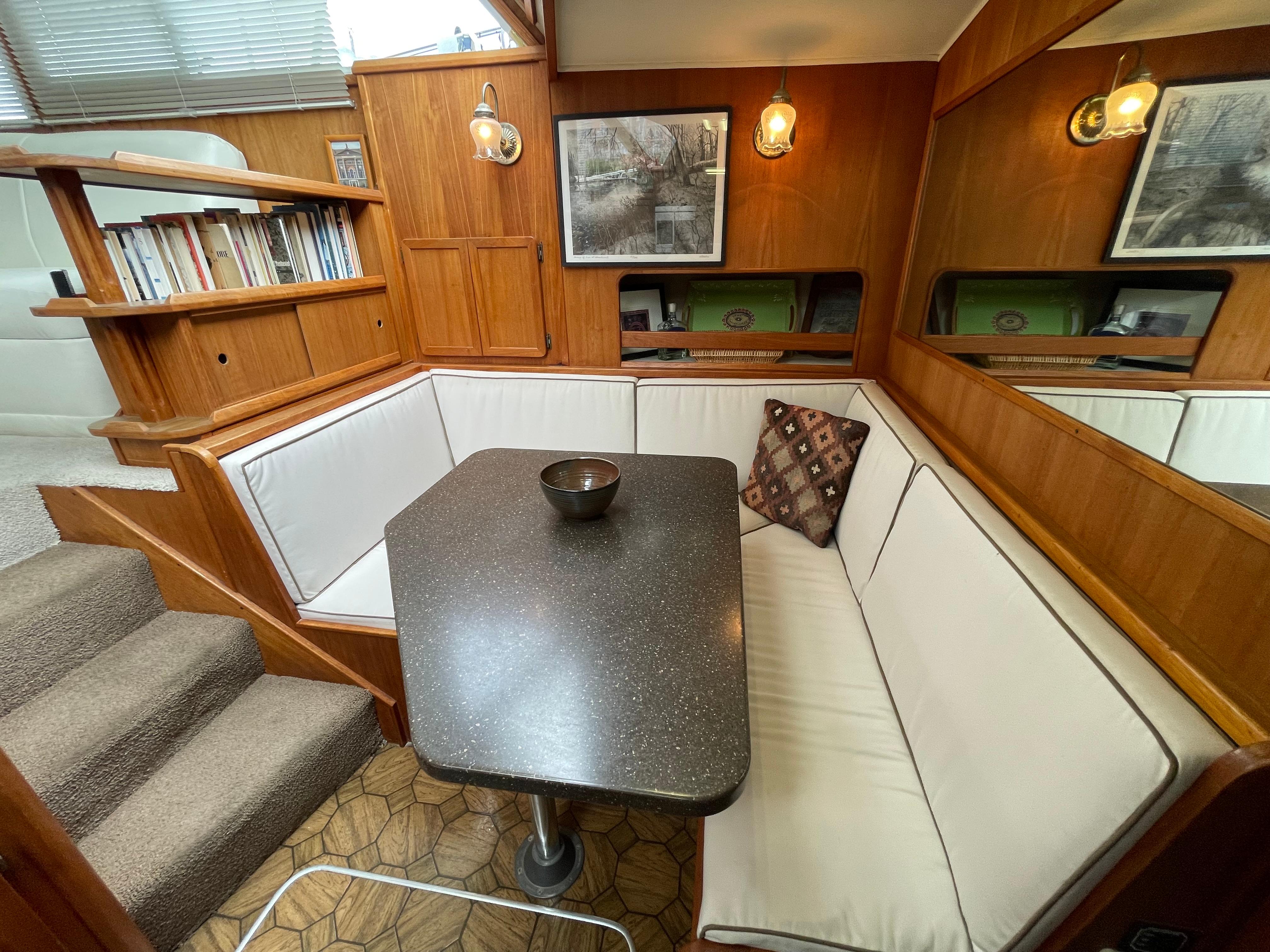 - Dinette: opposite the galley features a dinette with a U-shaped settee and seating for six, Corian table top