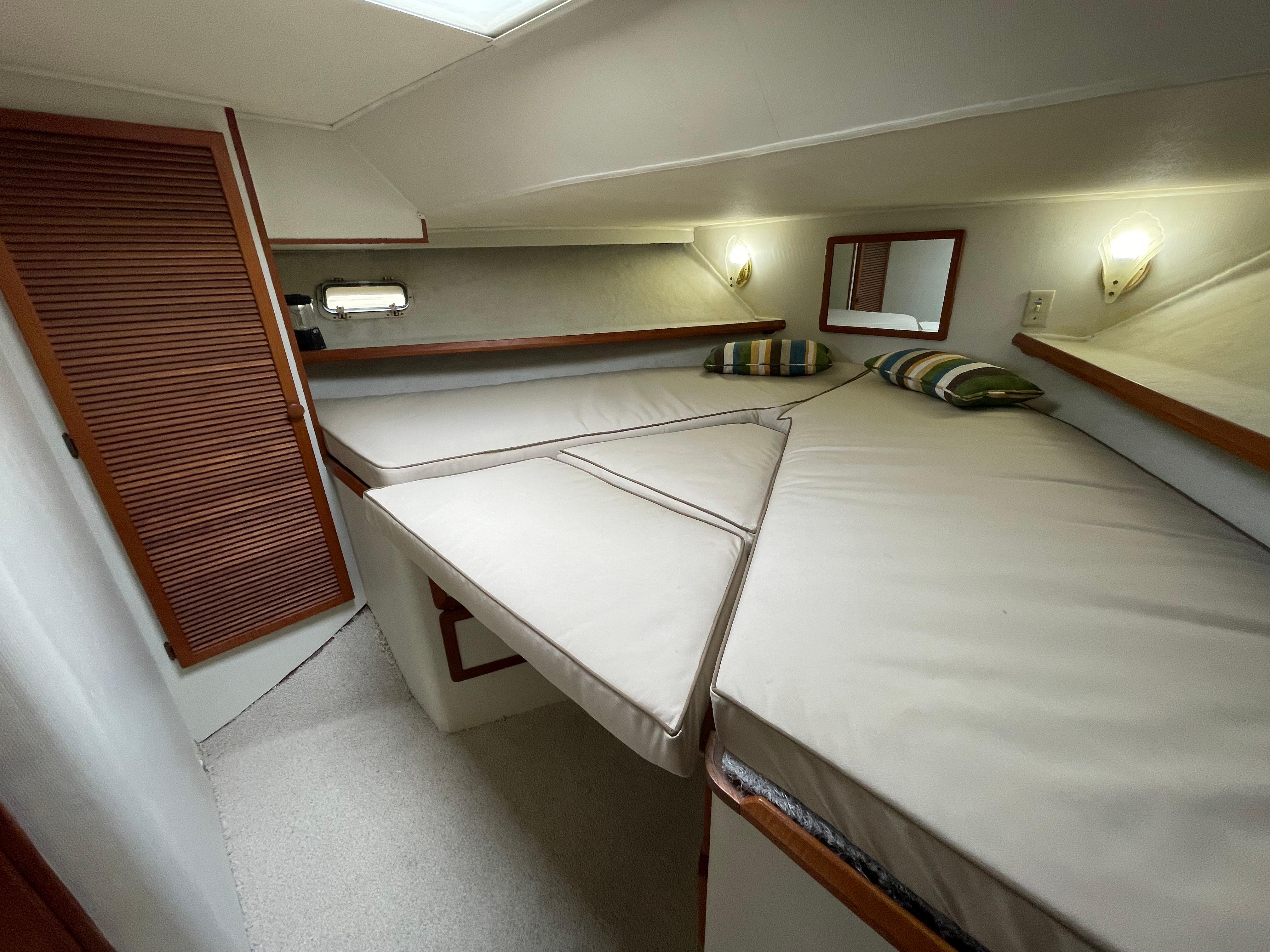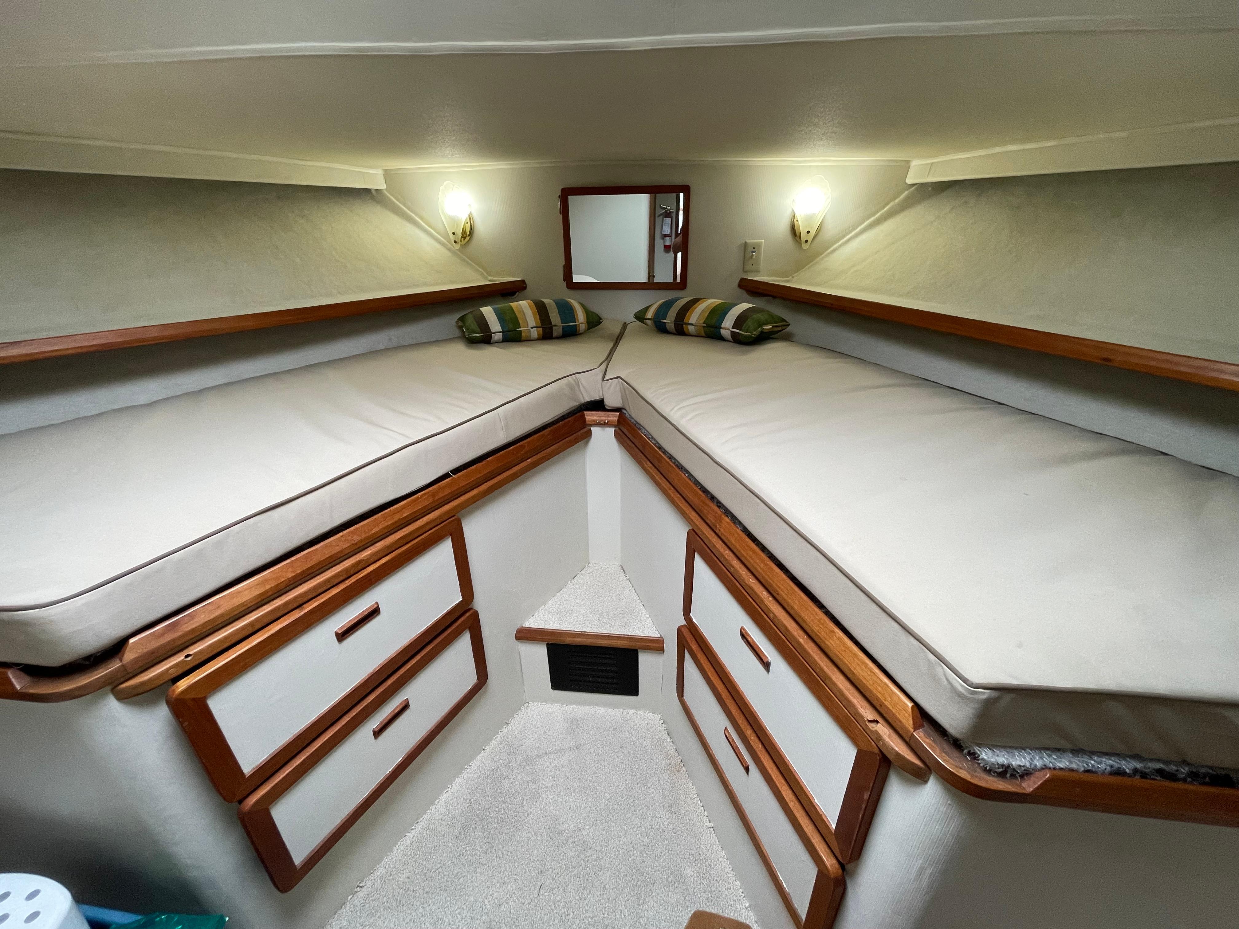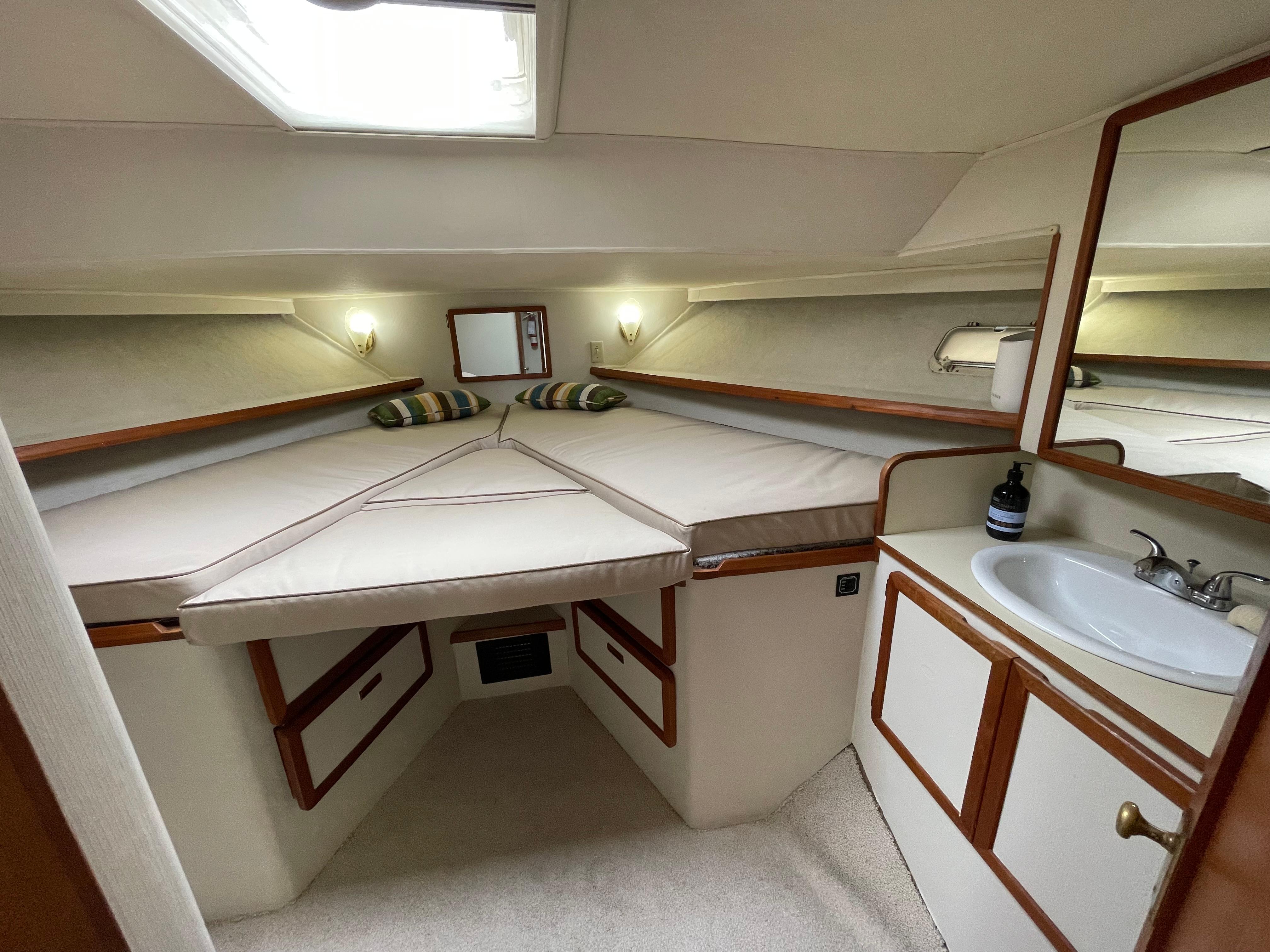 - Forward cabin: features two single berths in a V-berth style with a filler cushion creating a double berth