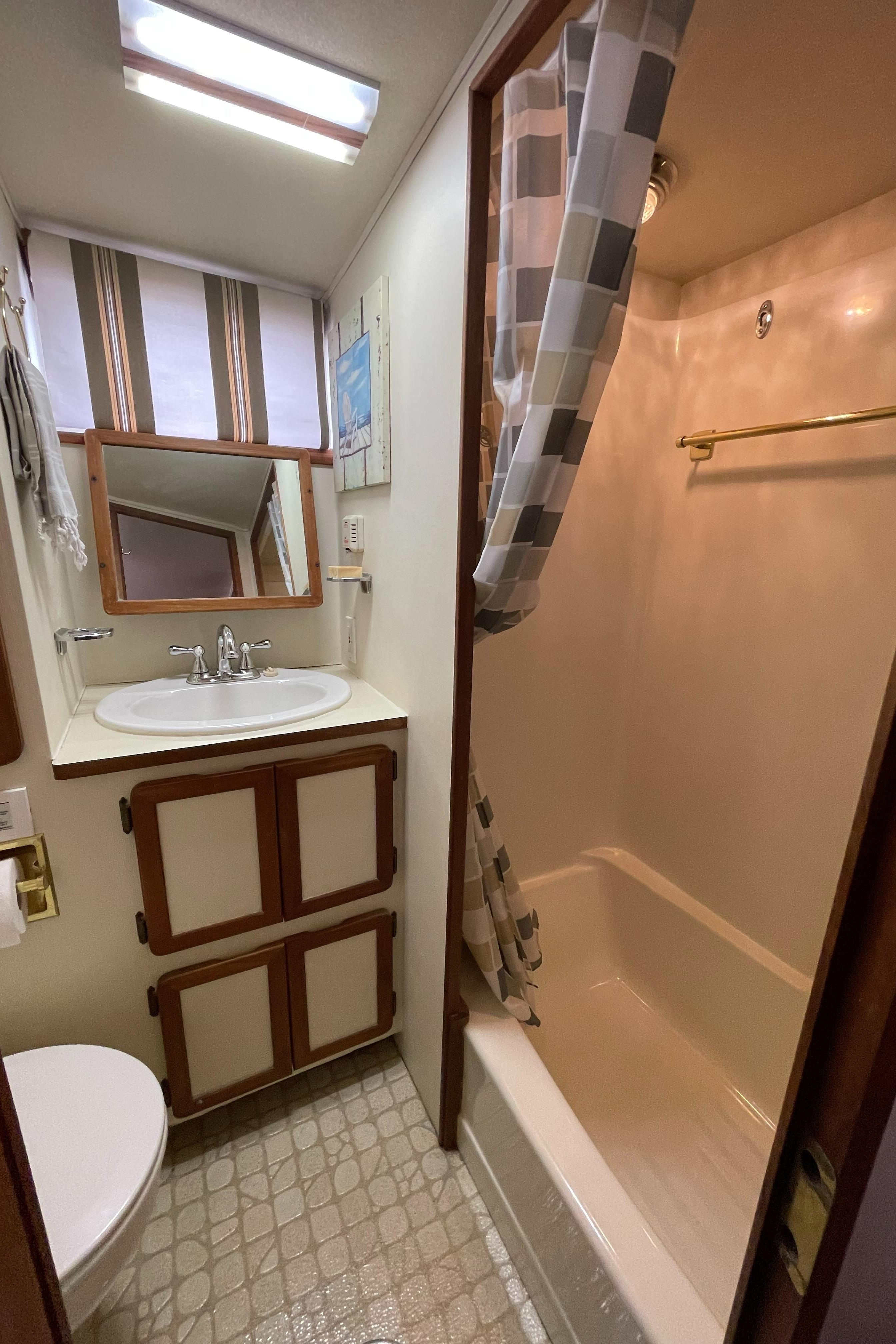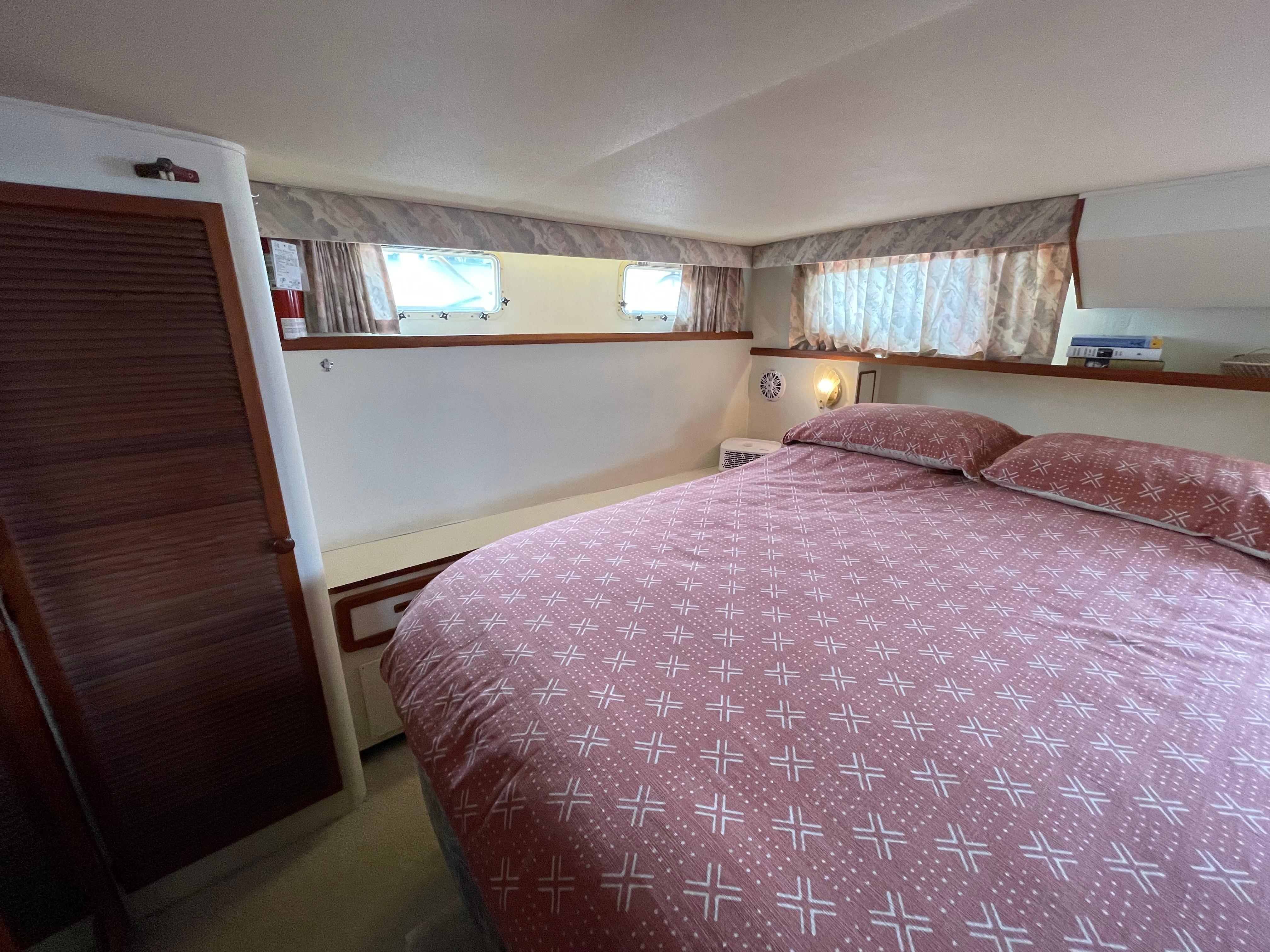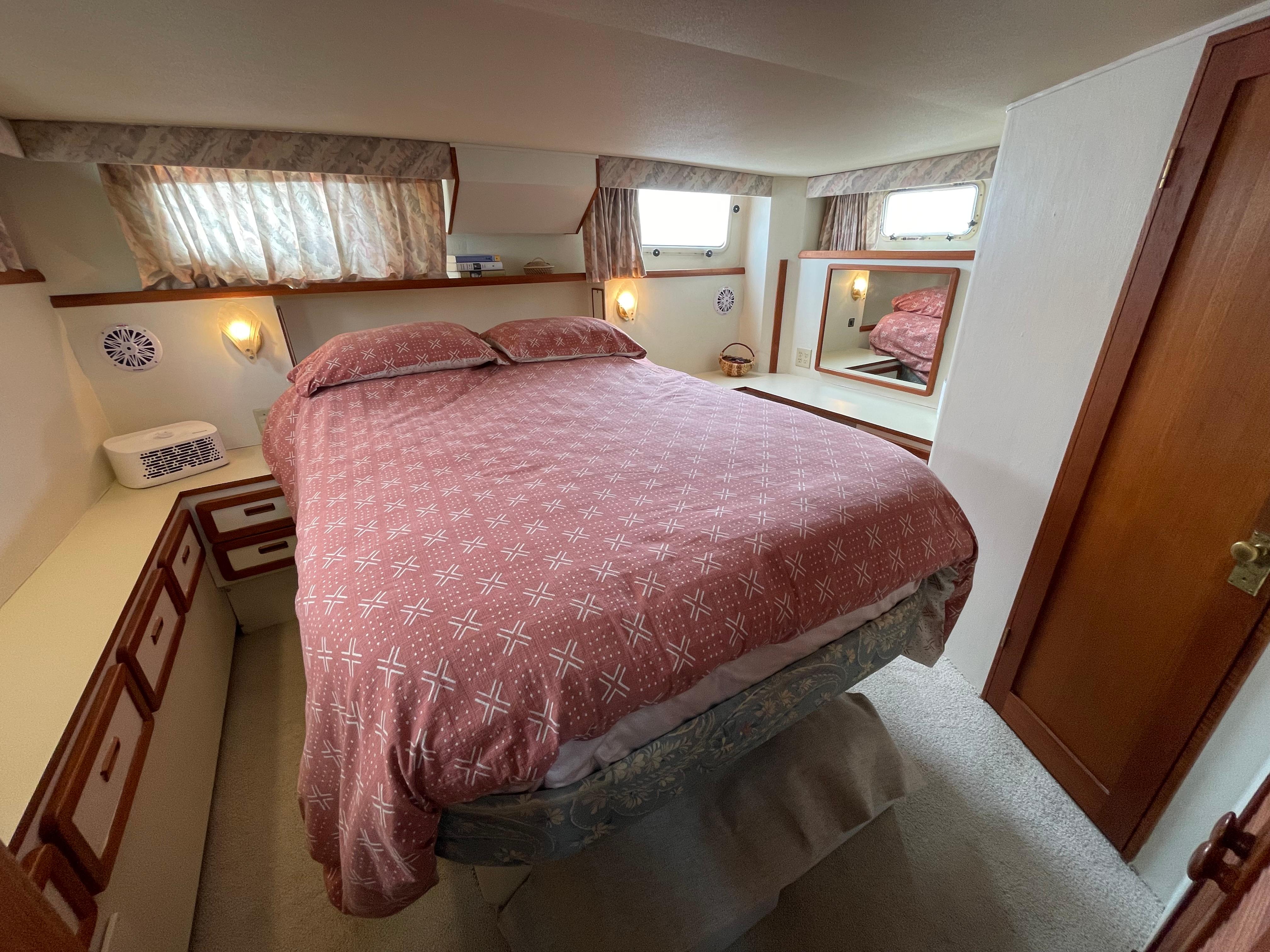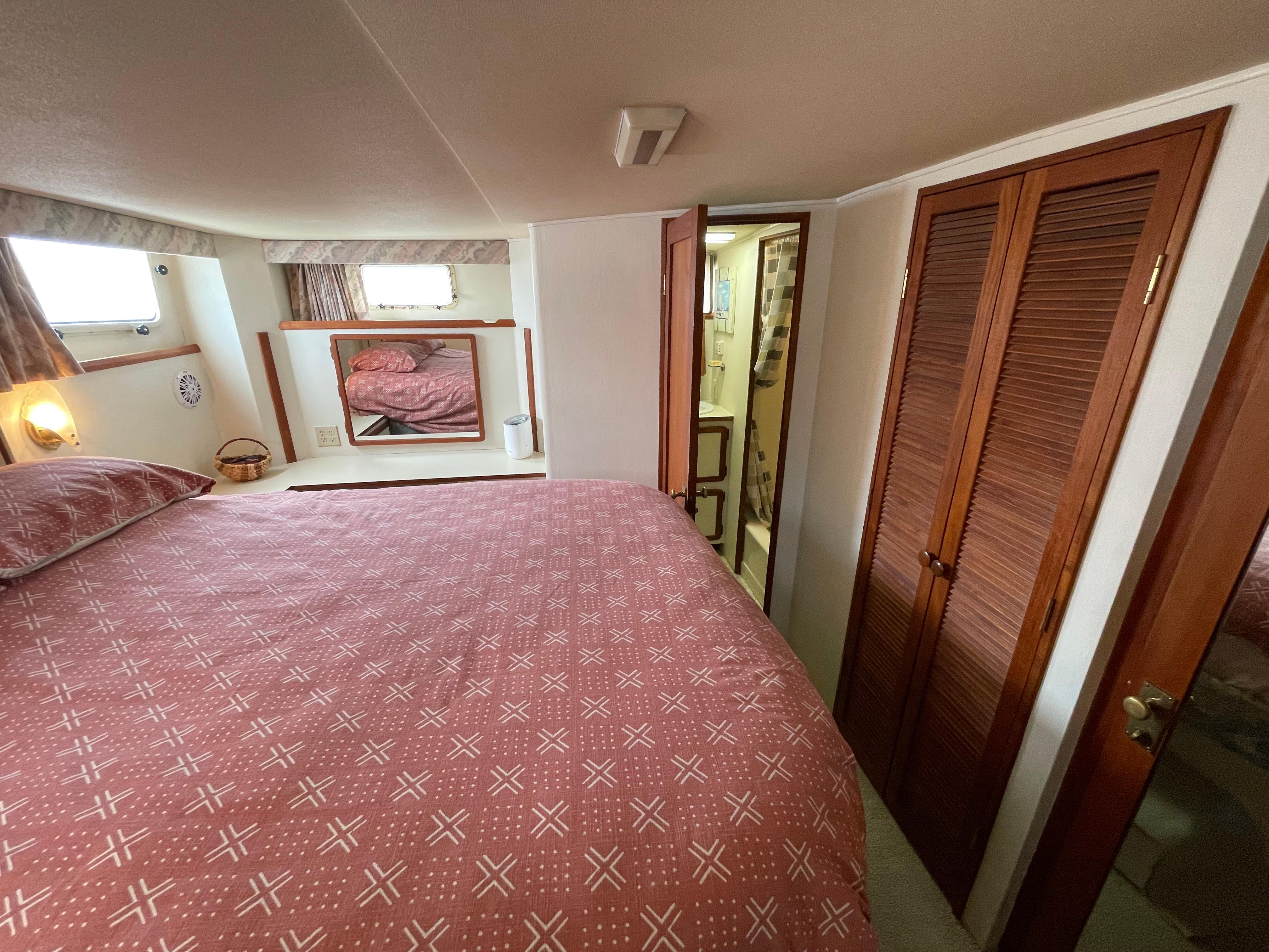 The owners cabin aft is a full beam cabin featuring a centerline walk around queen. The en-suite head features a bath/shower, vanity and storage with an electric flush toilet.
