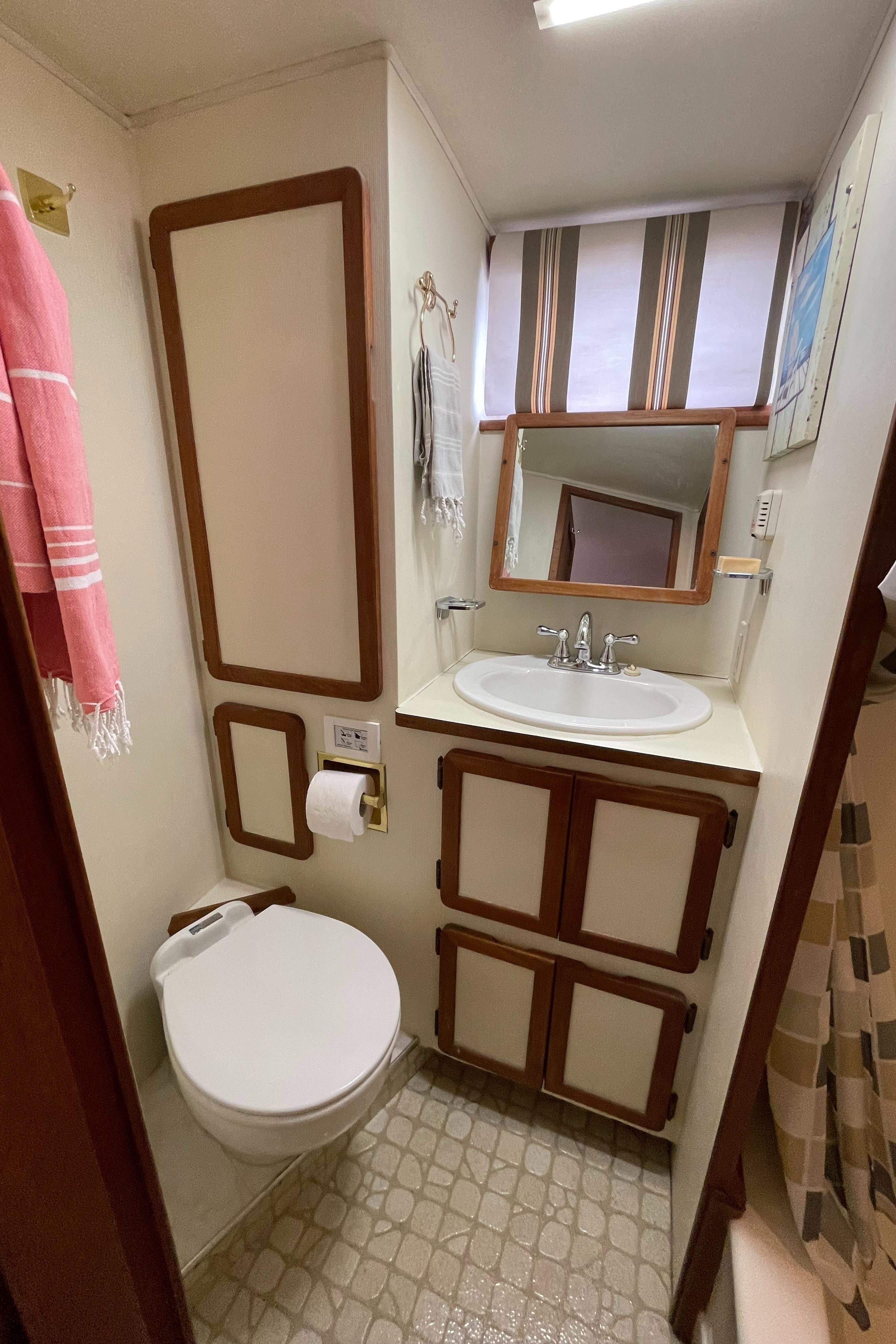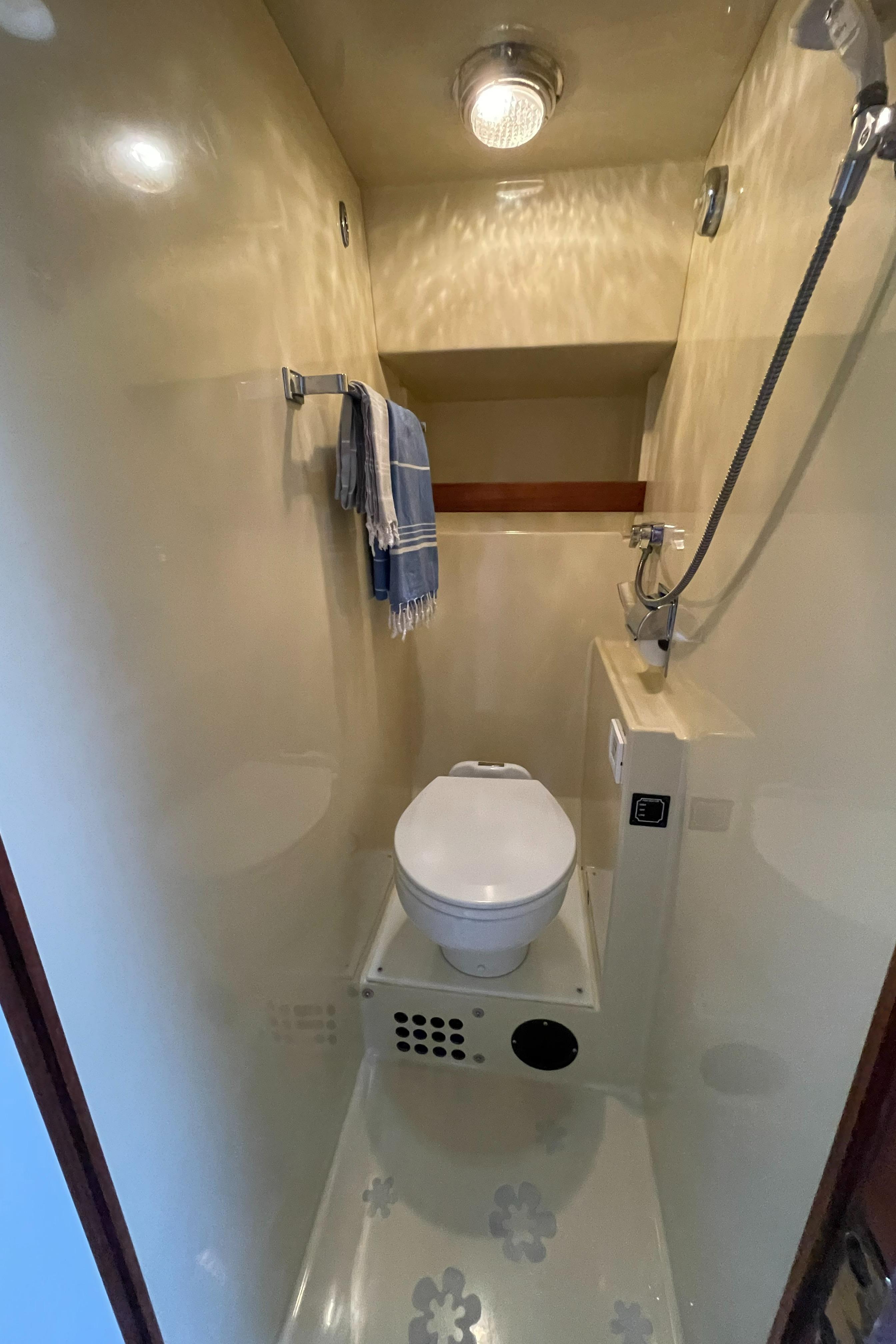 - Guest head: Enclosed compartment featuring an electric flush toilet and shower