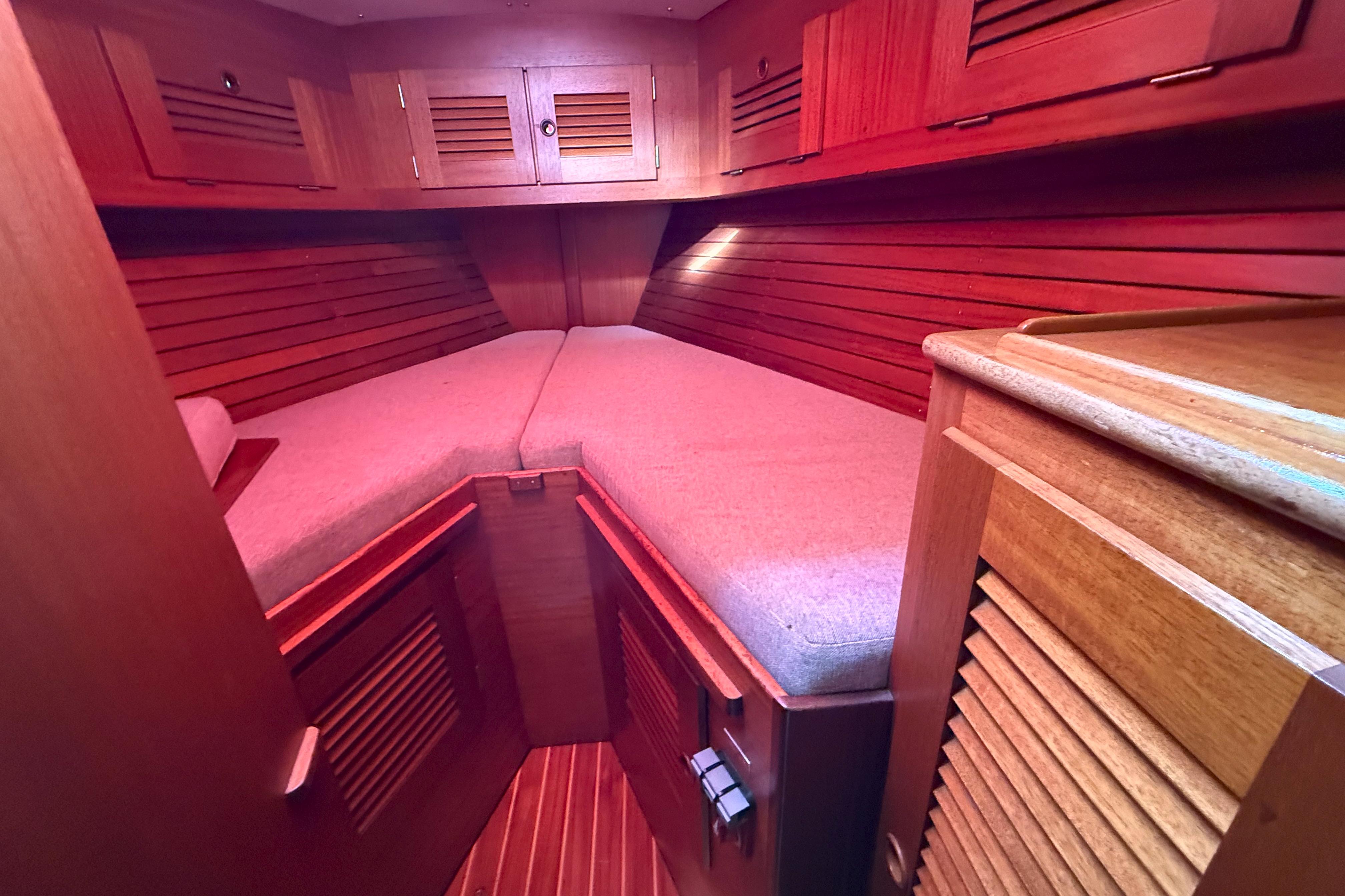 Beautiful handcrafted interior to a level of quality rarely seen today. In typical Hallberg Rassy fashion, the yacht is an optimum compromise of comfort and practicality for extended offshore adventures. As one enters the saloon through the companionway the galley is right at hand to starboard and the navigation station to port. Moving forward there is a large foldup saloon table with integrated storage. The two saloon benches have fold up berths providing four excellent sea berths. Continuing forward is yet more storage and the guest head. The guest head has a new sink and a separate shower area. All the way forward is the guest cabin again with extensive storage. This berth can be configured as a large bed for a couple or into two singles. The large forward facing navigation station is a great chart table or “home” office with room for large charts and extensive storage. All the way aft is the very private and comfortable master suite with ensuite head. This berth too can be either two singles or one large bed. Diesel heat – Wallas 40D (2020) for four season cruising. Deck prisms for additional lighting Interior teak woodwork, soles and upholstery in assessed by a surveyor in ‘good’ condition. Forward and aft head sinks replaced 2025.