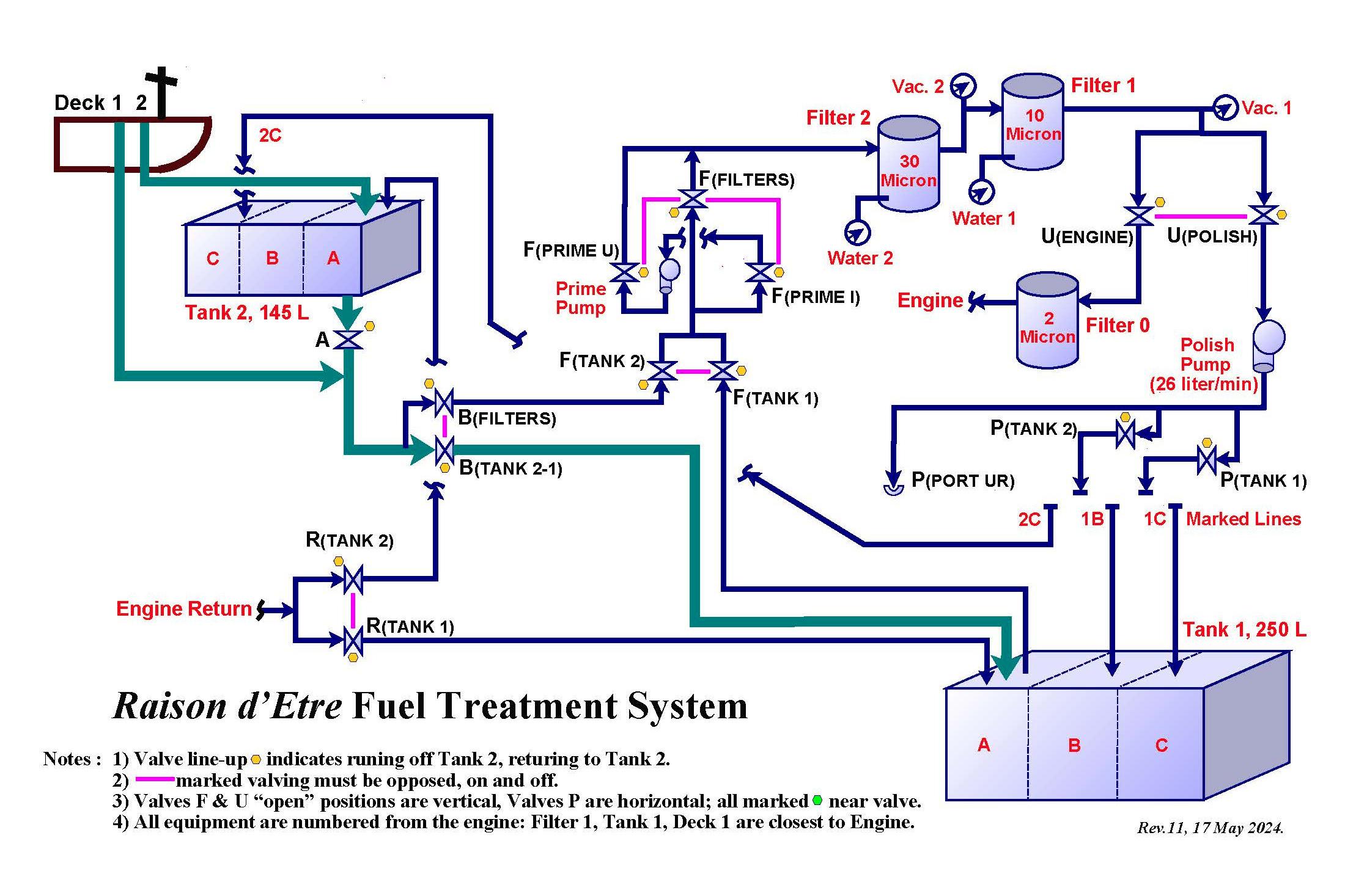 pre-engine 30 and 10 μm filters with water & filter ΔPressure sensors, plus a 2 μm at engine, fuel returns to either Tank. For polishing a 26 liter/min pump is engaged, returning fuel to either a purge/spray placed in Tank #2, or two optional purge/sprays placed in Tank #1).