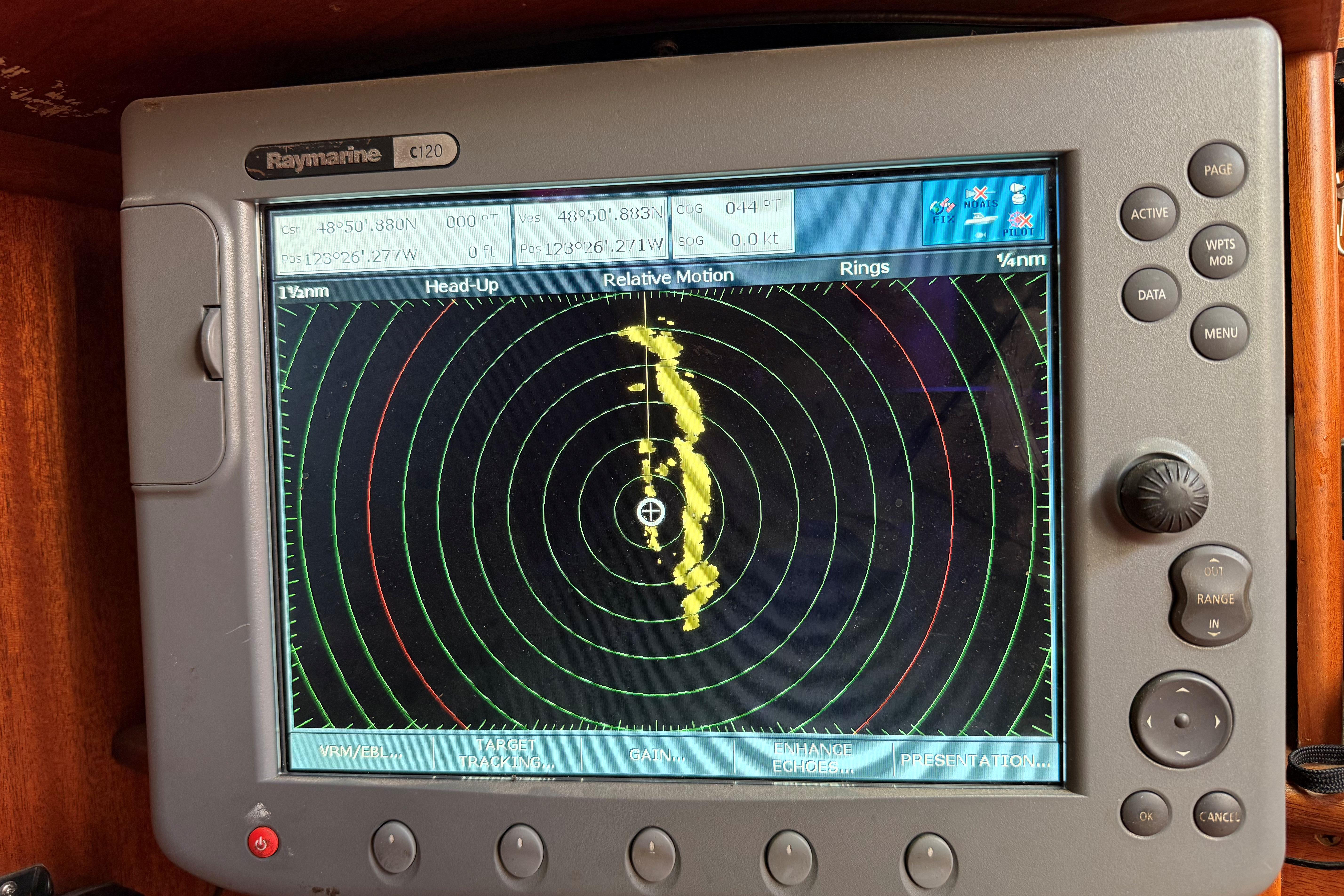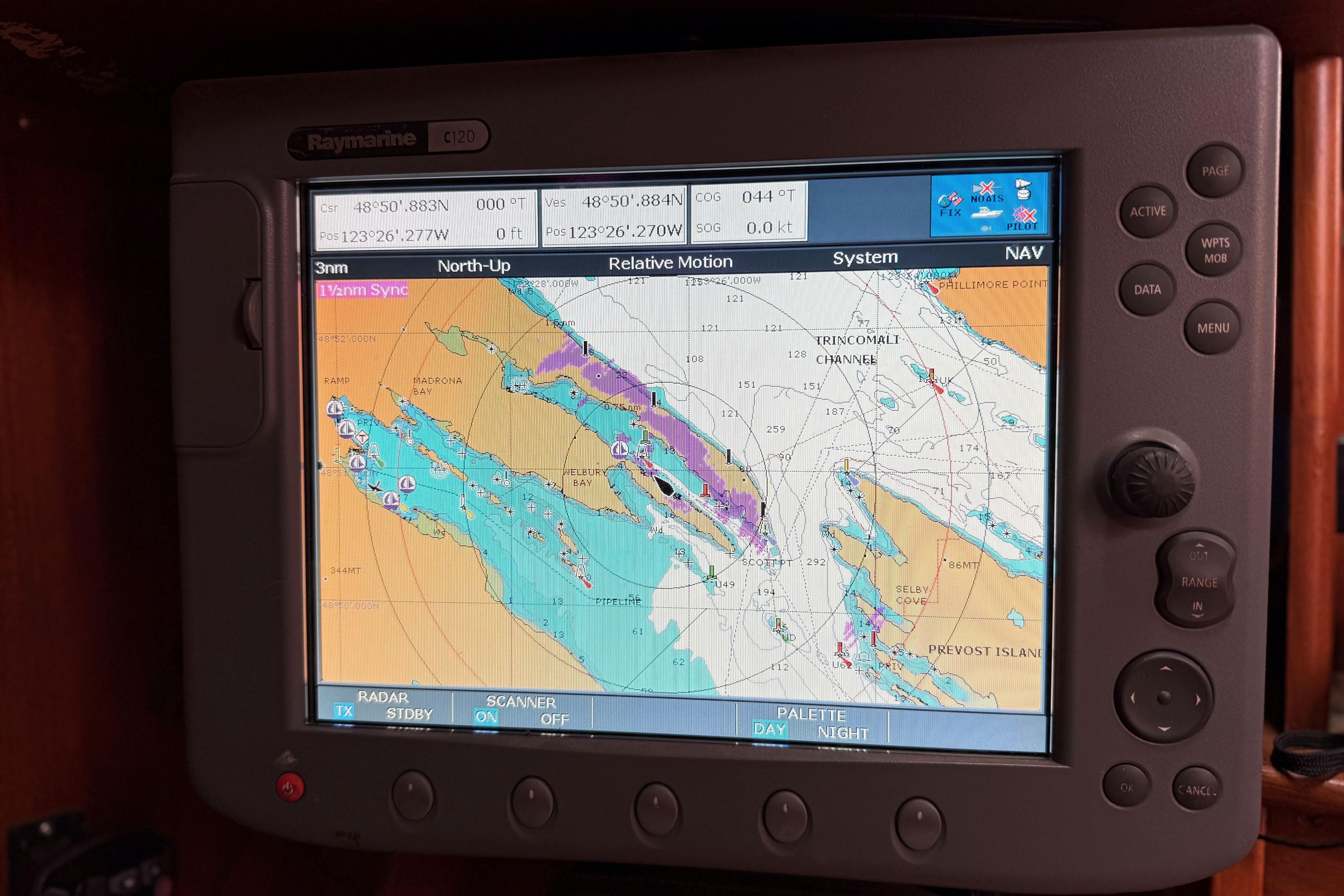 Garmin echoMap 72cv chartplotter/MFD at helm Hull mount for Garmin forward facing sonar Panoptix PS51 (wired but the transducer needs replacing) (2022) Raymarine C120 (2010) chartplotter at chart table Raymarine 2kw radar (2010) Raymarine ST60 wind, tridata and graphic at companionway (2010) Raymarine Autohelm 6000 autopilot (2010) with updated colour control head at the companionway (2014). Hydraulic autopilot ram serviced 2015 plus spare ram. Extensive switching at companionway. iPad mount at helm VHF Standard Horizon GX2200 with AIS and DSC (2019) VHF Antenna recently replaced Iridium Go satellite communication (2020) Coastal Marine WiFi (2020) WeBoost Drive Cellphone Booster Weems and Plath Barometer