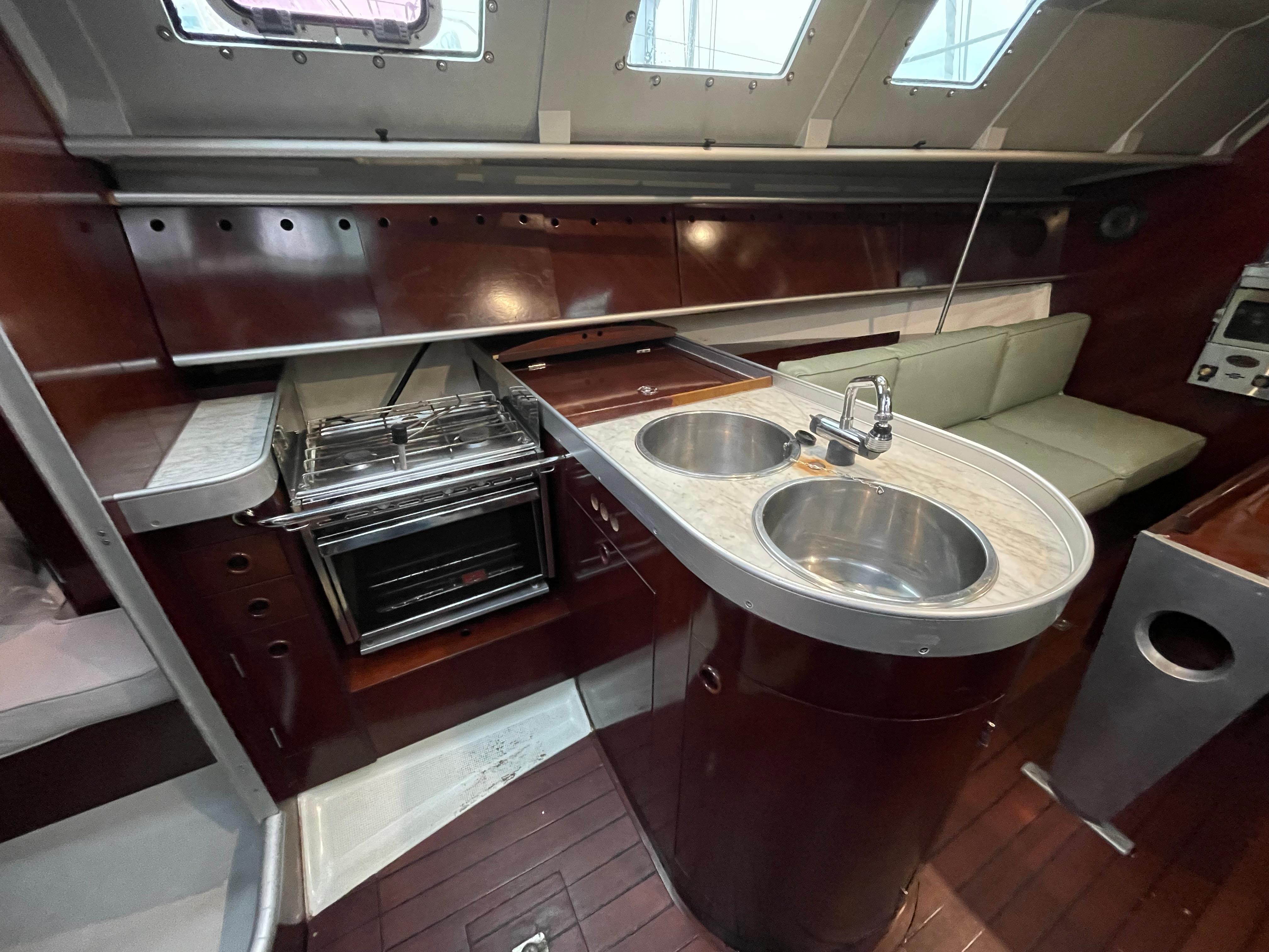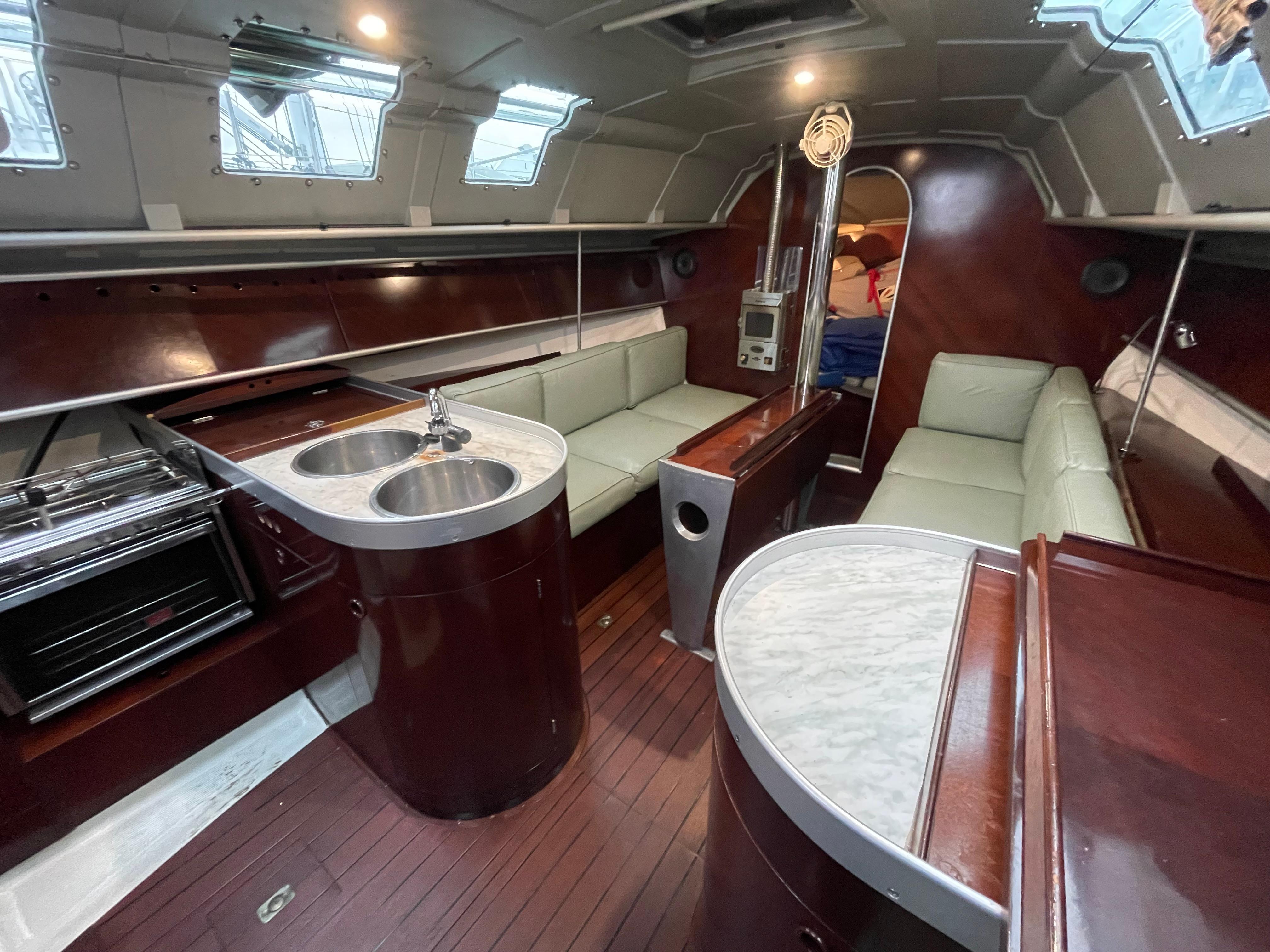 The Beneteau First 35S5 definitely was an innovative design for that time, being introduced at the tail end of the IOR racing designs, this allowed for a much better design for safer and more comfortable sailing. The interior, designed by Philippe Starck, broke barriers with a more contemporary European finish with rounded doors and counters, metal trim and dark Mahogany joinery.