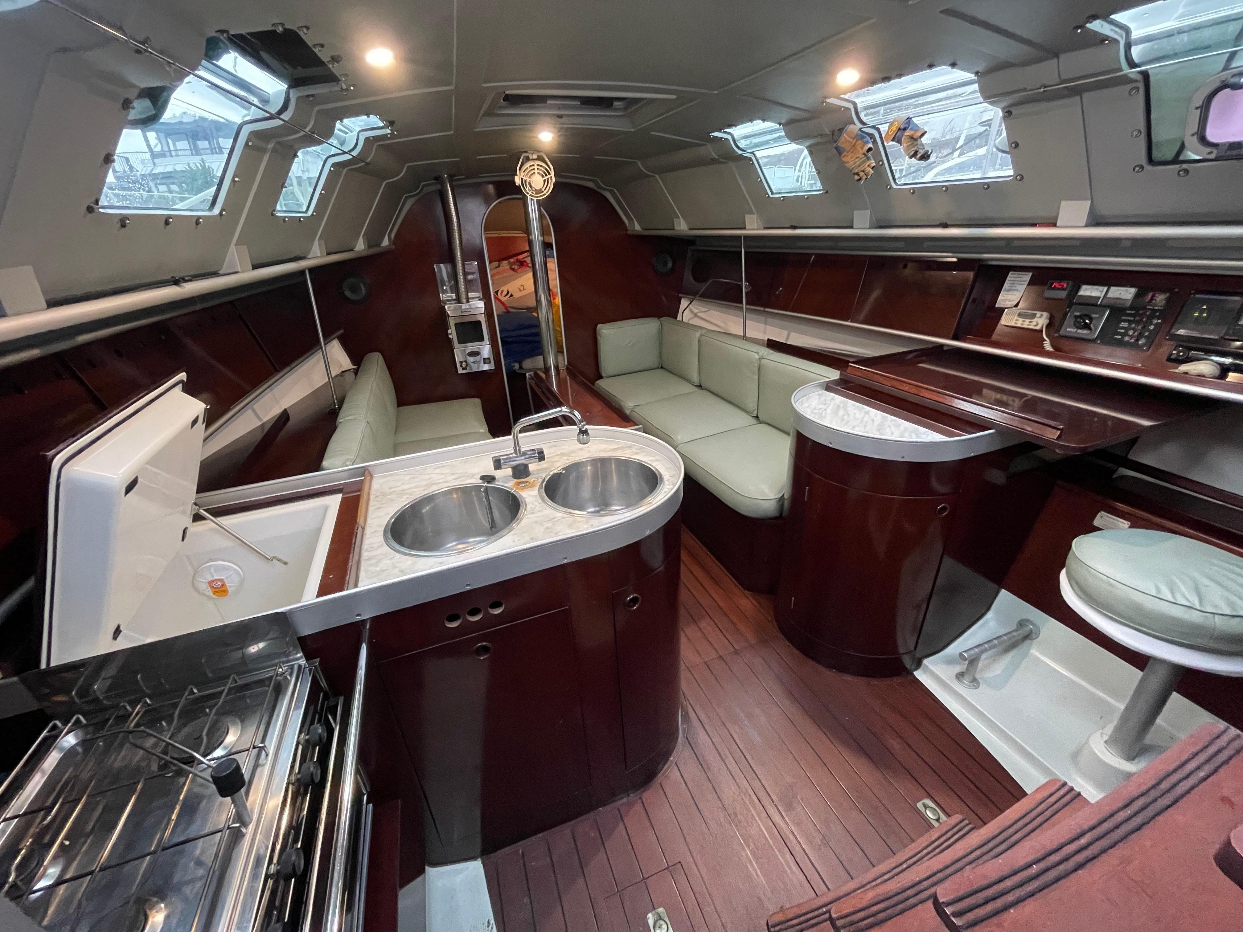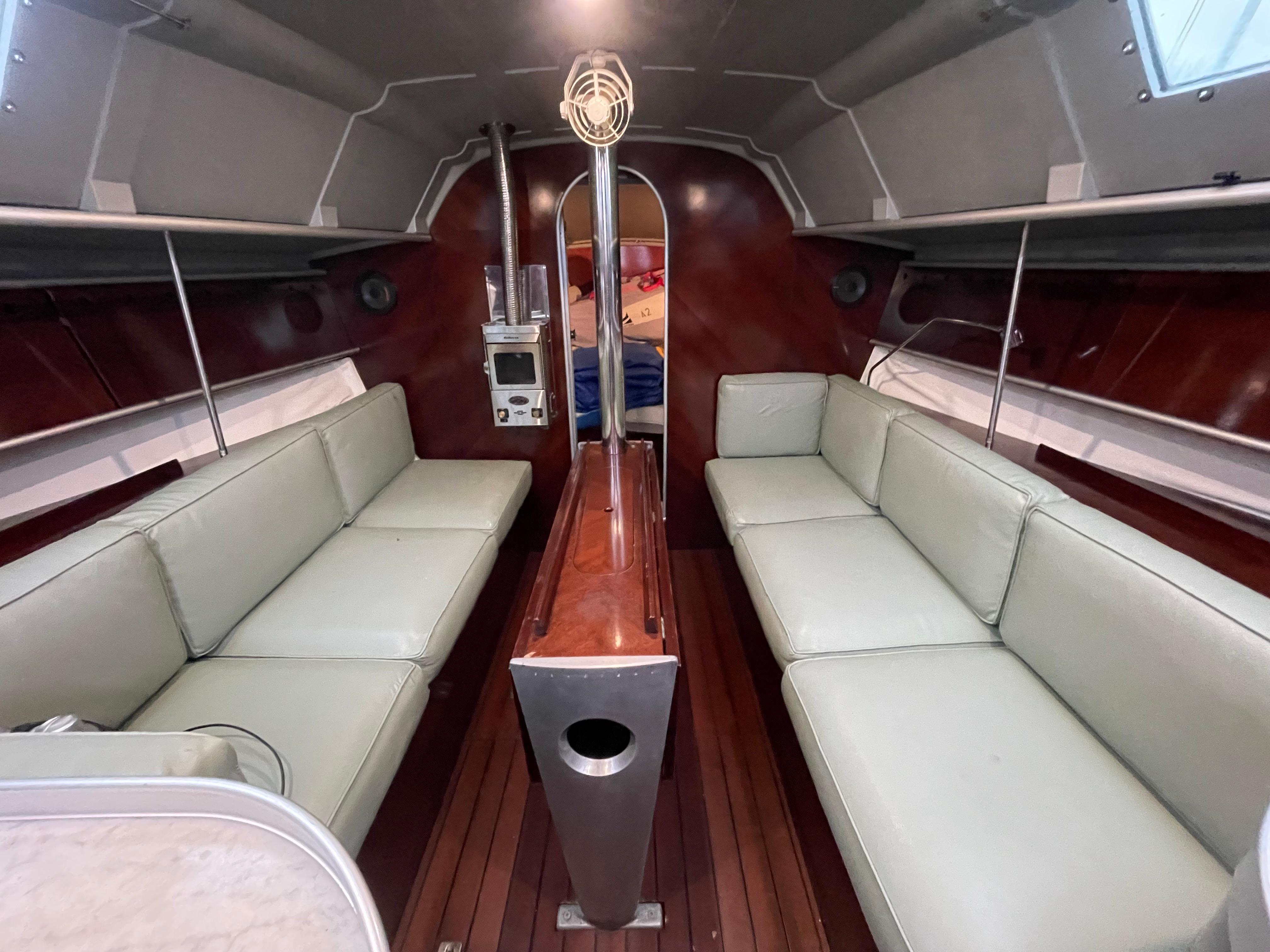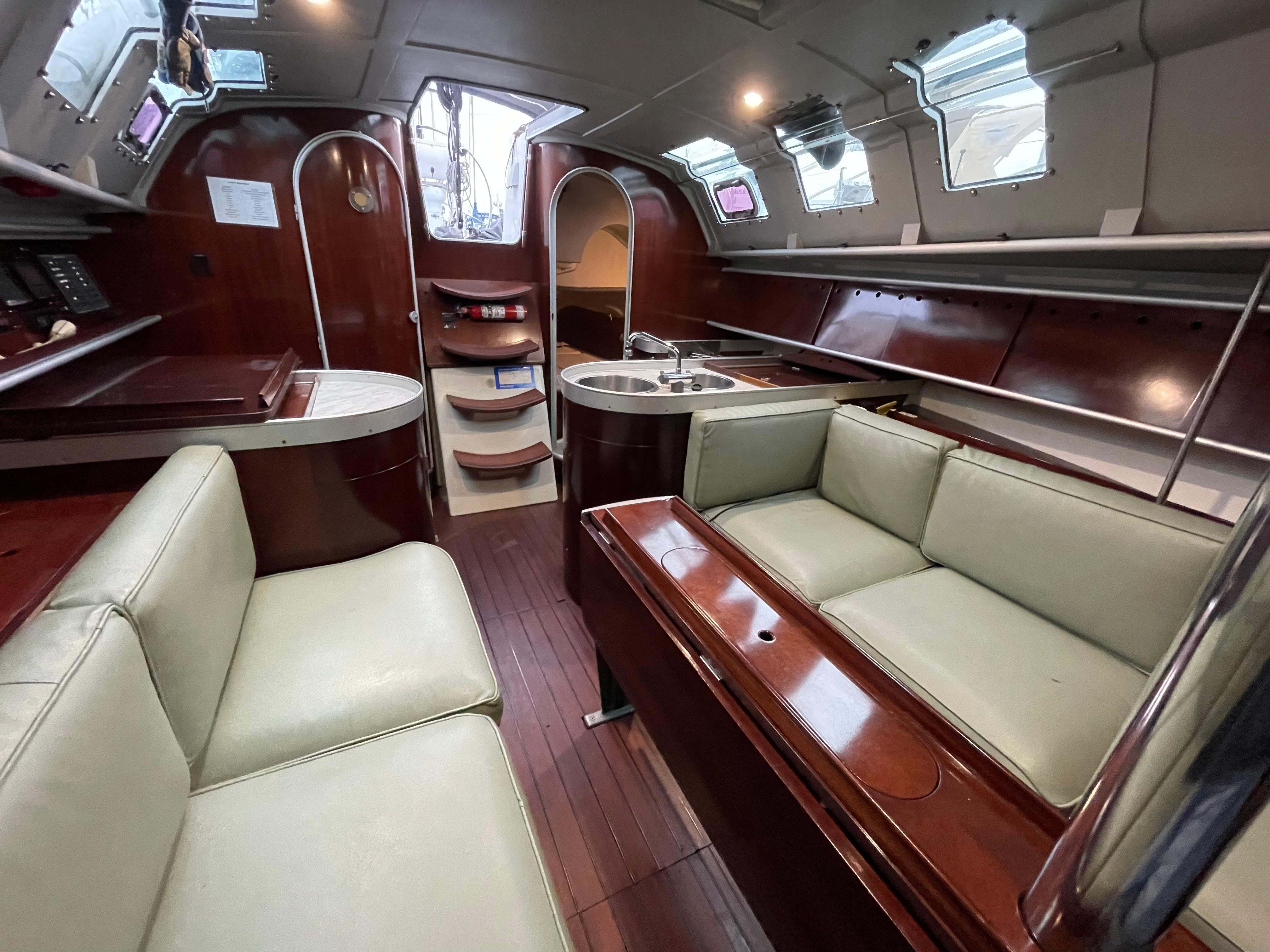 - Salon: forward of the galley and chart table, features port and starboard 3 seat bench settees