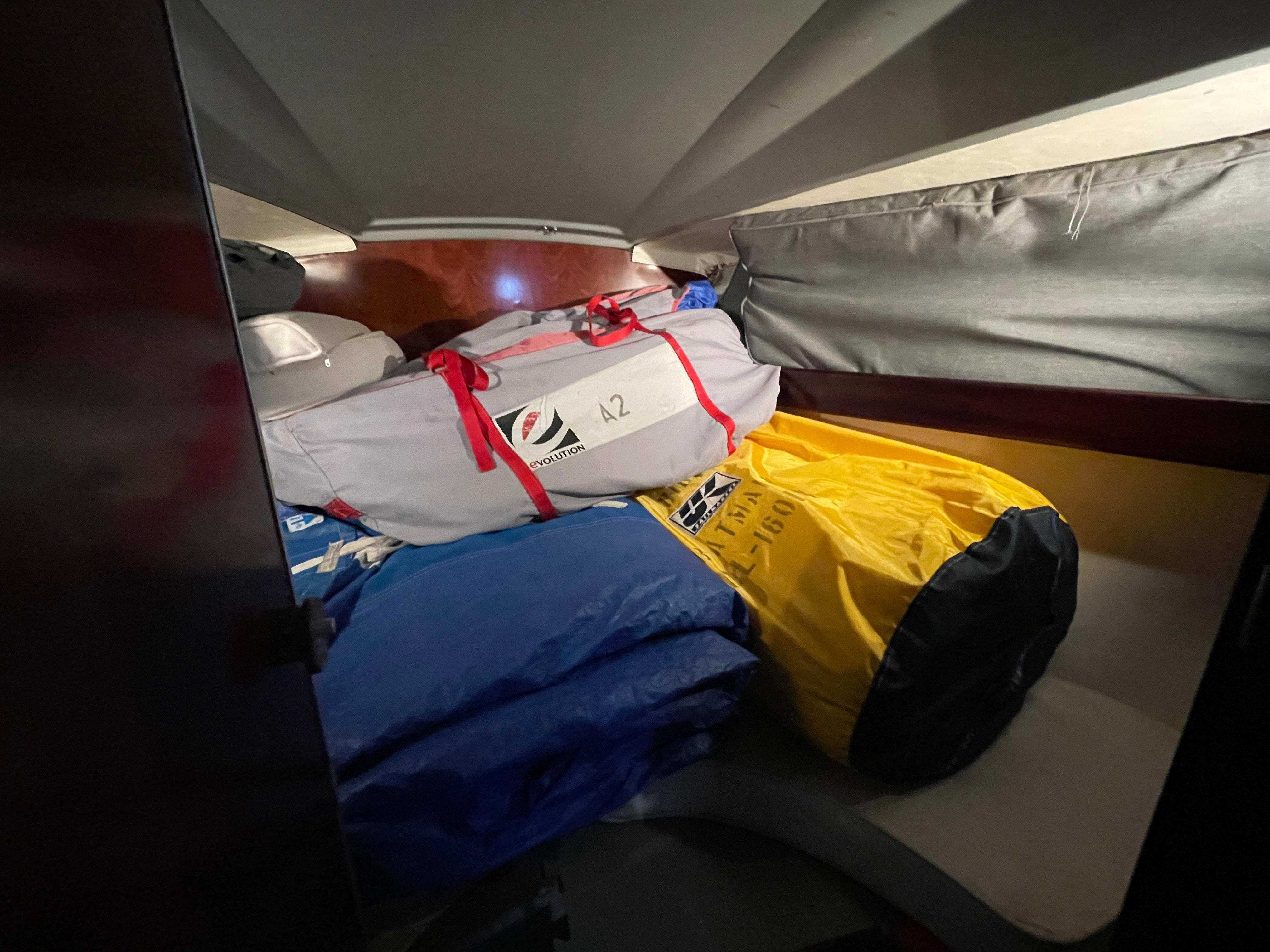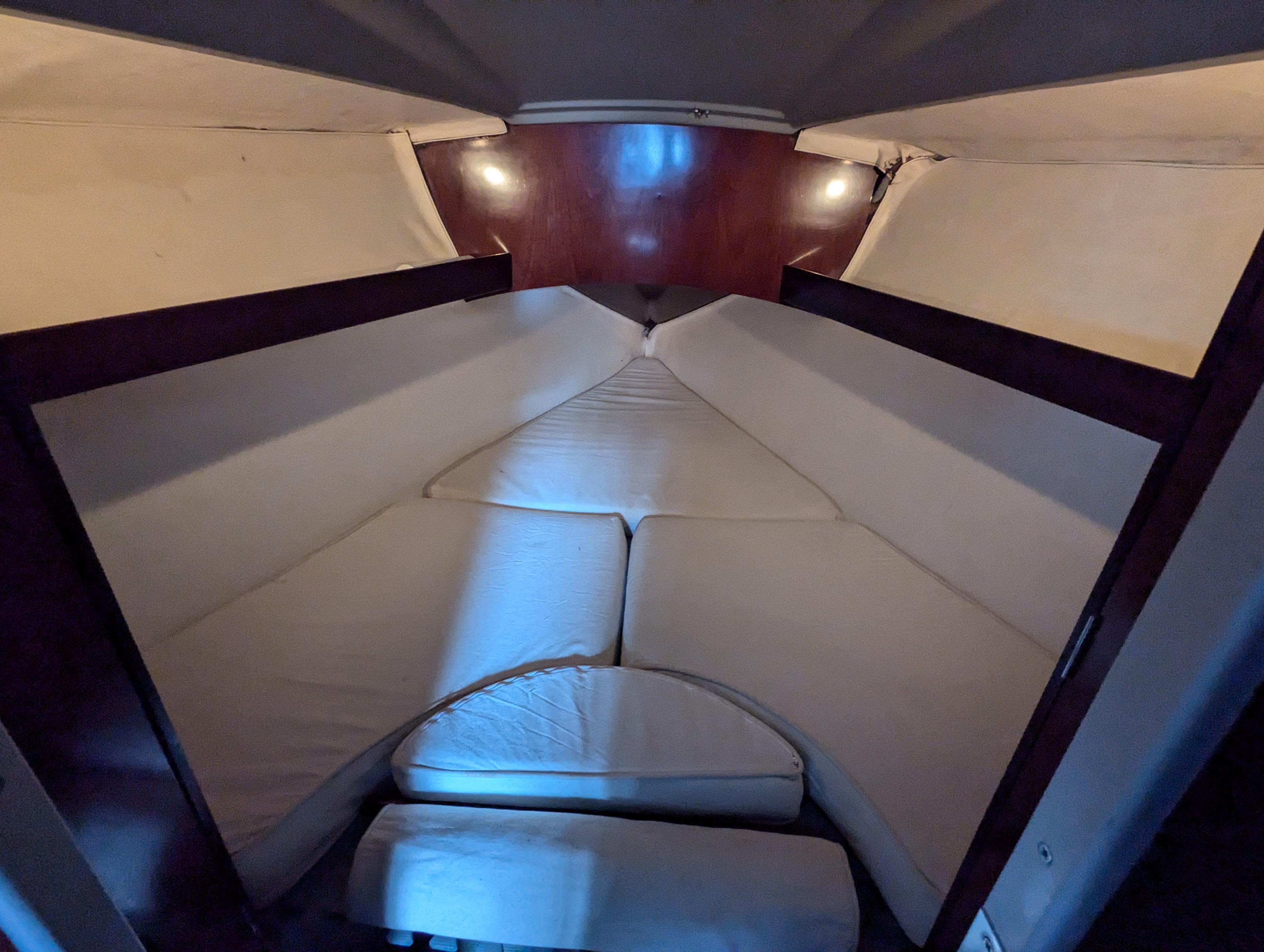 - Fwd Cabin: V-berth, reading lights, opening hatch, 2 x hanging lockers, filler cushions