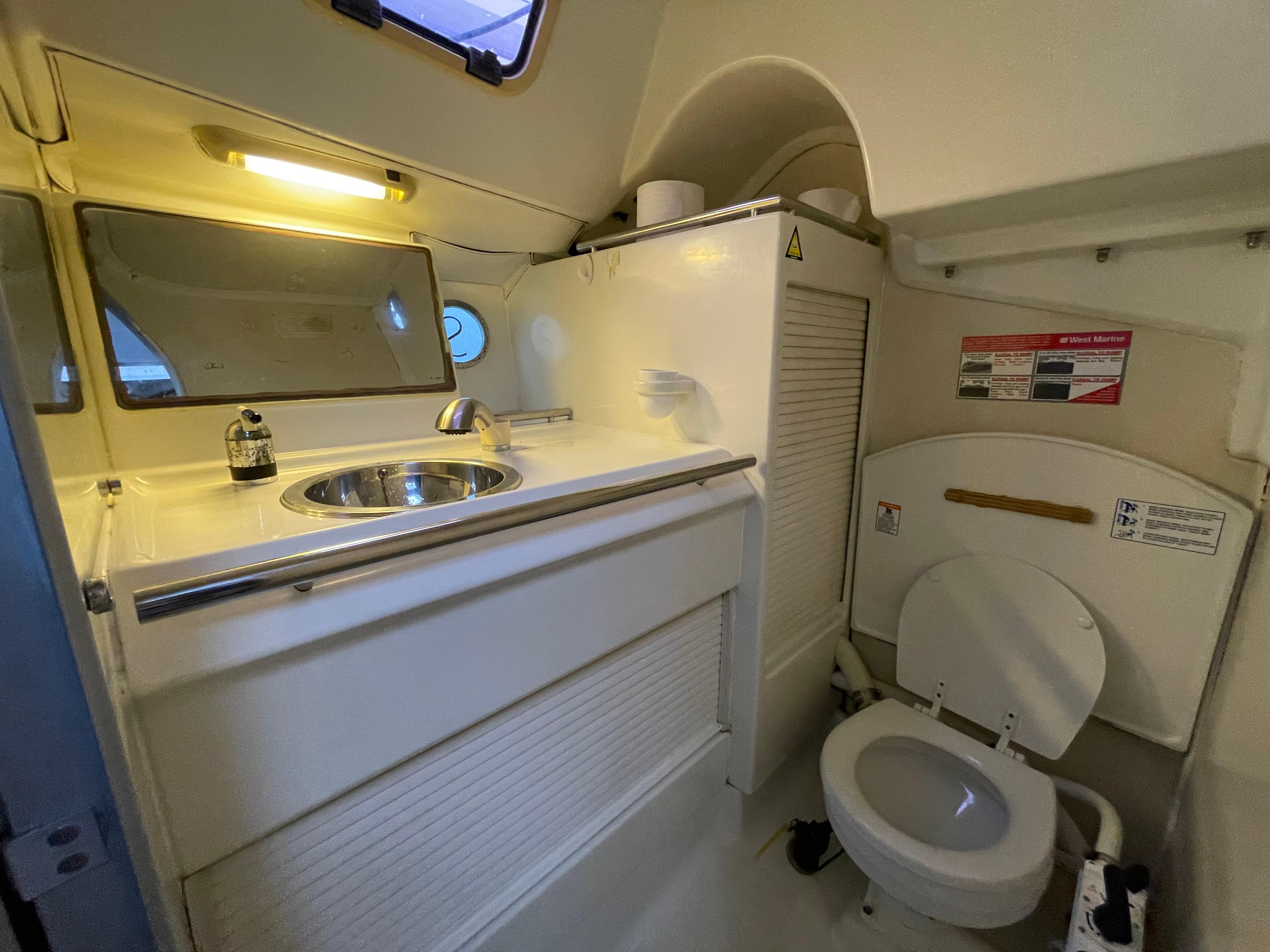 - Head: Good size compartment, large vanity with S/S sink, shower, Jabsco manual flush toilet, seat over toilet for showering, good storage