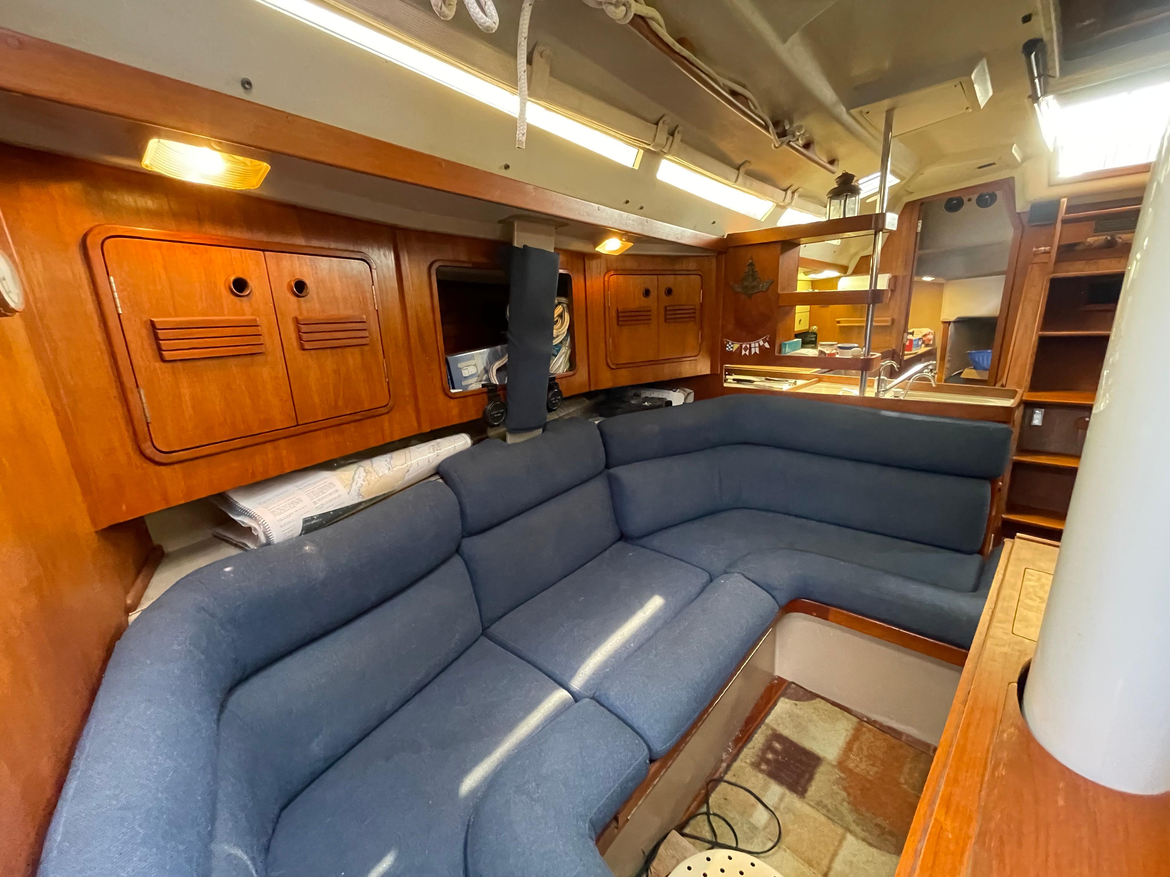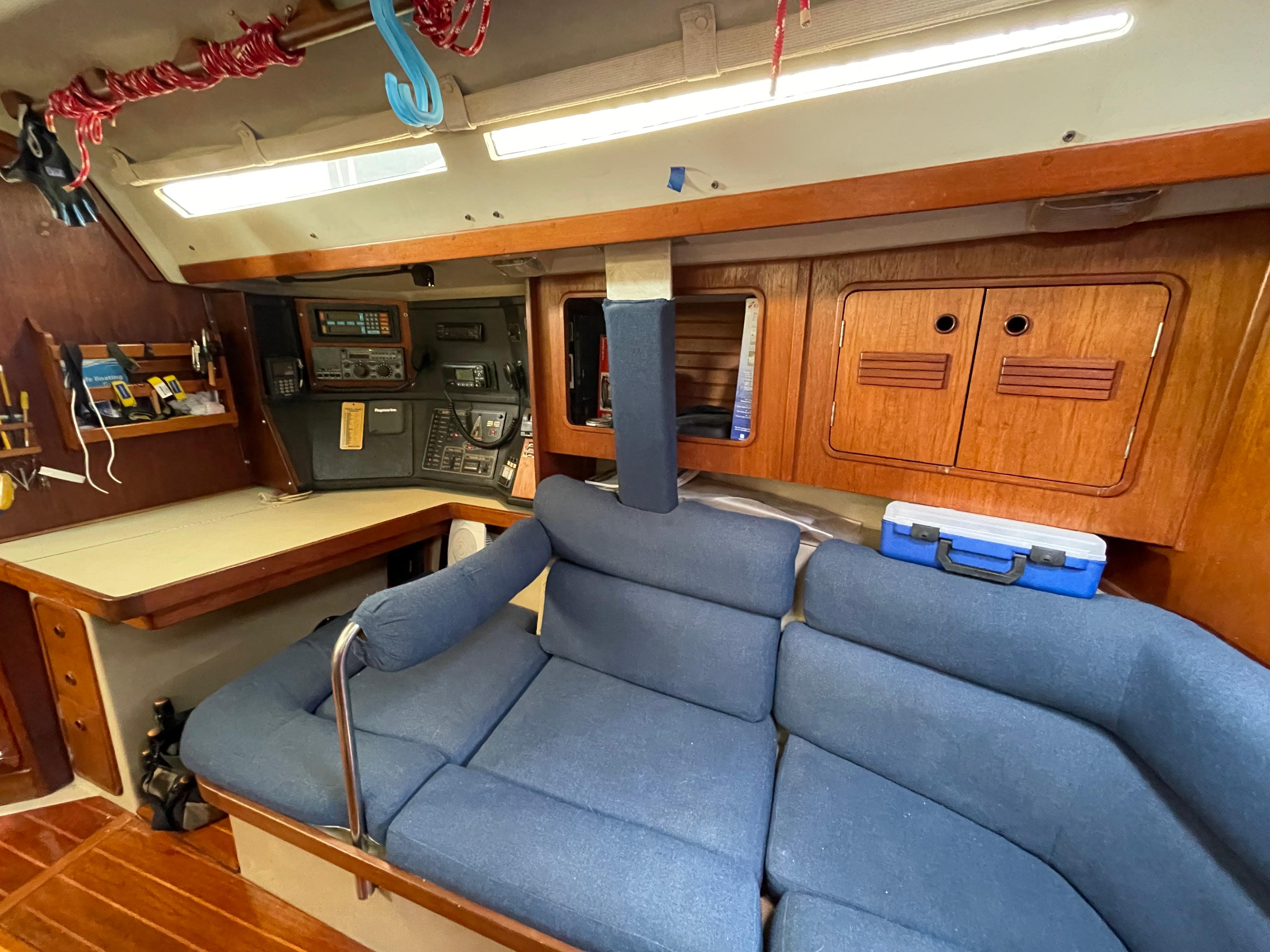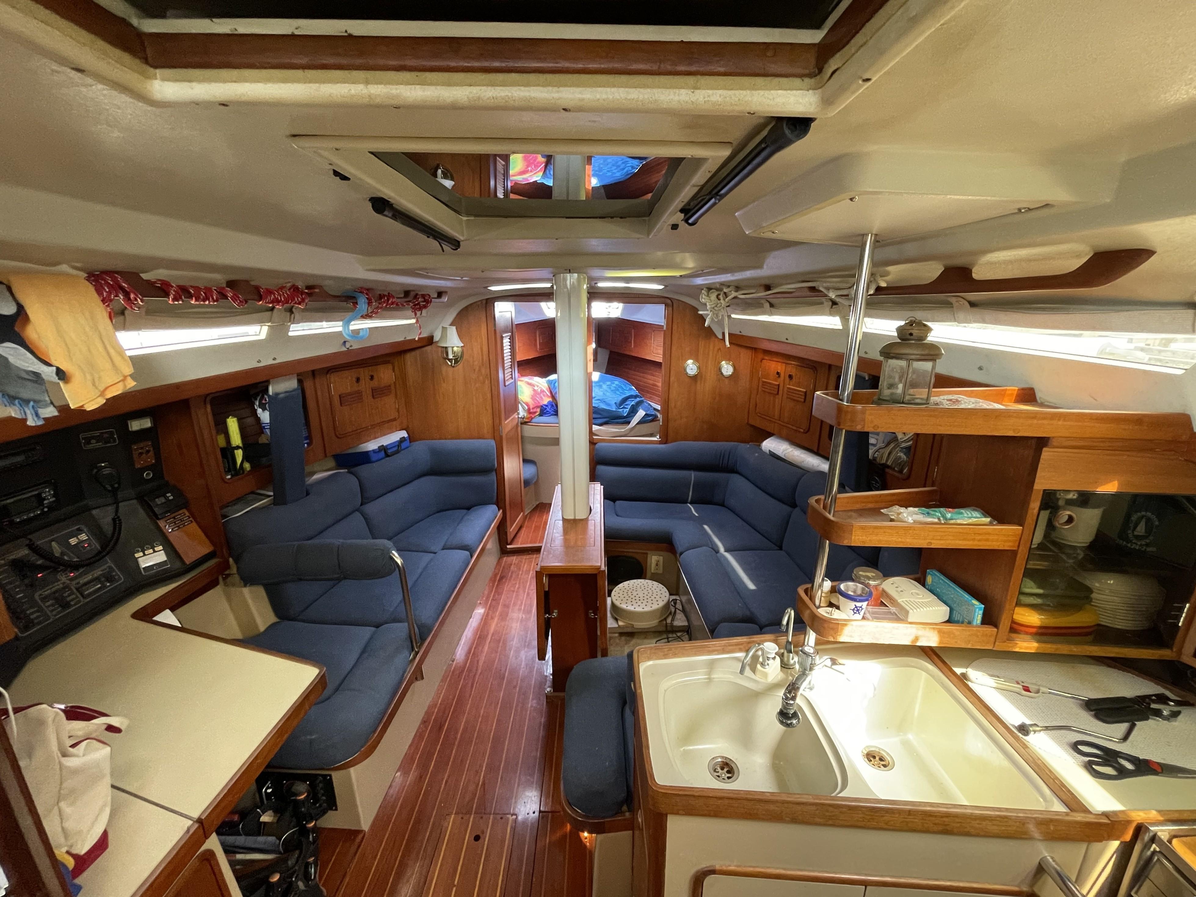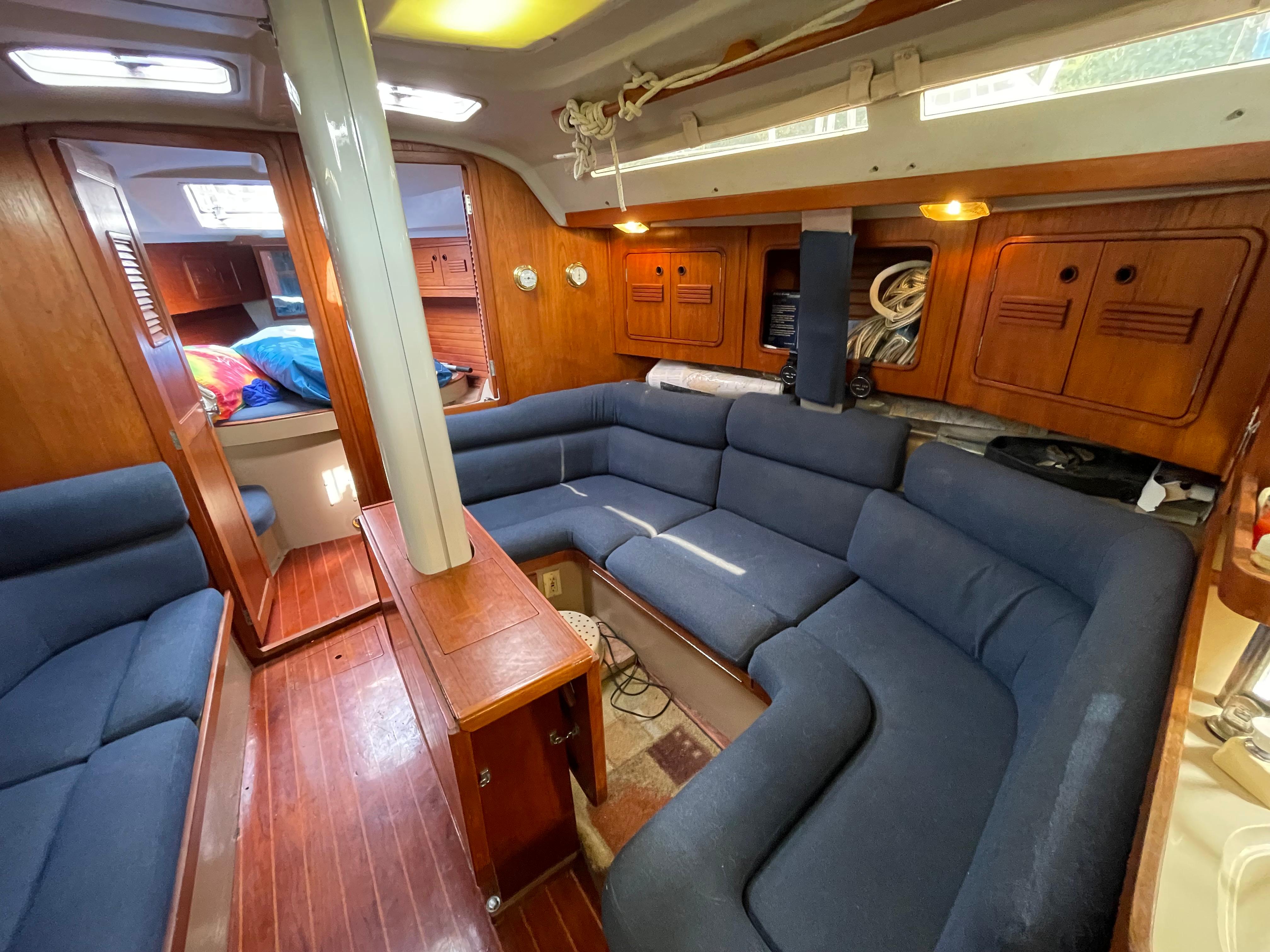 - Salon: fwd of the l-shaped galley and chart table features a settee to port and a U-shaped settee to starboard