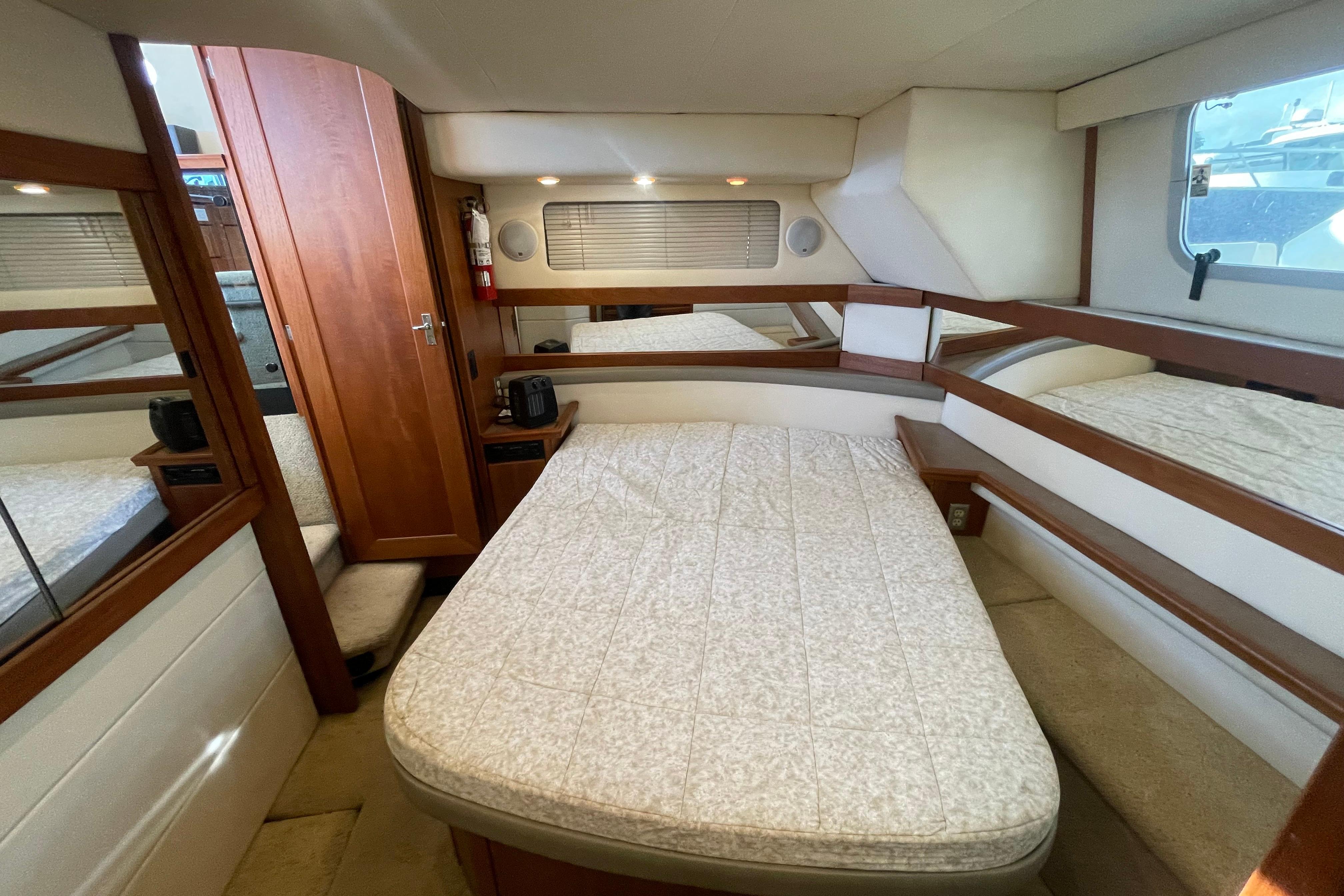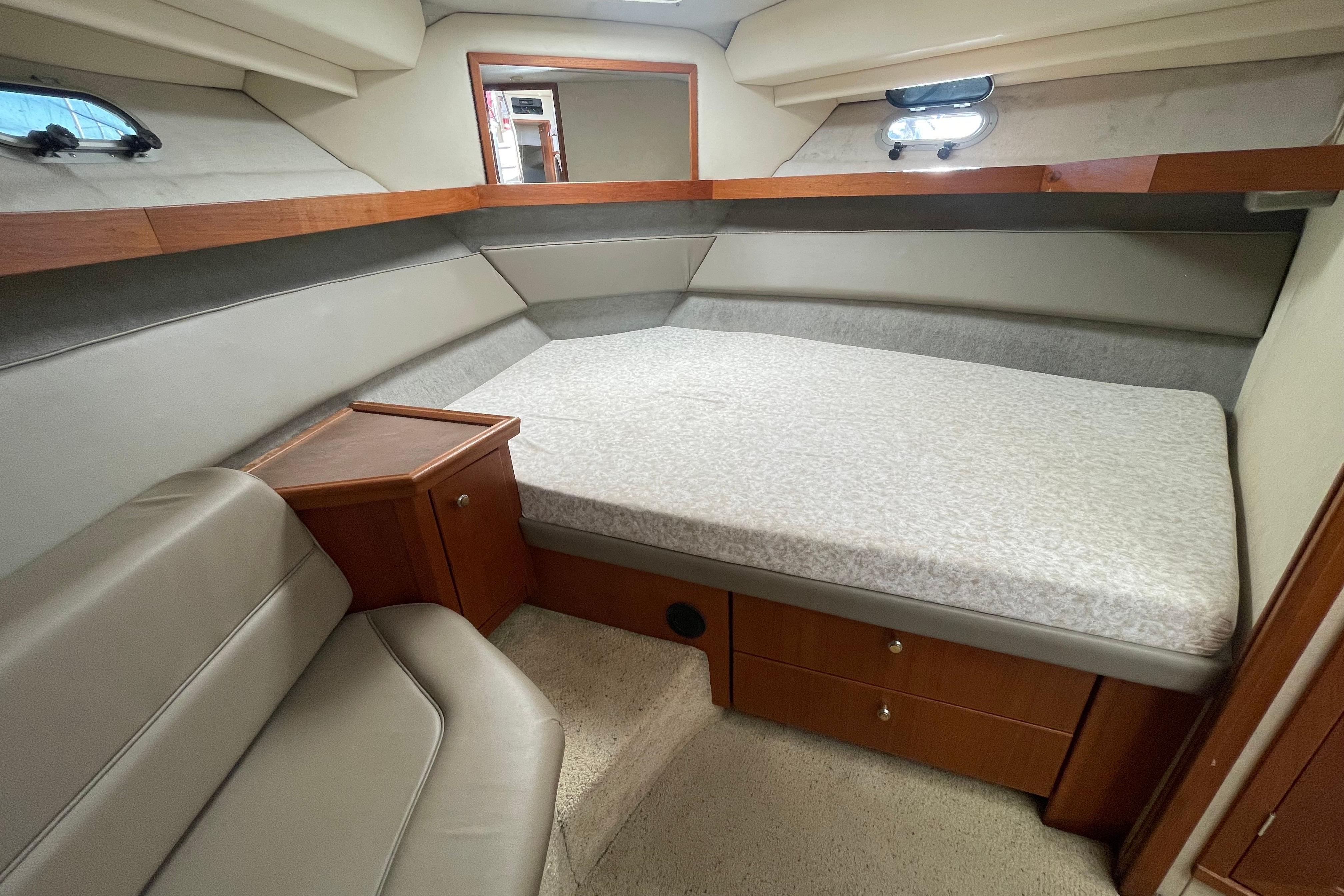 The interior is bright and inviting. Large side windows allow an abundance of natural light into the boat. The owners cabin is aft which features a double walk around bed, a vanity with storage and mirrors as part of the cabin. The shower and toilet are two separate enclosed compartments within the cabin. Forward is the guest cabin and 3rd cabin, both with double beds.