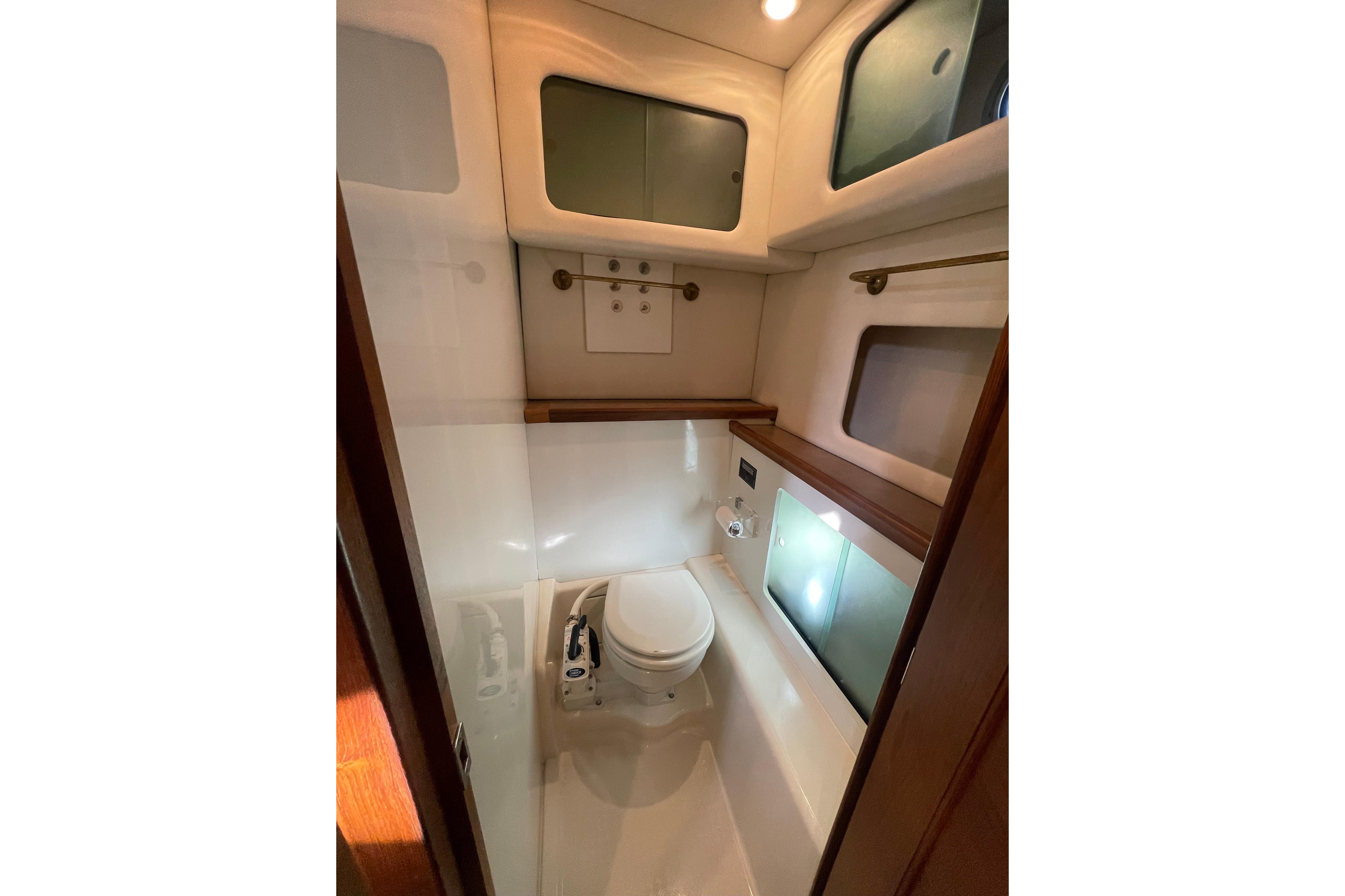 - Ensuite head: separate enclosed toilet, vanity with sink, storage and mirrors open to the cabin, separate shower stall with molded seat, manual Jabsco toilet