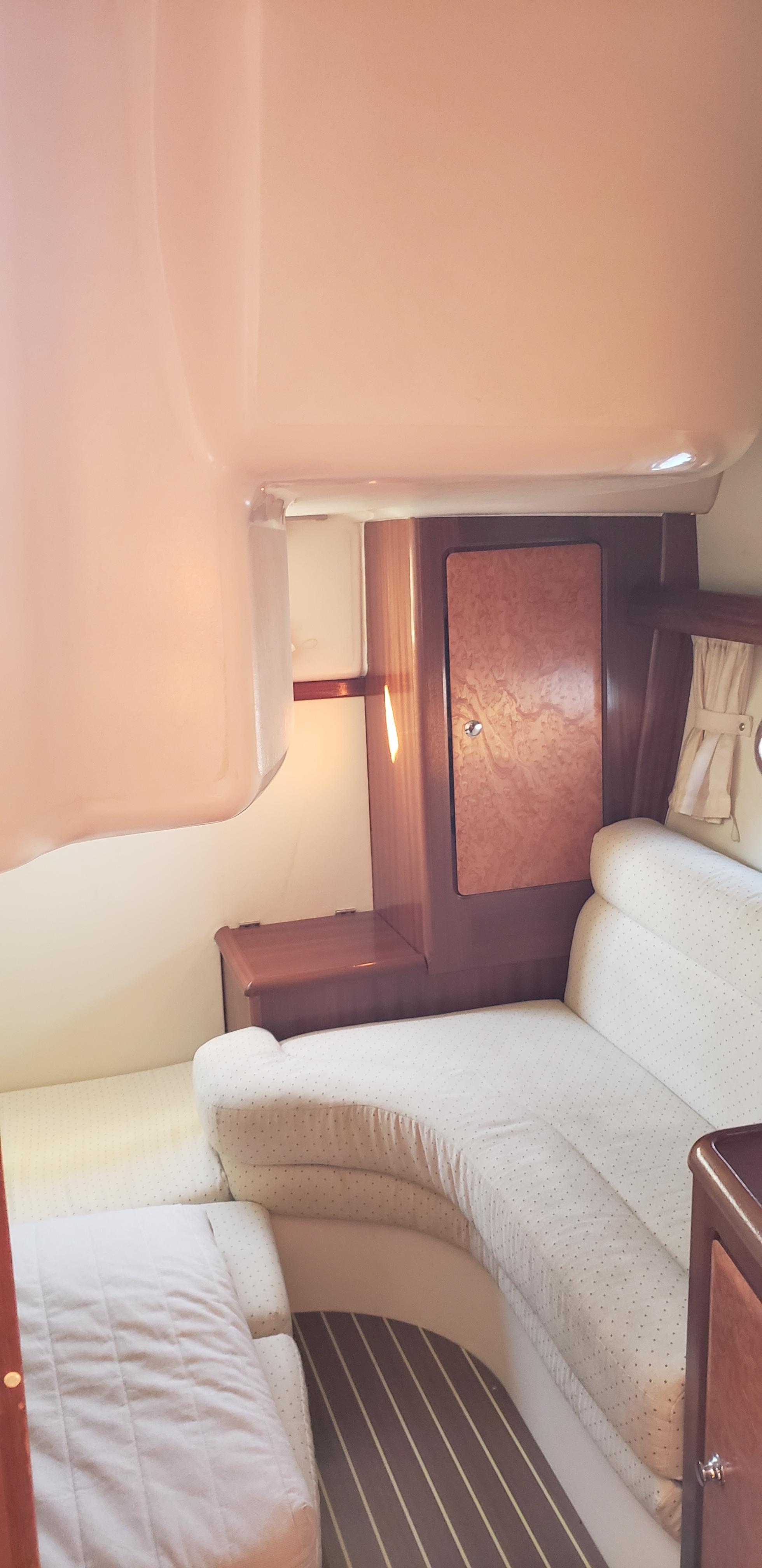 The interior of the vessel is nicely laid out and functional. It has a vinyl deckhead, teak and holly sole and fabric sliding curtains. The cushions are fabric covered noted in very nice condition. The cabinetry and bulkhead are exotic wood and teak. Overall the interior was found in very nice condition and with good housekeeping practices.