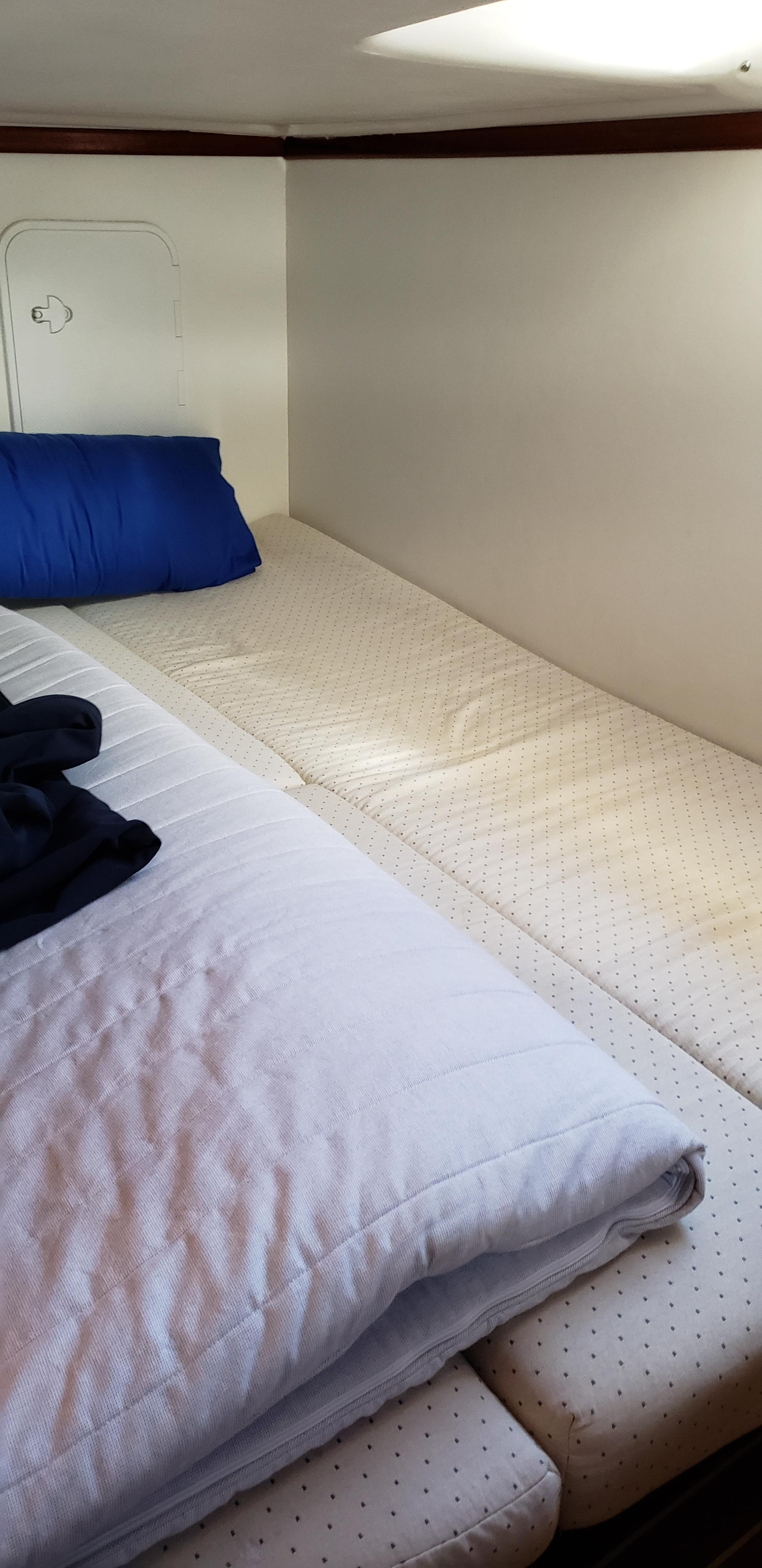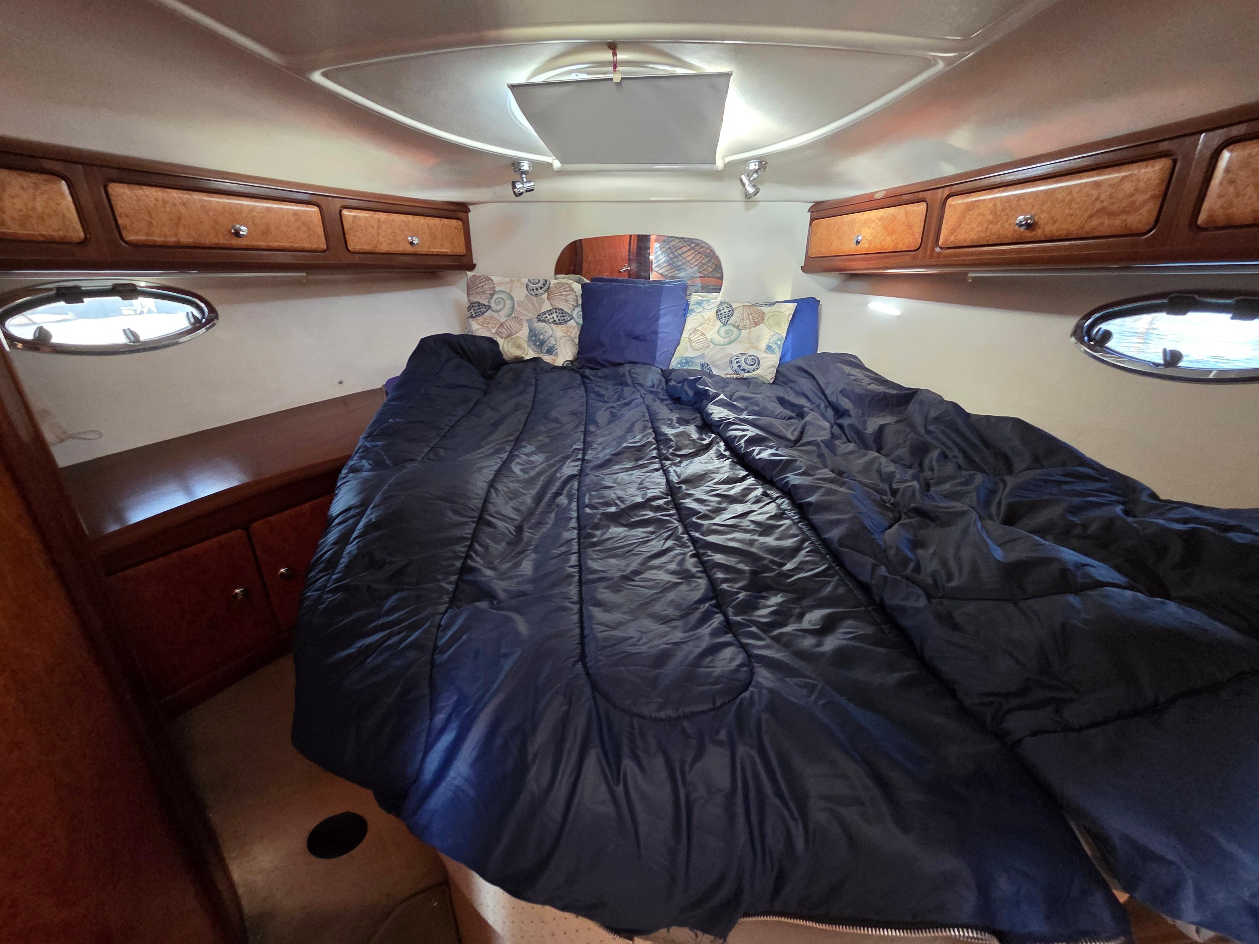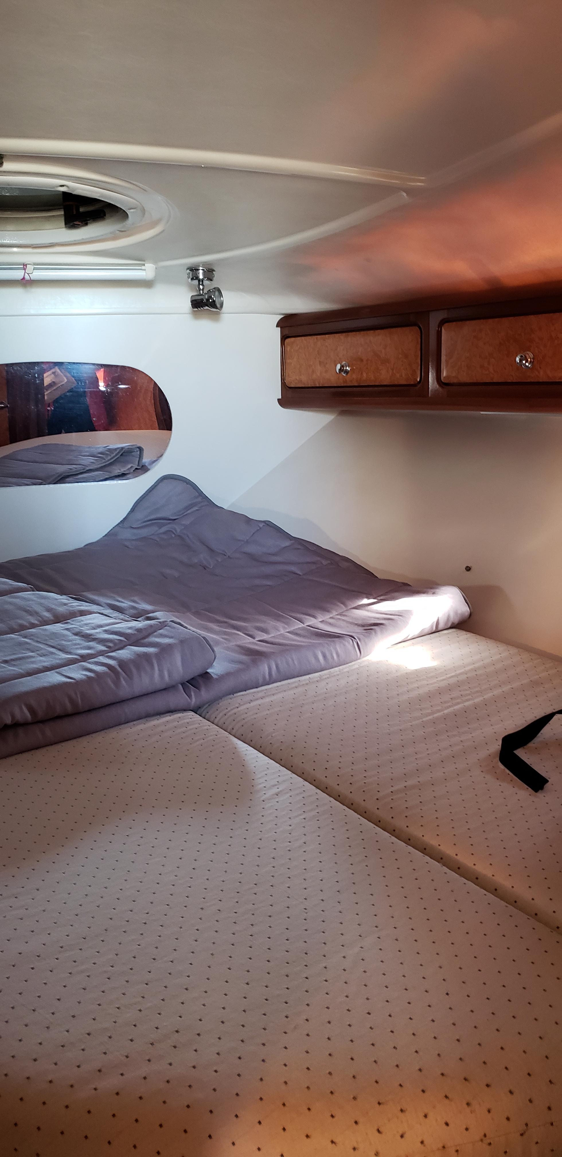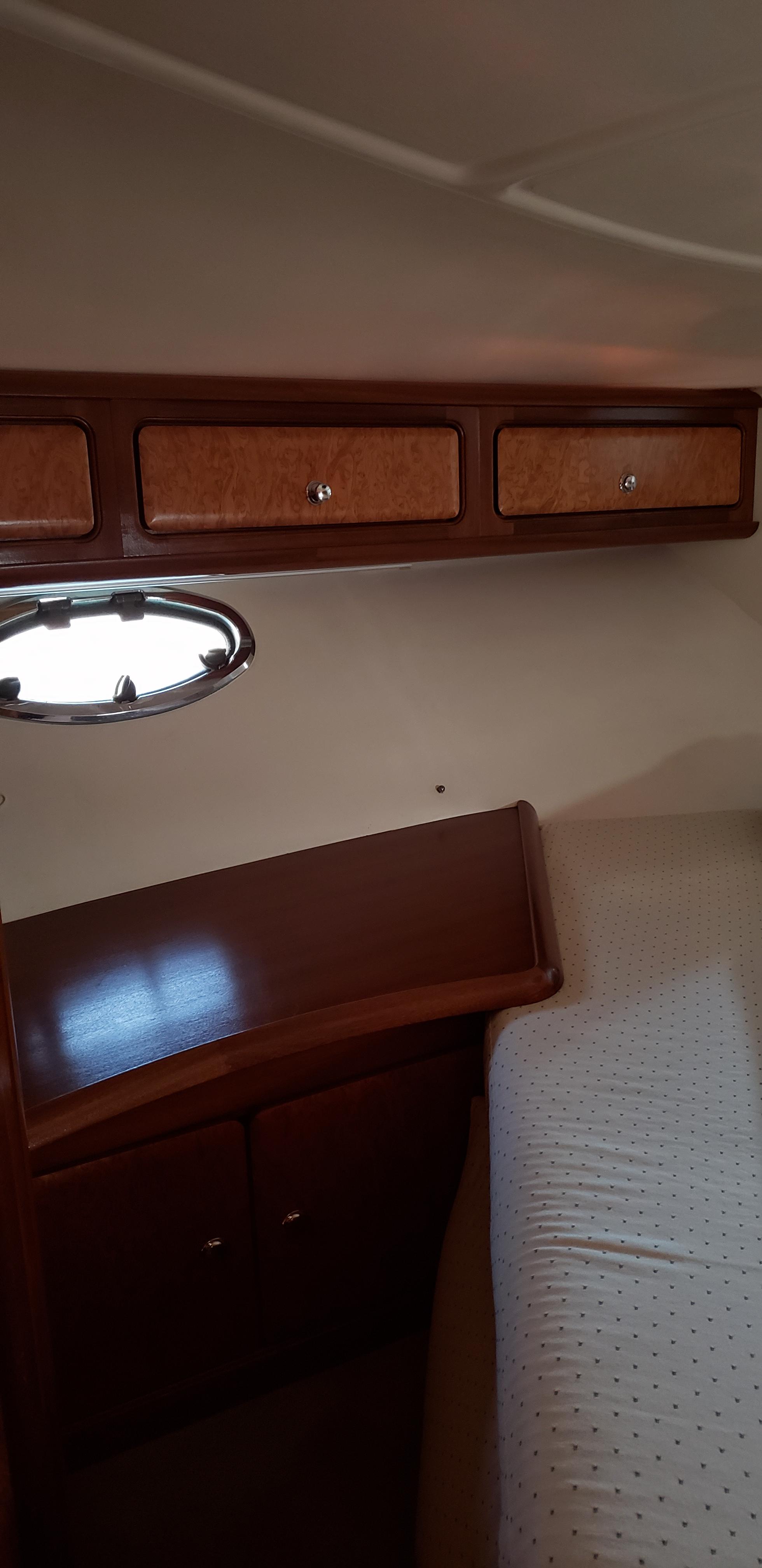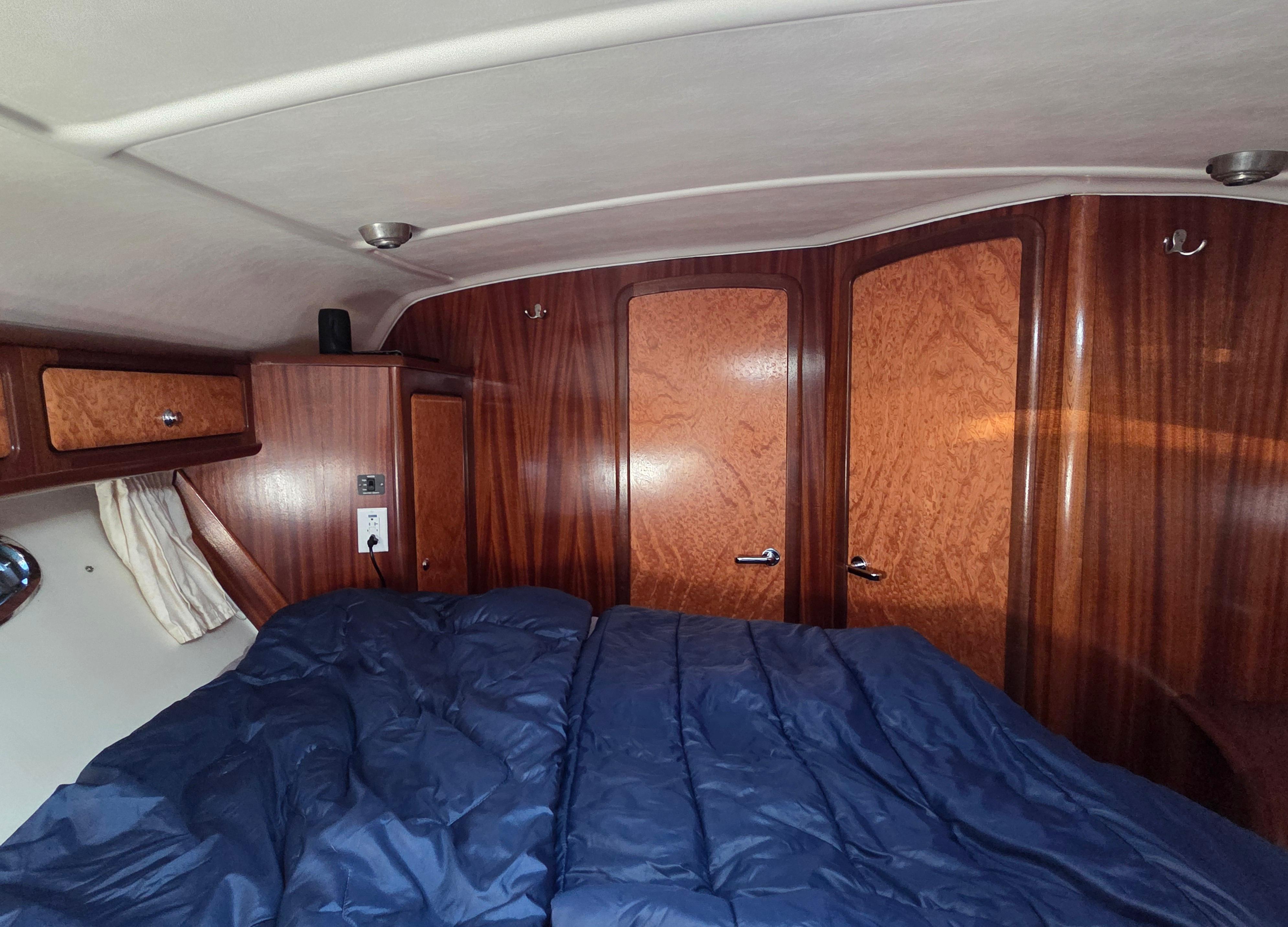 The layout has the forward stateroom (or “V-berth”) with a large queen size offset to starboard and against the forward bulkhead. The berth has full stowage under which include the two batteries dedicated to run the bow thruster including the “Prosport HD8" battery charger. The stowage also includes a heater an outlet from the Espar cabin heater. The hull sides have lockers secured under the deckhead. A hanging locker is located starboard aft. The partial aft bulkhead has an en-suite door to the enclosed head on the port side. The head is also accessible from the salon with a hinged door.