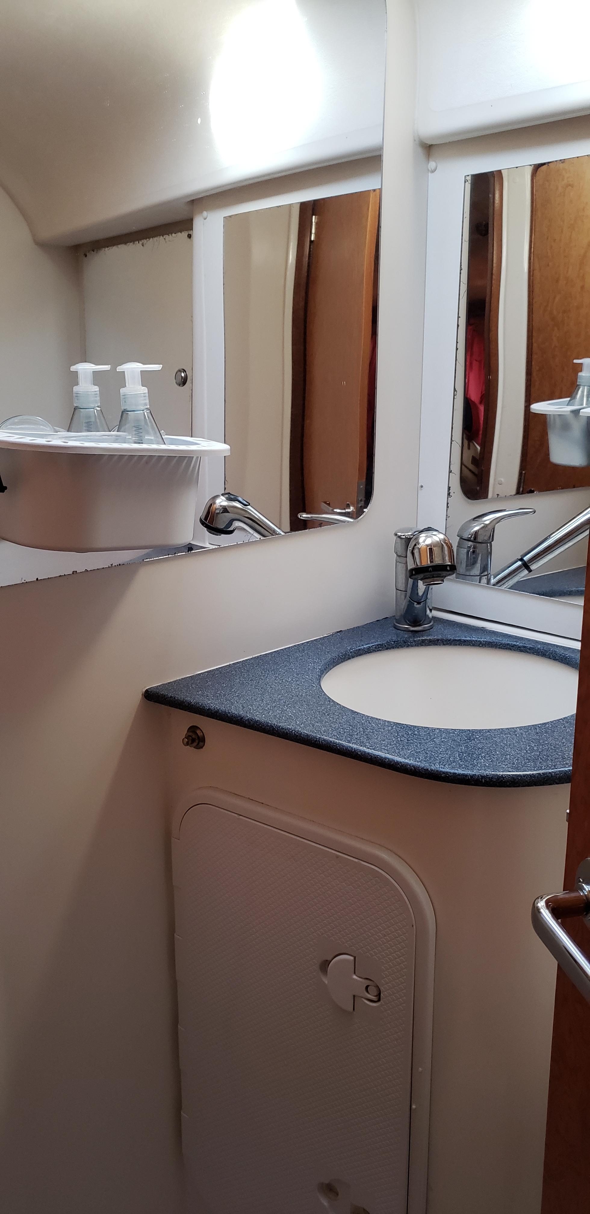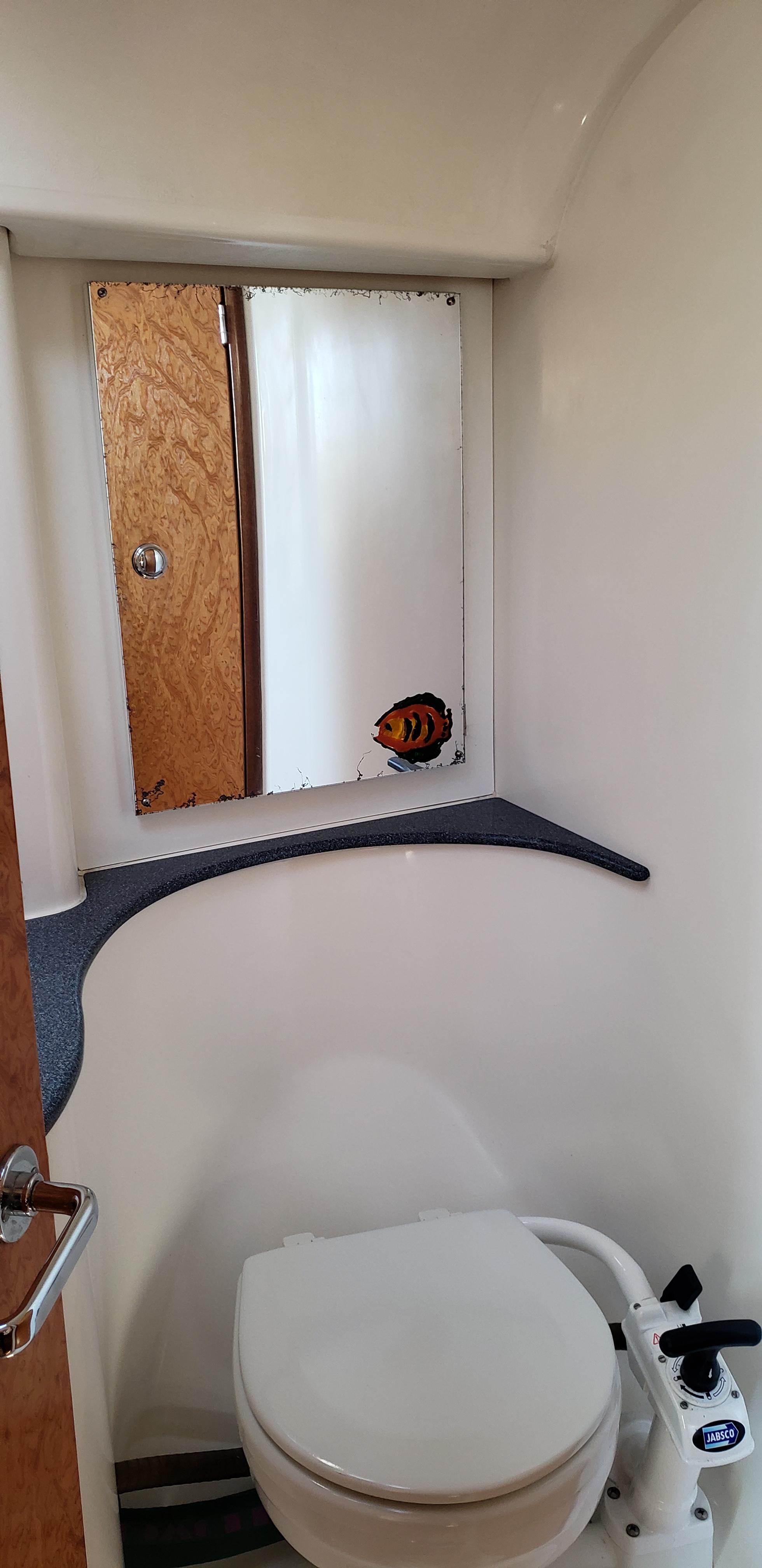The enclosed head has a “Jabsco” manual marine head and a vanity with a round zinc and pressure water. The tap pulls out to make a shower wand. The deckhead has a full surround track for the plastic shower curtain.
