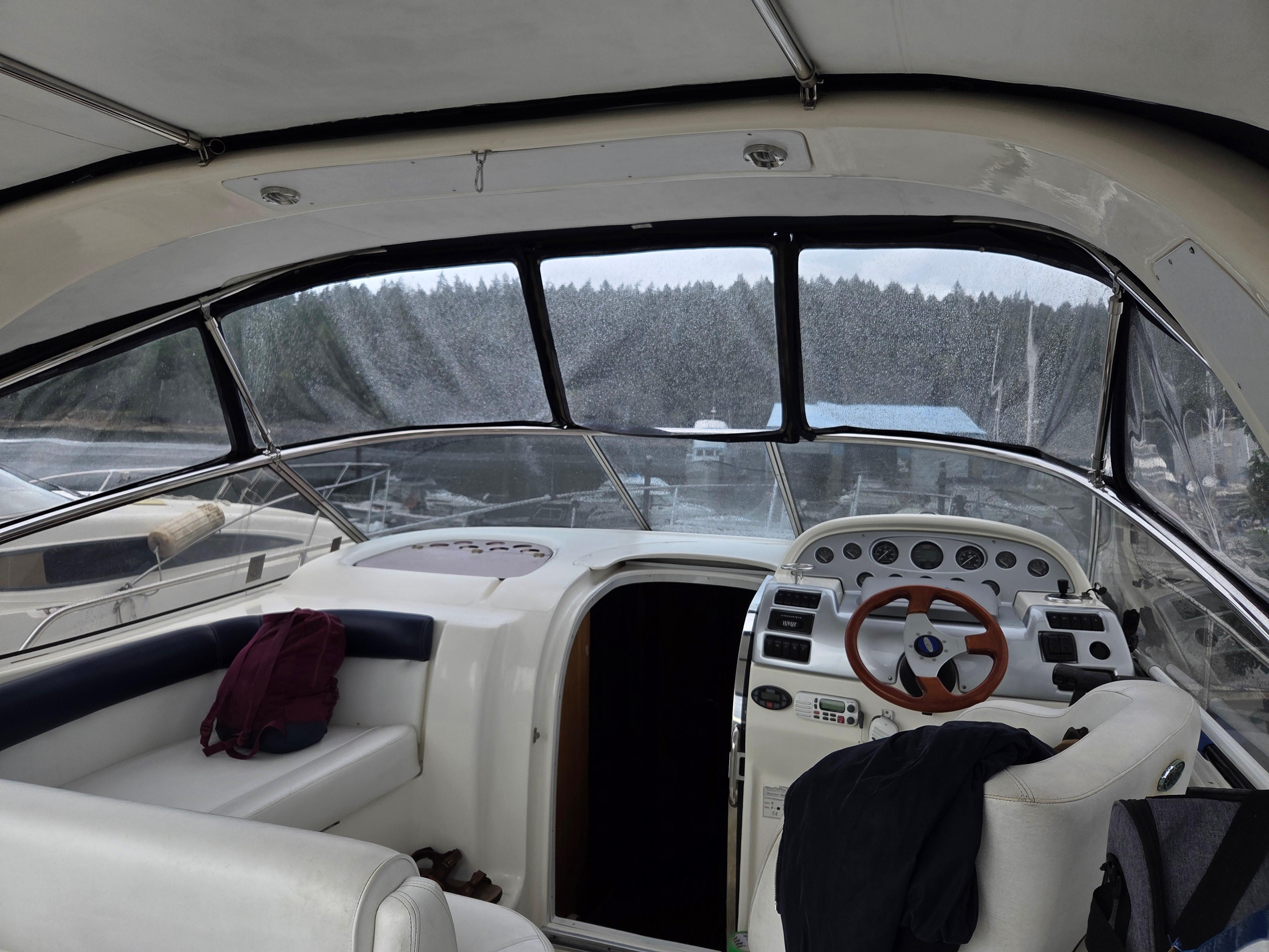 The cockpit and Sunbridge are very nicely appointed with ample vinyl cushions. The cockpit and Sunbridge are fully enclosed by canvas and plastic windows supported on 1" S/S framing and fittings. The forward sloping fiberglass radar arch is used on both sides for support of the enclosure. The enclosure goes all the way to the back to prevent otters from getting into the cockpit.