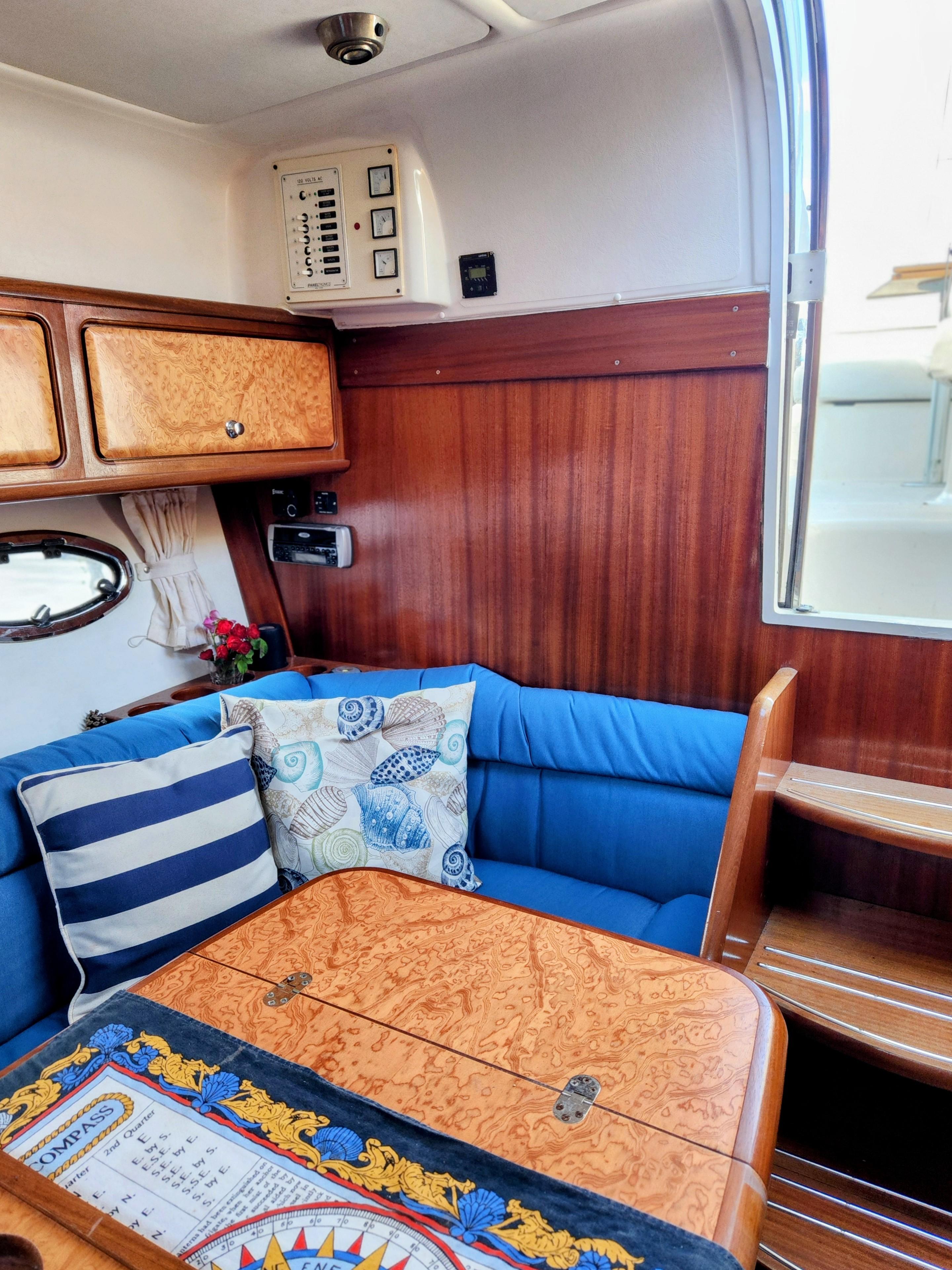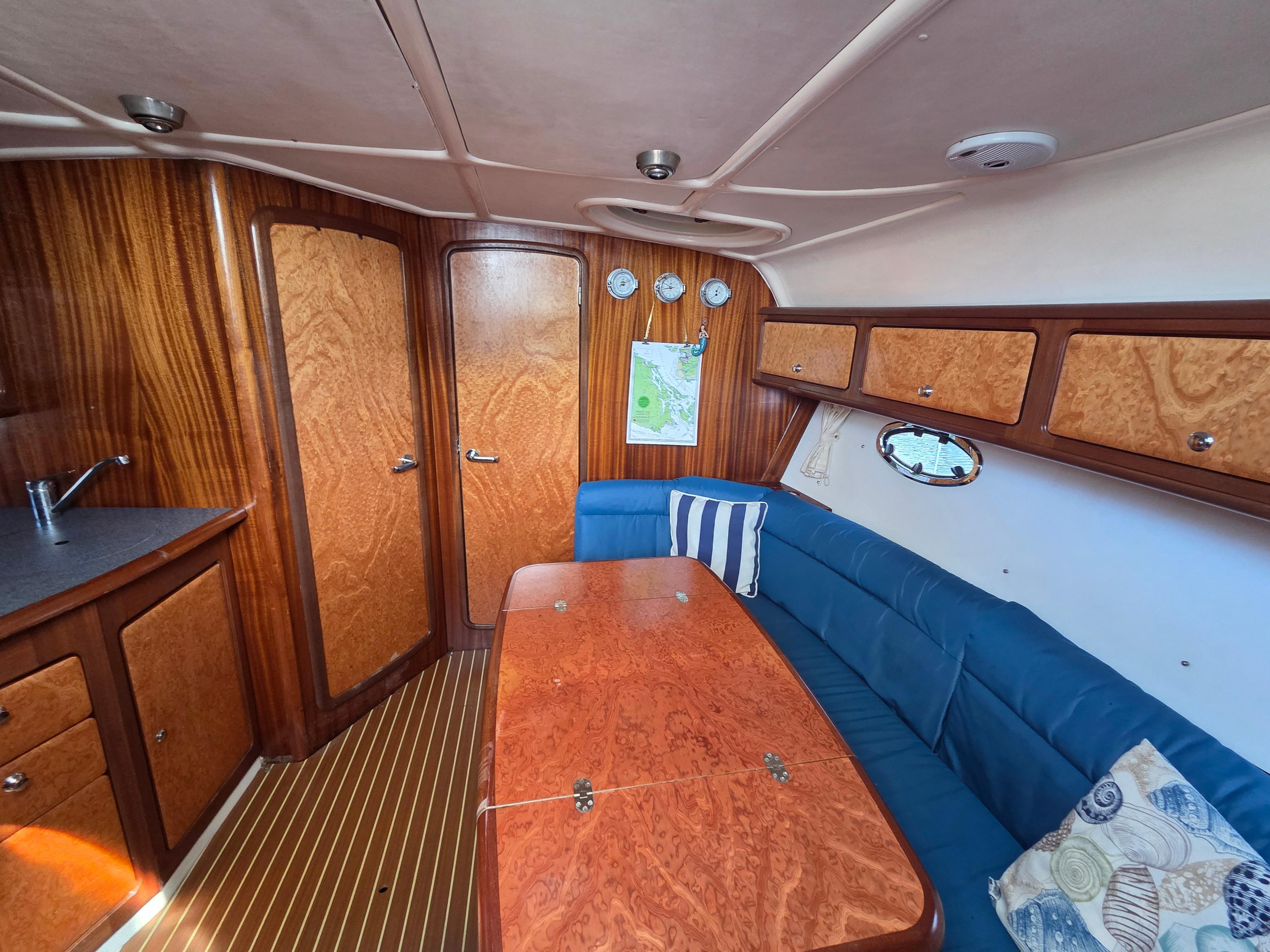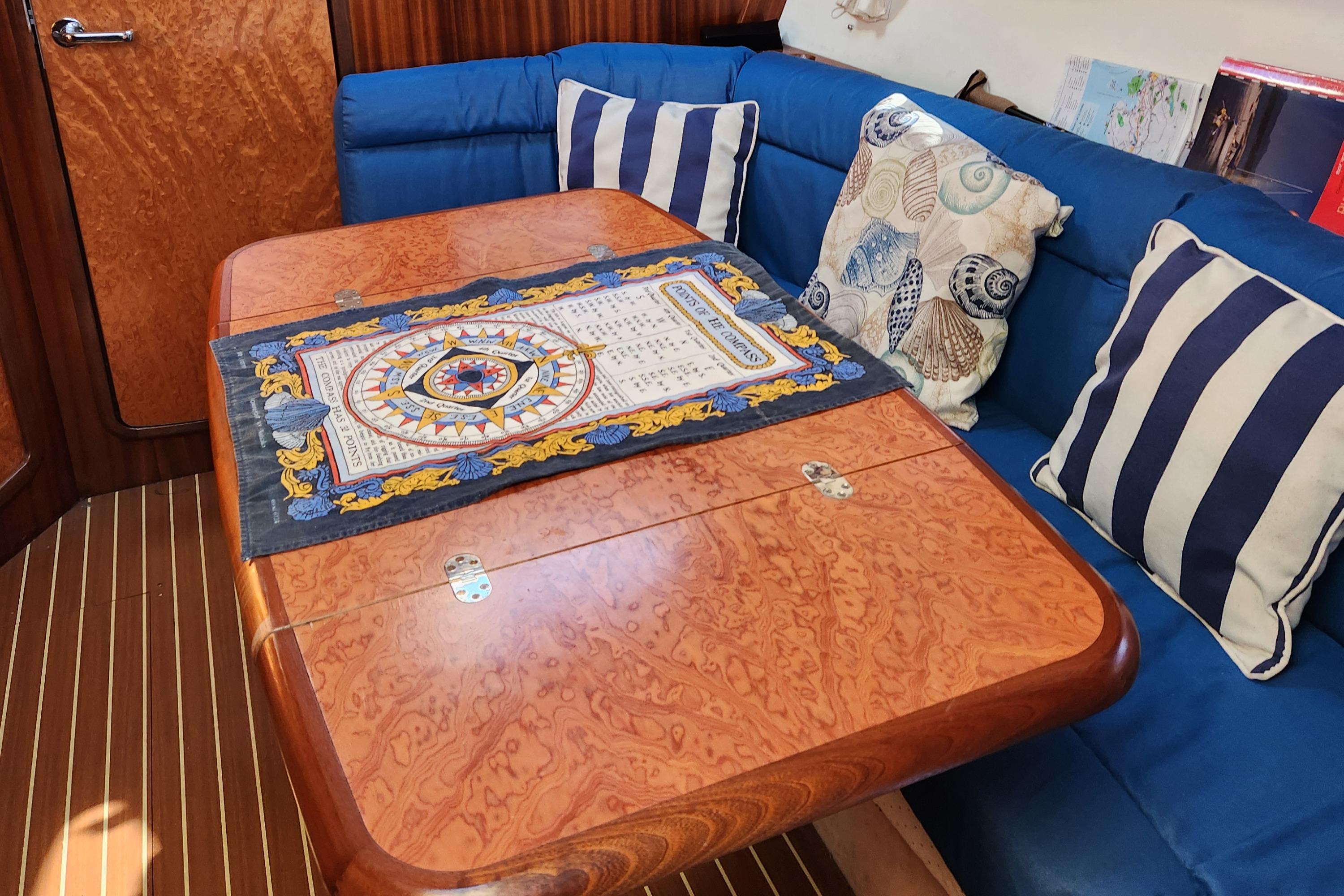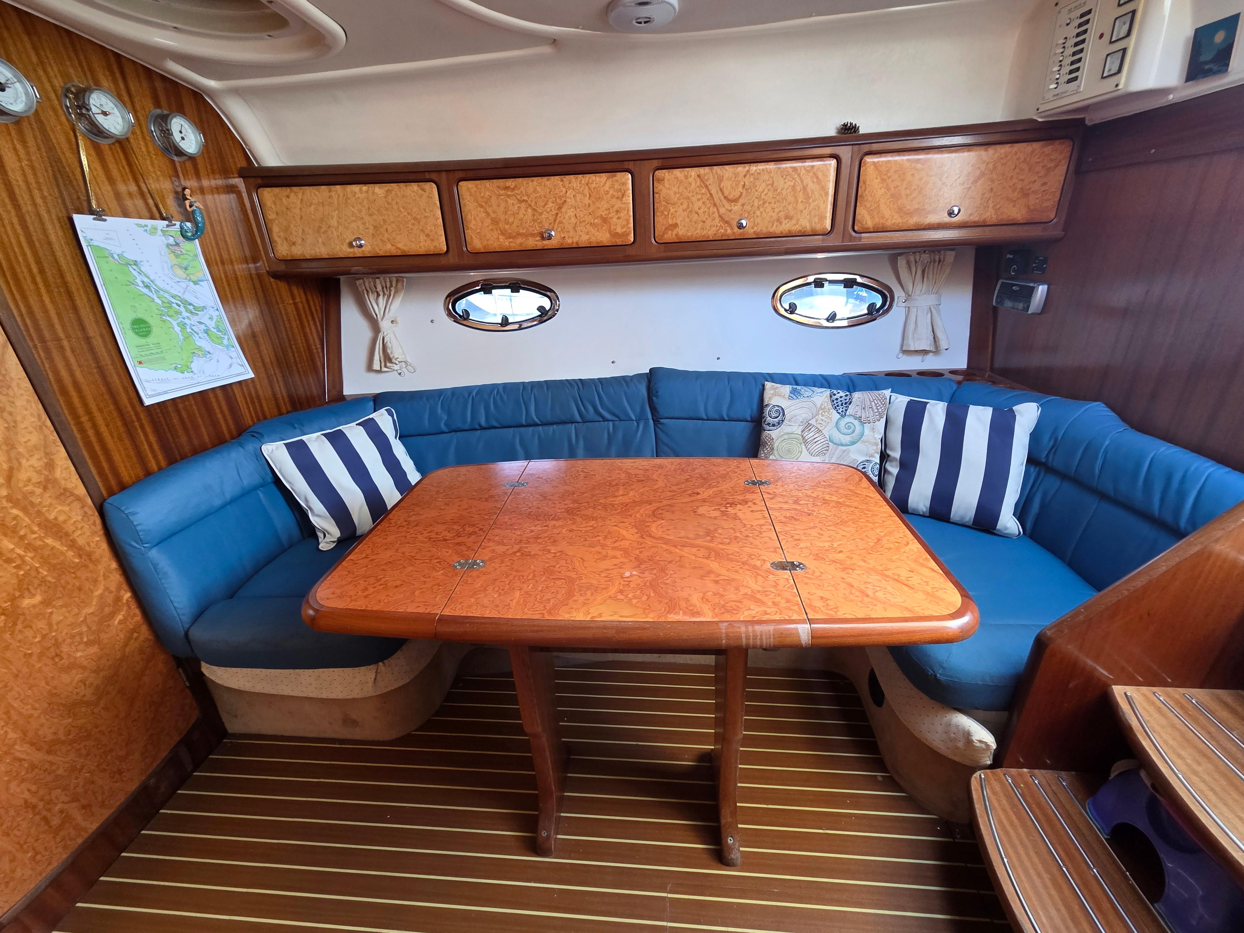 The starboard side of the salon has an U-shaped settee with full stowage under. The aft settee has an outlet from the Espar heater. A pedestal table is located in front of the settee with folding leafs. The table noted minor water damage.