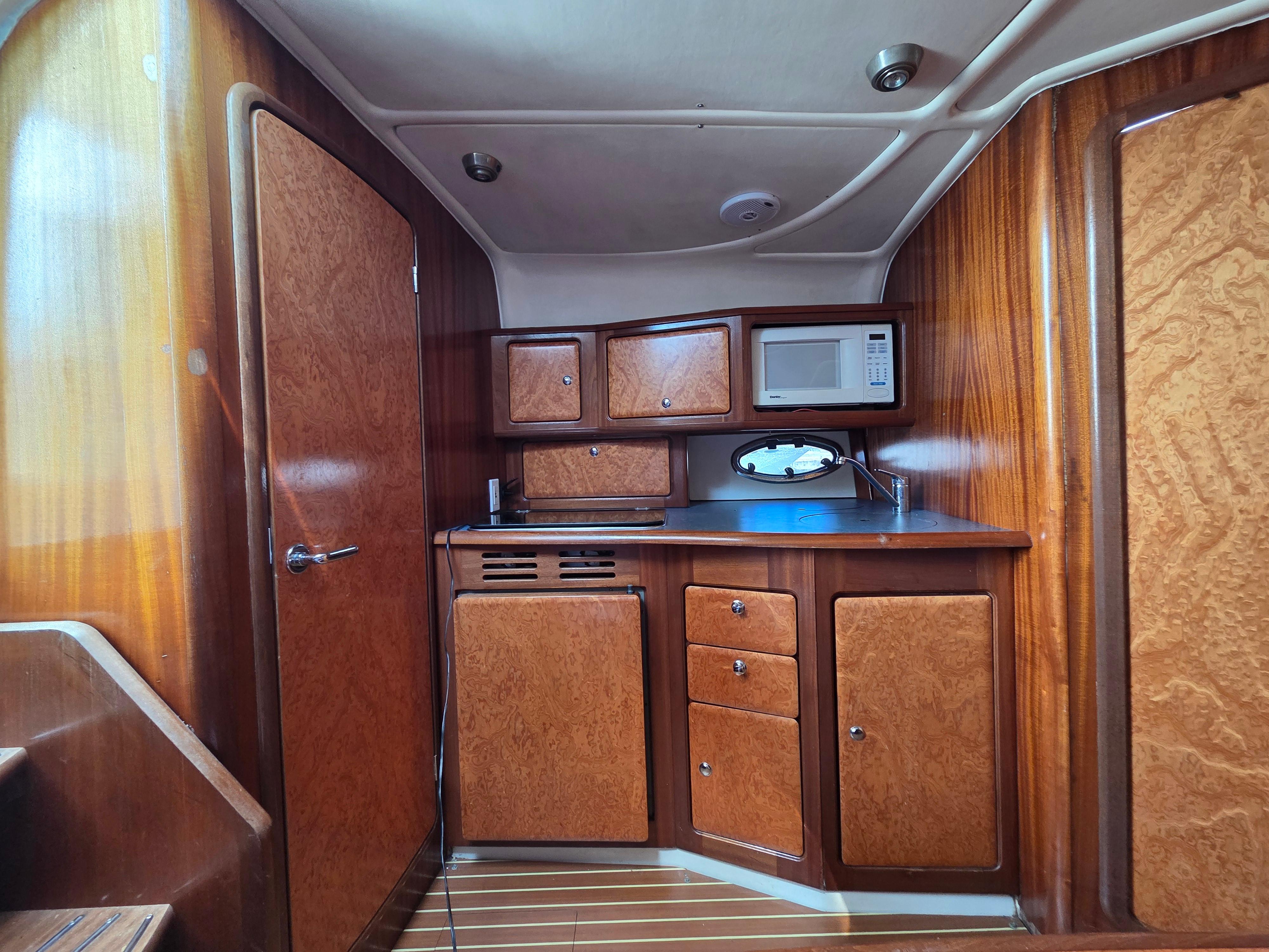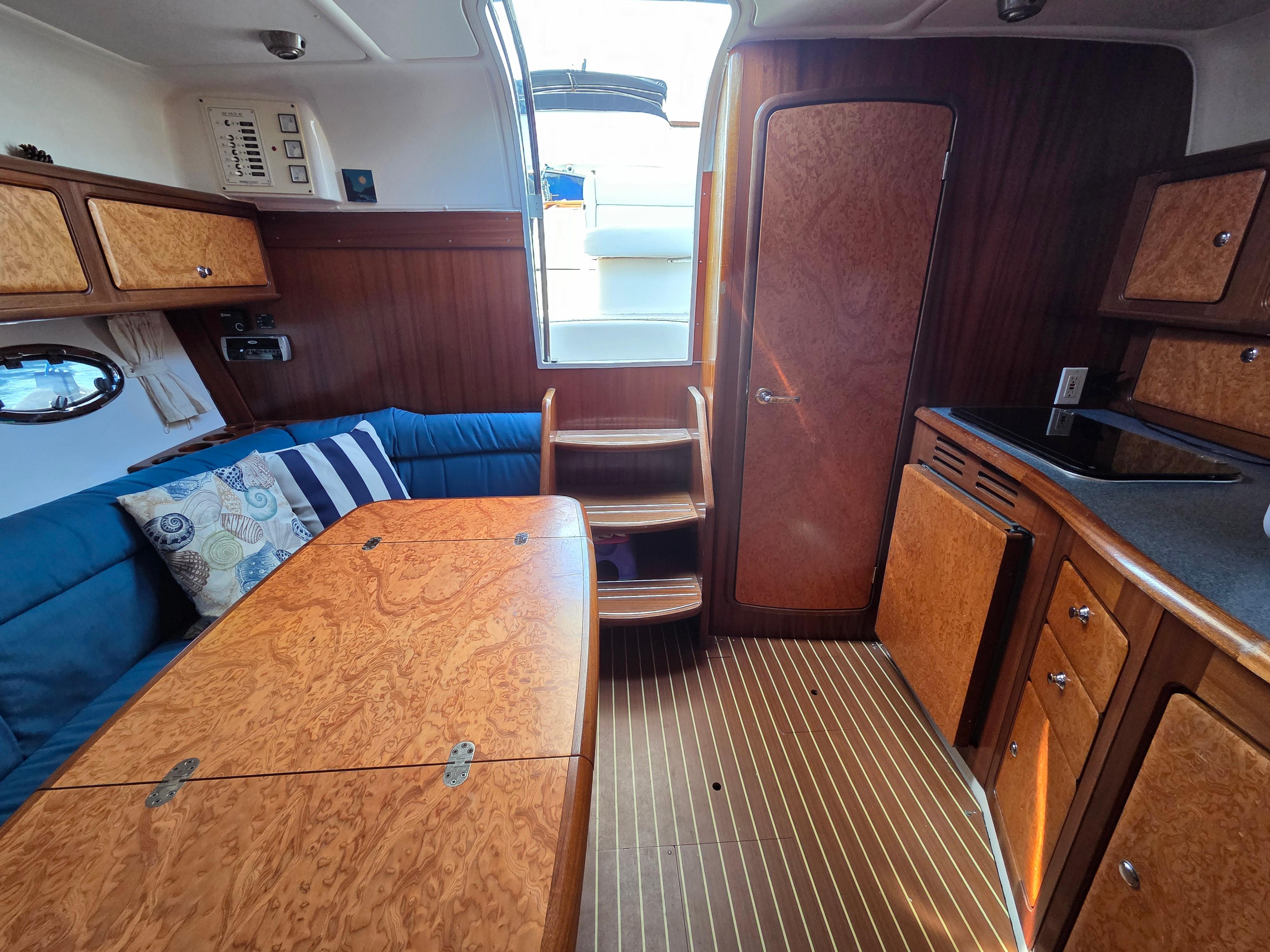 The interior woodwork is a dark sipo finish light with burled walnut cabinet doors and teak and holly laminate flooring provides a rich European Yacht finish.
