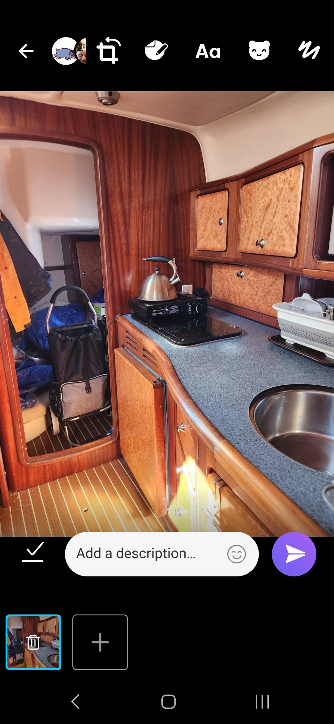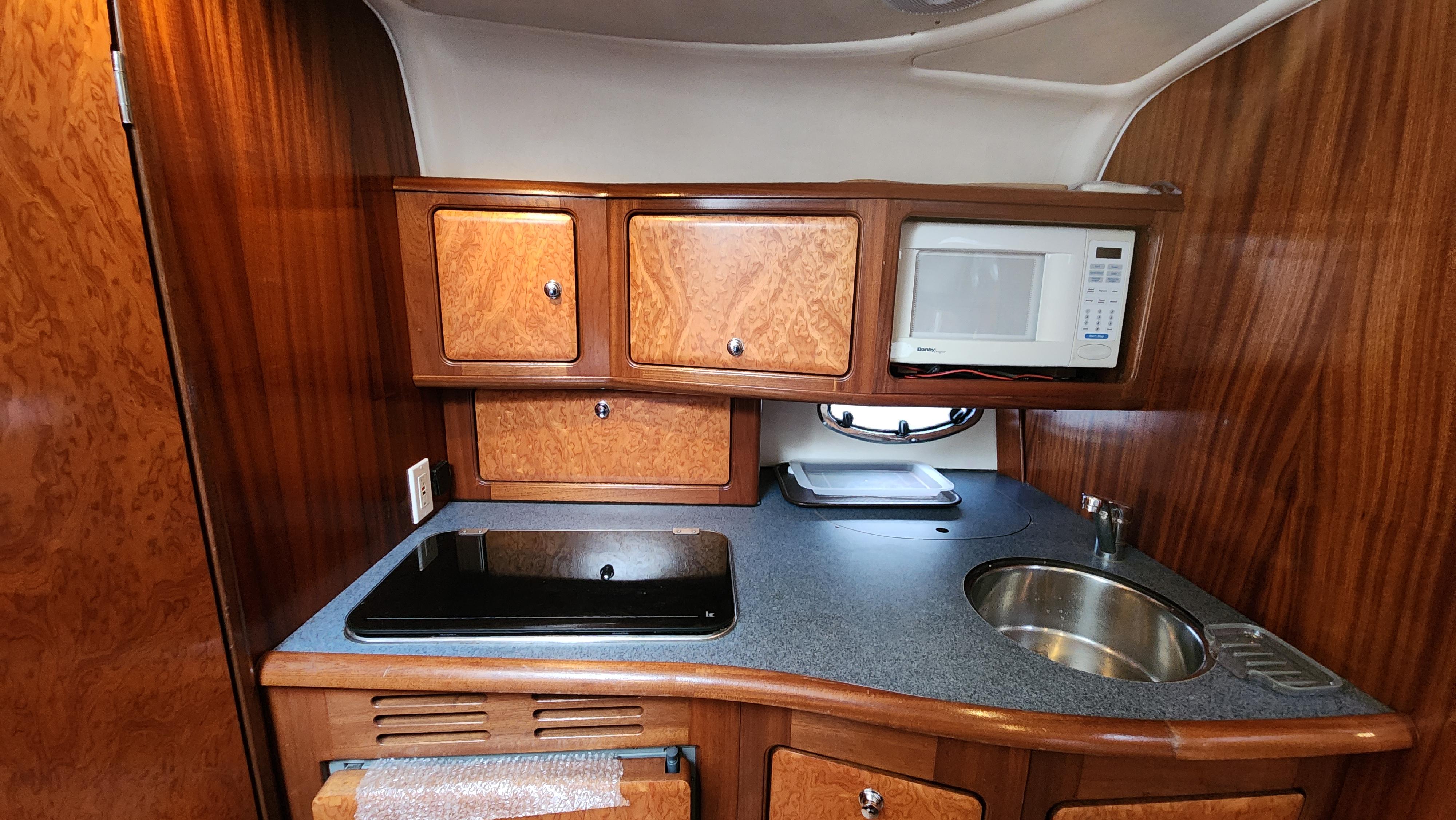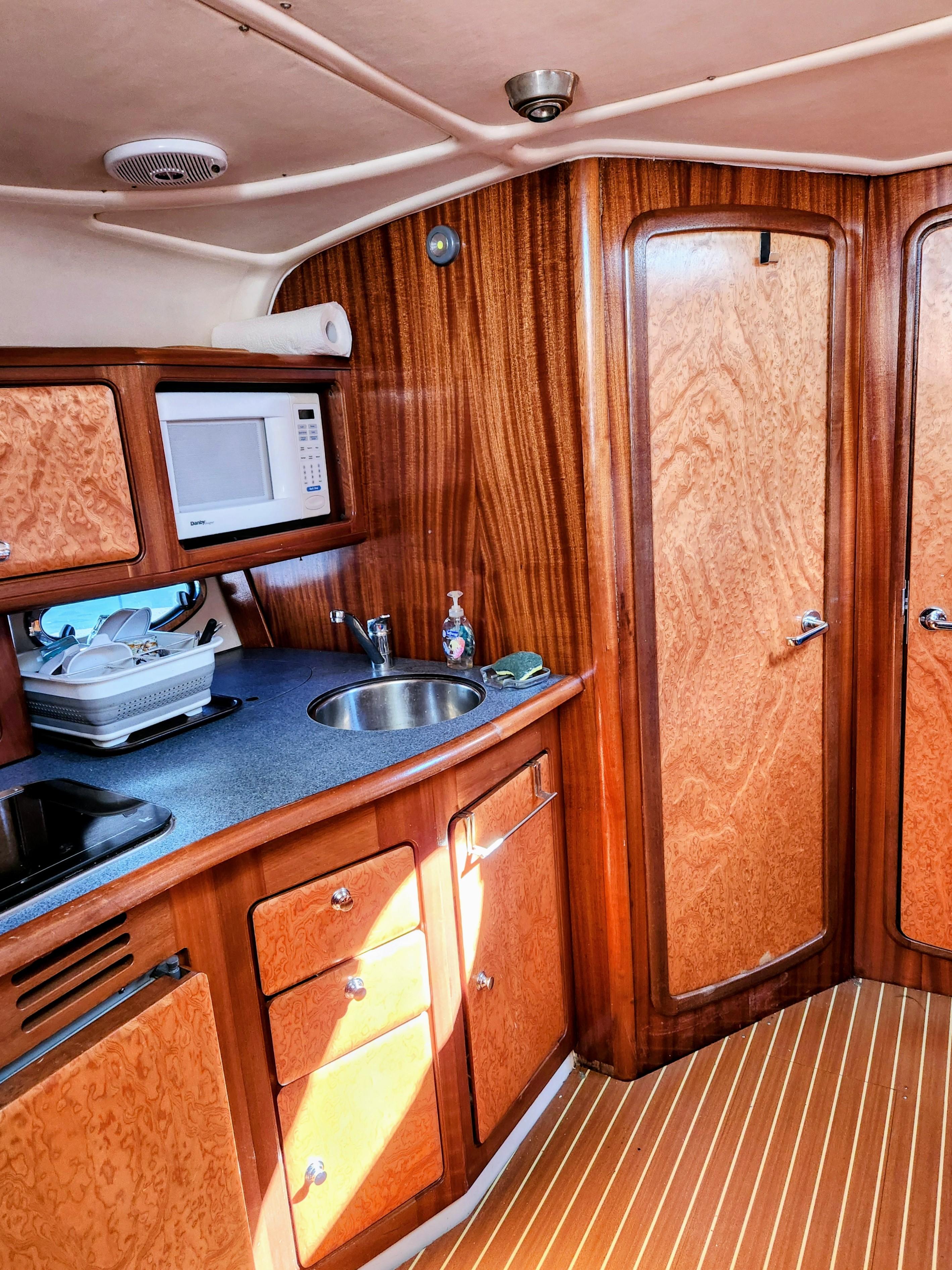 The salon has the galley counter on the port side with an in-counter 2-burner alcohol/electric stove. The counter has the round S/S sink with pressure water. The galley has ample stowage and locker both on the hull side above the counter and below which include the fridge/freezer.