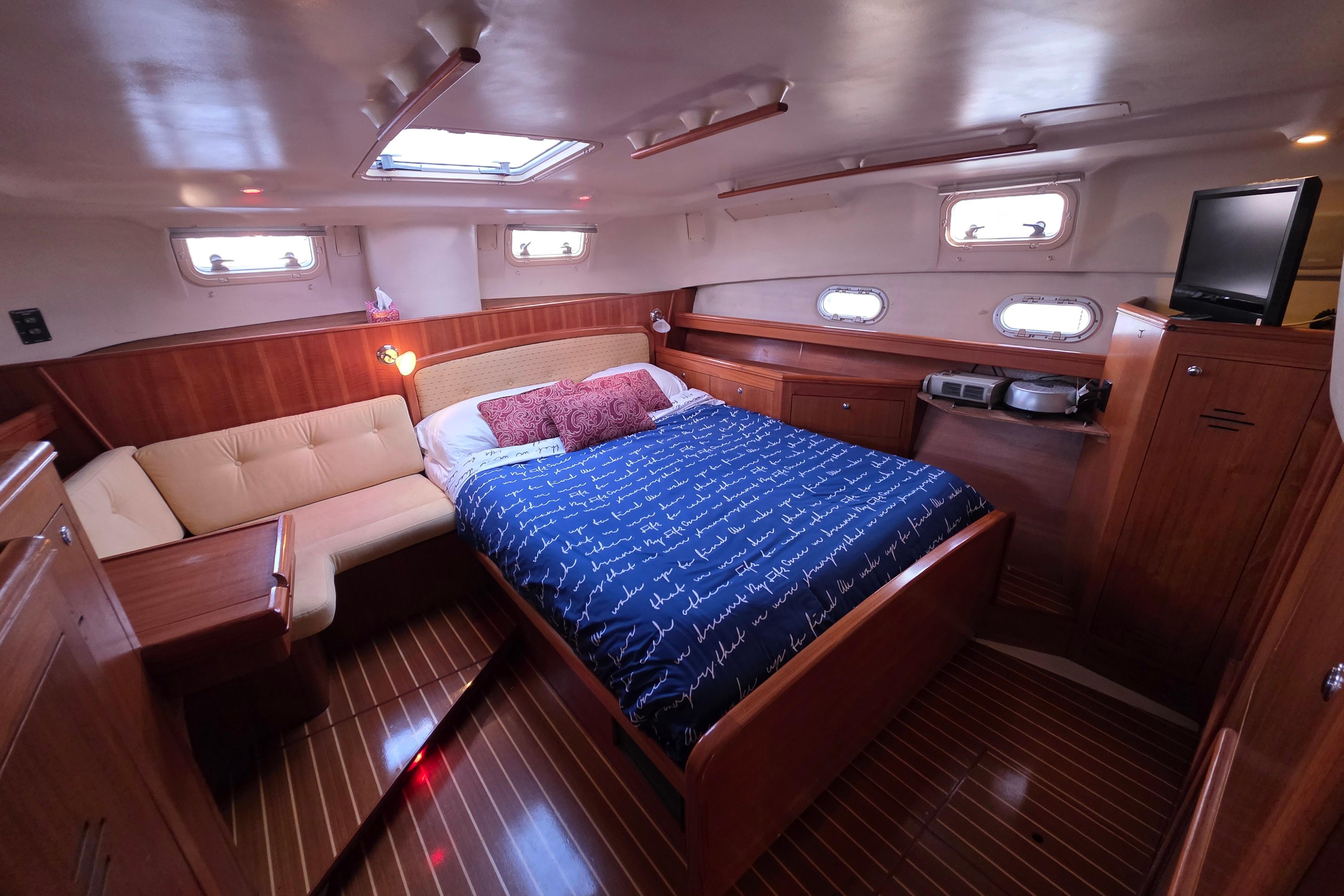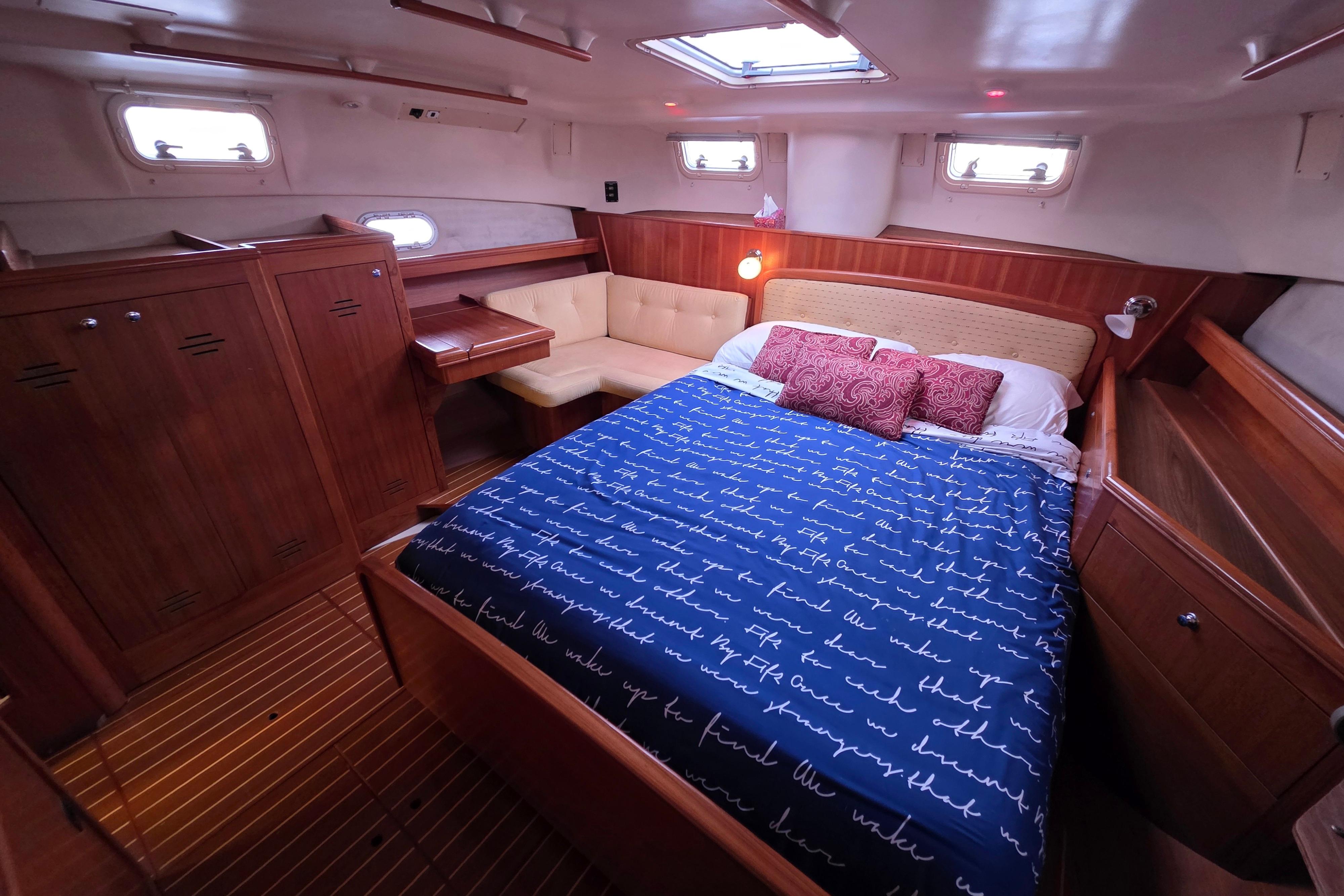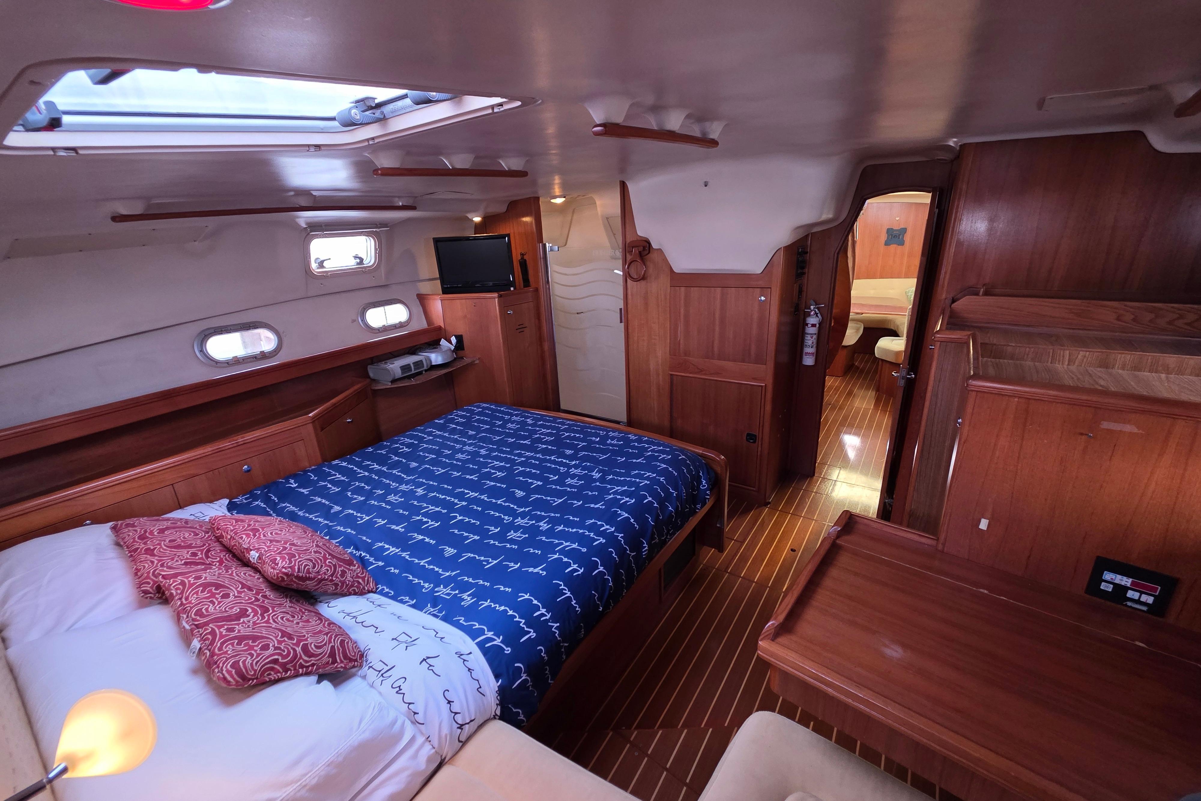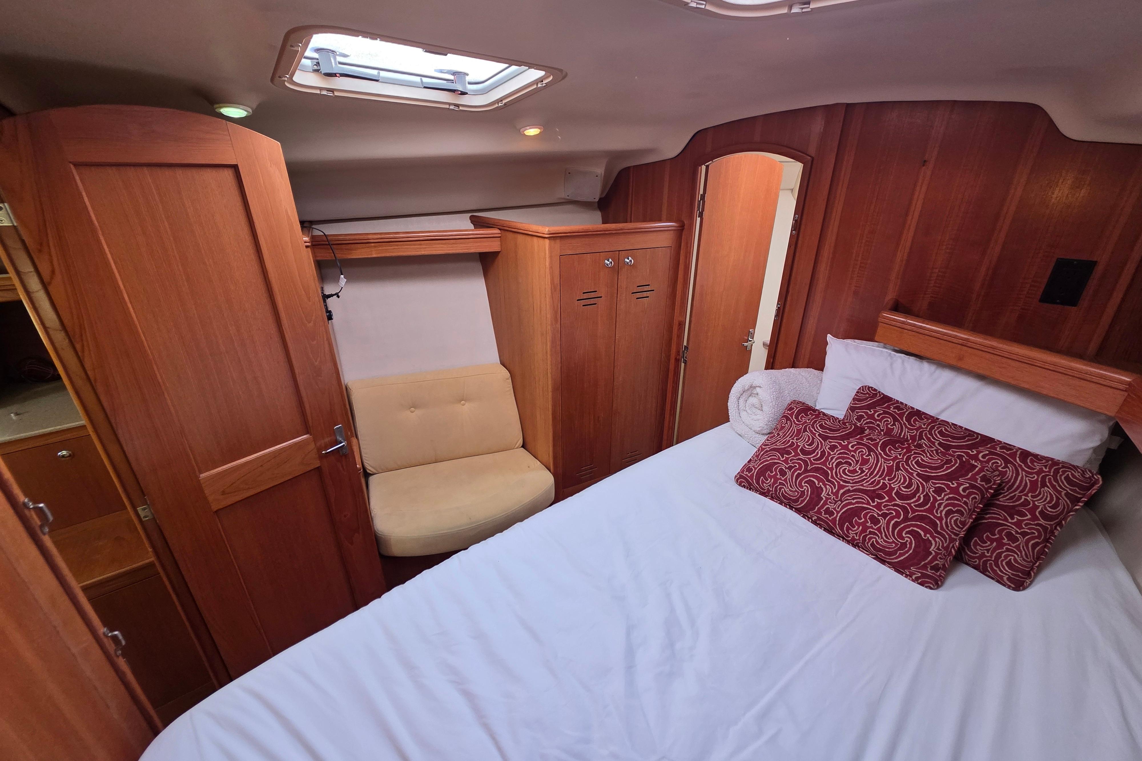 - Owners cabin: A full beam Stateroom, large, bright and very comfortable with lots of natural light
