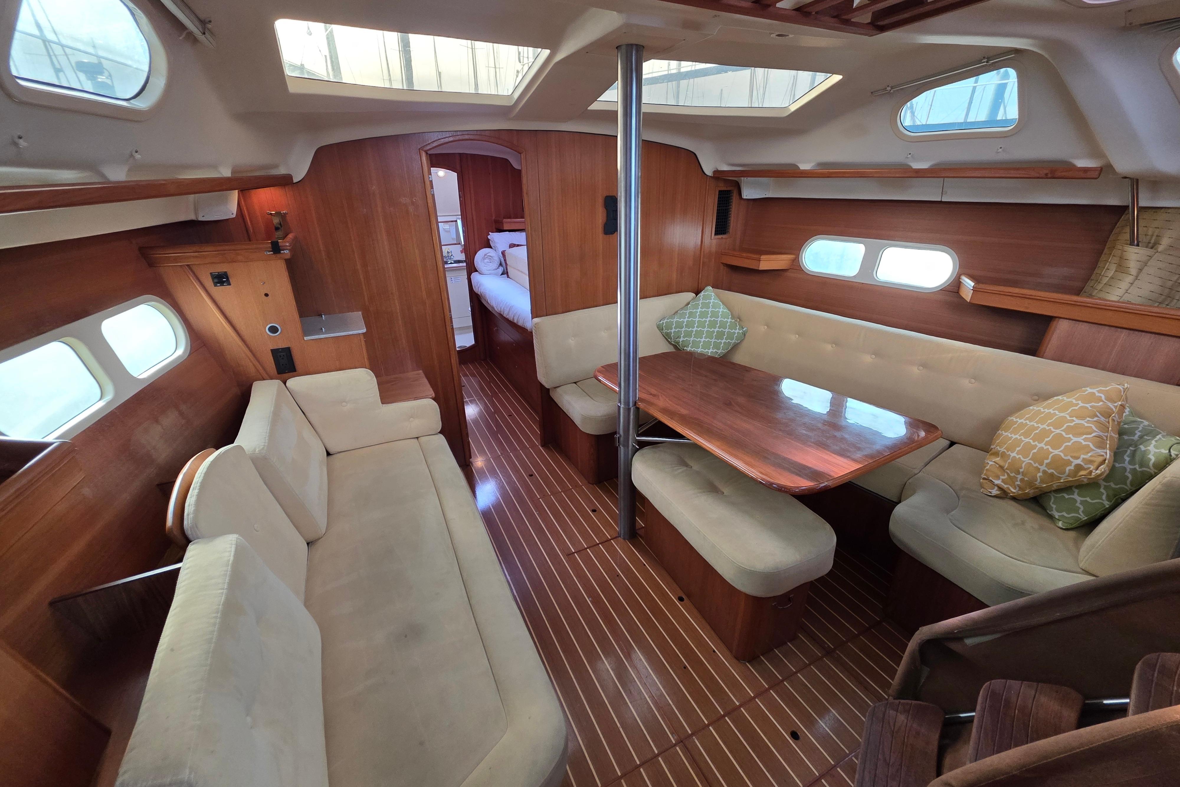 - Salon: L-shaped settee with dinette table to starboard. Table lowers to make a double bed