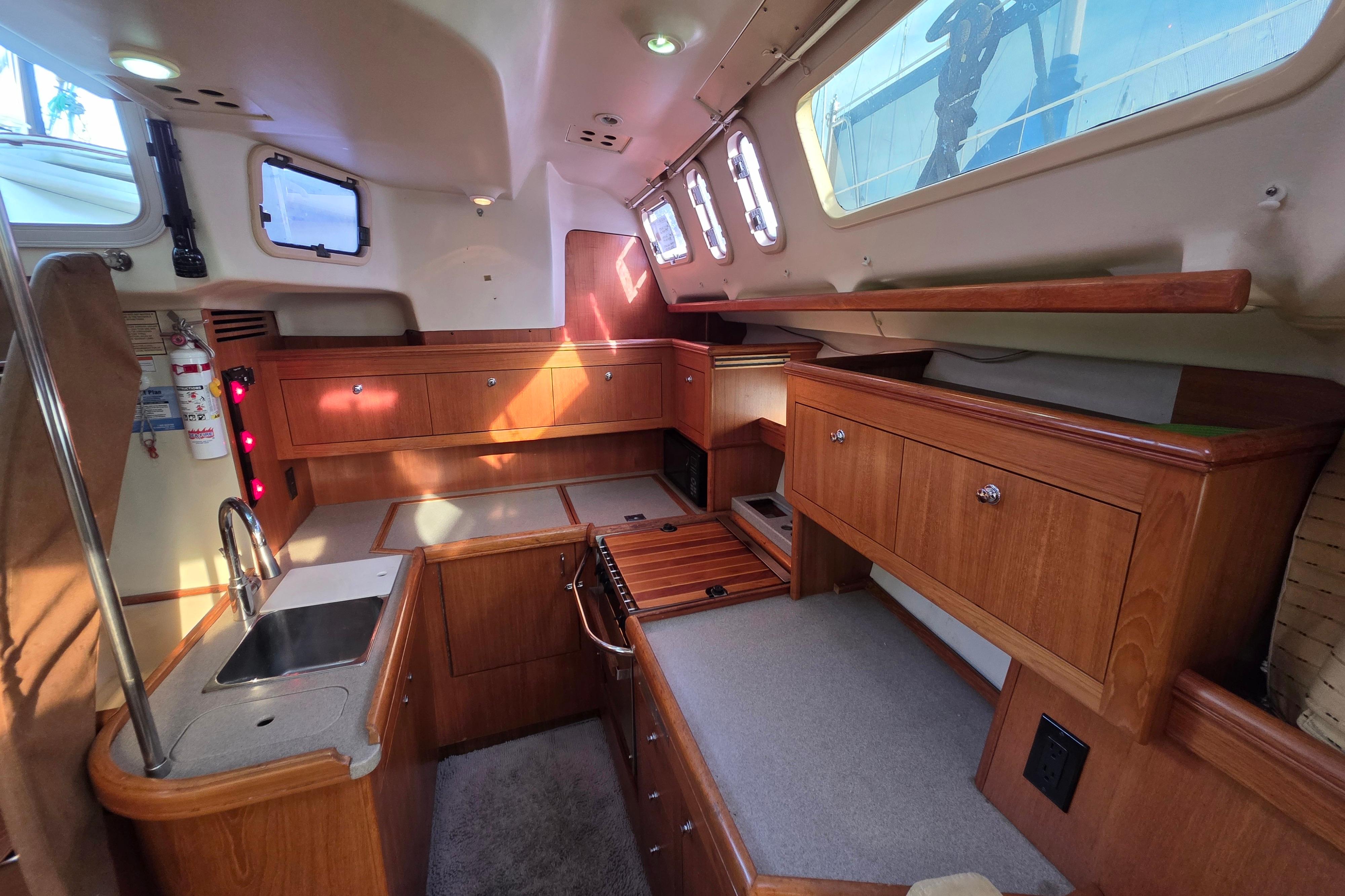 - Large hull side windows and overhead skylights, opening ports for cross ventilation