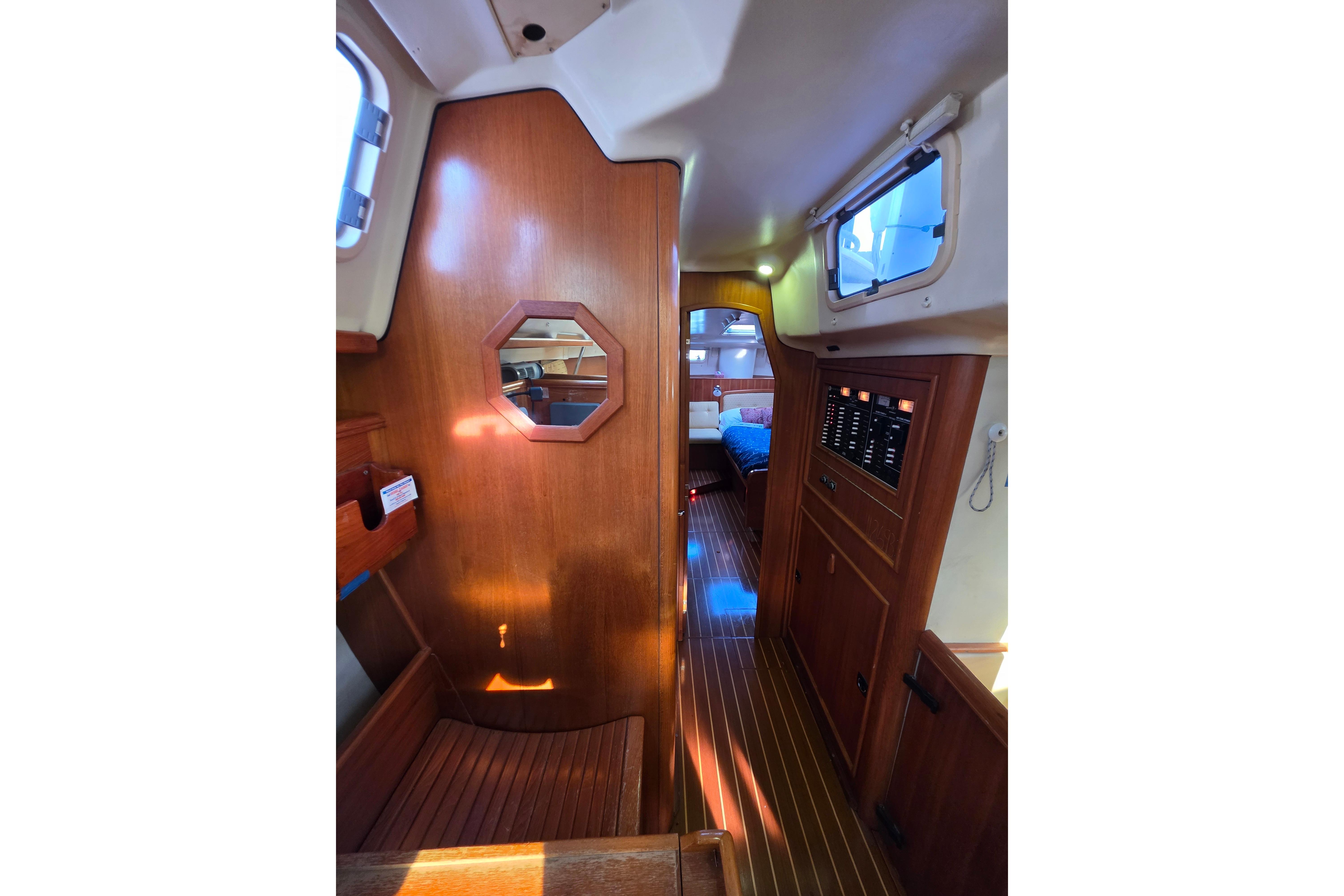 - Easy access at the chart table: Chartplotter, battery monitor, VHF, AC/DC breaker panels