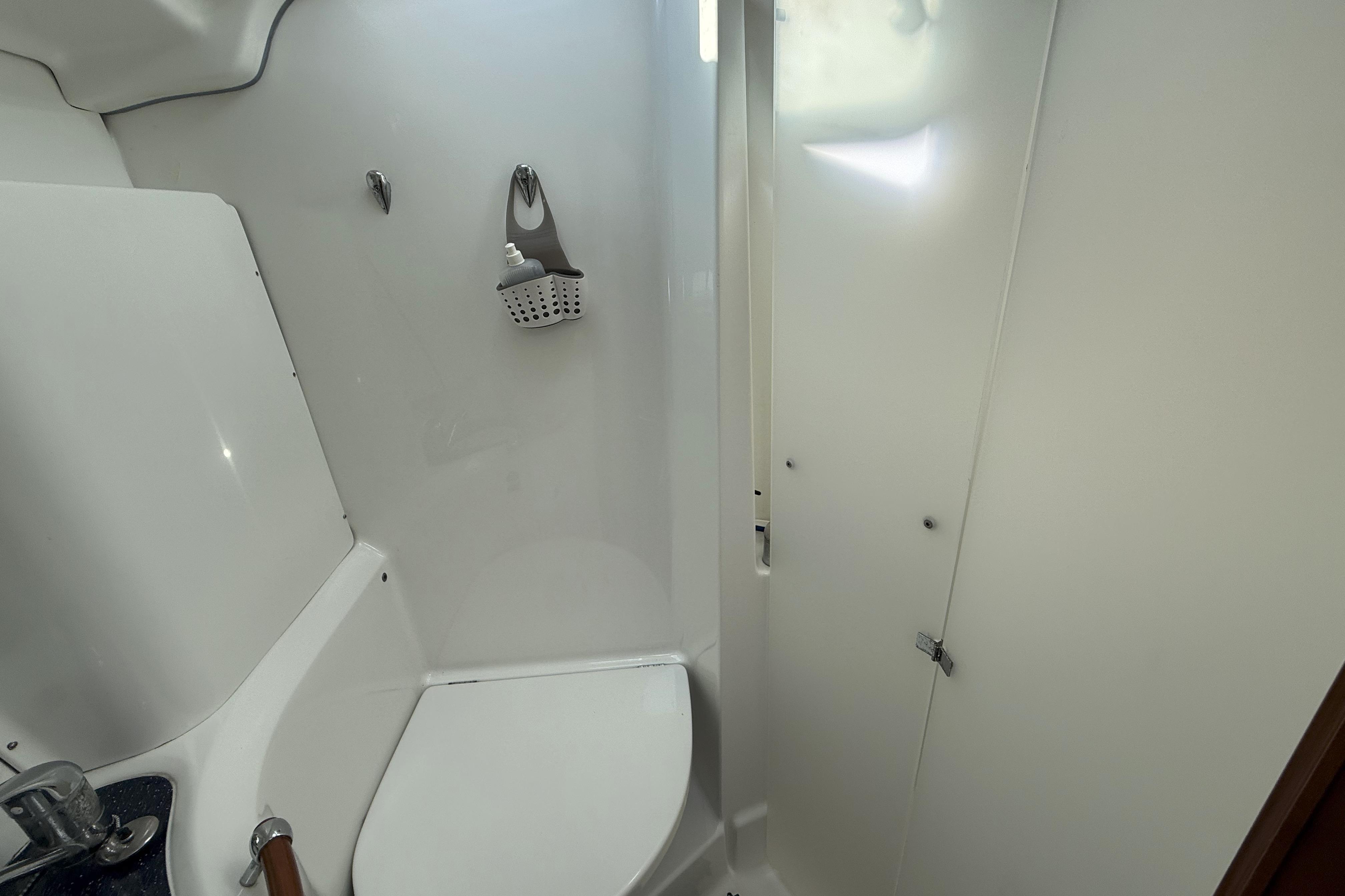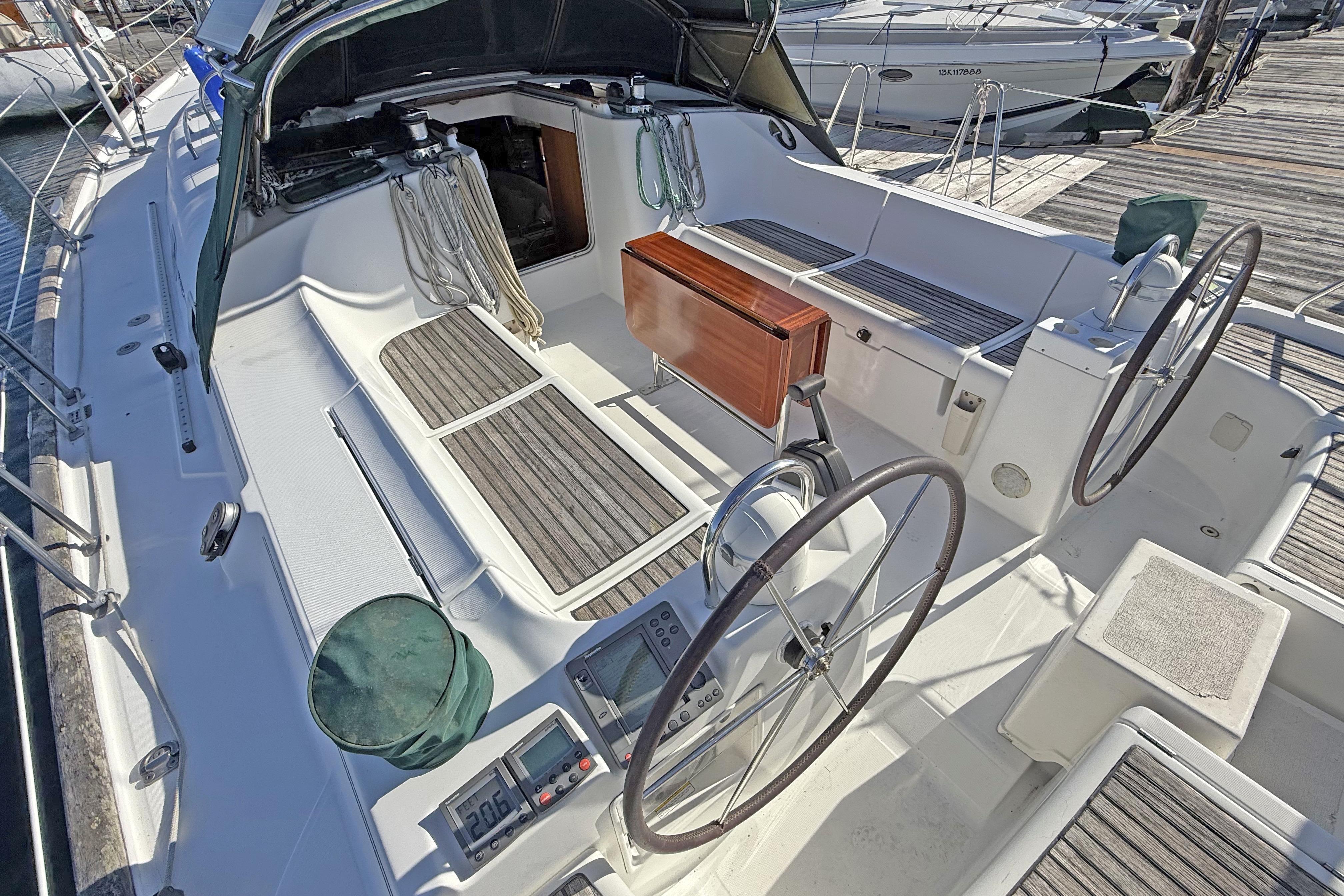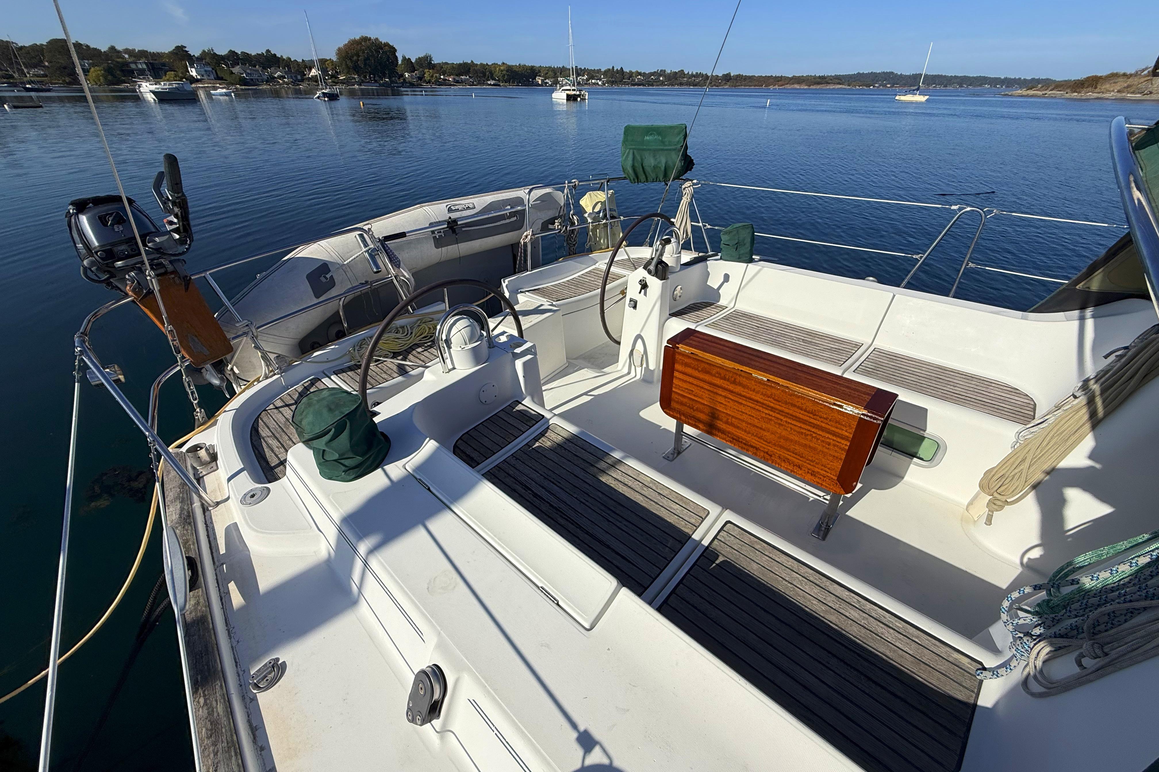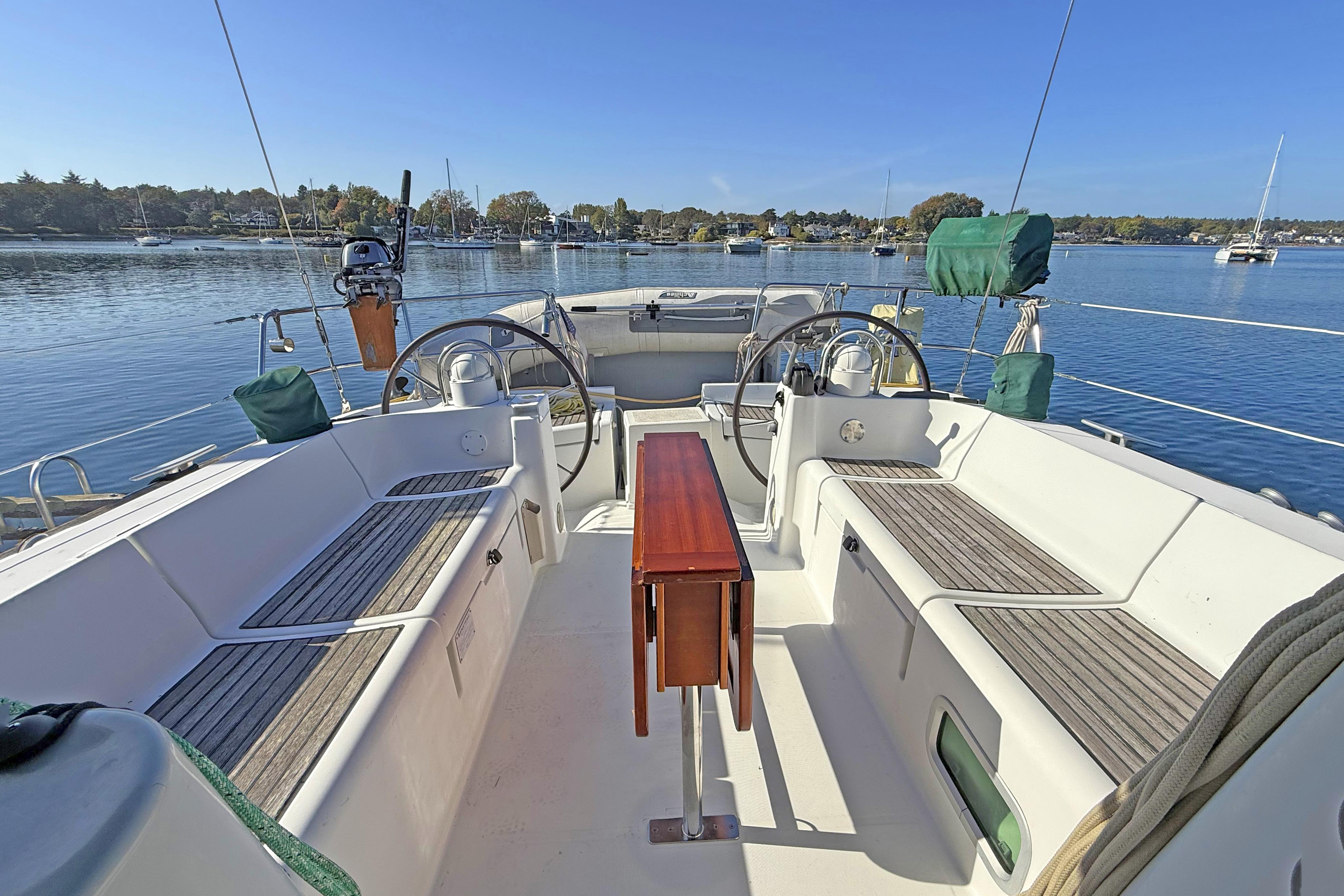Expansive comfortable cockpit with teak on the seats. Easy walkthrough to the swim platform Twin helms – for extra control, great visibility and easy access to the walkthrough stern. Dodger with covers. Clear panels replaced 2024 “Like new” cockpit cushions Large cockpit table with cover Outdoor shower