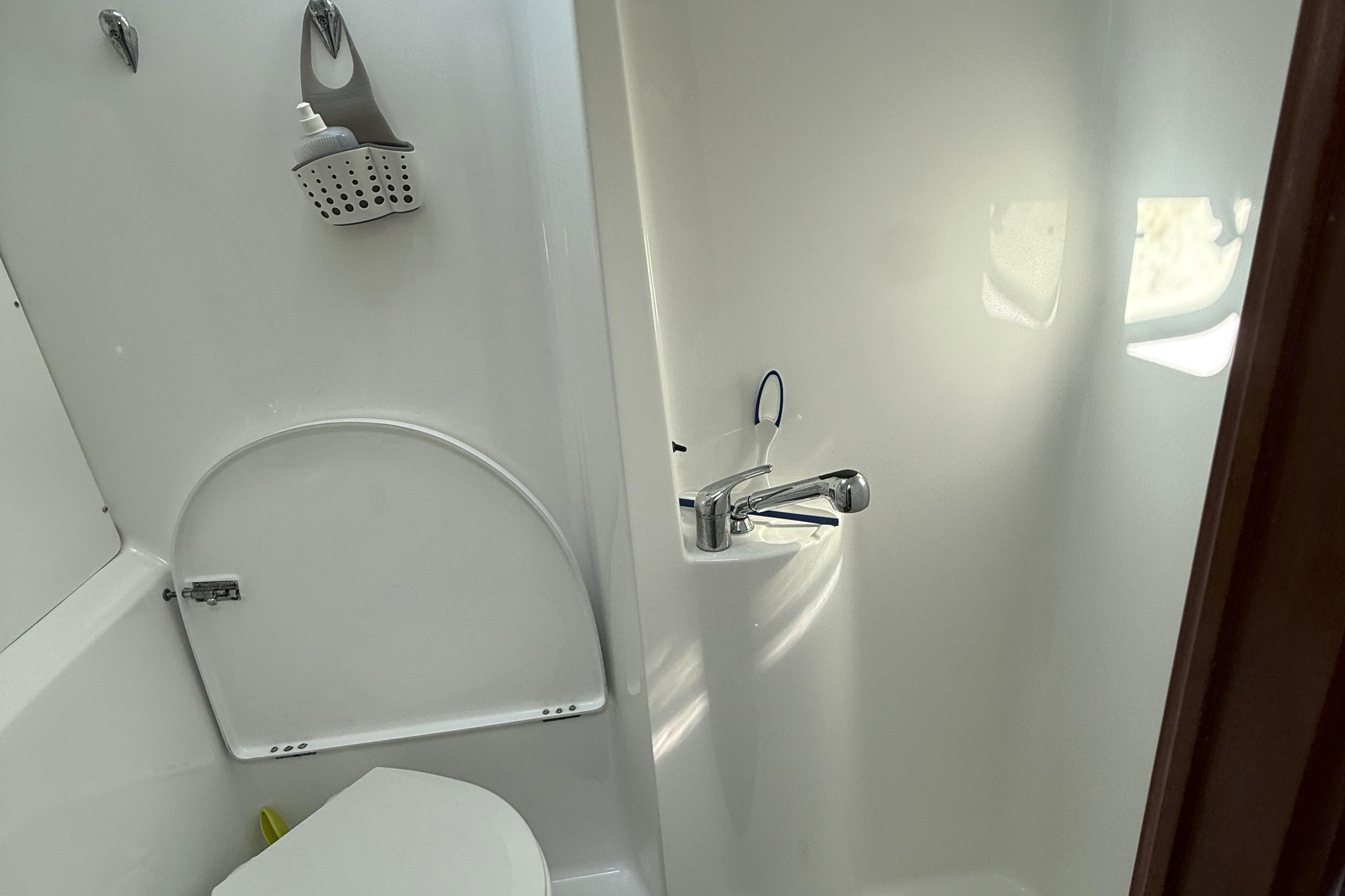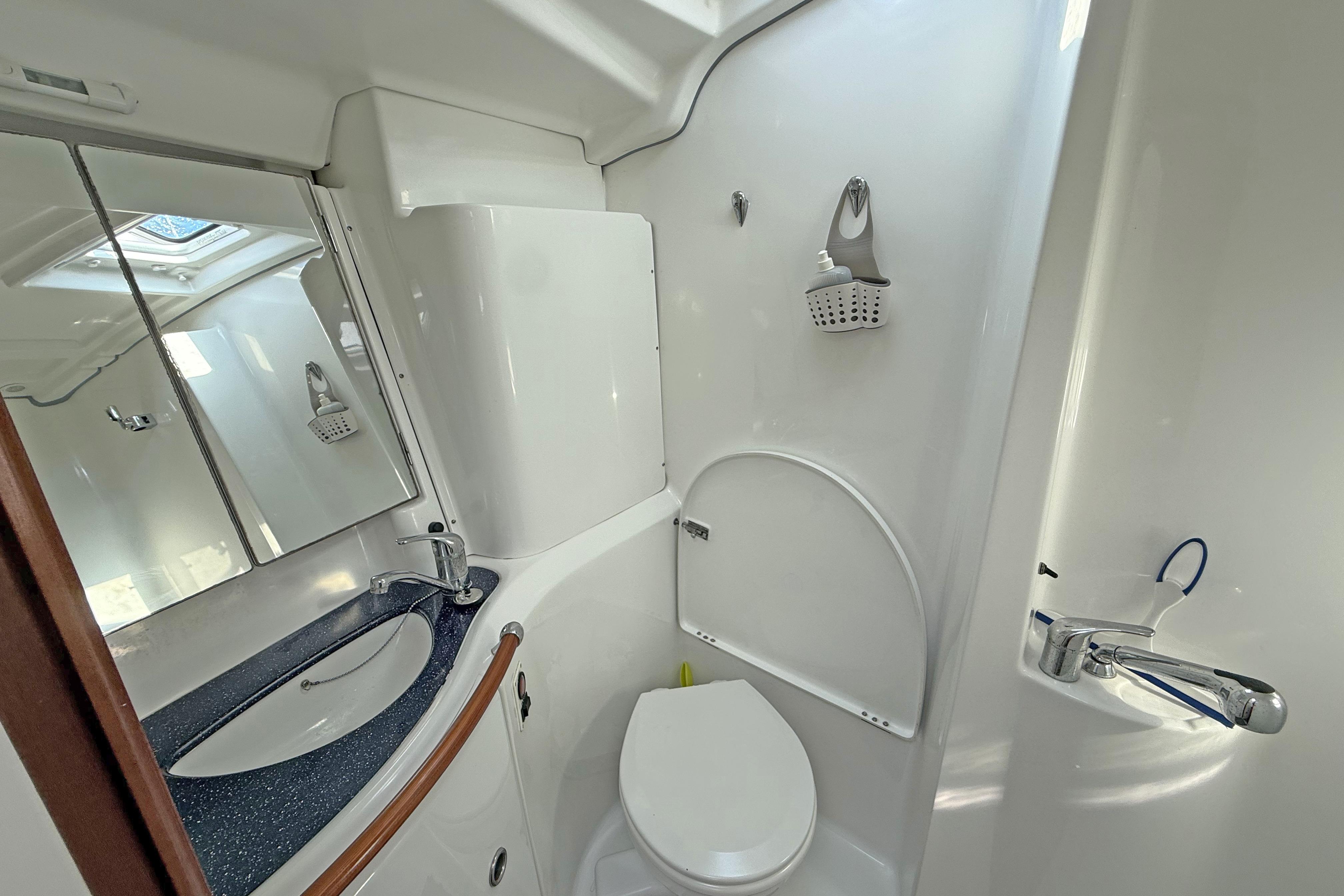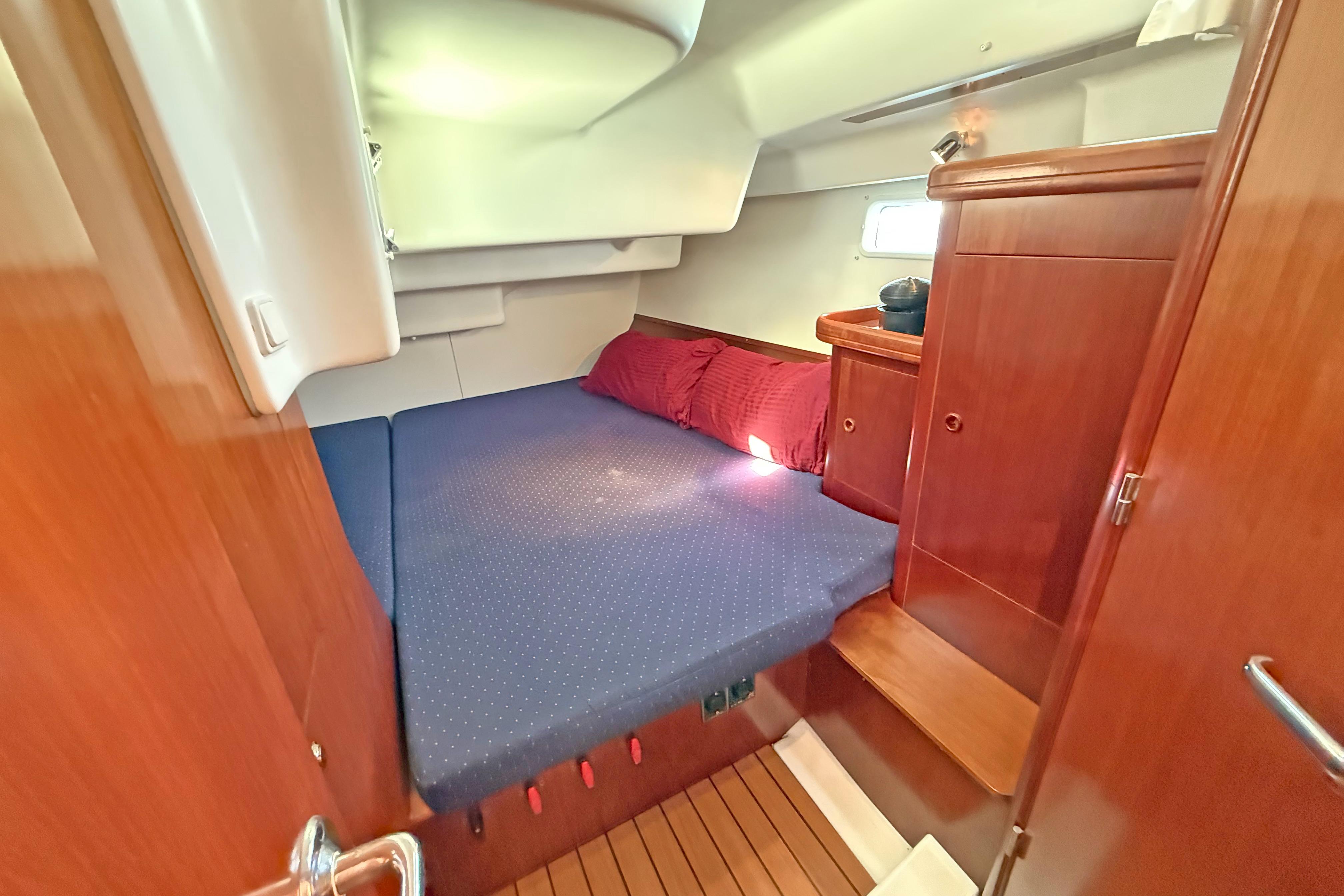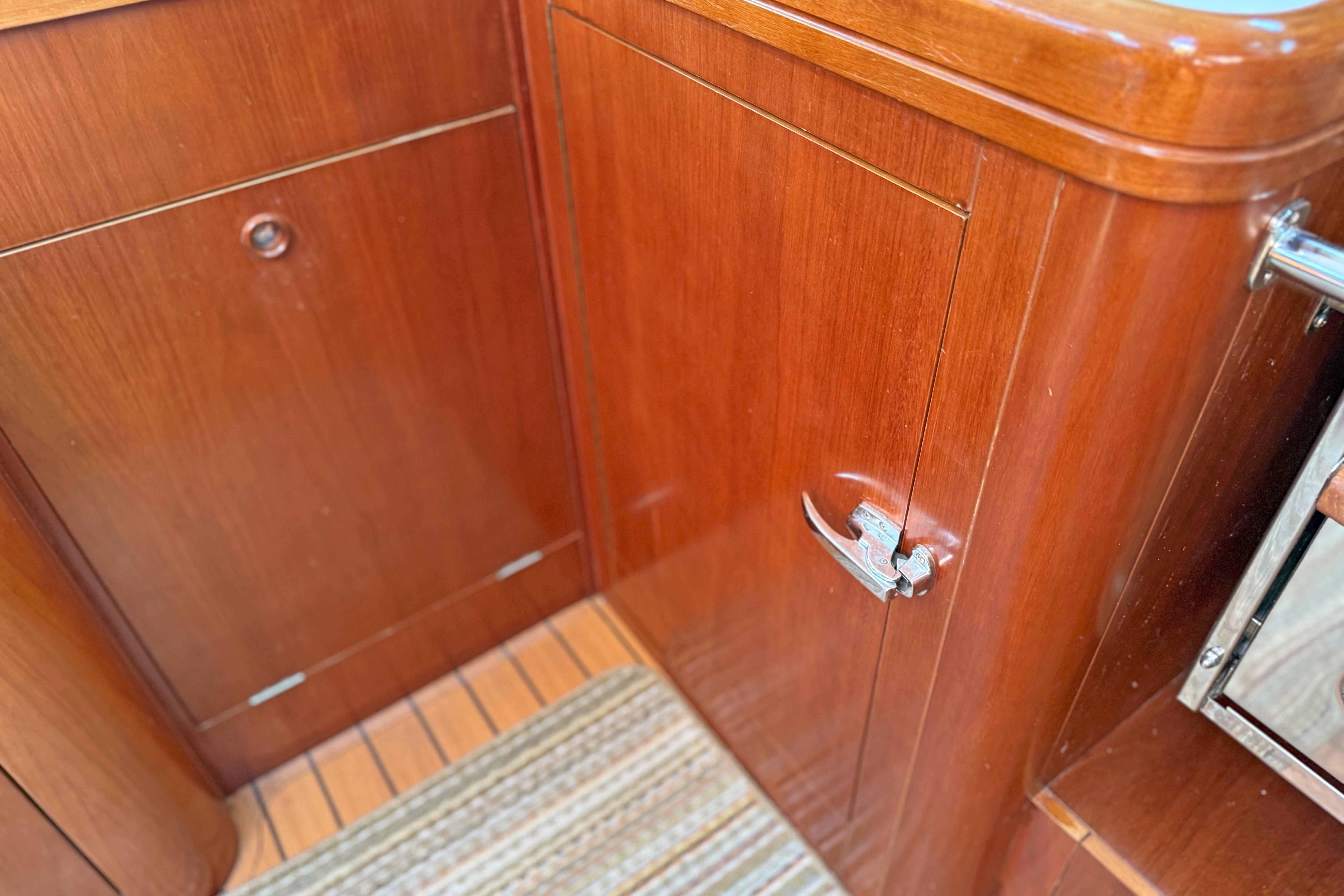 Two cabin, two head boat with an additional berth possible in the saloon. One enters the saloon and the large, seaworthy galley is to starboard To port is the large forward facing chart table with radar, VHF and multifunction display at hand. Aft of the galley is a massive storage area – definitely a benefit of the two-cabin version ! The saloon features a large settee and table to port. Seating for eight. Saloon table converts to another king-sized guest berth or an excellent place to watch the mounted television. The port settee also converts to a single berth. The large owner’s cabin is all the way forward with queen-sized partial walkaround bed, private sitting area, and extensive storage. Private ensuite head with separate shower area. Electric head. Fold down seat for rough weather showering offshore. All the way aft is the guest cabin with a king-sized bed and lots of storge space. Private access to the aft head. The guest head is conveniently near the companionway stairs with easy access to the saloon or the guest cabin. Excellent natural light and ventilation throughout. Extensive storage in all areas of the boat. Interior upholstery and woodwork in excellent condition. Total sleep accommodation for seven people ! Most lights converted to energy saving LED. Screens for all windows