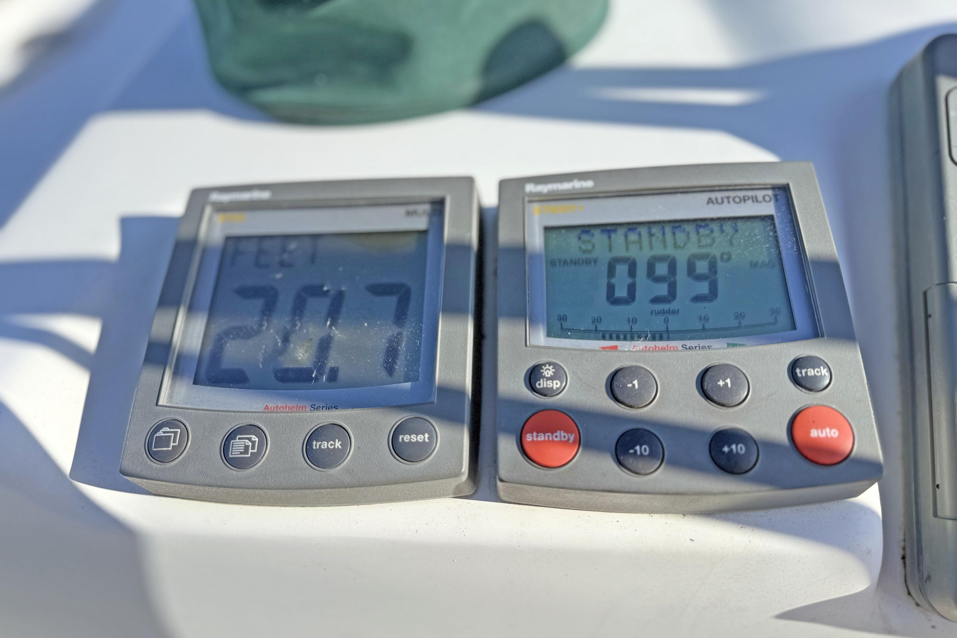 Garmin anemometer (2022) Garmin instruments – starboard side of cockpit (2022) Raymarine ST60 Multi port side Raymarine ST60 Autopilot – port side Raymarine ST60 Multi at chart table Raymarine RC520 – cockpit Raymarine RL70C Pathfinder radar at chart table. Standard Horizon VHF Matrix with DSC (2023)