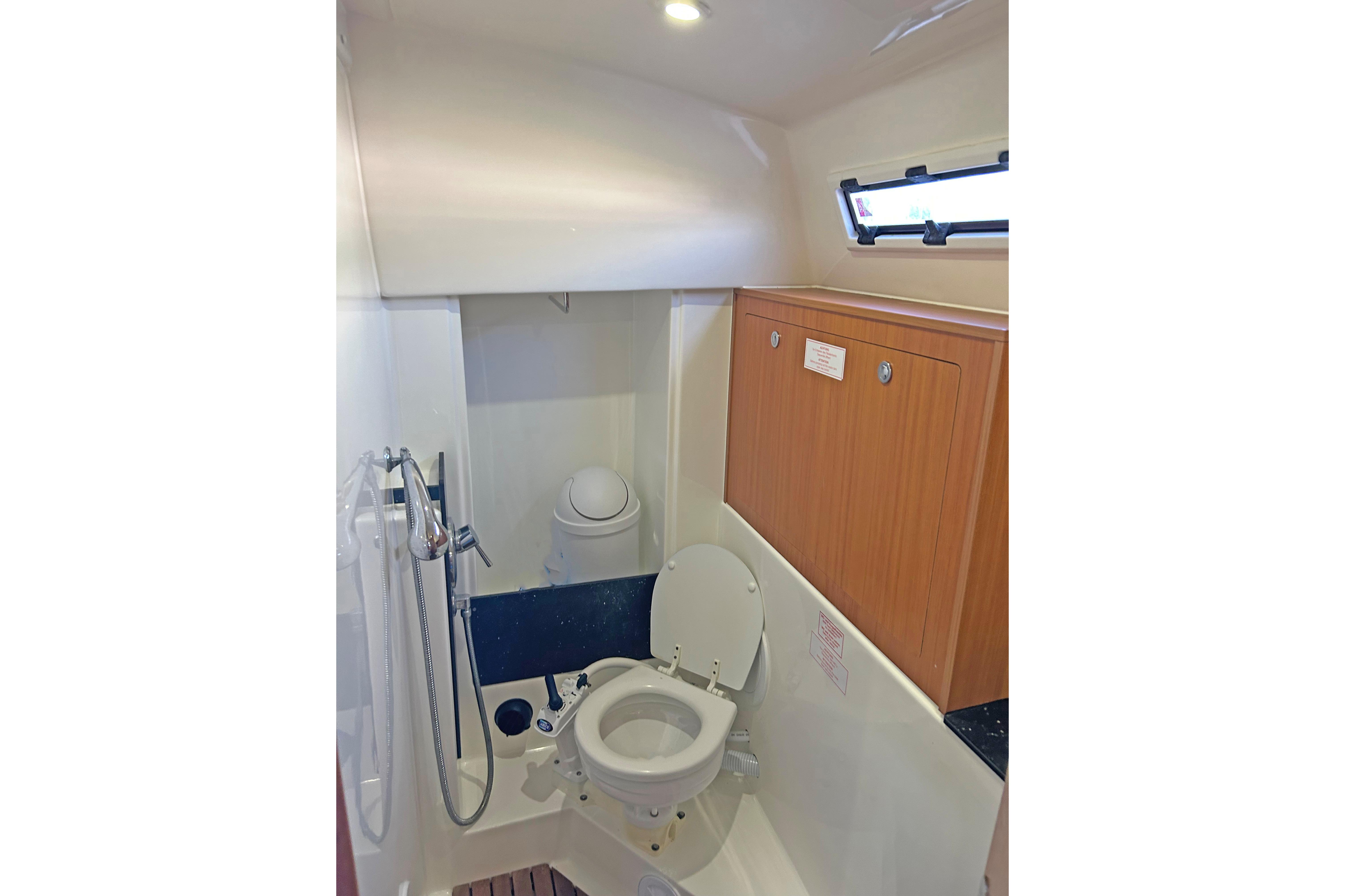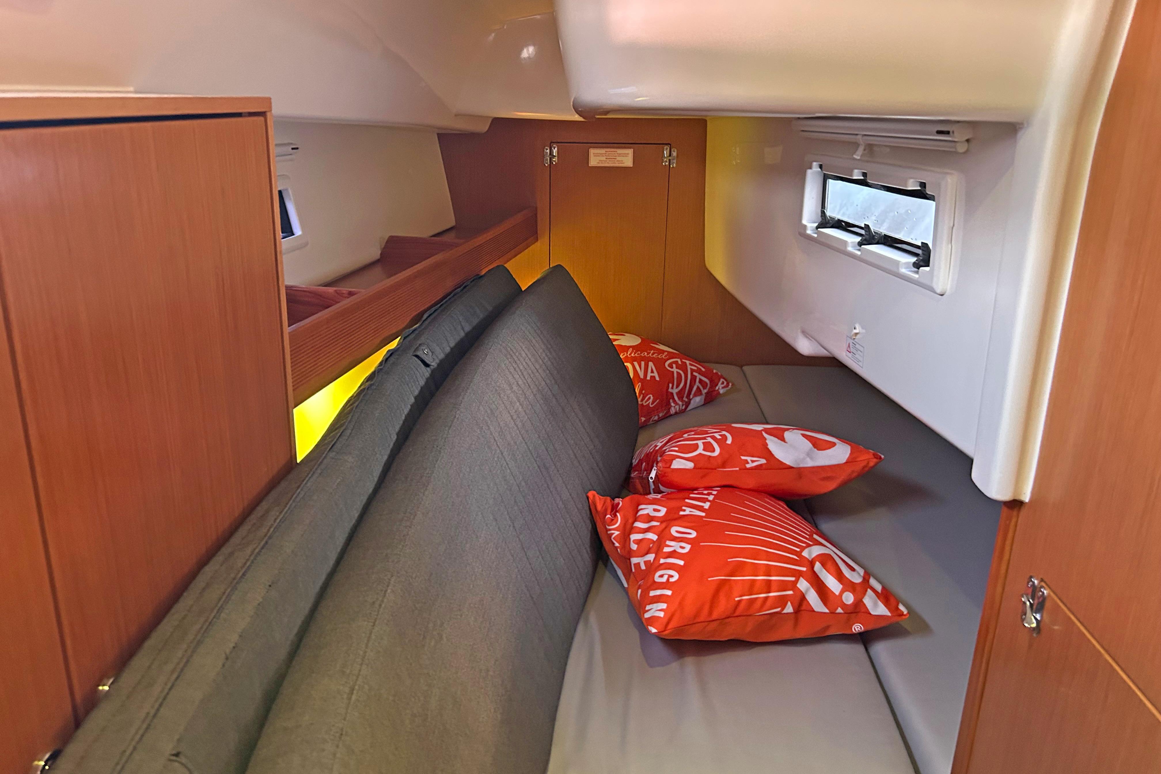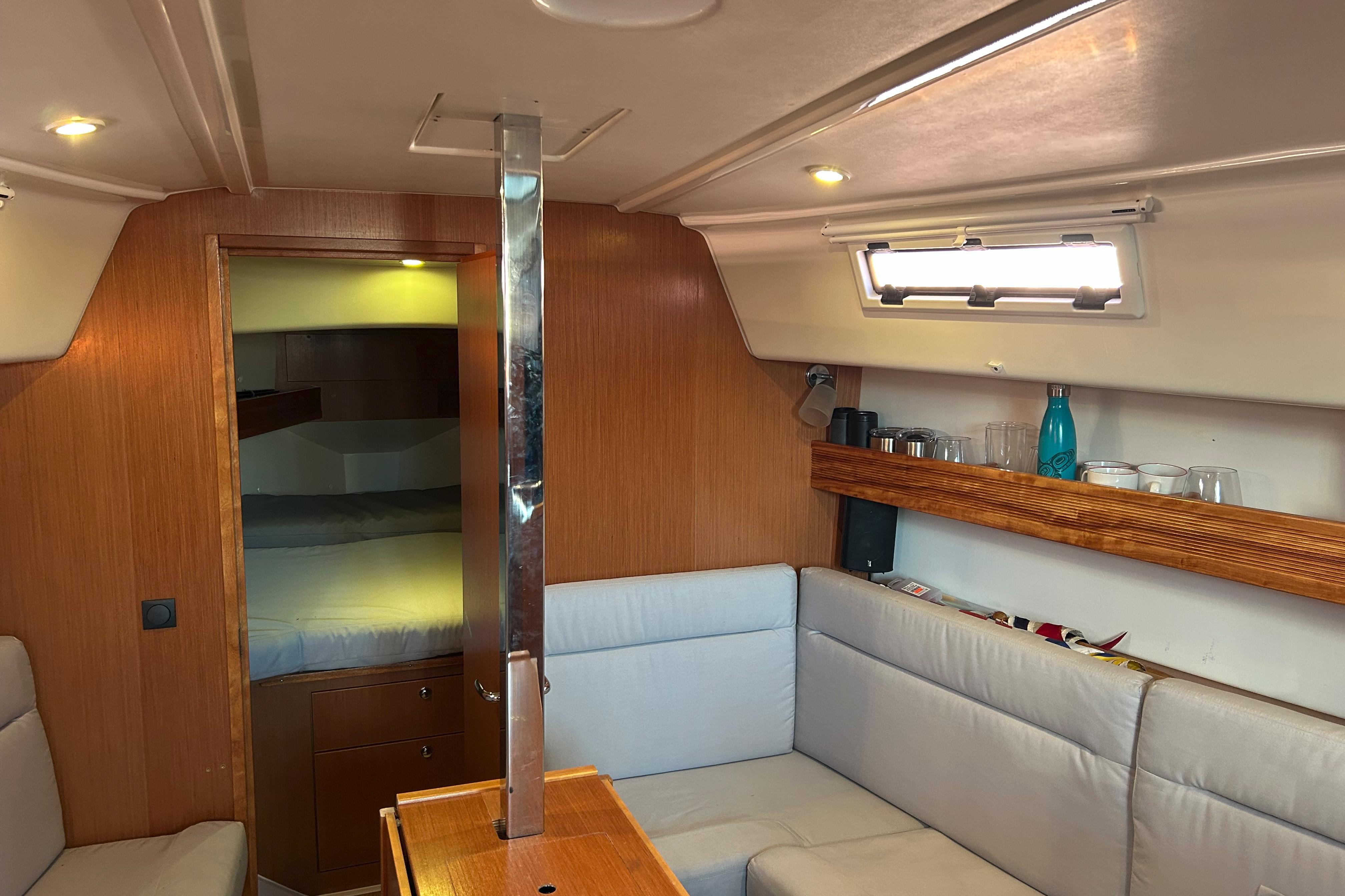 Two cabin/one head version. Saloon - Settees port and starboard with fold out saloon table. Extra storage in the saloon table. Saloon provides extra berths with a custom infill cushion. Main cabin - forward with extensive storage and good ventilation. Aft cabin – spacious bed and lots of storage space. One advantage of the two cabin version is the extra width to the guest cabin Navigation station to port near the companionway. Head: Jabsco head (new 2023) Shower Blackout covers for all hatches Espar D4 Diesel heater for four season sailing