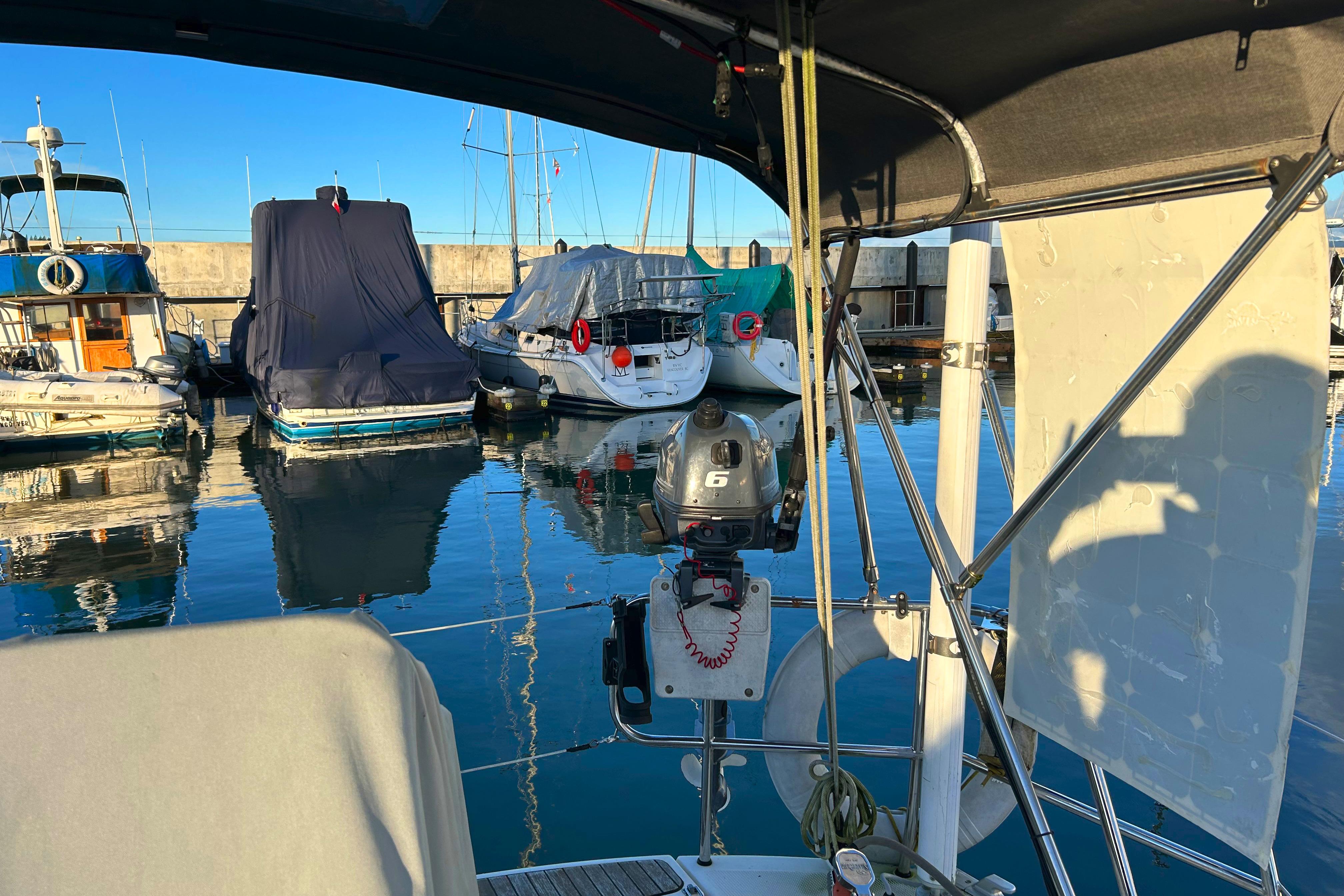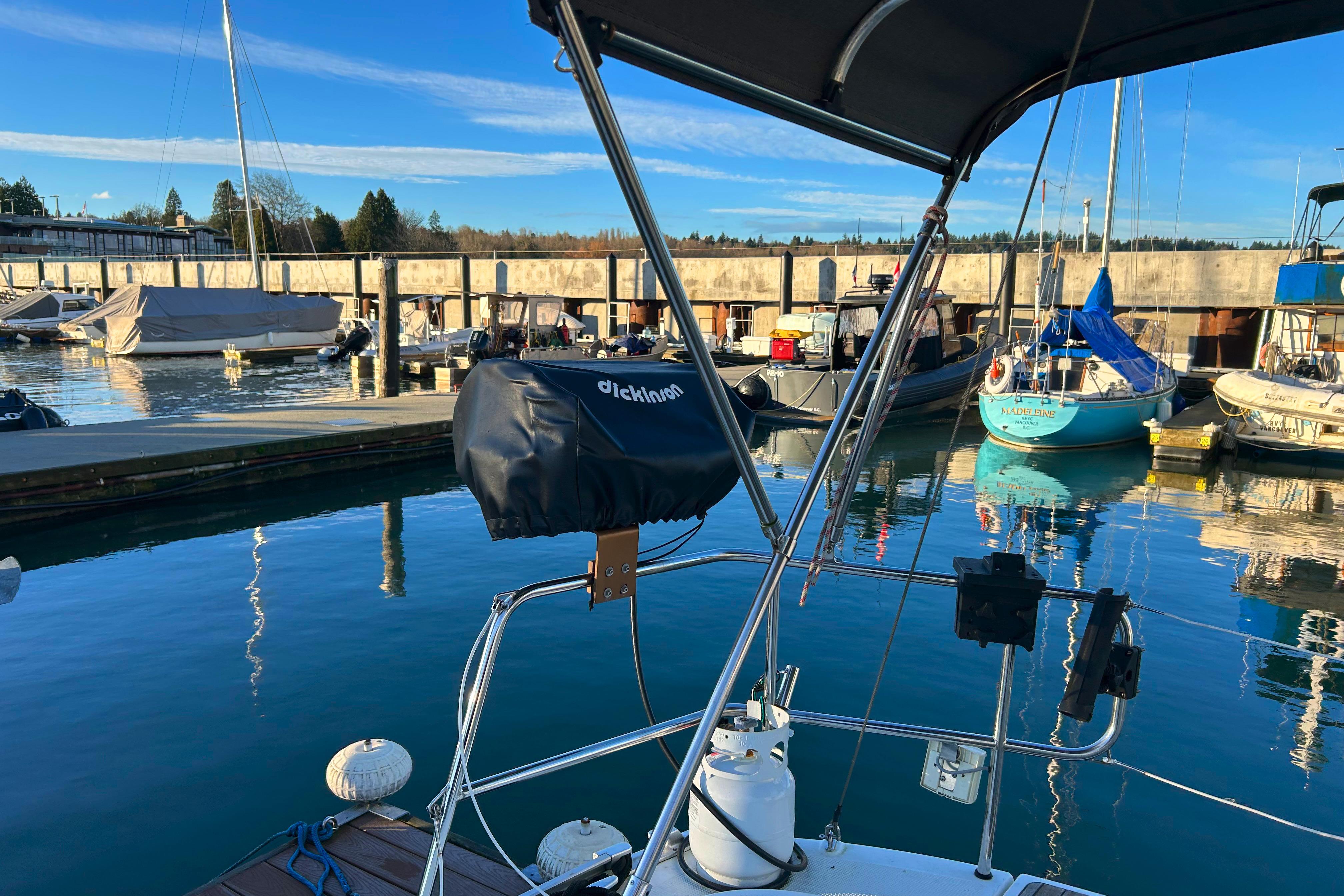 Spacious cockpit for a 32’ boat ! New dodger and bimini with covers (2025) Large fold out swim platform - for easy entry and swimming. Mounted with gas strut assistance for easy and simple opening and closing. Lewmar collapsible wheel for easy pass through from the swim platform Cockpit cushions – all new in 2025 and to match stackpack, bimini and dodger Cockpit shower Extra deep high volume lazarette.GALLEY