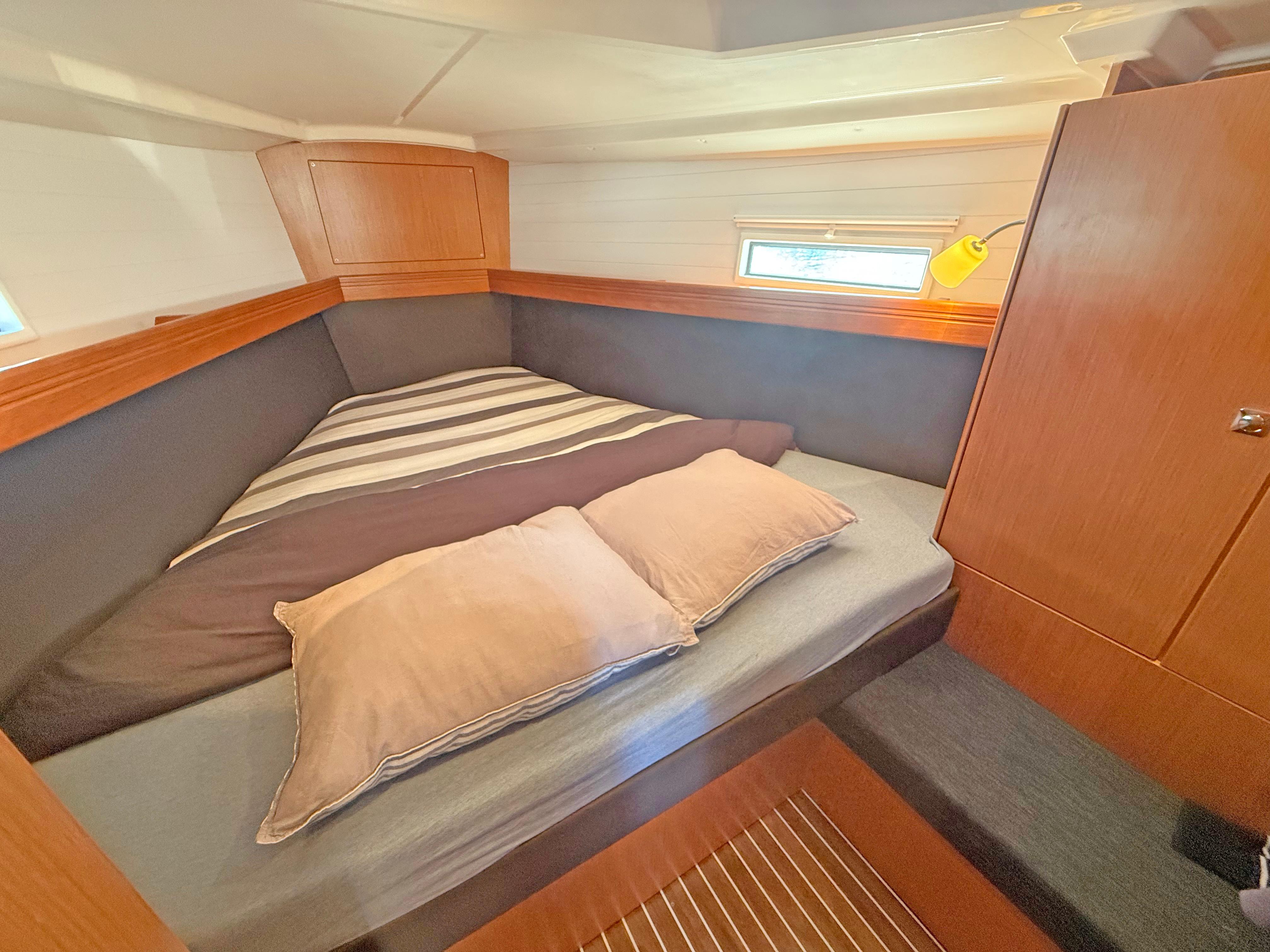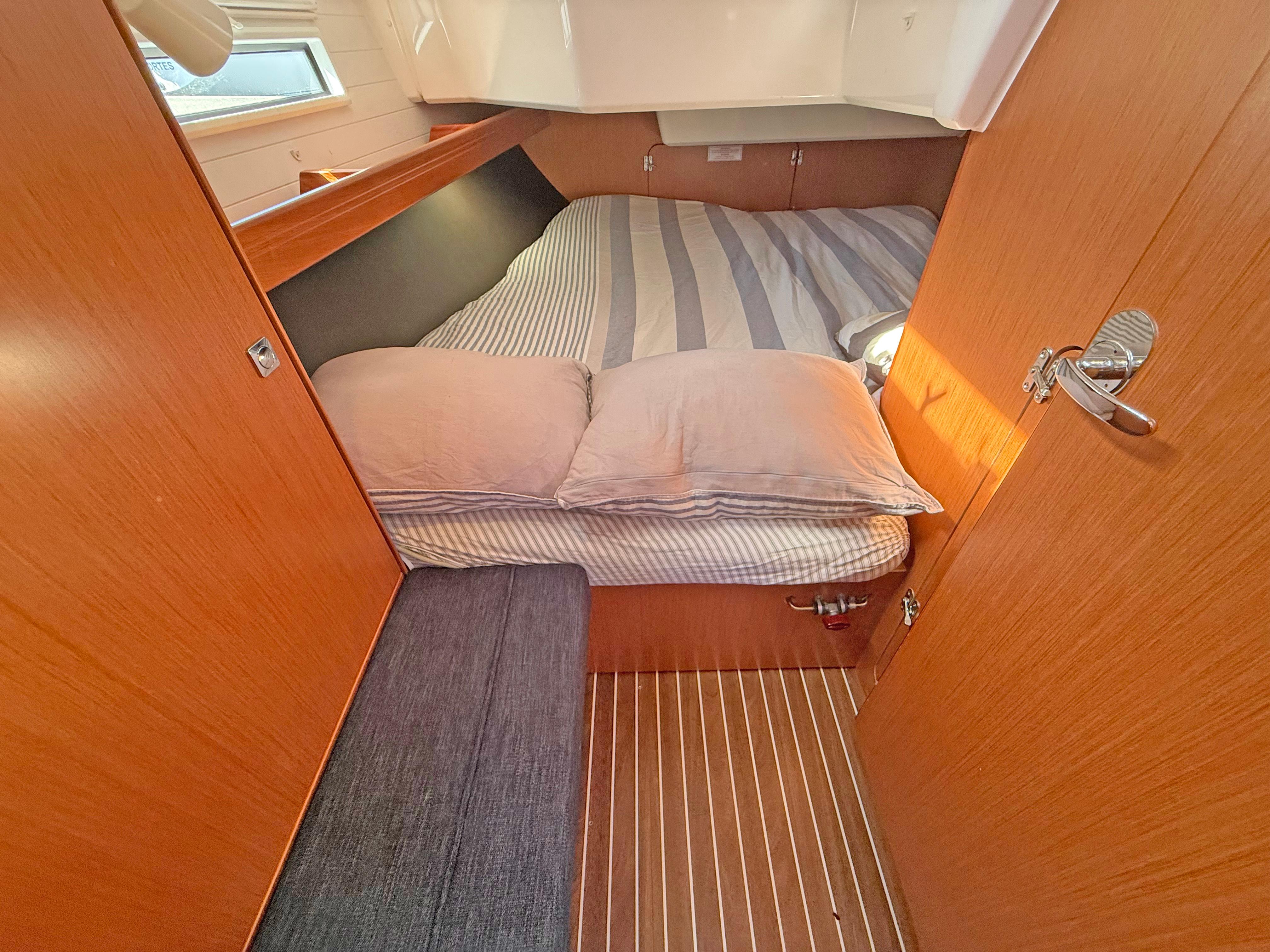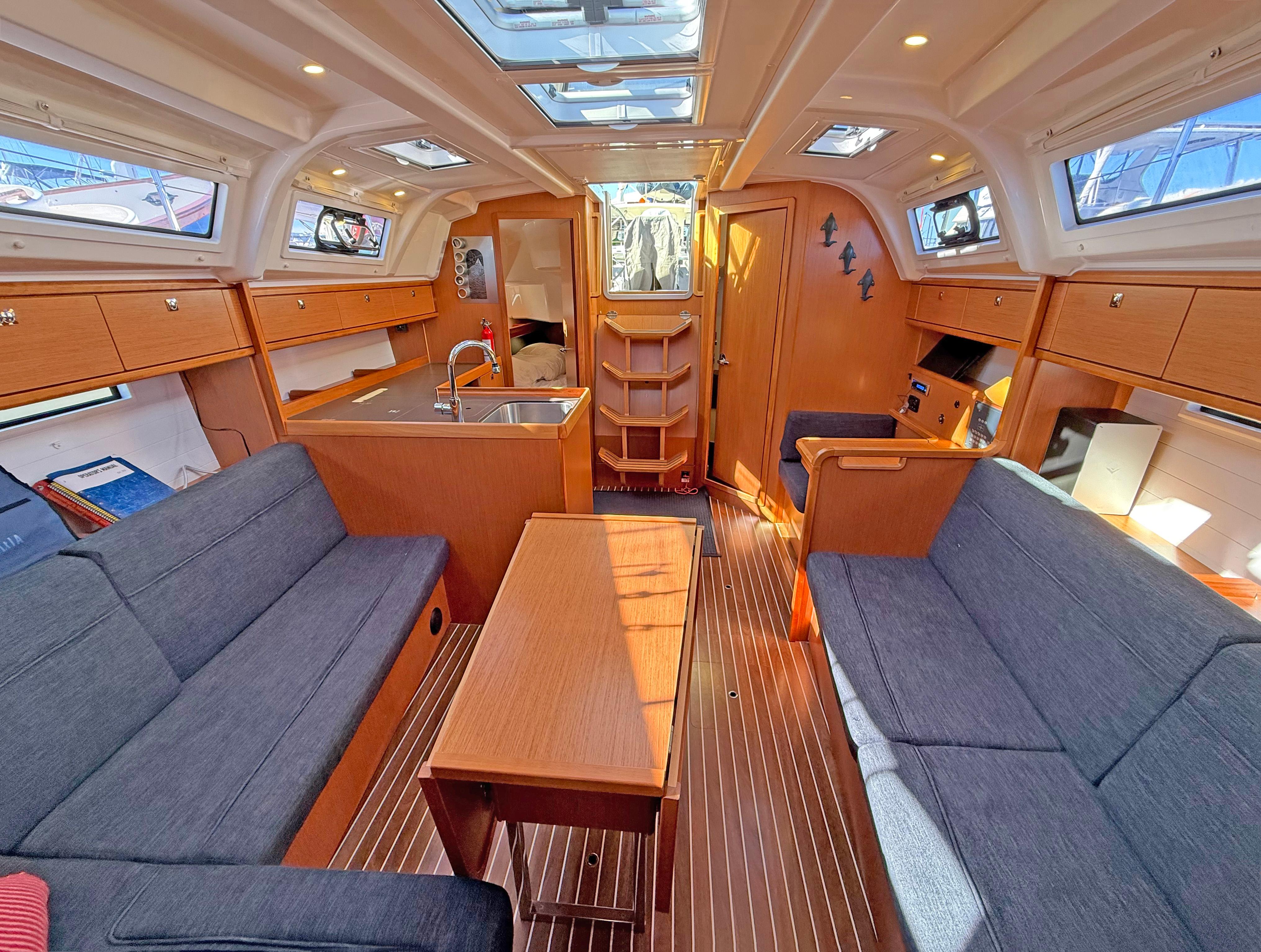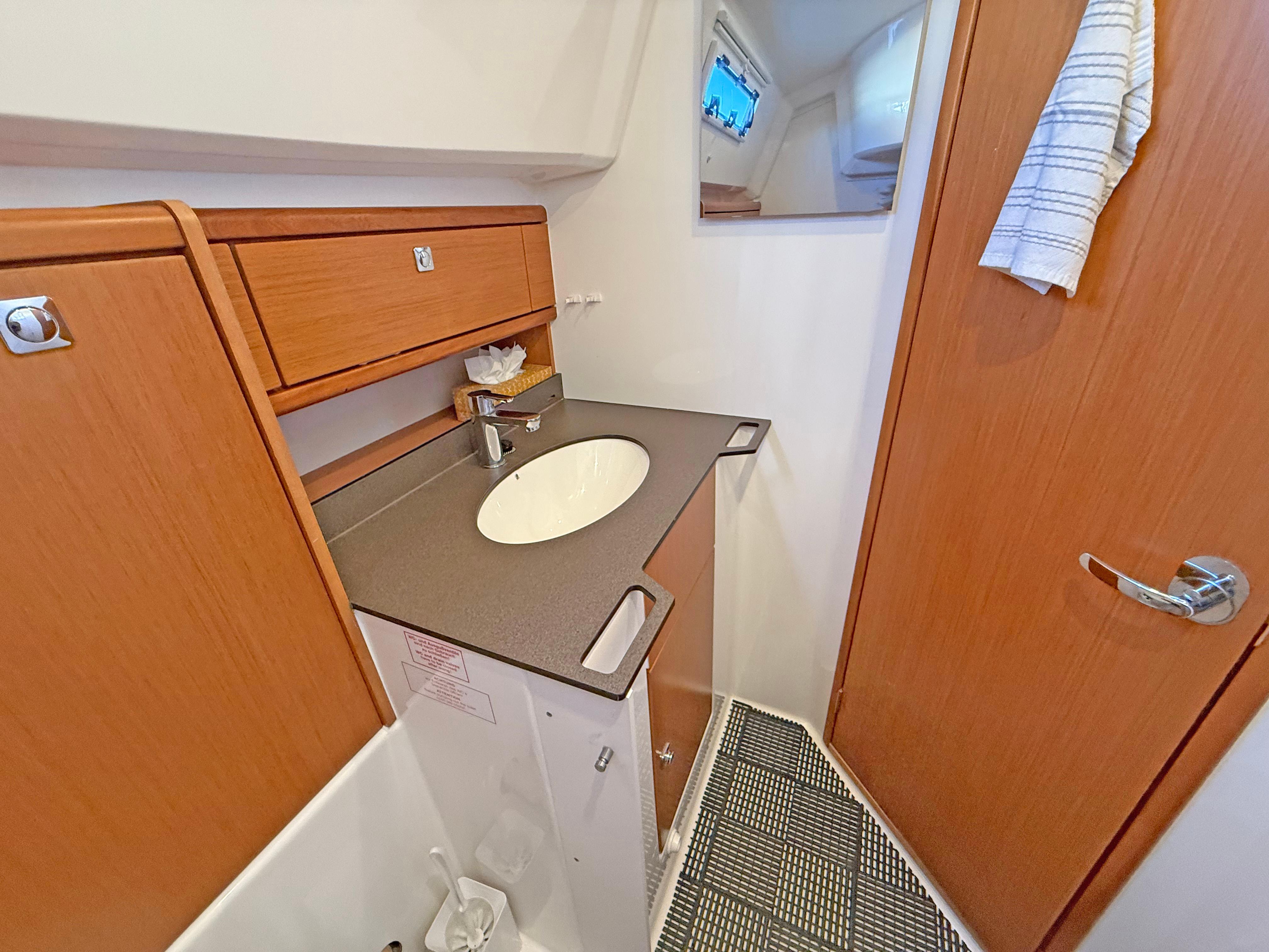 2 Cabin/1 Head layout Very bright with excellent ventilation – lots of windows and opening hatches On entering the vessel the galley is conveniently to starboard and the chart table to port. Large full sized chart table/office with storage Further forward is the saloon table with settees port and starboard. Room to host six for dinner Master cabin is forward with an opening hatch and light from the hull windows. Small bench. Two large hanging lockers Large Head with sink, shower and Jabsco toilet. Easy draining gravity drain holding tank Guest Cabin is aft and to starboard. Includes a hanging locker and small bench. Oceanair blackout/bug screens on all opening hatches All windows, including the long saloon trunk windows, have pleated blinds. 34’ Sony TV with soundbar and speaker system. 6’4” Headroom and all beds are 6’6”. Diesel heat – four season cruising